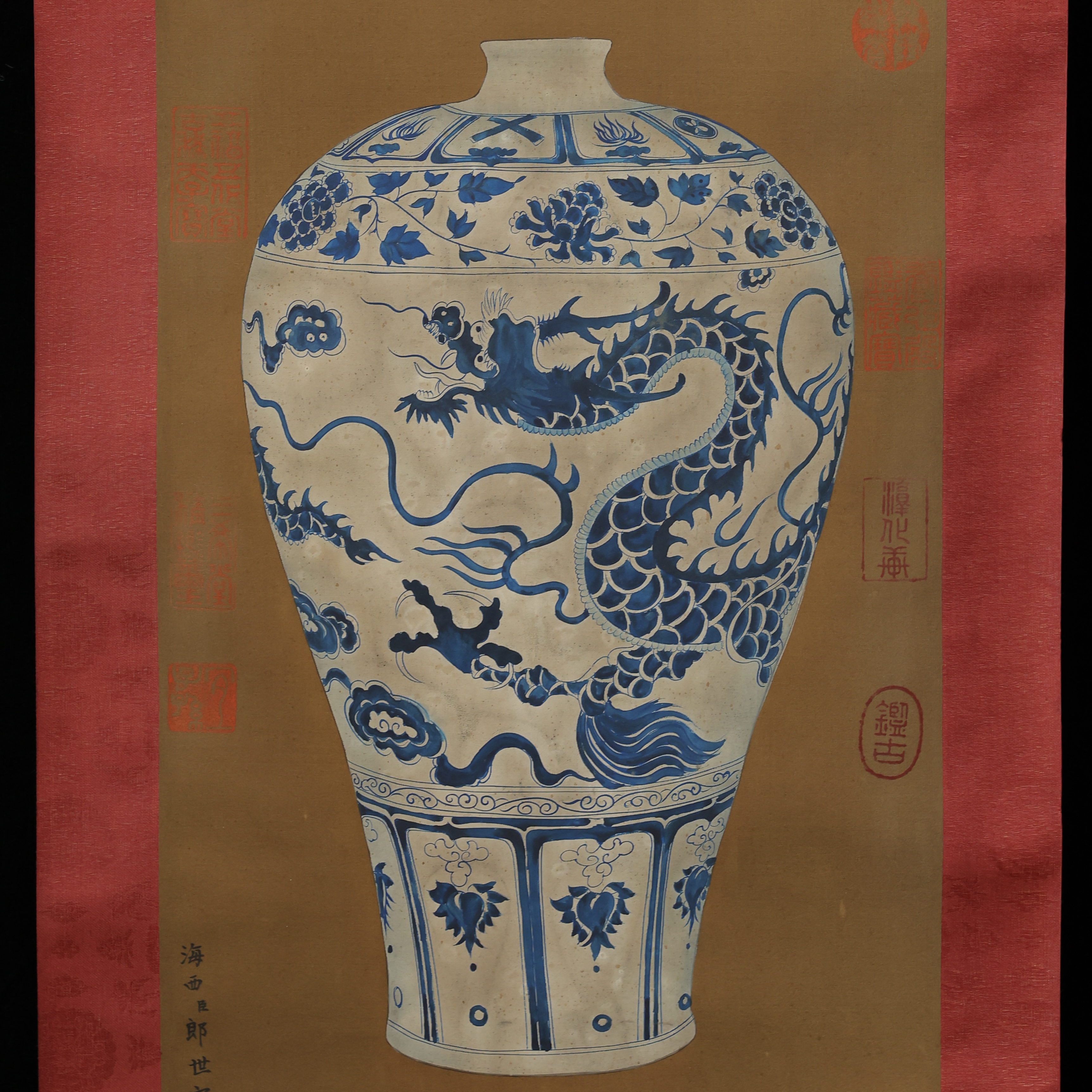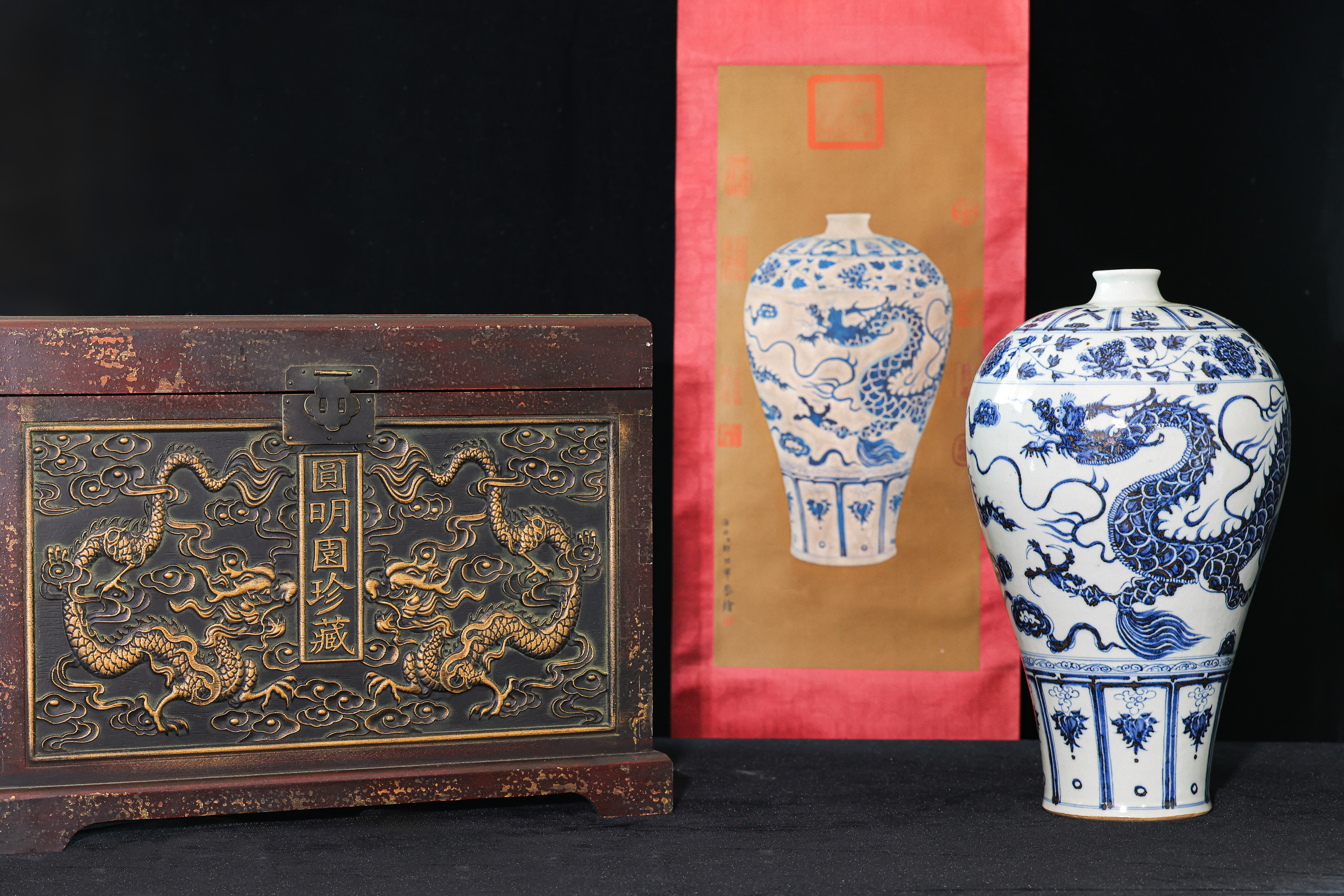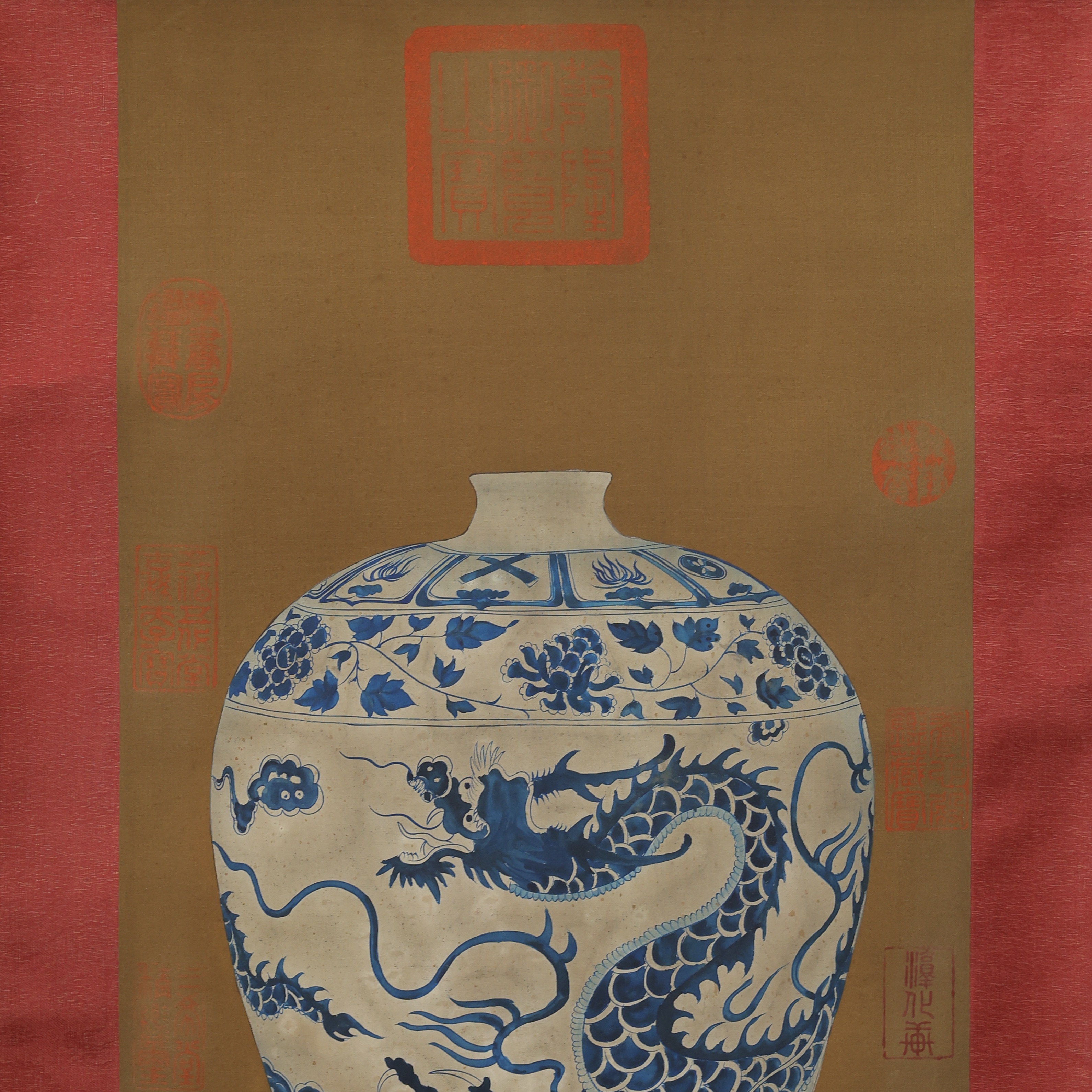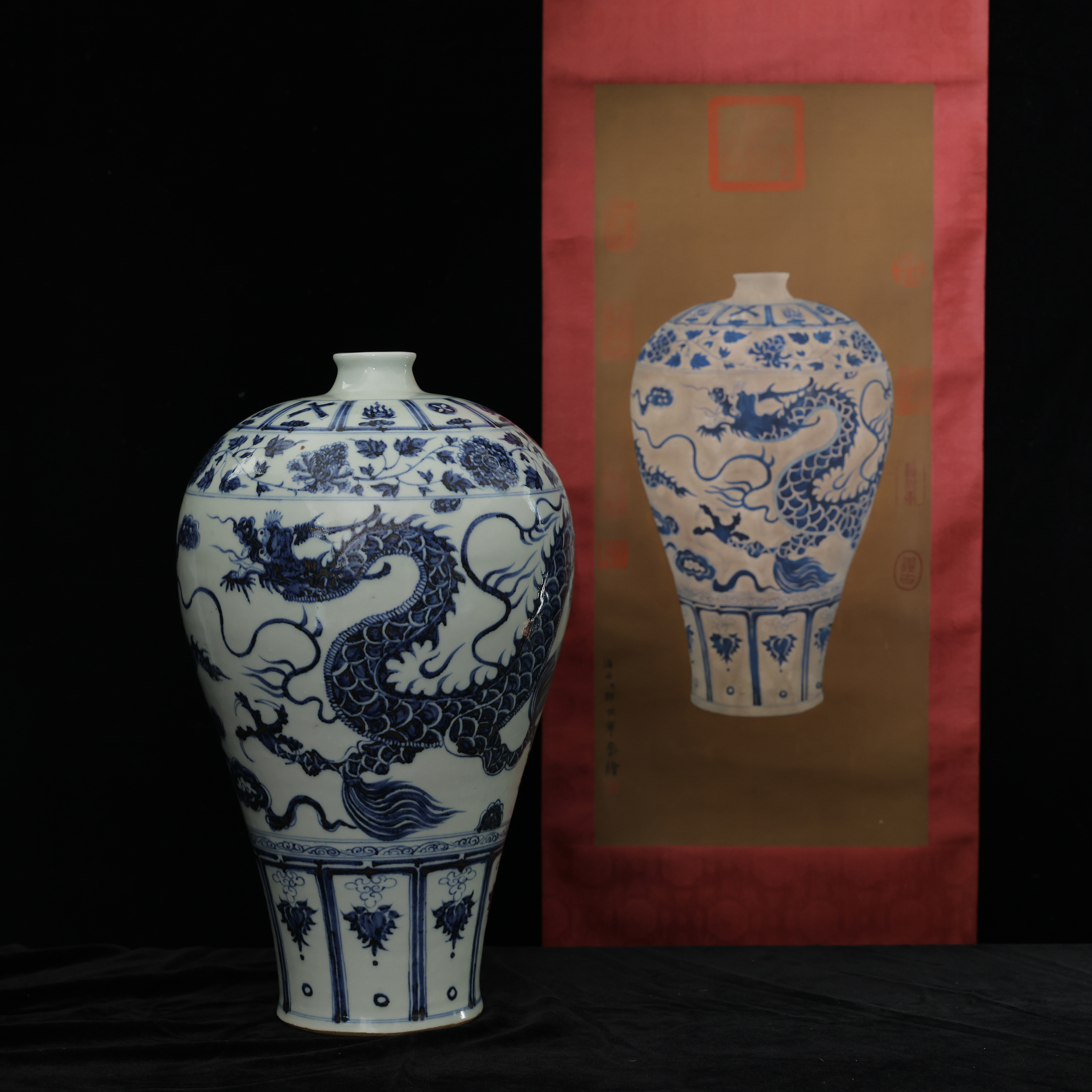 This painting centers on a Yuan blue-and-white Mei Ping with dragon motif, executed with a harmonious blend of meticulous gongbi (fine-line brushwork) and Western realist techniques. The composition is elegant and direct, with smooth, precise outlines typical of Chinese court painting. The blue-and-white coloration of the porcelain, along with the intricate dragon and floral designs, are faithfully rendered in the artwork.