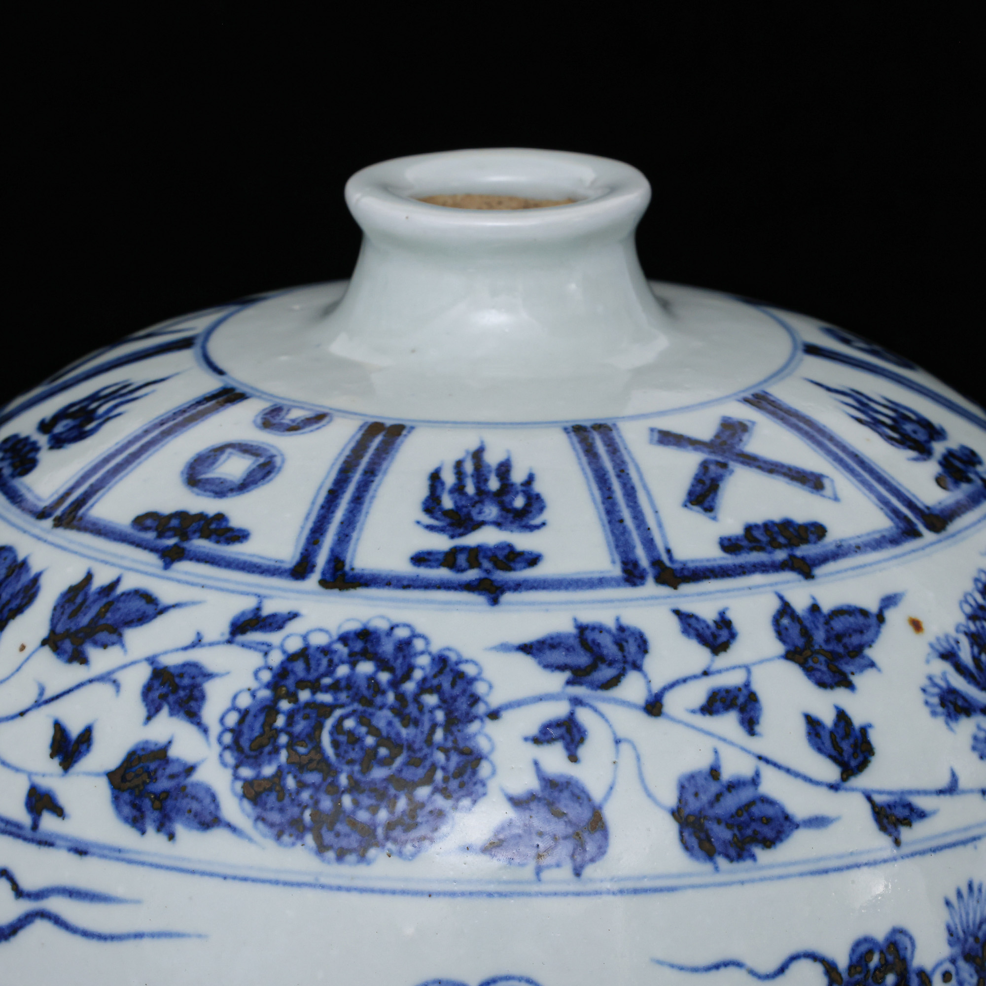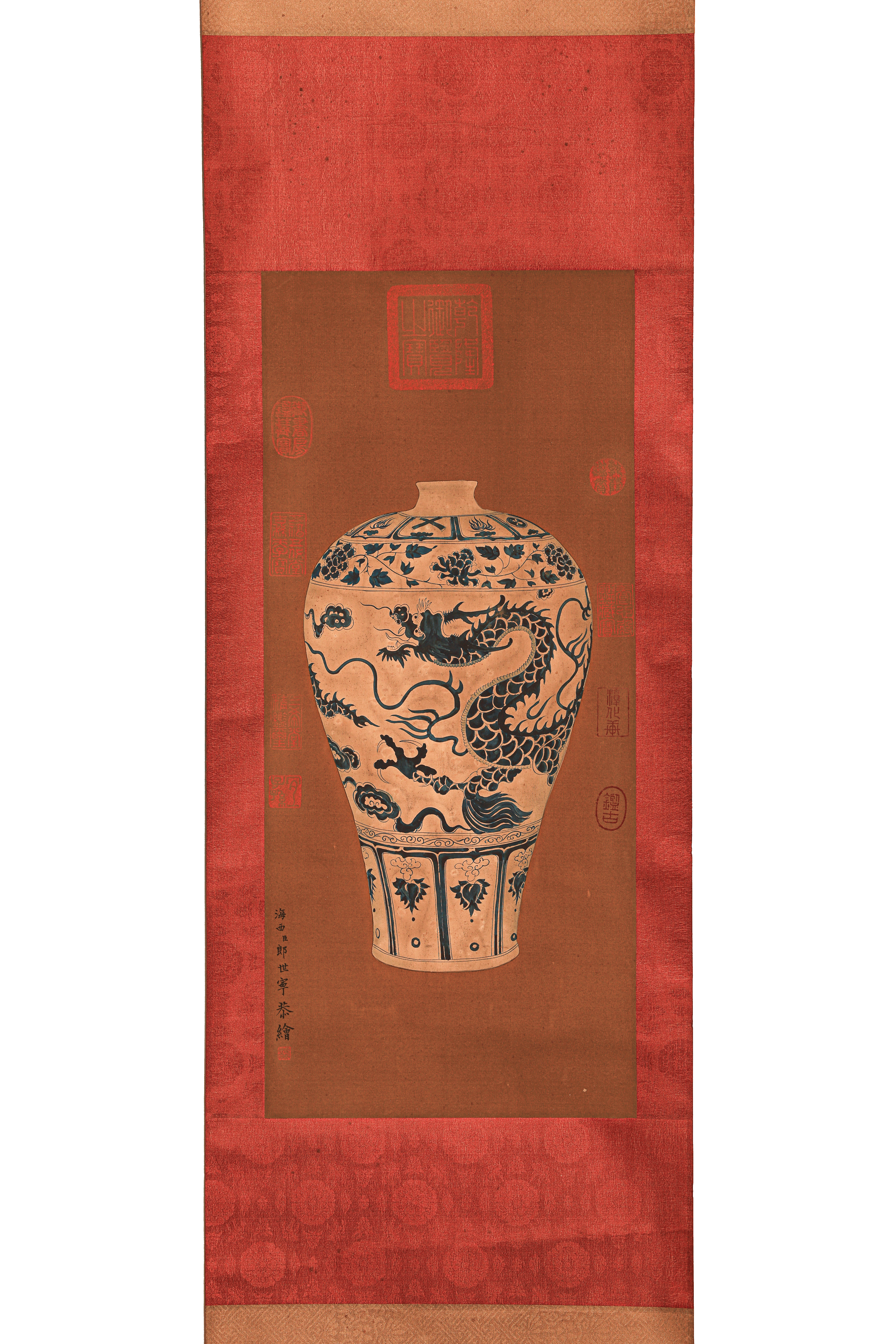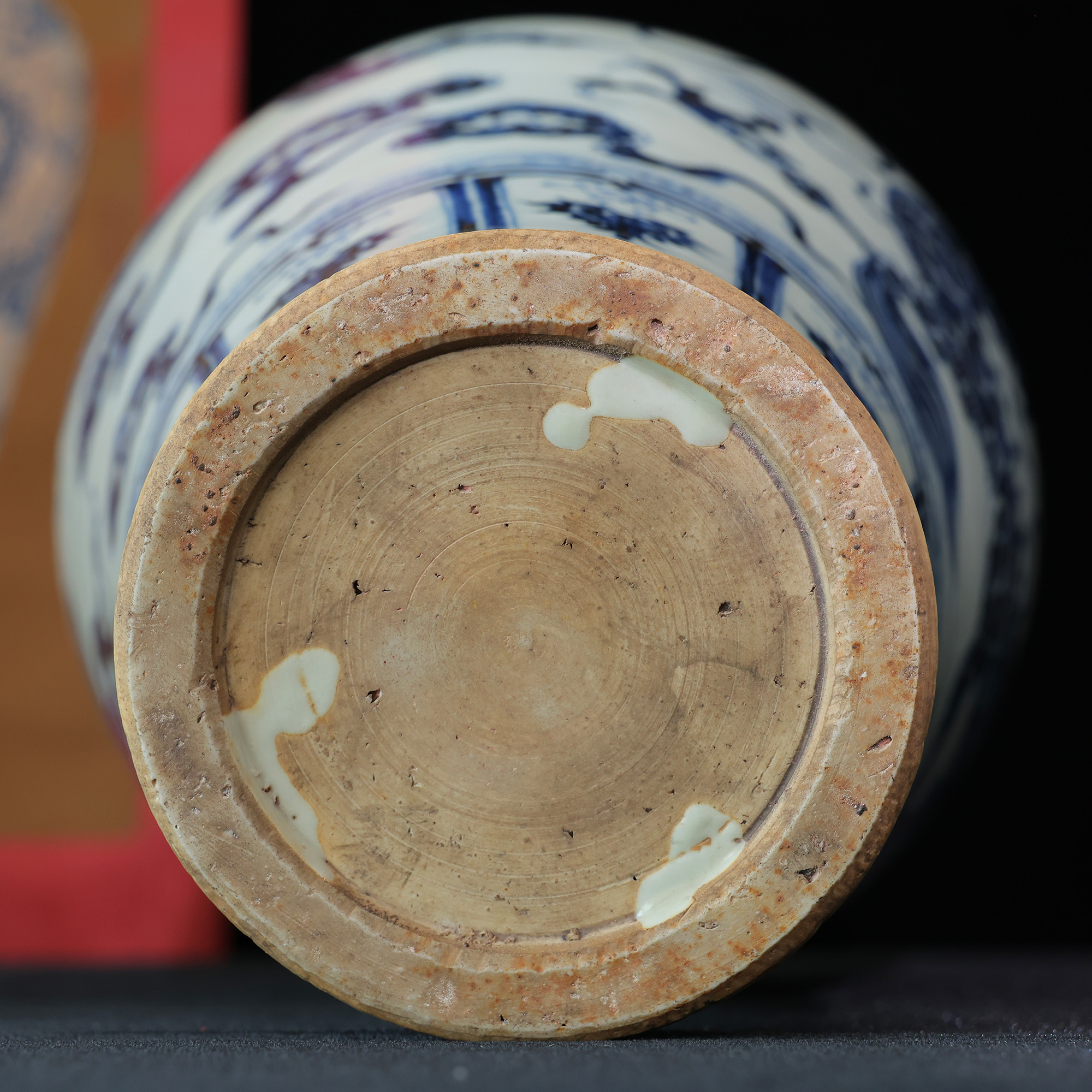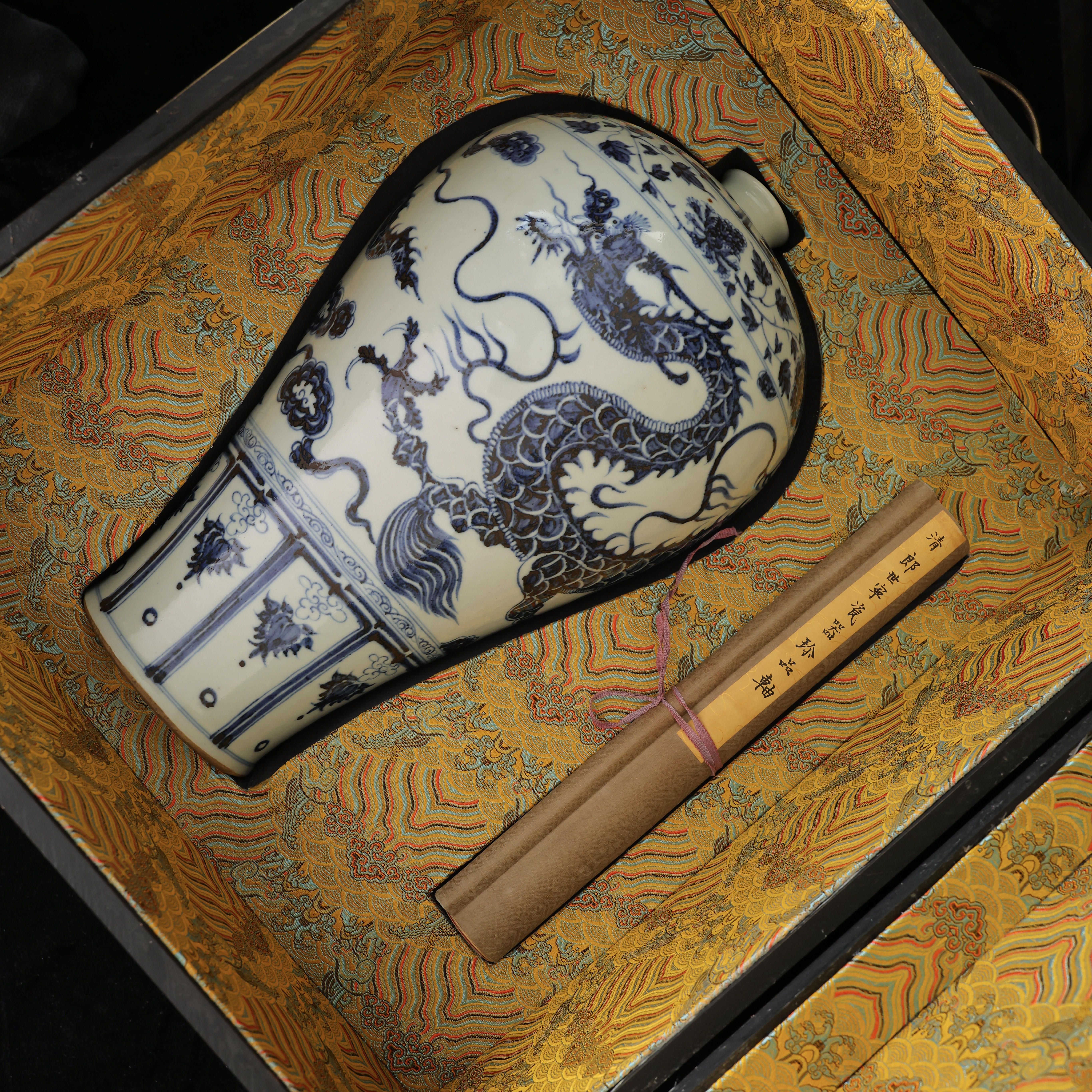 Unlike civilian kiln wares, the dragon motif was reserved for the imperial family, marking this piece as a tribute porcelain of royal use. The vessel form is that of a meiping (plum vase), which first appeared in the Tang dynasty, took shape in the Song, and was named in the Qing. It has been praised as “the finest vase under heaven.” Originally used as a wine vessel, the meiping—slender and refined—was known in the Song as a “jingping” and later, from the Ming dynasty onward, as a “plum vase.” The plum blossom, which blooms first among flowers and endures the harsh winter, symbolizes integrity and resilience. Naming the vessel after the plum elevated it from a utilitarian wine jar to an object of artistic appreciation and poetic sentiment, embodying the spirit of “Only after enduring the bitter cold does the plum blossom release its fragrance.”