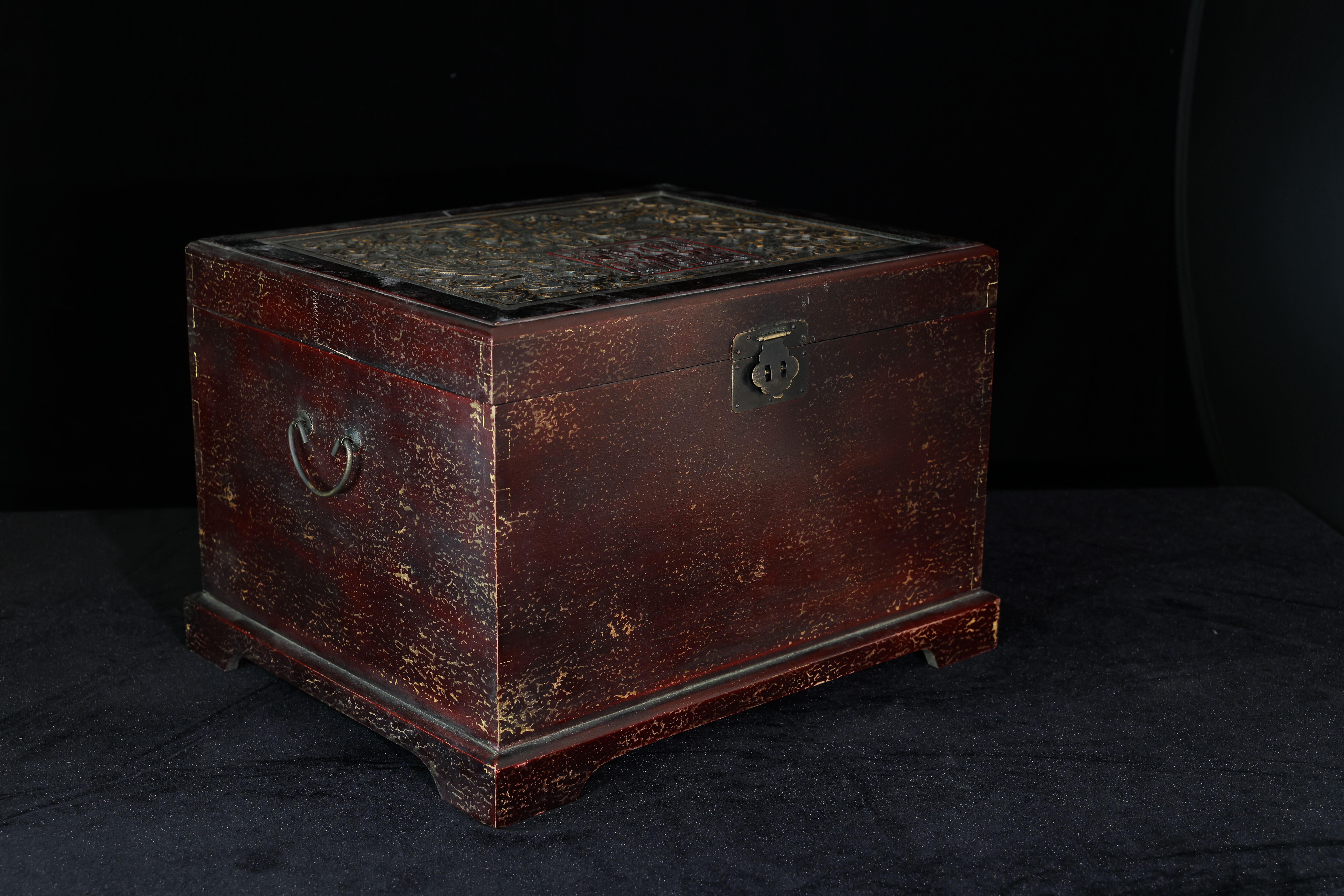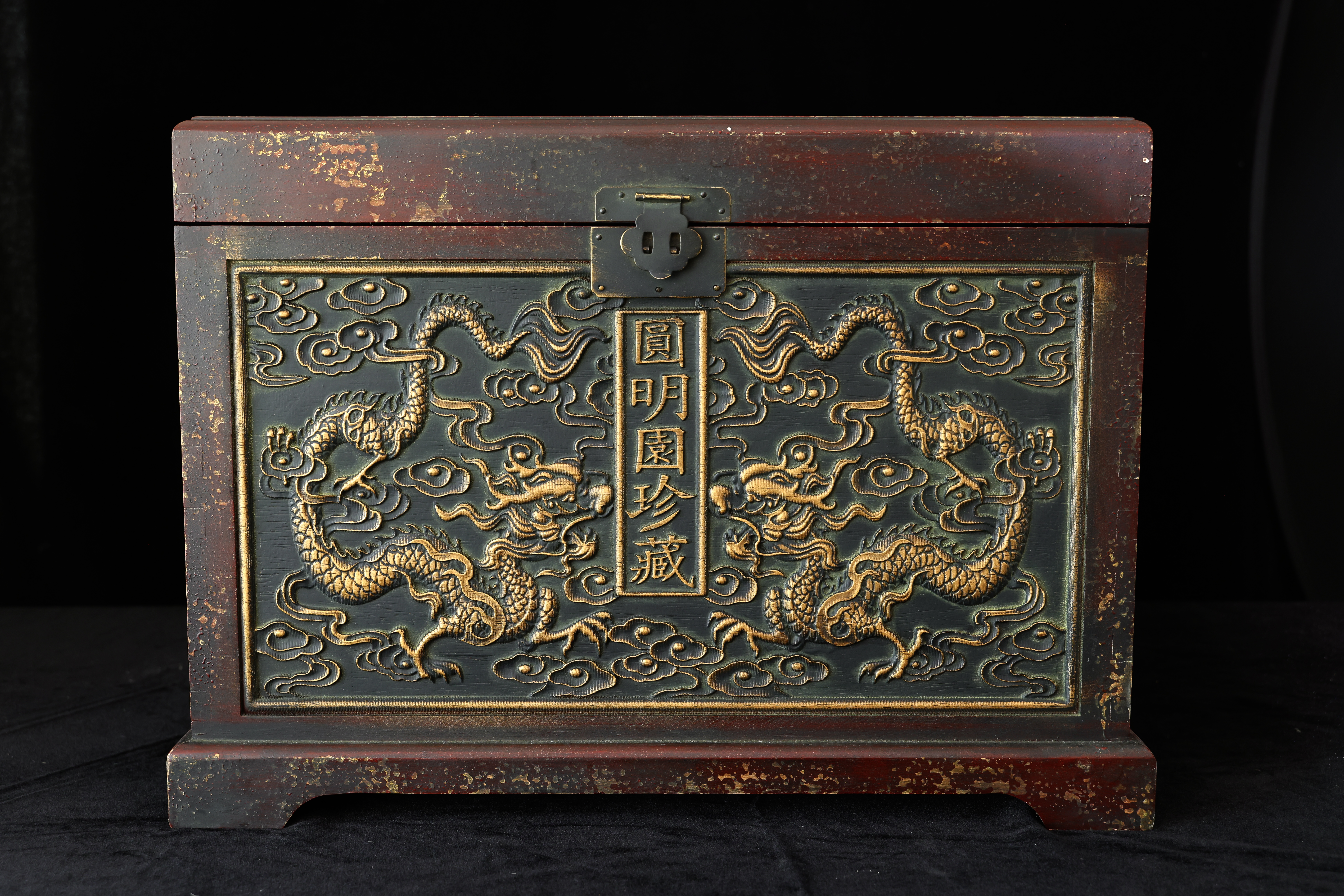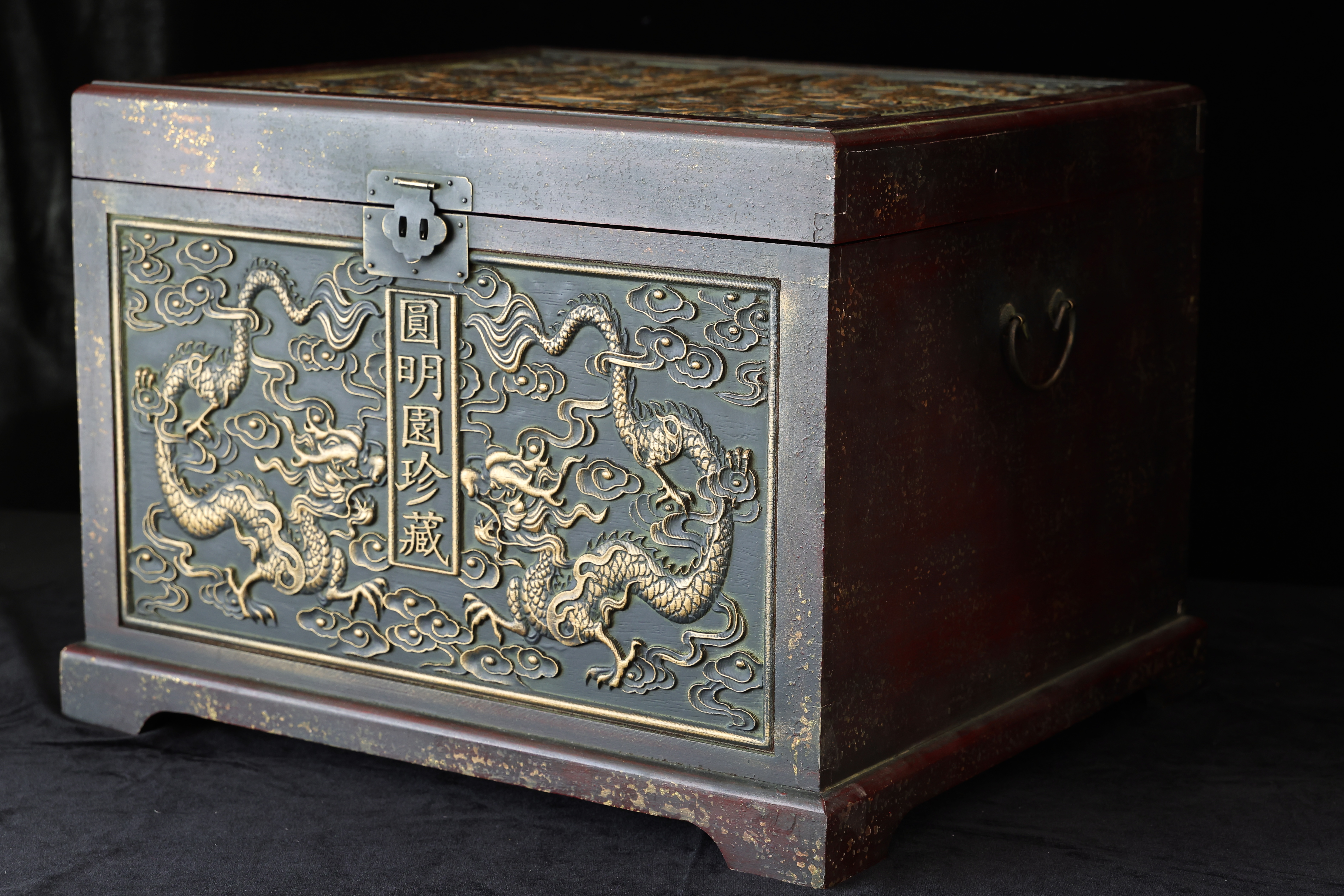 This exquisite box is crafted from gold-thread nanmu, with gilded exterior decorations and assembled using traditional mortise-and-tenon joinery. The structure is ingeniously designed—stable, tightly fitted, and masterfully executed. The top and front panels are intricately carved with a pair of dragons, facing each other with open jaws and powerful claws amid swirling auspicious clouds. Between them, the inscription “圆明园珍藏” (“Treasures of the Yuanmingyuan”) is engraved in bold kaishu (regular script). The surface exhibits a rich, lustrous patina developed over time.