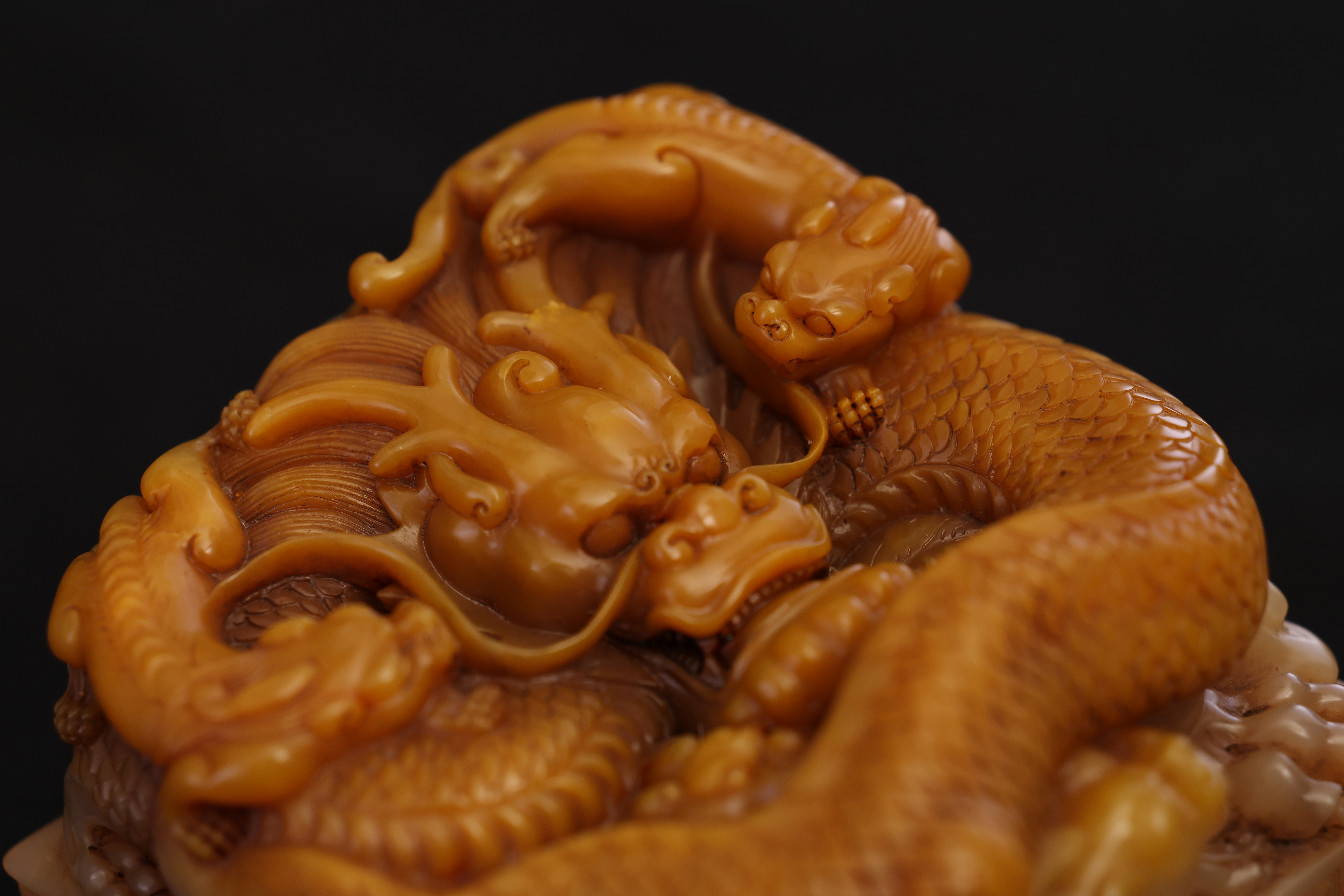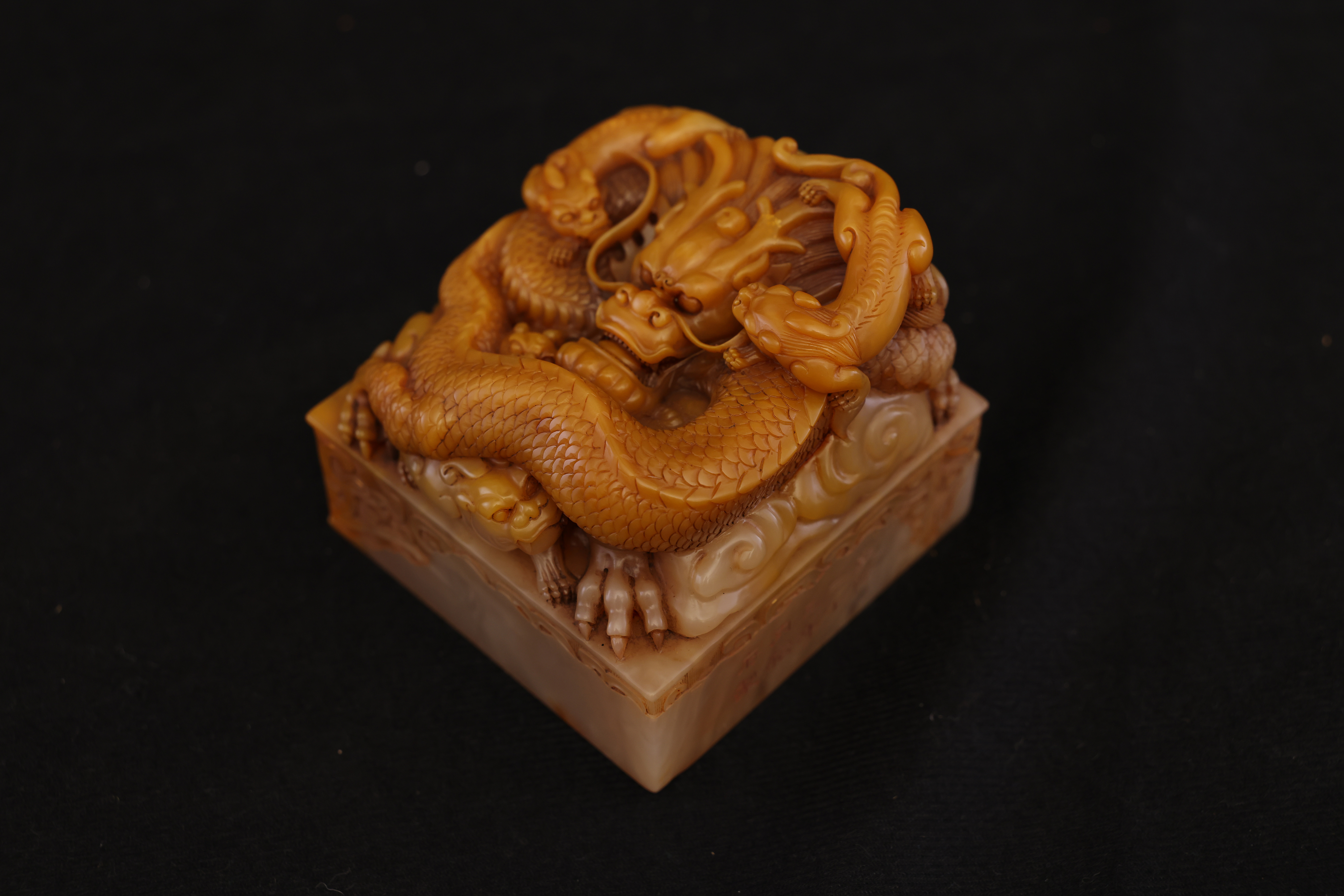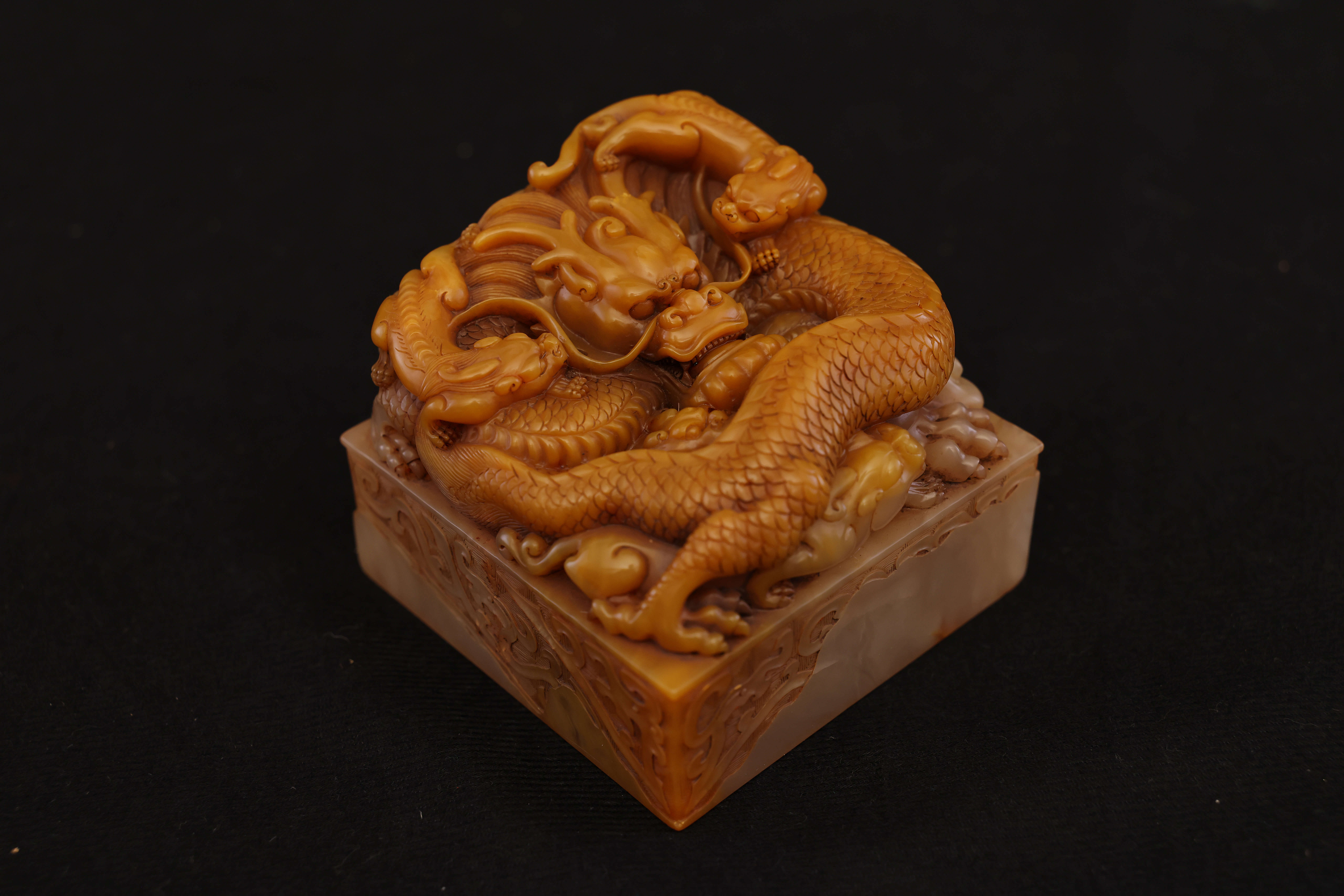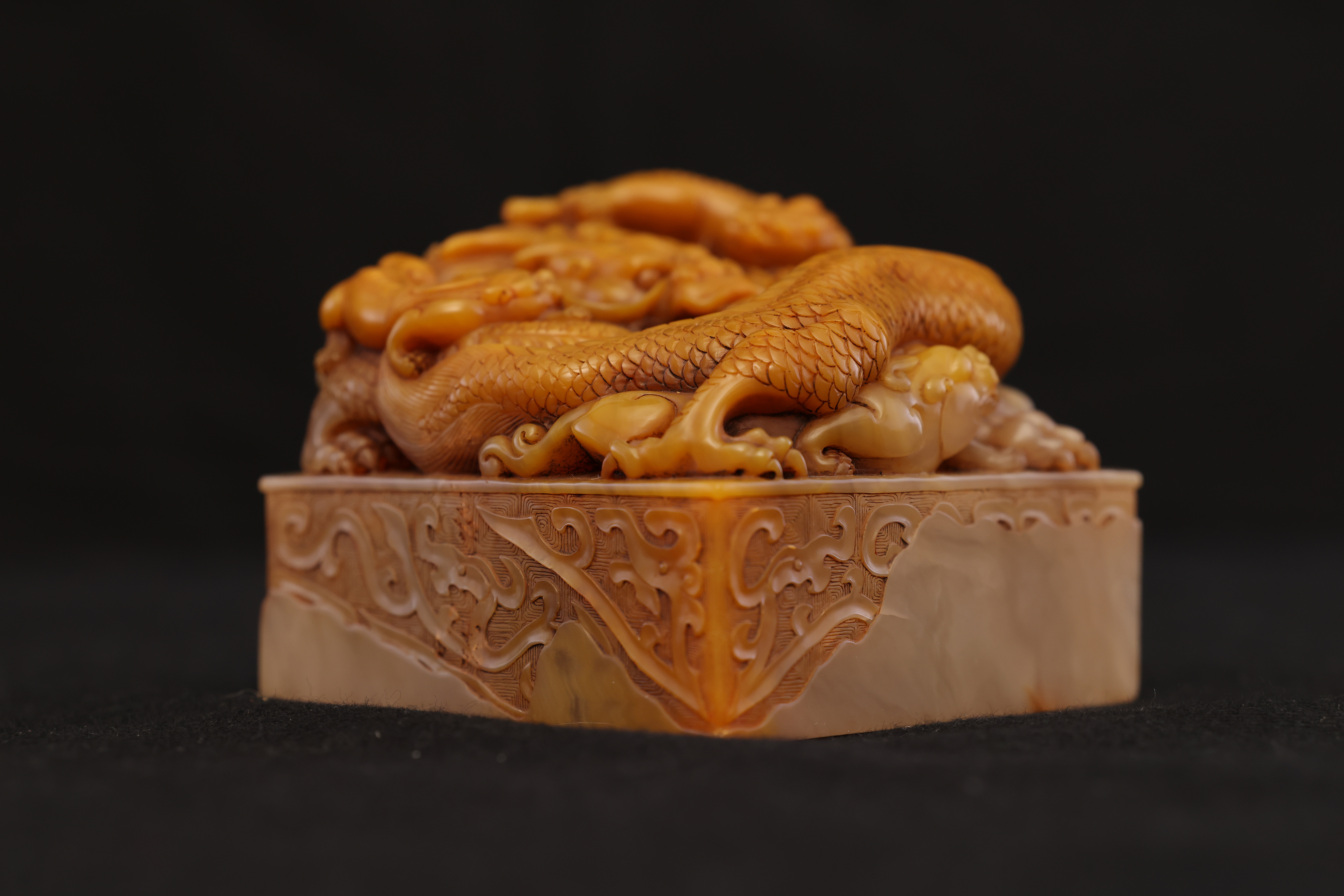 Below the dragon finial, the four sides are adorned with floating ruyi cloud motifs in low relief, their flowing lines echoing the movement of the dragons above. The entire composition is full and harmoniously balanced, executed with vigorous yet refined carving. The natural color gradations and internal veining of the Tianhuang stone are skillfully incorporated into the design, creating a layered rhythm of golden, yellow, and russet tones—an exquisite union of nature’s beauty and master craftsmanship.