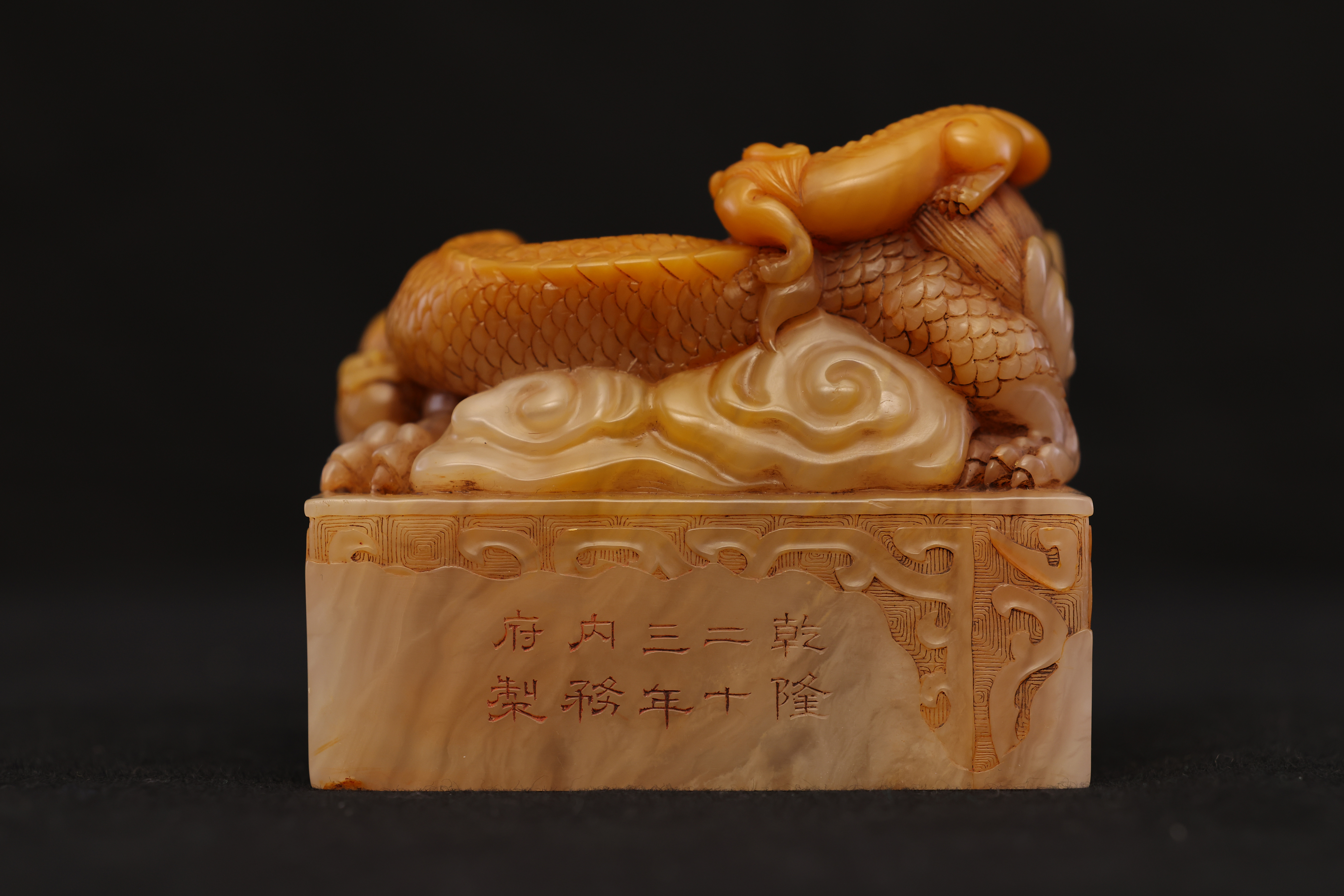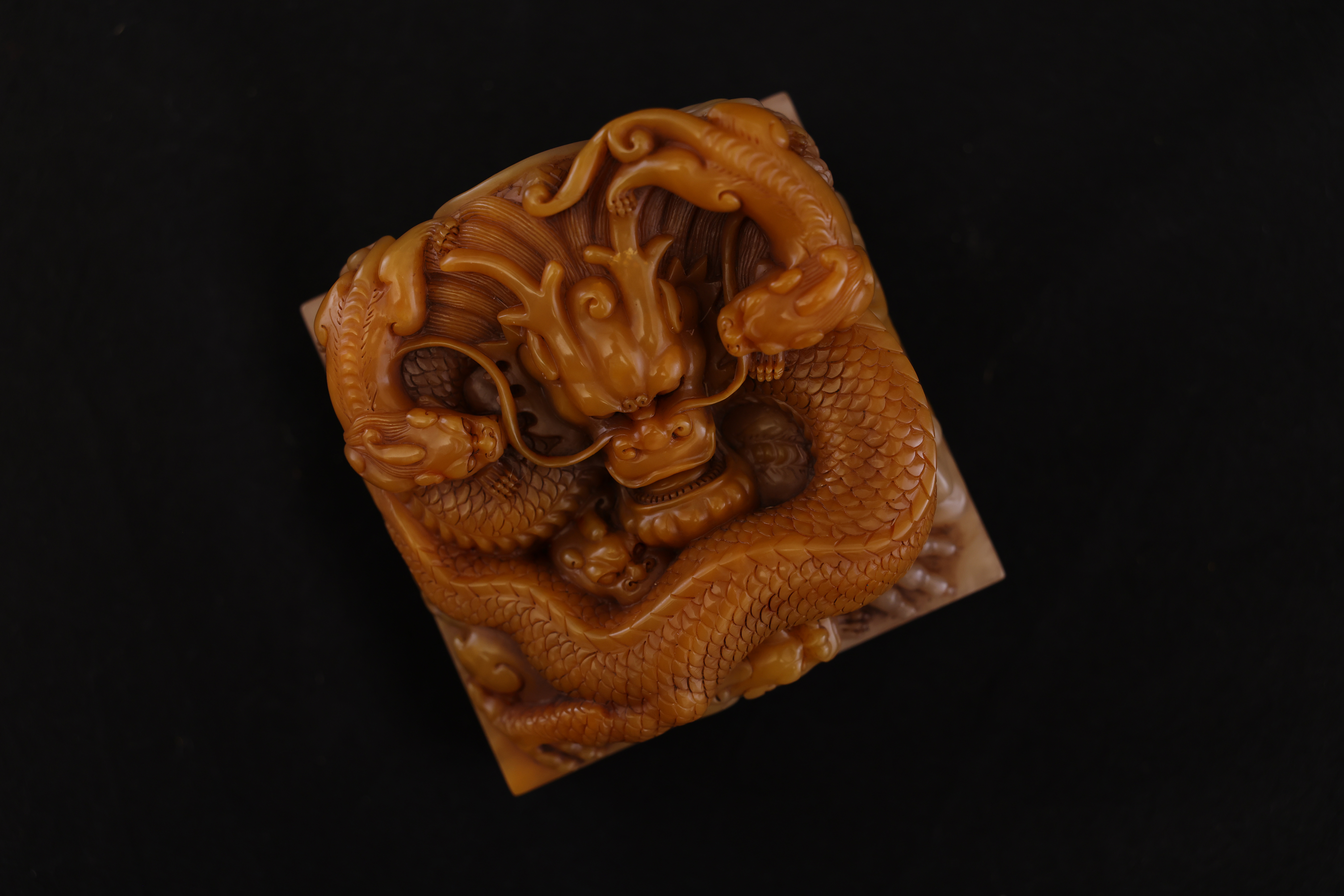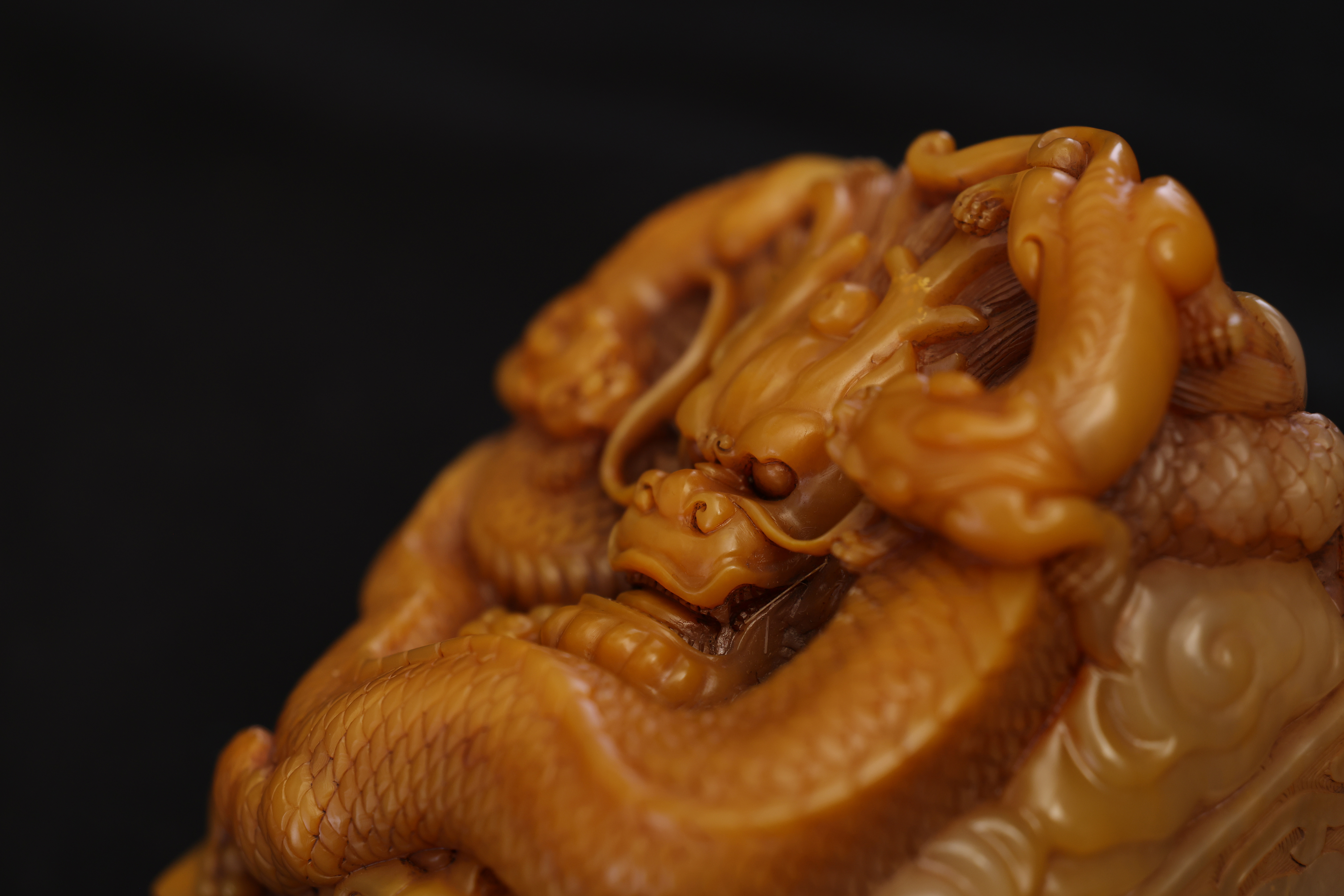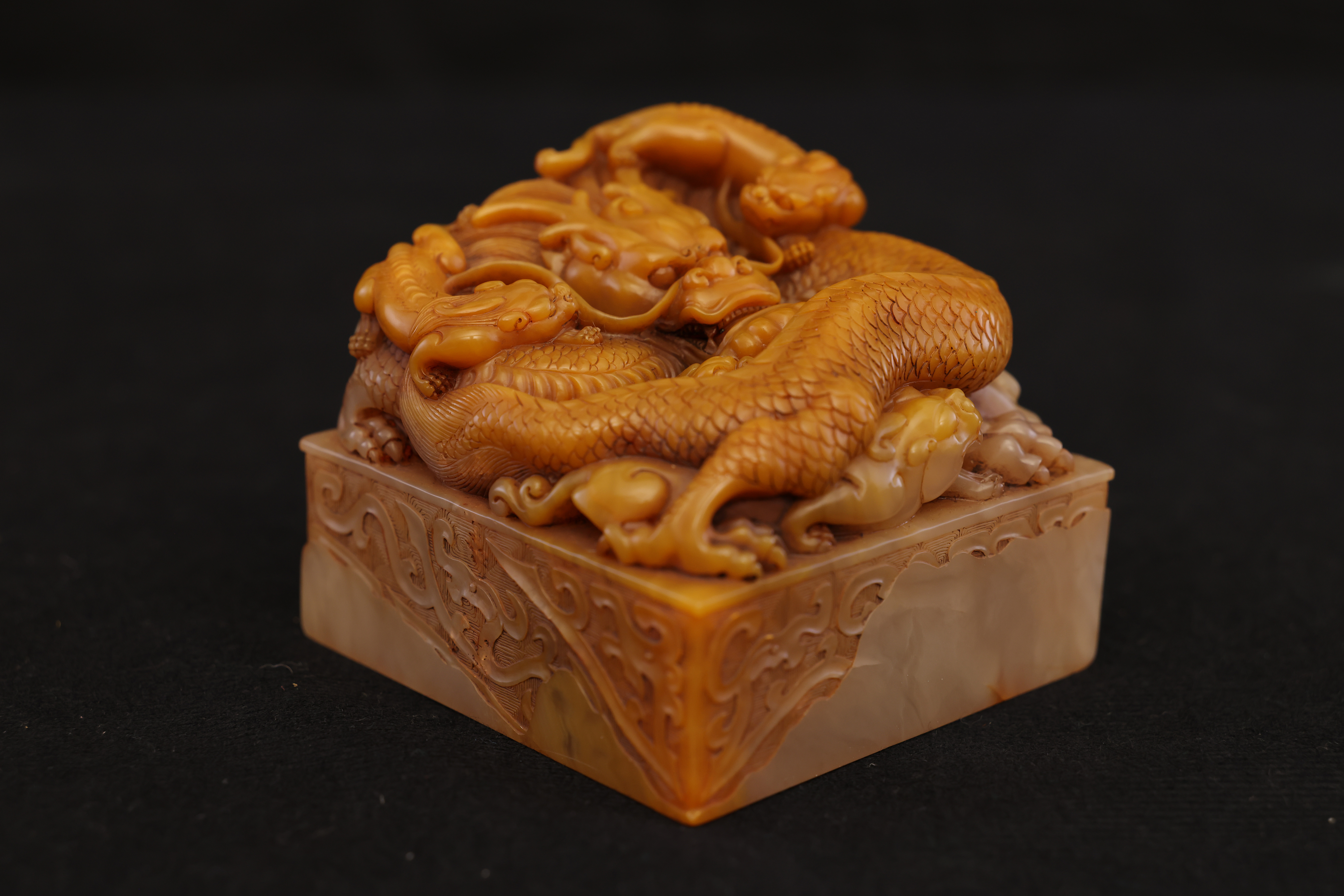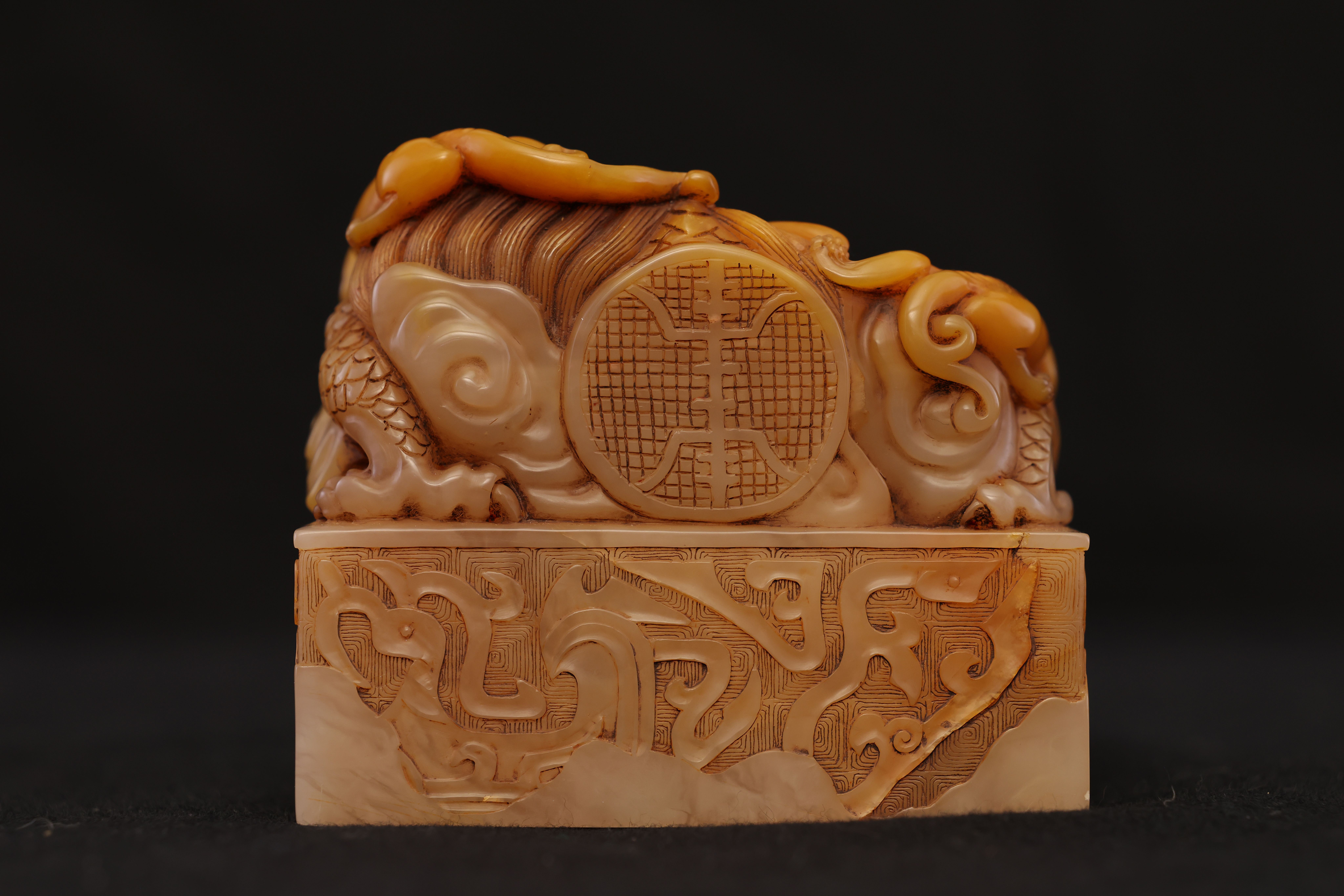 Below the dragon finial, the four sides are adorned with floating ruyi cloud motifs in low relief, their flowing lines echoing the movement of the dragons above. The entire composition is full and harmoniously balanced, executed with vigorous yet refined carving. The natural color gradations and internal veining of the Tianhuang stone are skillfully incorporated into the design, creating a layered rhythm of golden, yellow, and russet tones—an exquisite union of nature’s beauty and master craftsmanship.