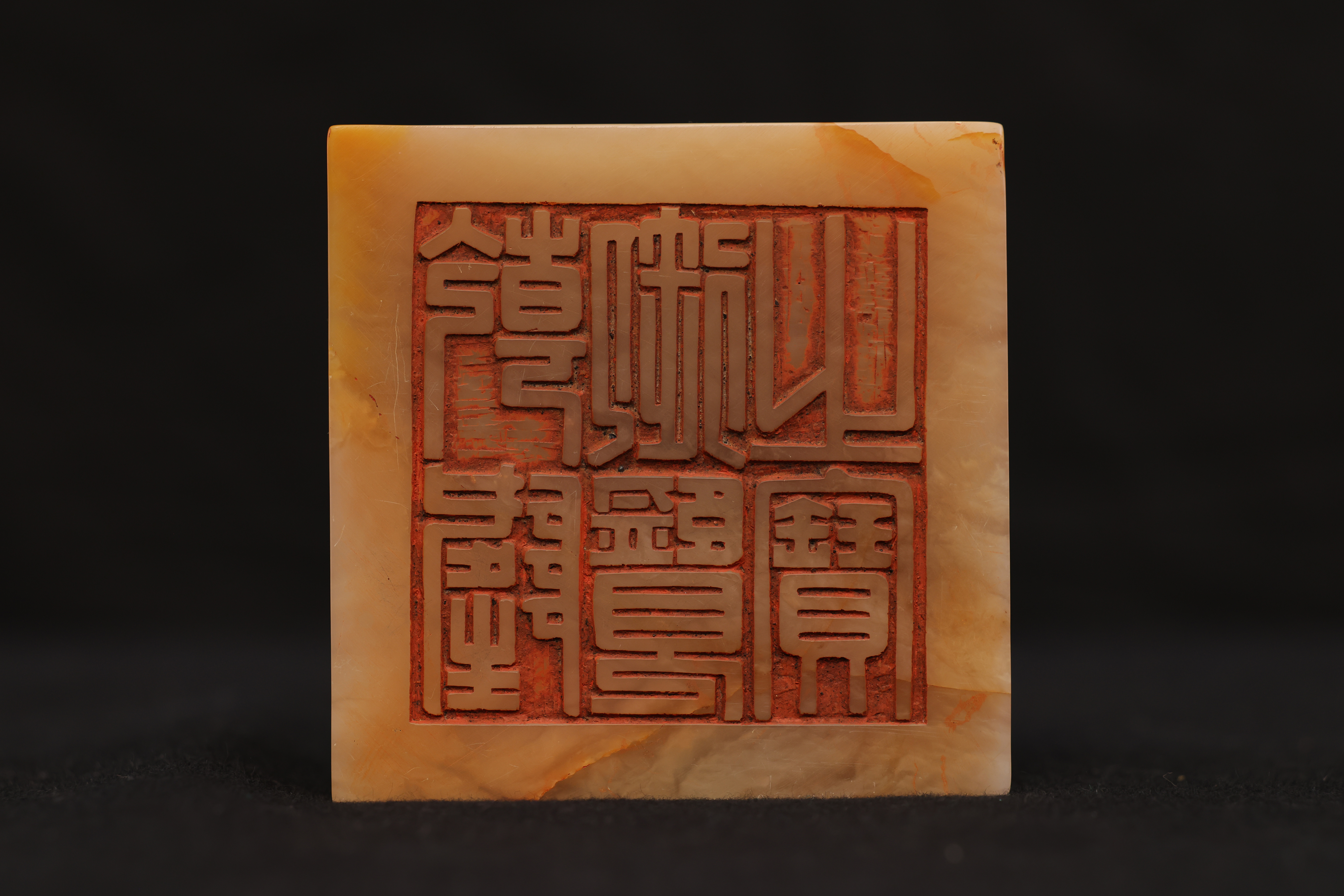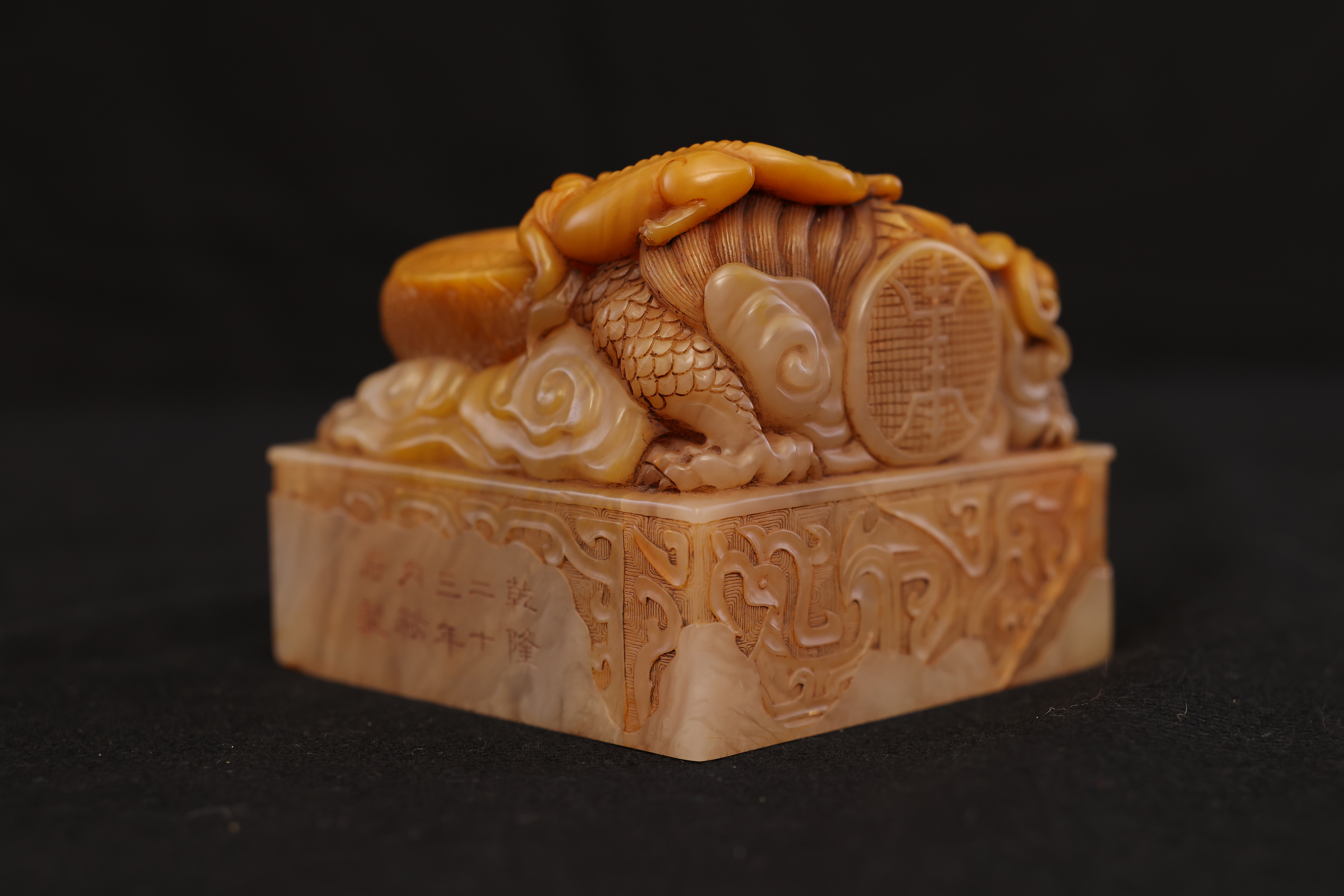 This Tianhuang seal from the Qianlong reign is carved from exceptionally fine and lustrous Tianhuang stone—its texture soft and unctuous, its color rich like ambered beeswax, displaying the characteristic translucent glow of Tianhuang dong, warm yet restrained, radiant yet never excessive. Long esteemed as the “Emperor of Seal Stones,” Tianhuang of this quality is exceedingly rare.