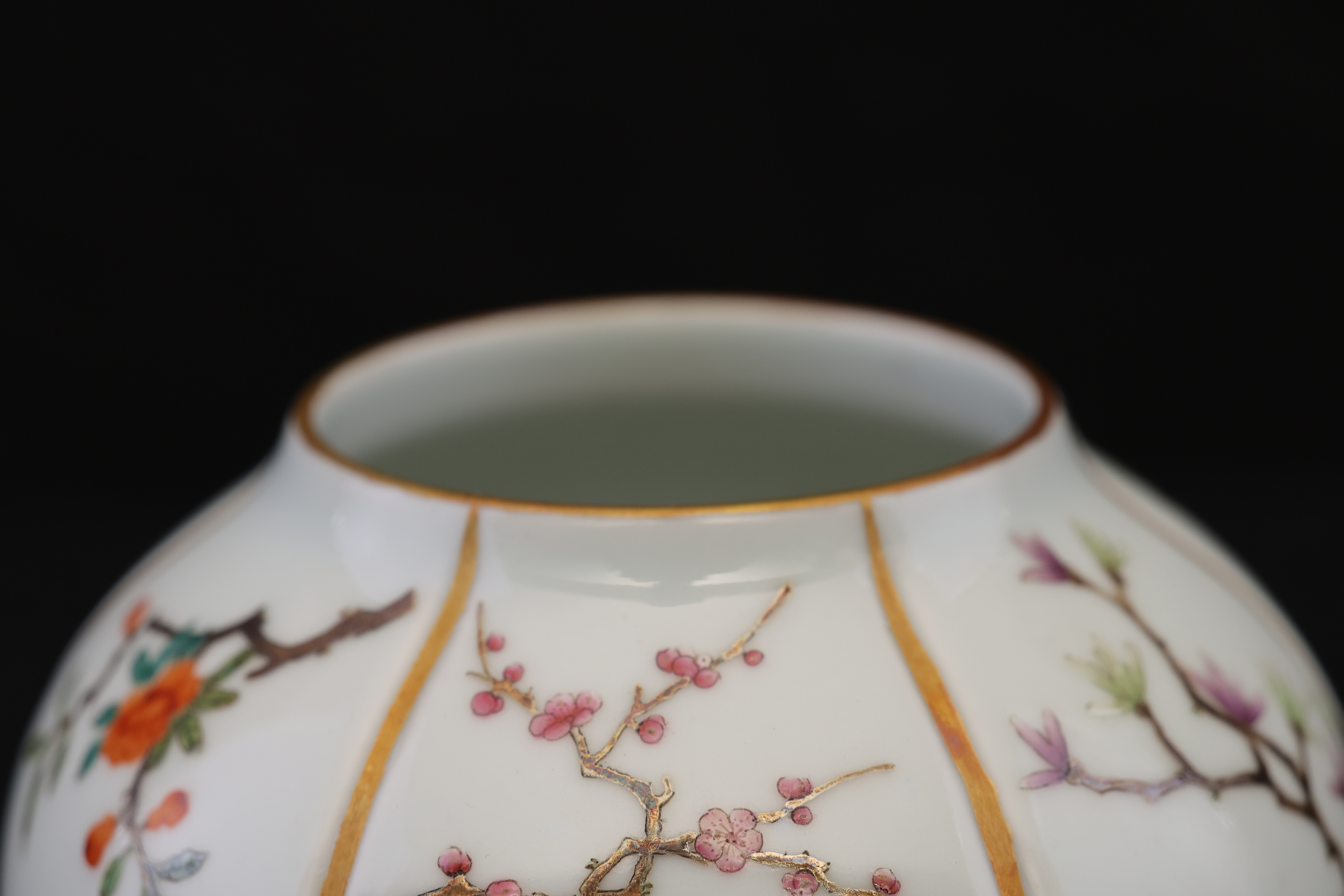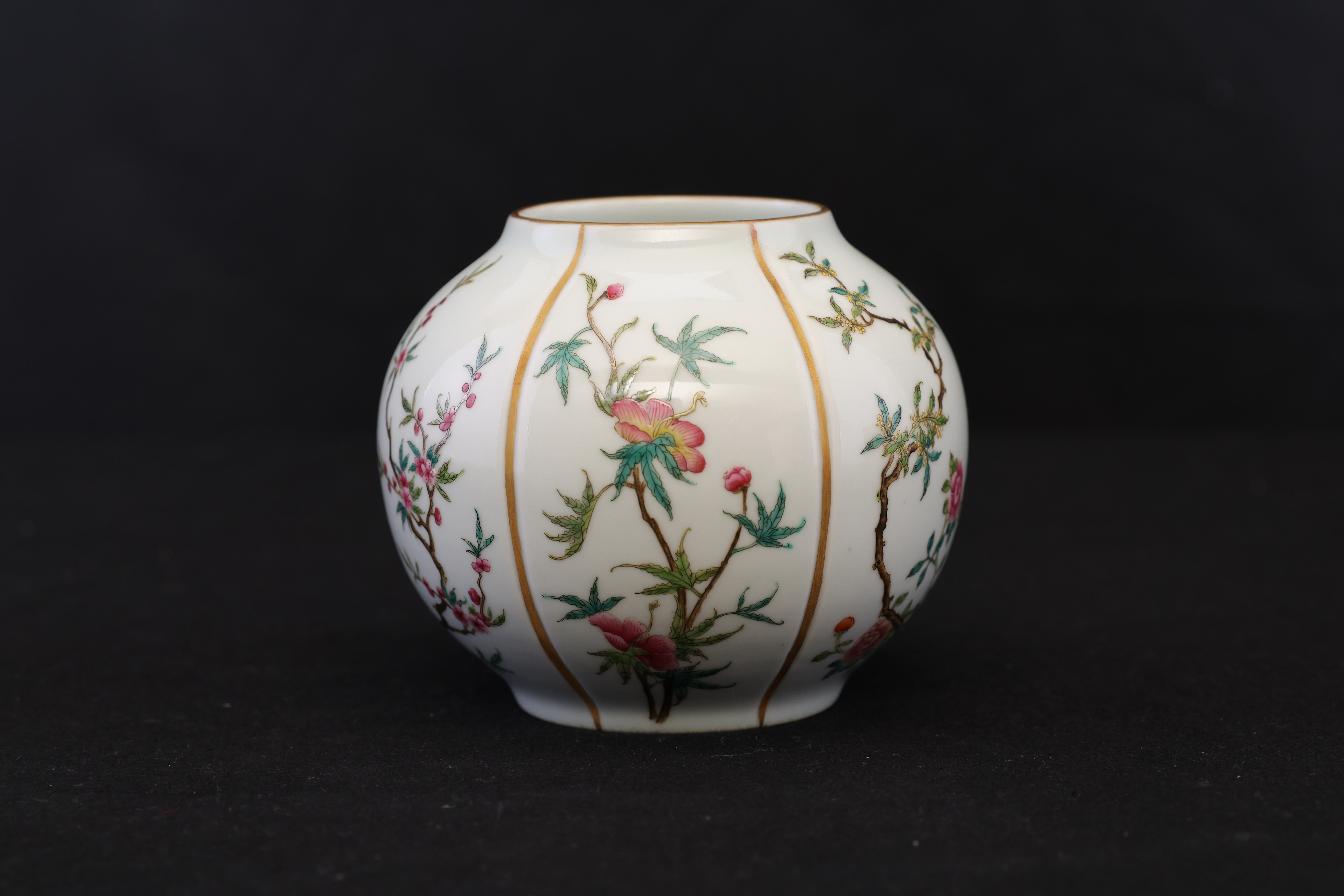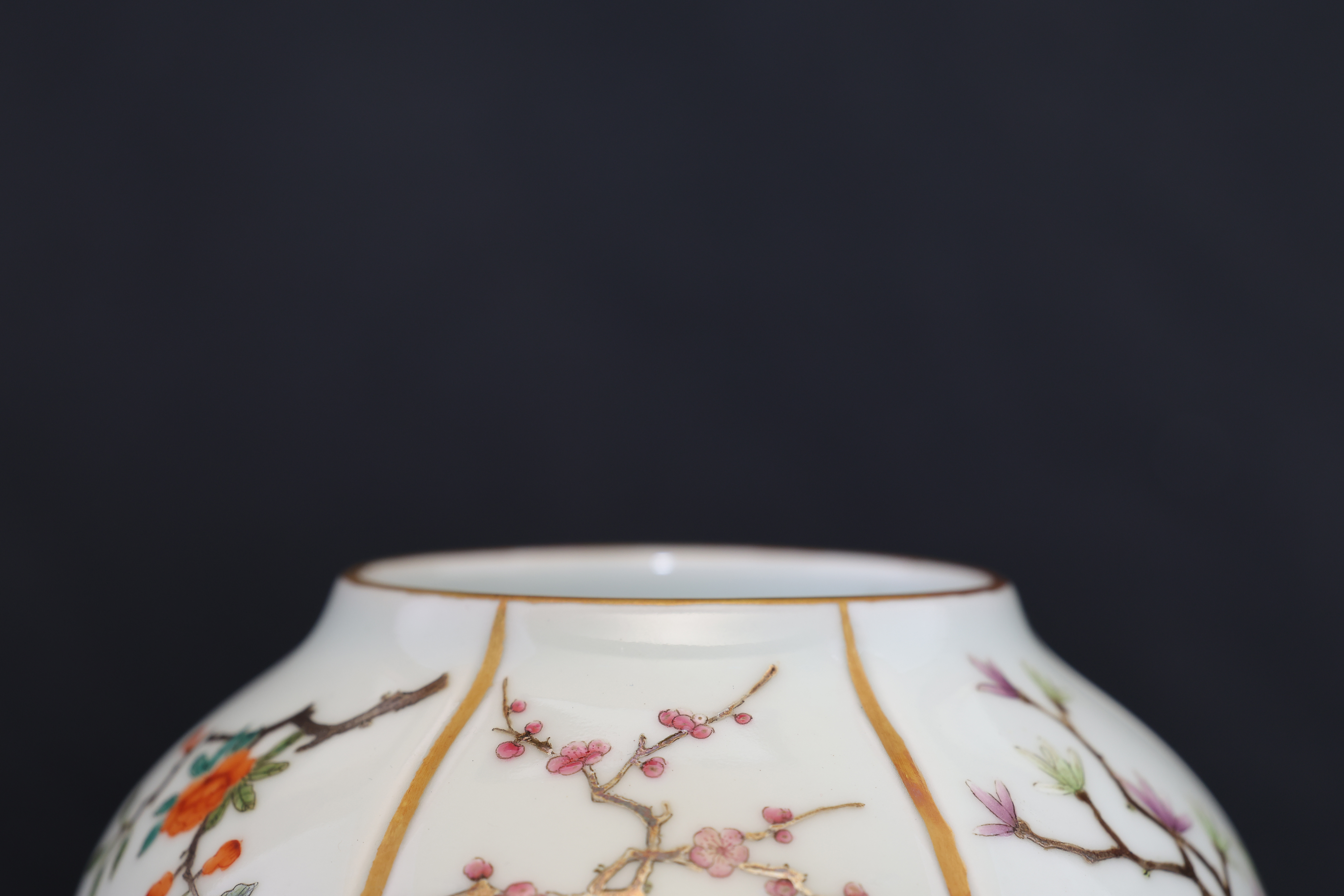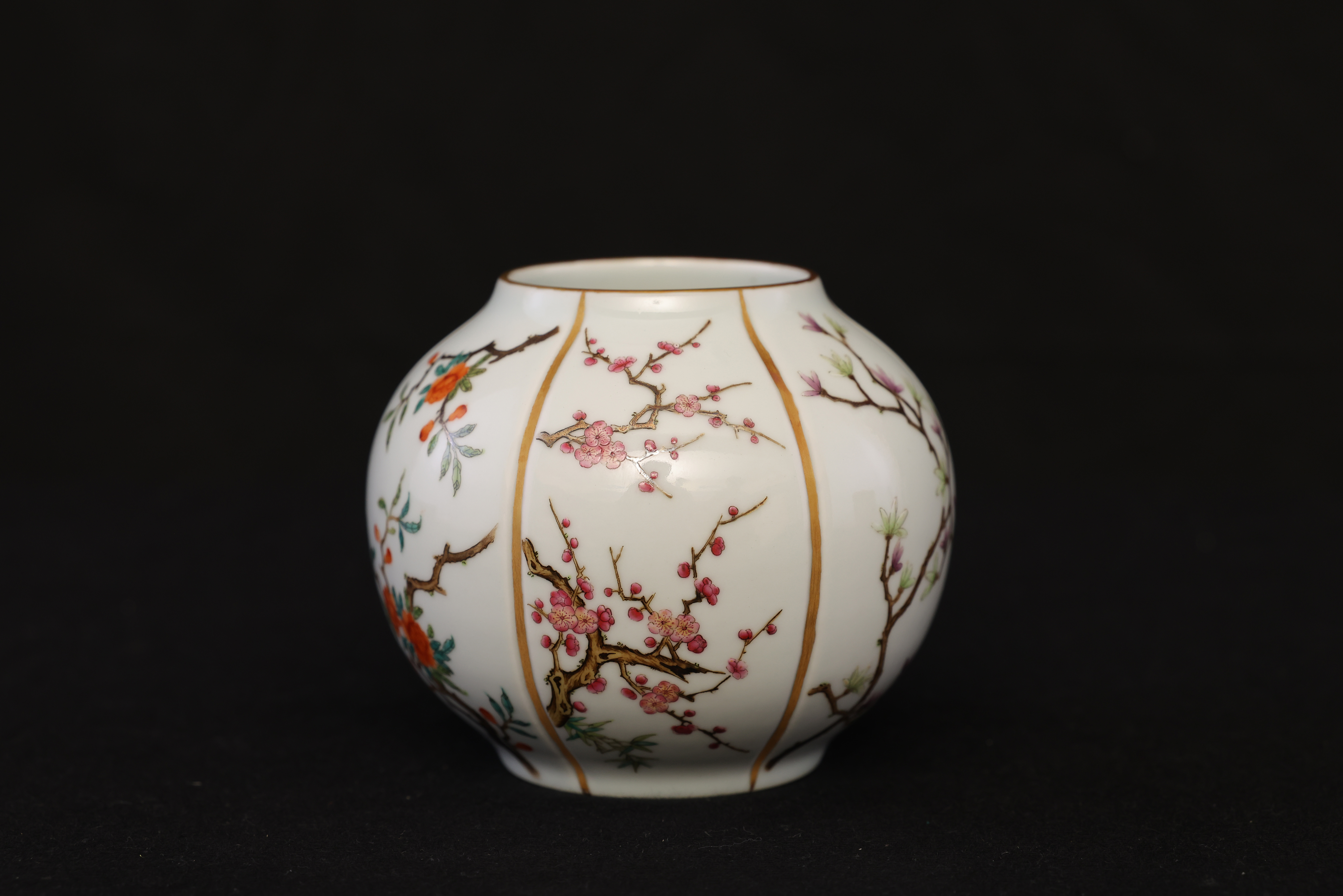 此罐,外形如瓜,圆口,口沿描金,鼓腹,圈足。通体施玻璃白釉,以瓜棱分为六面,描金;以粉彩绘折纸花卉纹,牡丹、梅花,桃花,玉兰,等。底部落青花“大清雍正年制“双圈六字三行楷书款。