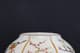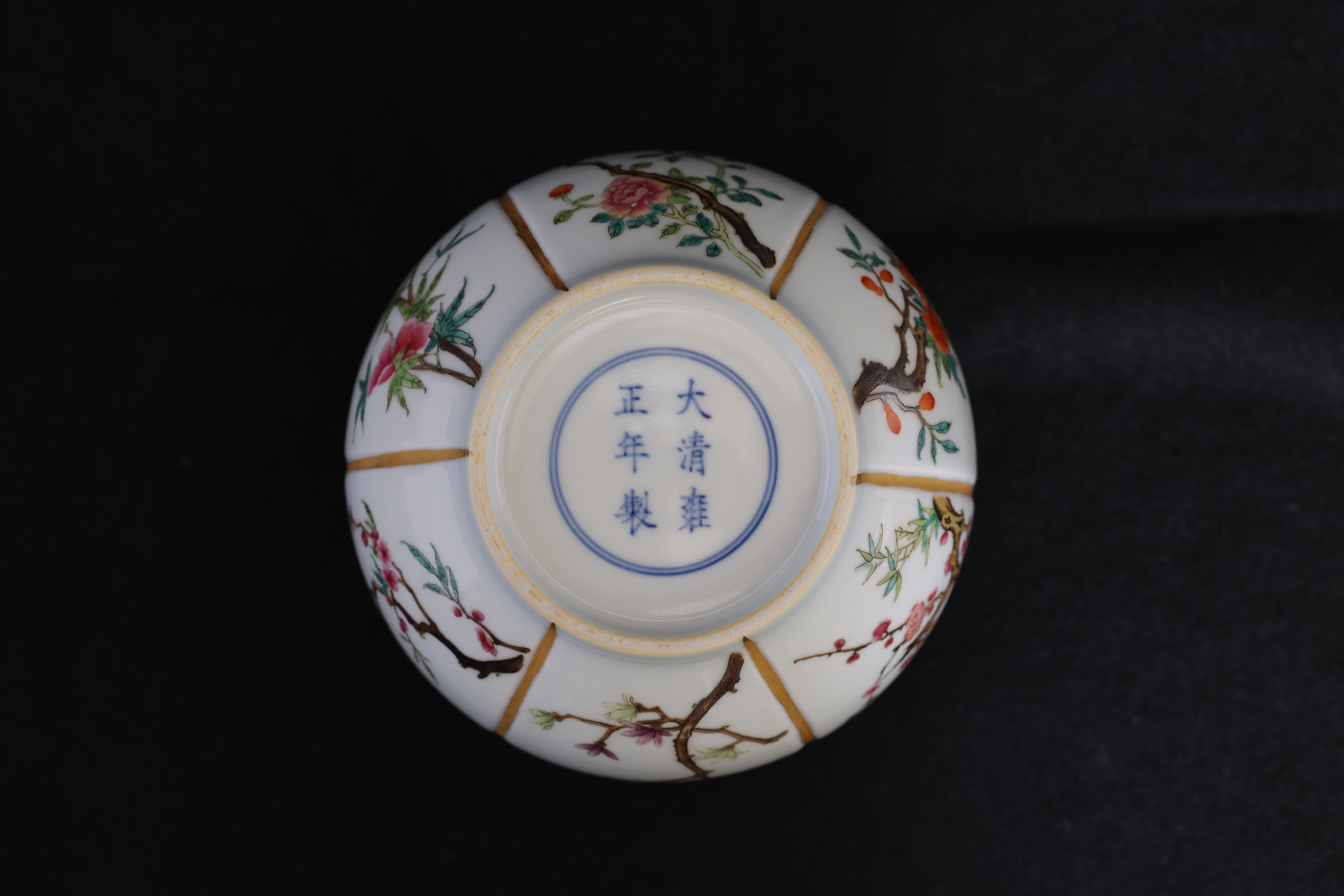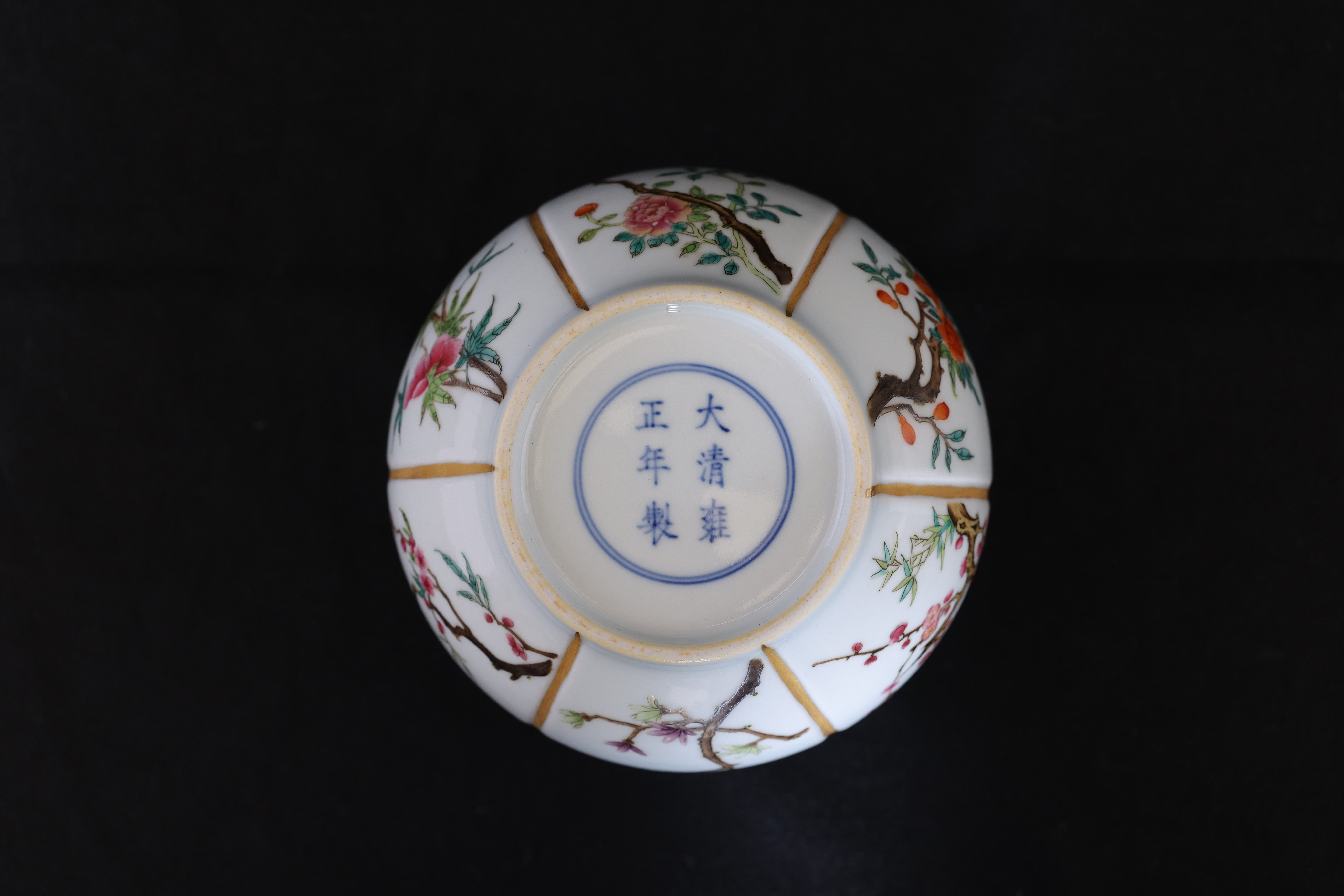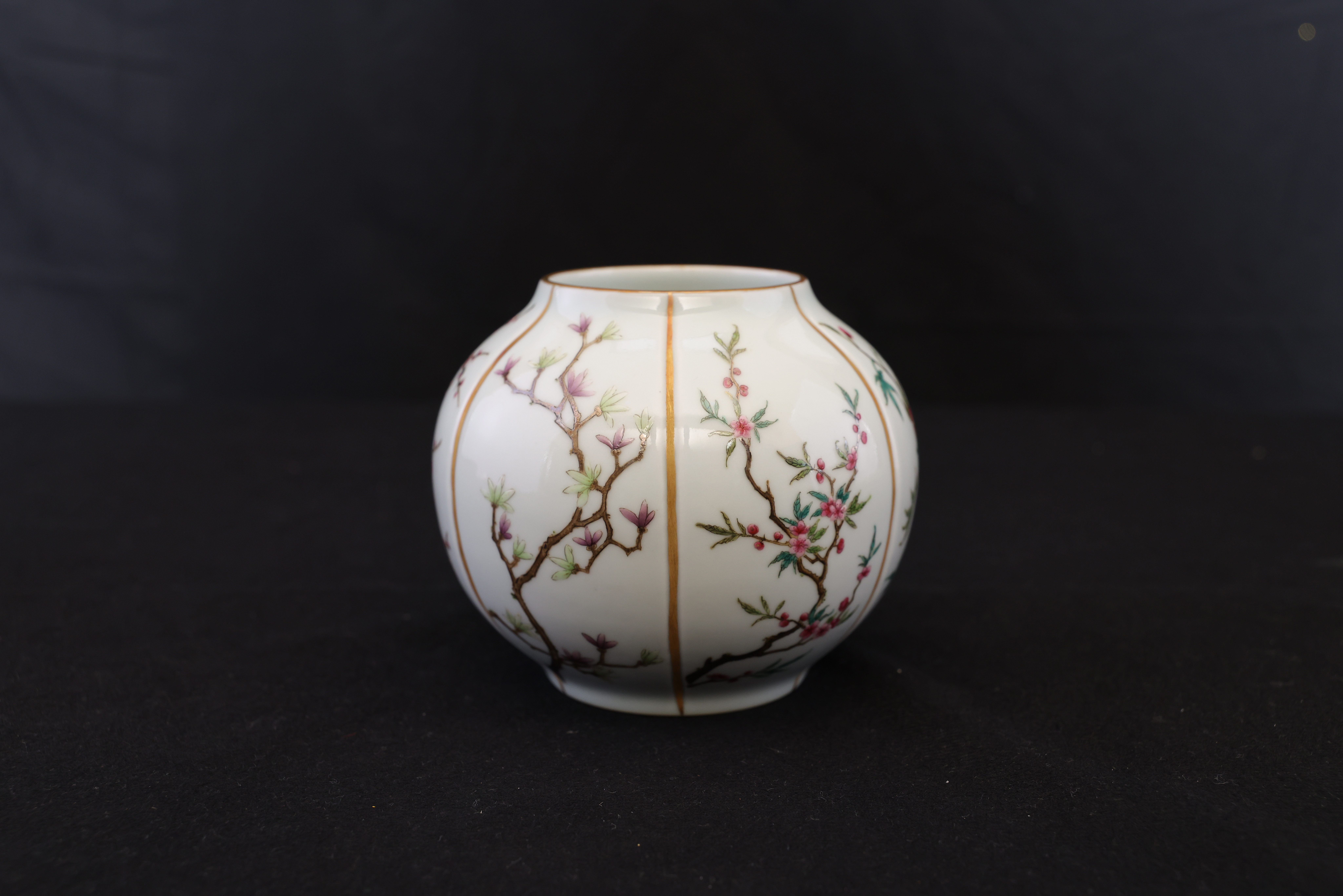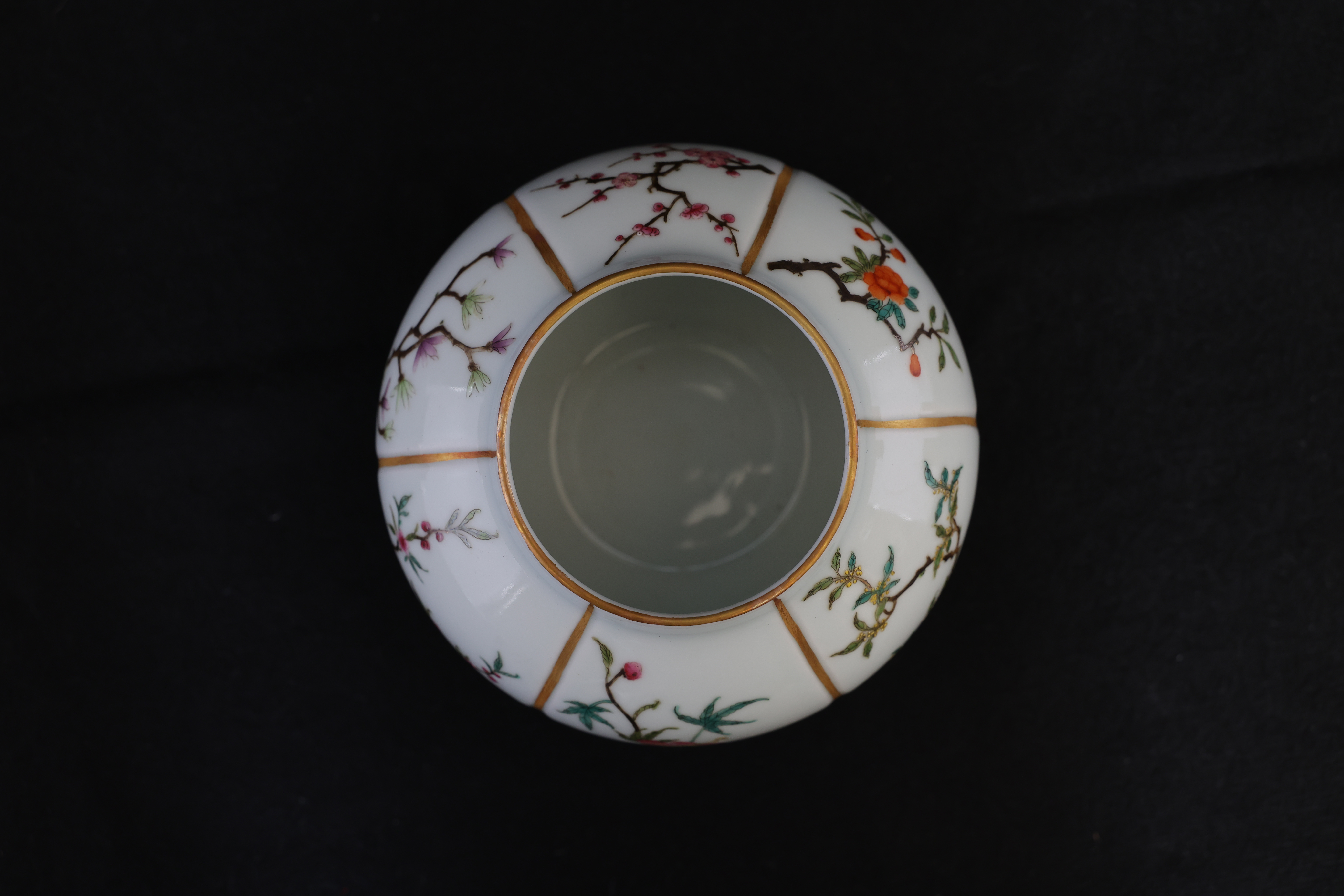 此罐,外形如瓜,圆口,口沿描金,鼓腹,圈足。通体施玻璃白釉,以瓜棱分为六面,描金;以粉彩绘折纸花卉纹,牡丹、梅花,桃花,玉兰,等。底部落青花“大清雍正年制“双圈六字三行楷书款。