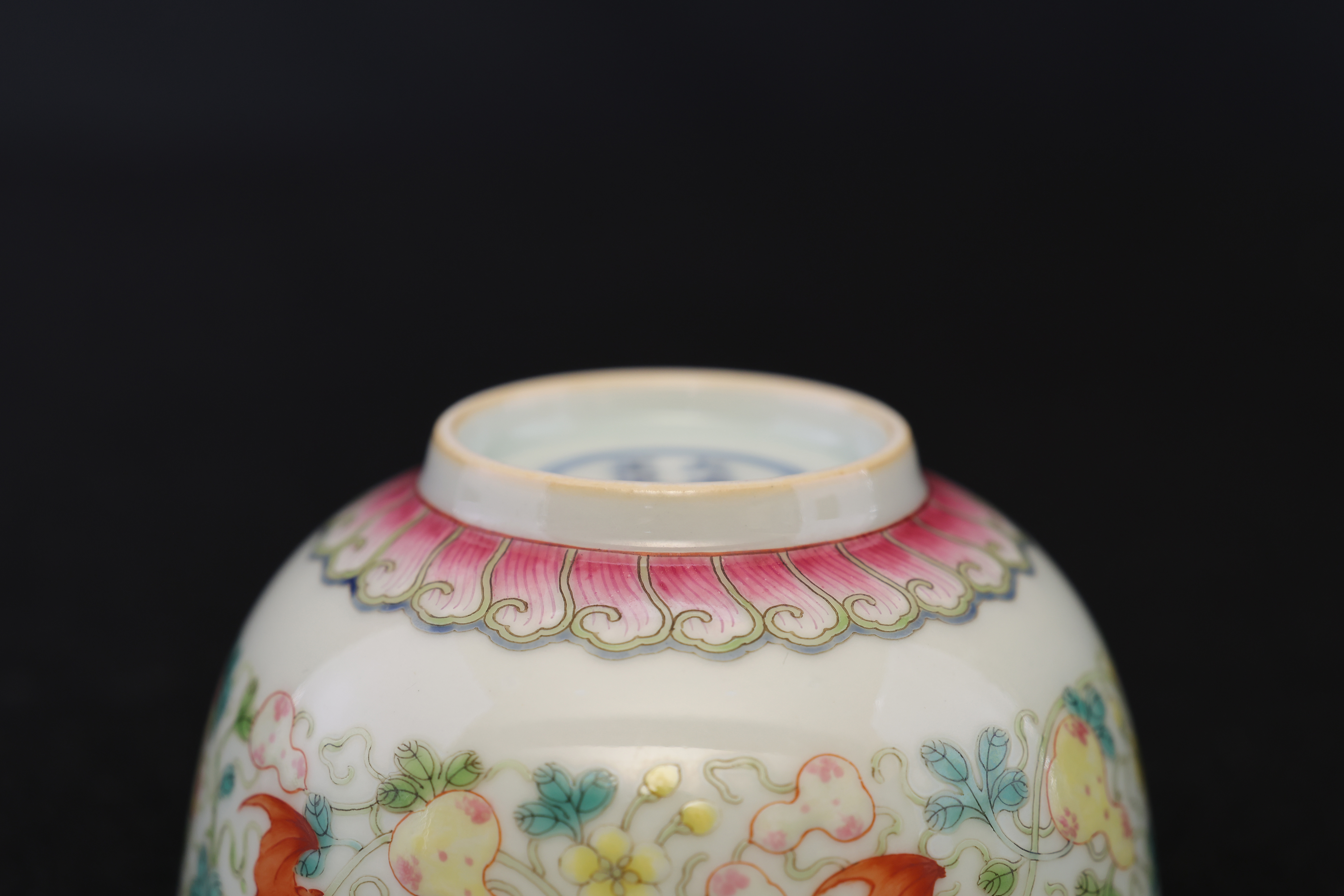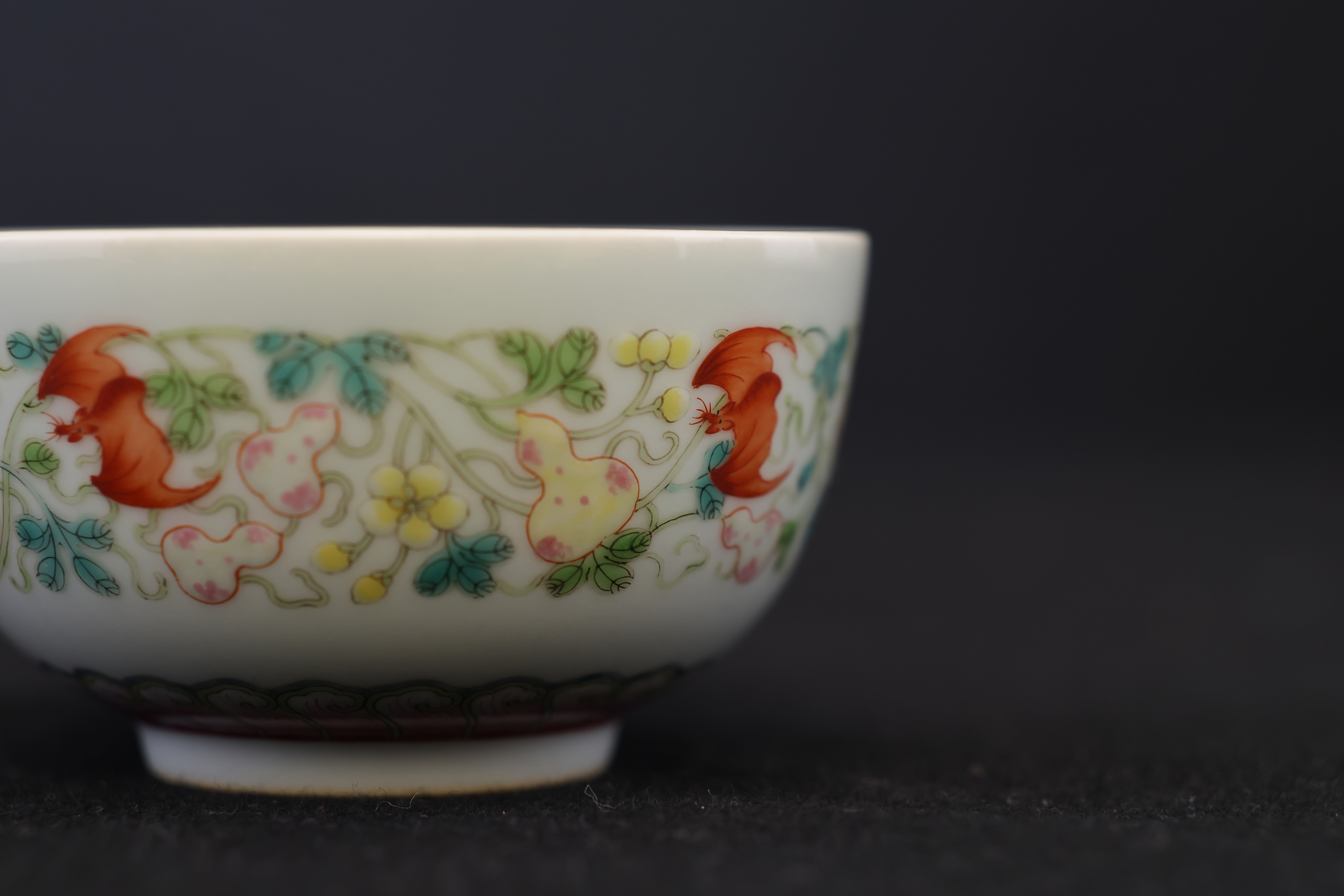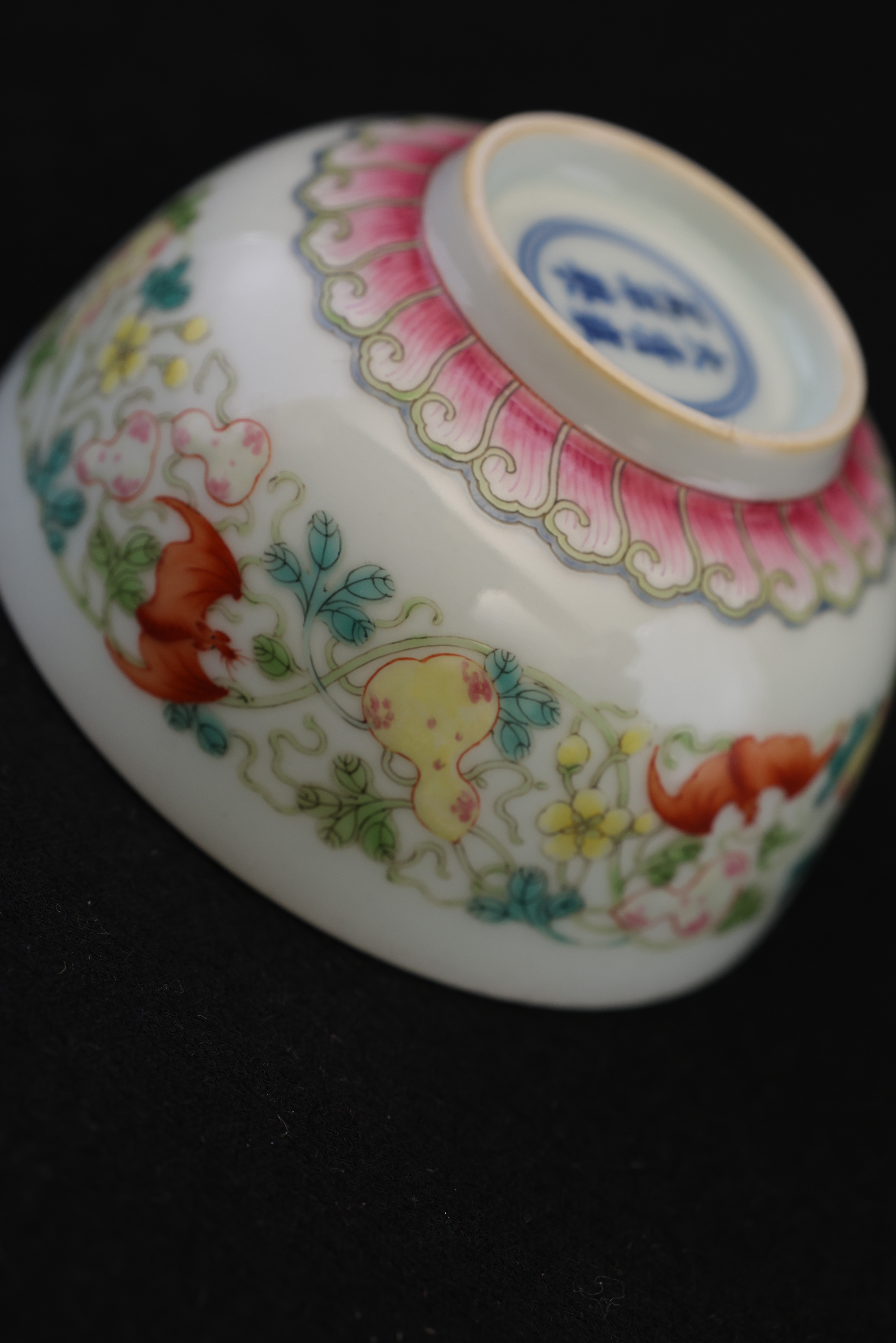 此杯口圆微侈,腹部渐收,圈足端正。底部落青花“双圈六字三行楷书款——‘大清雍正年制’”。杯体以“玻璃白”釉为底,运用丰富粉彩绘制缠枝福寿纹,寓意“福寿双全”。色彩层次自然过渡,粉色娇嫩柔美,红色浓烈醇厚,绿色清新欲滴,辅以花卉、蝙蝠、寿字等纹饰,底部饰仰莲纹。胎质细腻,釉质匀净光亮,整体莹润明丽。