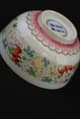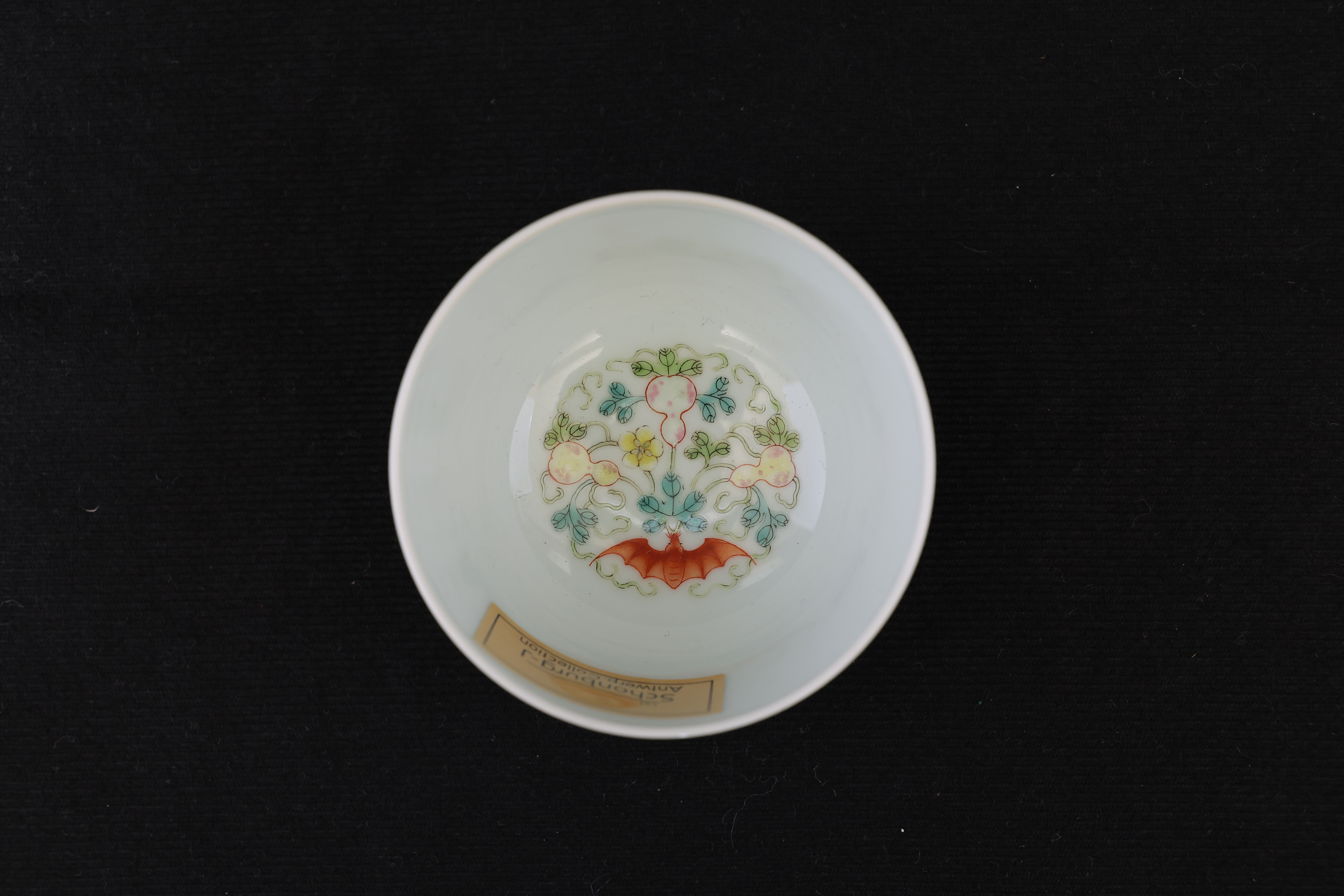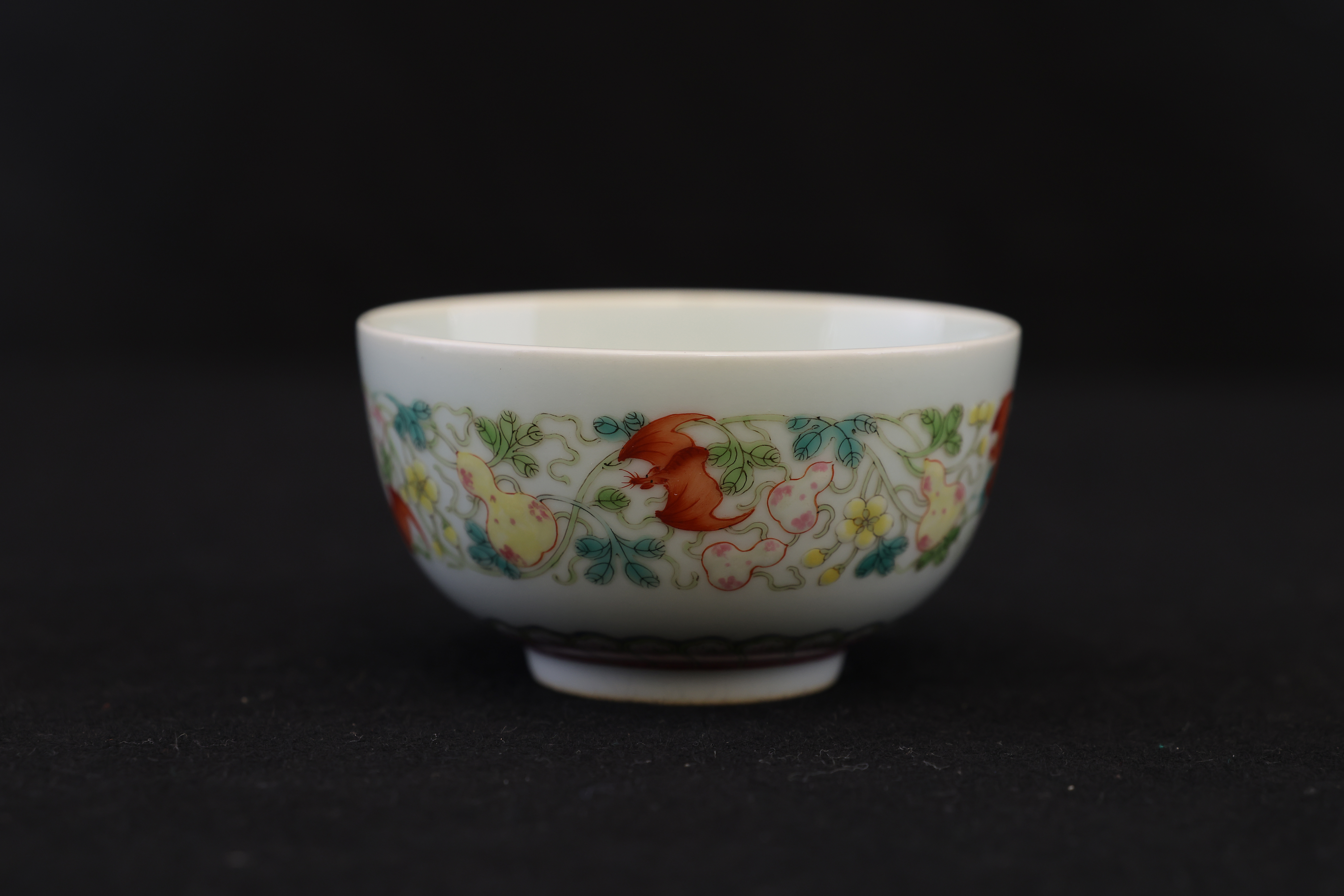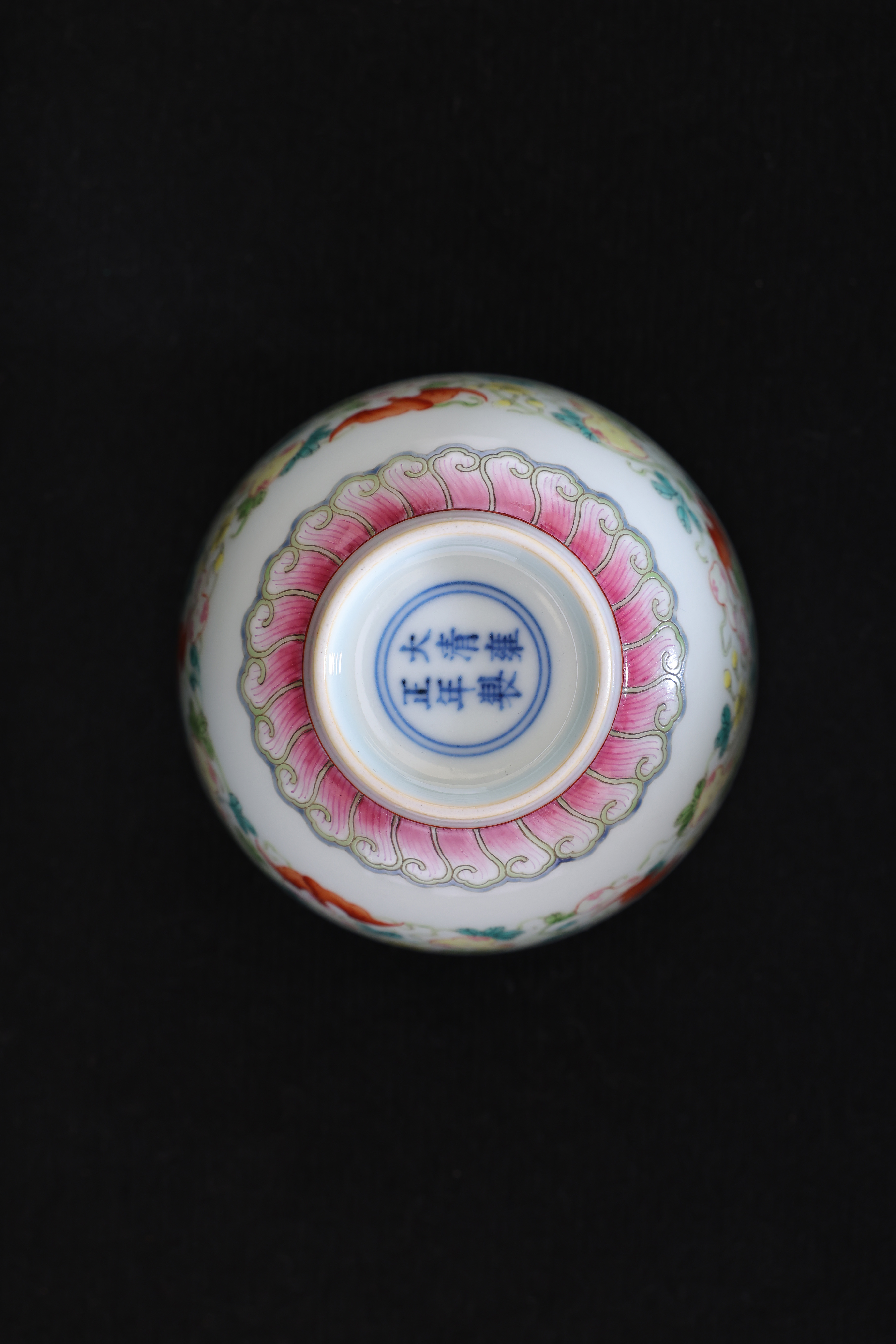 此杯口圆微侈,腹部渐收,圈足端正。底部落青花“双圈六字三行楷书款——‘大清雍正年制’”。杯体以“玻璃白”釉为底,运用丰富粉彩绘制缠枝福寿纹,寓意“福寿双全”。色彩层次自然过渡,粉色娇嫩柔美,红色浓烈醇厚,绿色清新欲滴,辅以花卉、蝙蝠、寿字等纹饰,底部饰仰莲纹。胎质细腻,釉质匀净光亮,整体莹润明丽。