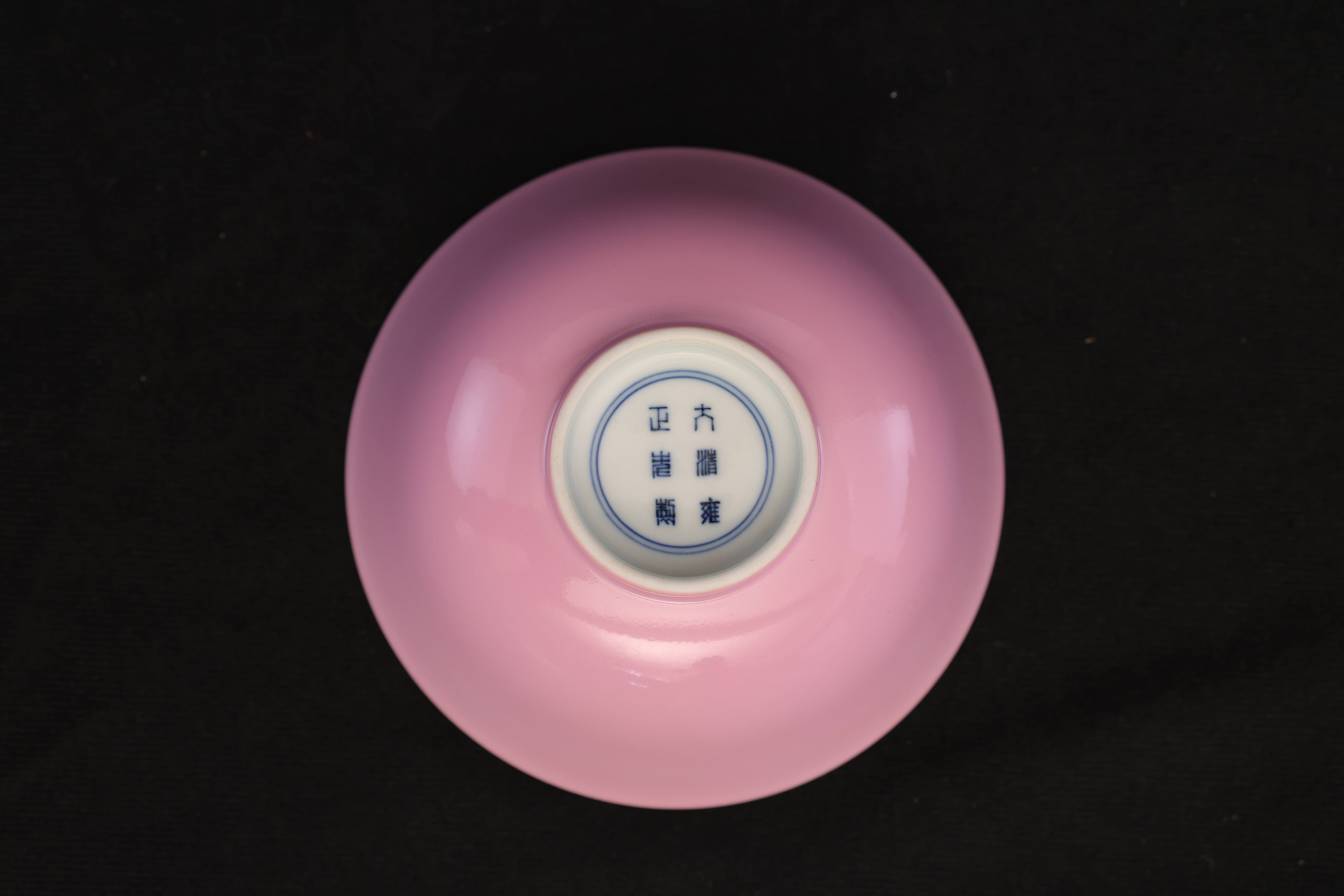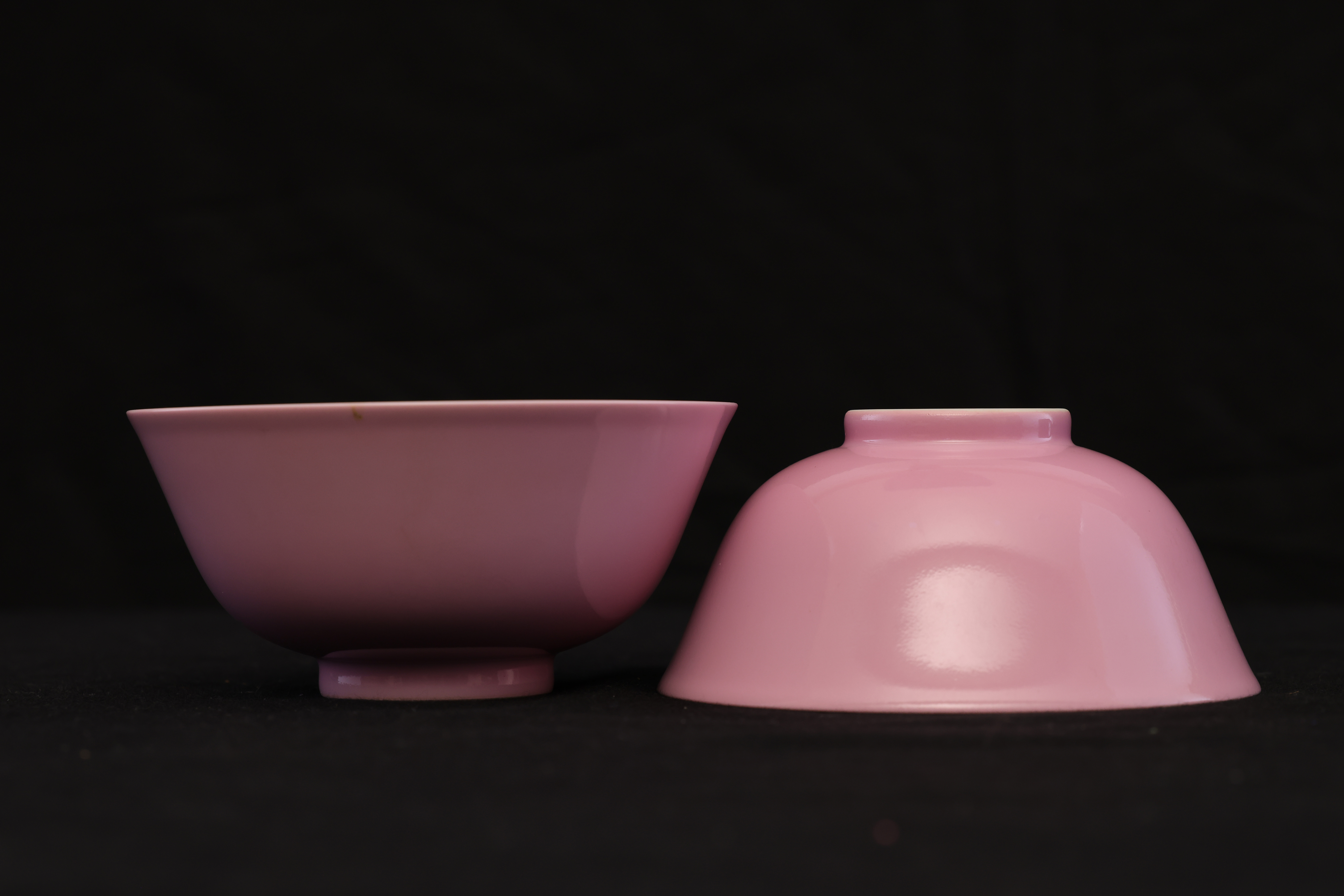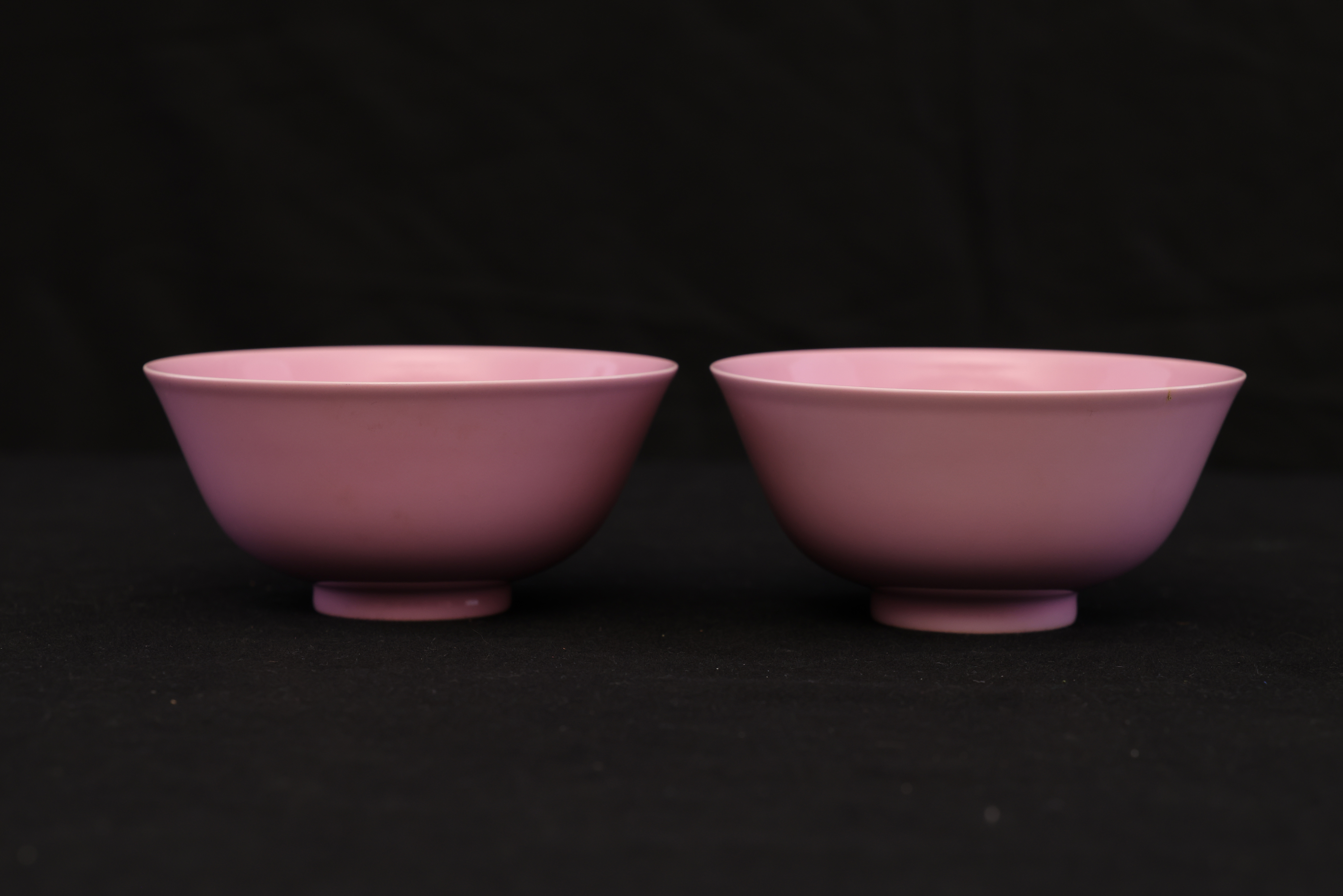 此对清雍正胭脂红碗,造型端庄雅致,胎质细腻如脂,釉色柔润匀净,尽显雍正御瓷的清雅格调与极致工艺。碗敞口、深弧腹、圈足修整规整,比例匀称,器形简洁却极富韵致,展现出雍正时期“精、雅、洁、静”的审美精神。外壁通体施胭脂红釉,釉色娇嫩莹润,宛若初春桃花,又似晚霞流彩。其色泽并非浓艳之红,而是以柔和粉红为基调,呈现半透明的釉质感,内敛含蓄,光泽温润。胭脂红釉为清代御窑名贵釉色之一,采用黄金及氯化亚金为着色剂,经高温氧化焰烧制而成,工艺繁复,成色极难掌握,故成品尤为珍贵。碗内施白釉,釉面洁白如玉,与外壁粉红相映成趣,形成内外对比之美。圈足内施白釉,底书青花双圈六字楷书款“大清雍正年制”,字体端正挺秀,笔意流畅,显为景德镇御窑厂制品。胭脂红为清宫御用之釉色,多供皇室内廷陈设及赏玩之用,雍正时期尤重此类素釉器,以其色泽清雅、气韵含蓄而见称。此对碗色泽匀净、胎釉合度、款识清晰,为雍正御窑胭脂红釉瓷的典范之作,体现出宫廷瓷器审美从繁缛走向简净的转折。
