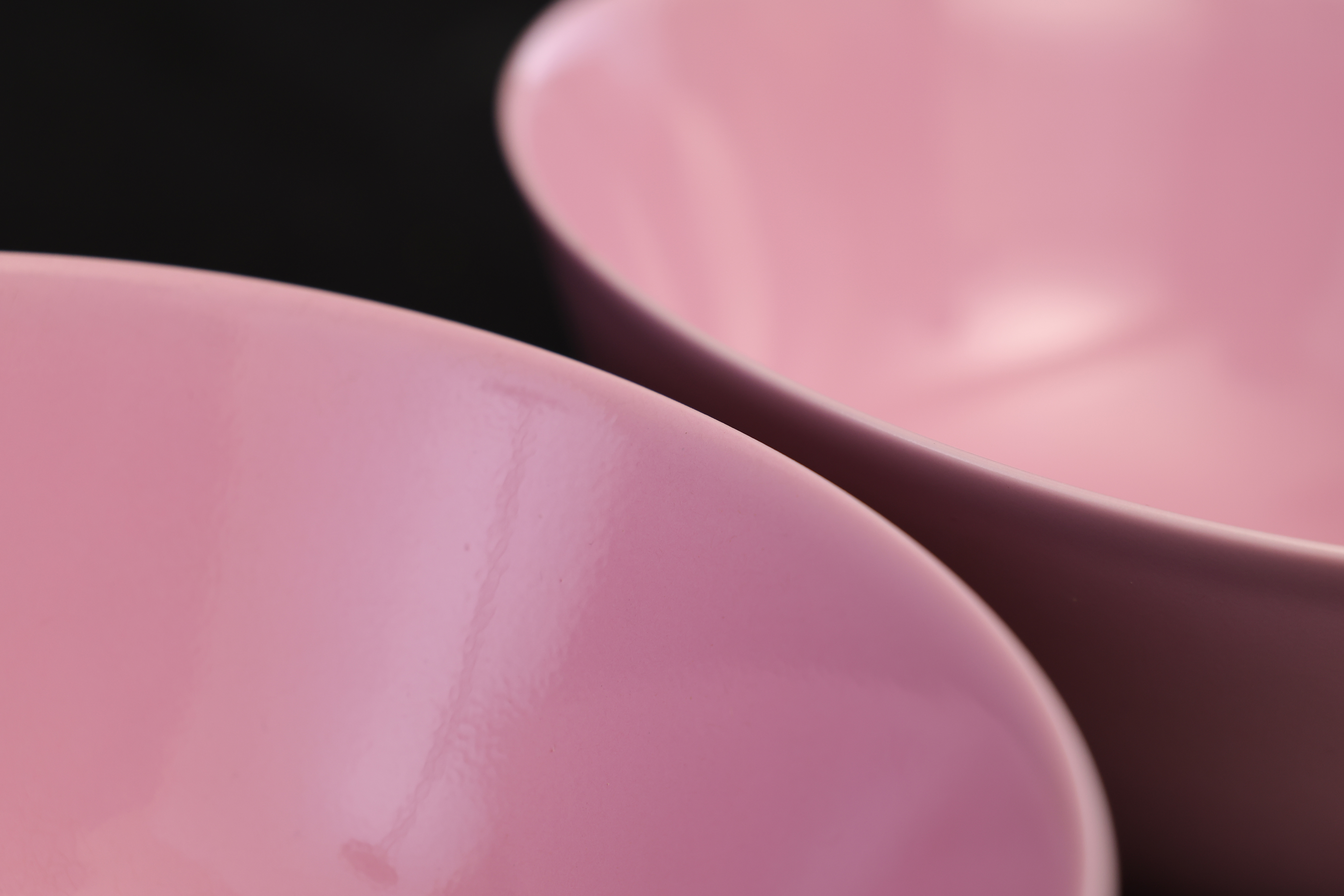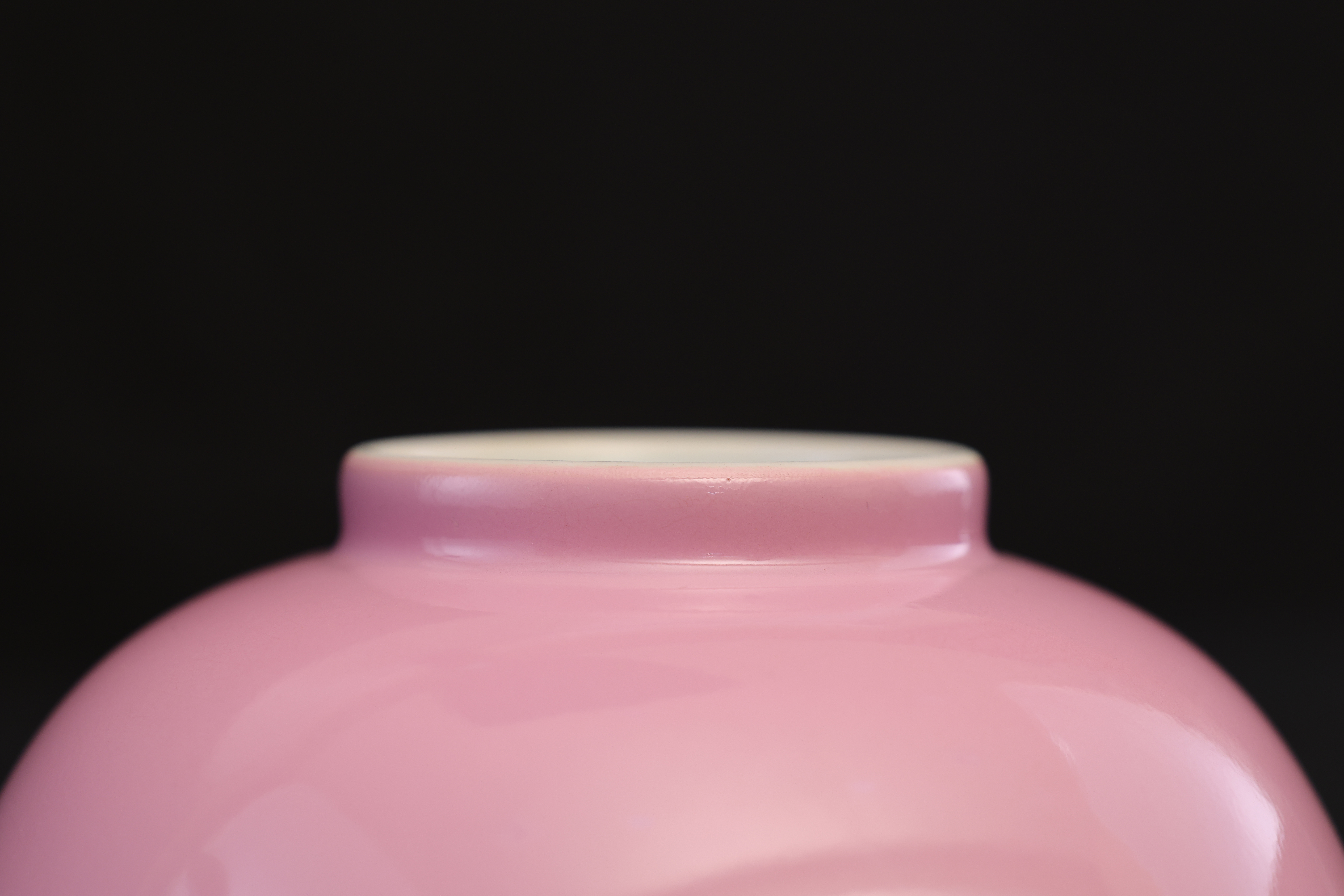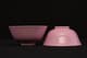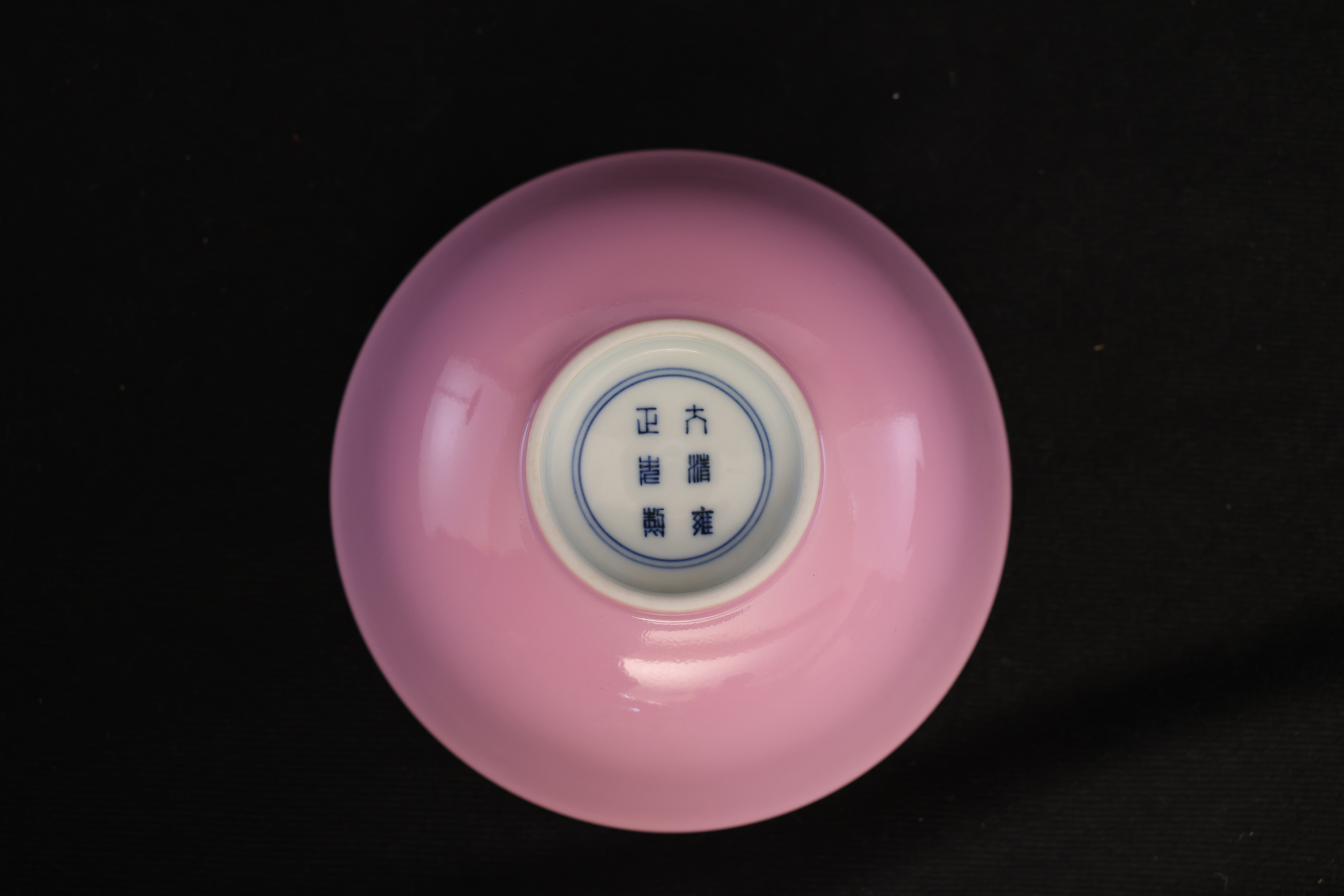 此对清雍正胭脂红碗,造型端庄雅致,胎质细腻如脂,釉色柔润匀净,尽显雍正御瓷的清雅格调与极致工艺。碗敞口、深弧腹、圈足修整规整,比例匀称,器形简洁却极富韵致,展现出雍正时期“精、雅、洁、静”的审美精神。外壁通体施胭脂红釉,釉色娇嫩莹润,宛若初春桃花,又似晚霞流彩。其色泽并非浓艳之红,而是以柔和粉红为基调,呈现半透明的釉质感,内敛含蓄,光泽温润。胭脂红釉为清代御窑名贵釉色之一,采用黄金及氯化亚金为着色剂,经高温氧化焰烧制而成,工艺繁复,成色极难掌握,故成品尤为珍贵。碗内施白釉,釉面洁白如玉,与外壁粉红相映成趣,形成内外对比之美。圈足内施白釉,底书青花双圈六字楷书款“大清雍正年制”,字体端正挺秀,笔意流畅,显为景德镇御窑厂制品。胭脂红为清宫御用之釉色,多供皇室内廷陈设及赏玩之用,雍正时期尤重此类素釉器,以其色泽清雅、气韵含蓄而见称。此对碗色泽匀净、胎釉合度、款识清晰,为雍正御窑胭脂红釉瓷的典范之作,体现出宫廷瓷器审美从繁缛走向简净的转折。