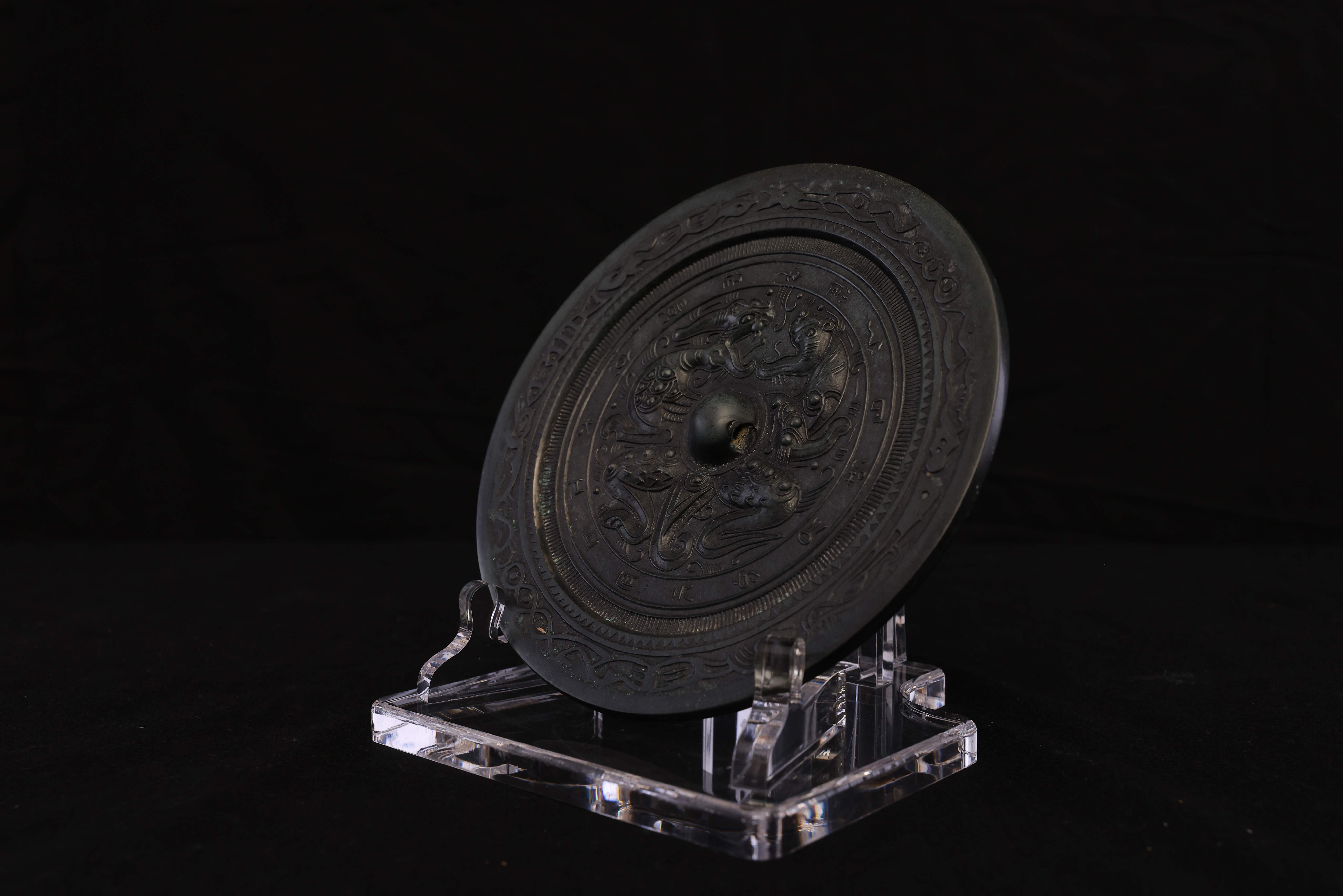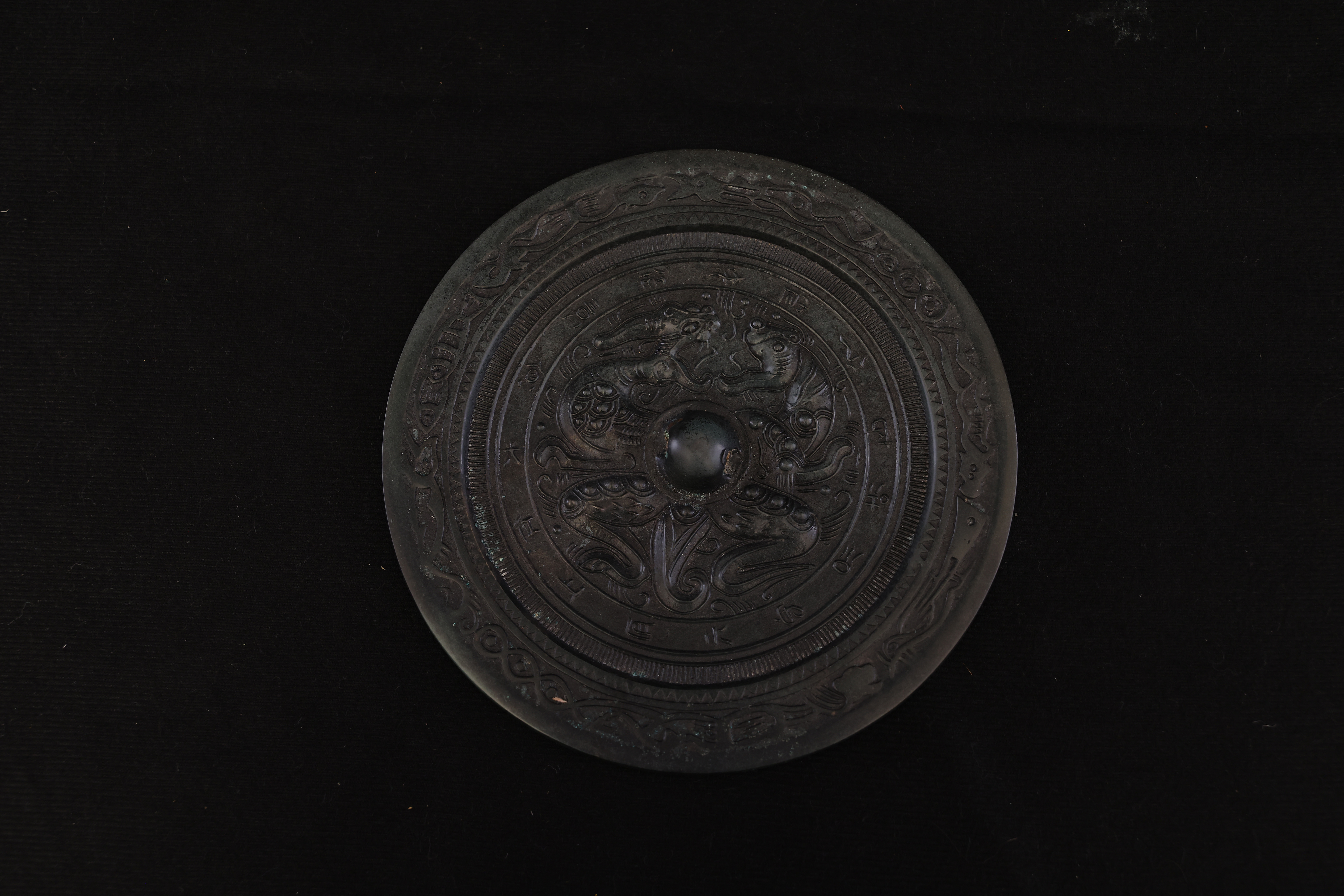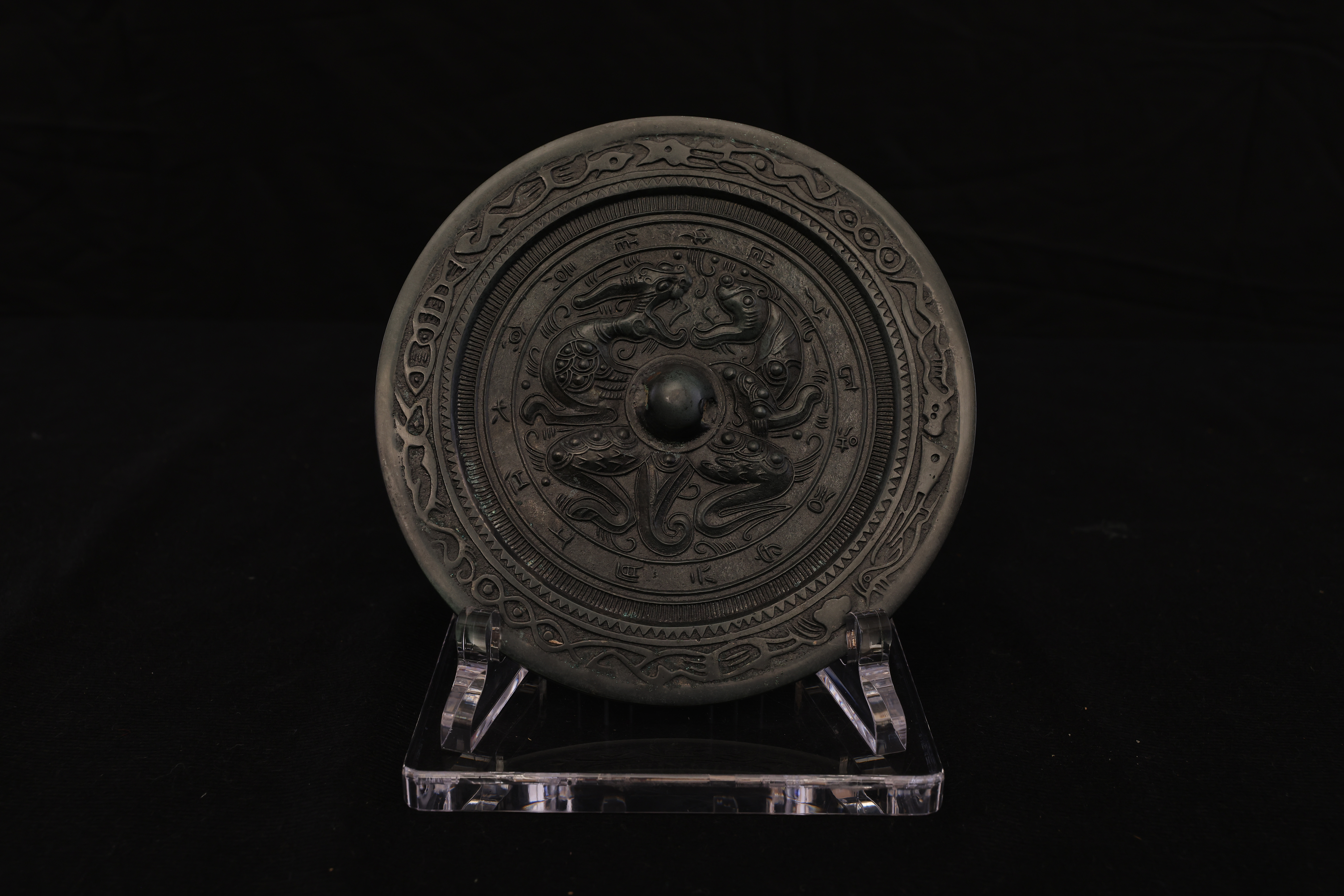 此面汉代錾龙虎斗铭文青铜镜,通体以精炼青铜铸造,质坚色古,铜光沉稳而含蓄。镜体呈圆形,造型端正,线条流畅。镜背中央设高钮,钮座环饰细密的连珠纹与锯齿纹,规整有序,尽显汉代铸镜工艺之严谨。镜面纹饰主题为“龙虎相斗”,中央龙虎相向而势腾,龙身盘曲,鳞爪精细,气势矫健;虎体伏跃,筋骨遒劲,目光炯然。二兽腾挪之间,腾云驾雾,周围辅以流云与火纹,动势呼应,生气勃勃,象征天地阴阳对峙与万物生化的宇宙观。龙虎之间寓“斗而生和”,既含阳刚奋发之气,又寓镇邪辟恶、祈福延祥之意。外缘铸铭文一周,文字以小篆书体铸刻,笔画挺拔,线条圆劲流畅,铭曰吉语,寓意安康富贵。铭文外环饰以蛇纹与卷云纹,线条婉转盘旋,与内区龙虎图案互为映衬,结构严谨,布局分明。整镜纹饰繁而不乱,铸工精湛,刀痕细致,铜质温润而古雅。此镜不仅为照面之具,更为汉代贵族案头陈设或随葬重器,象征威仪与祥瑞。