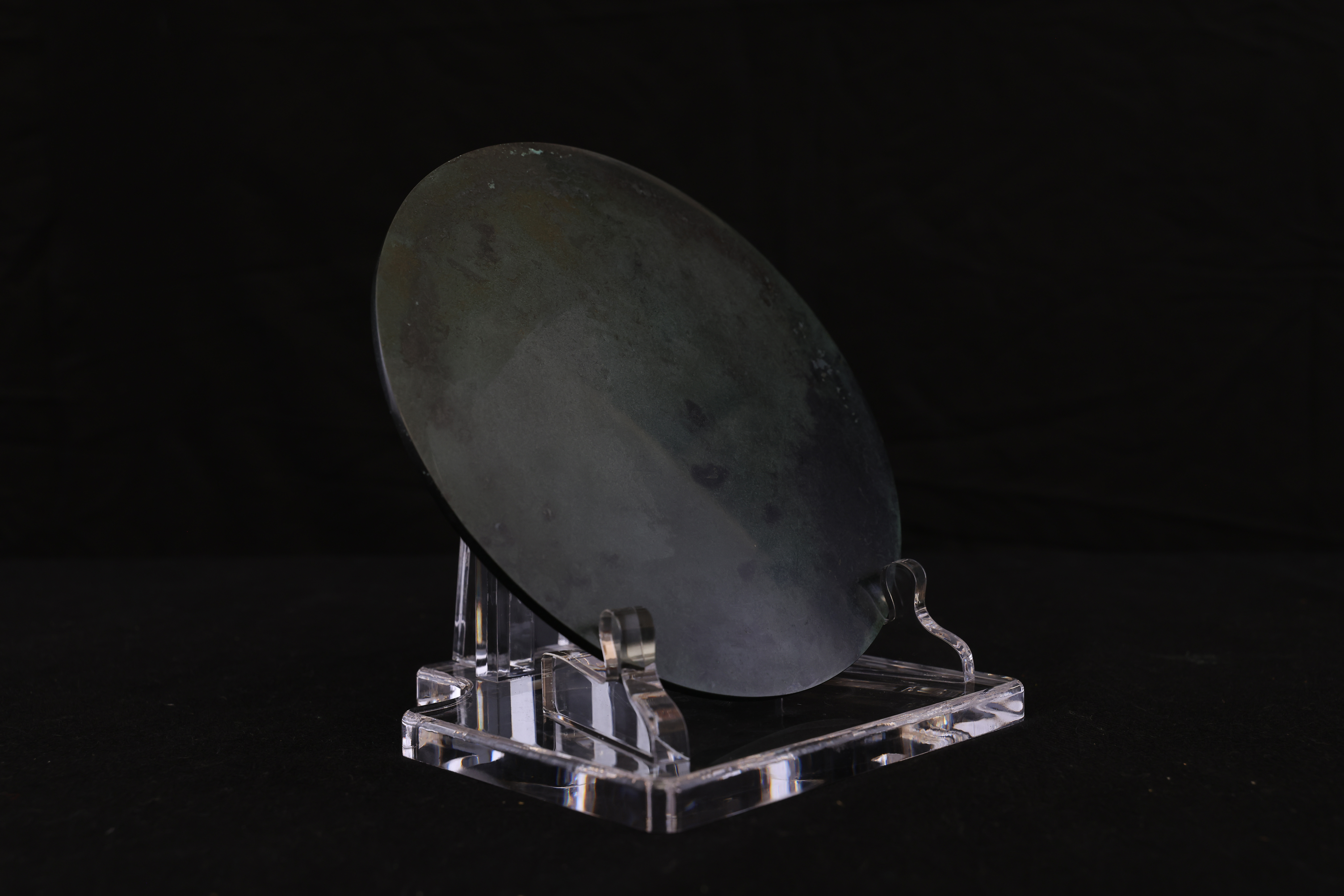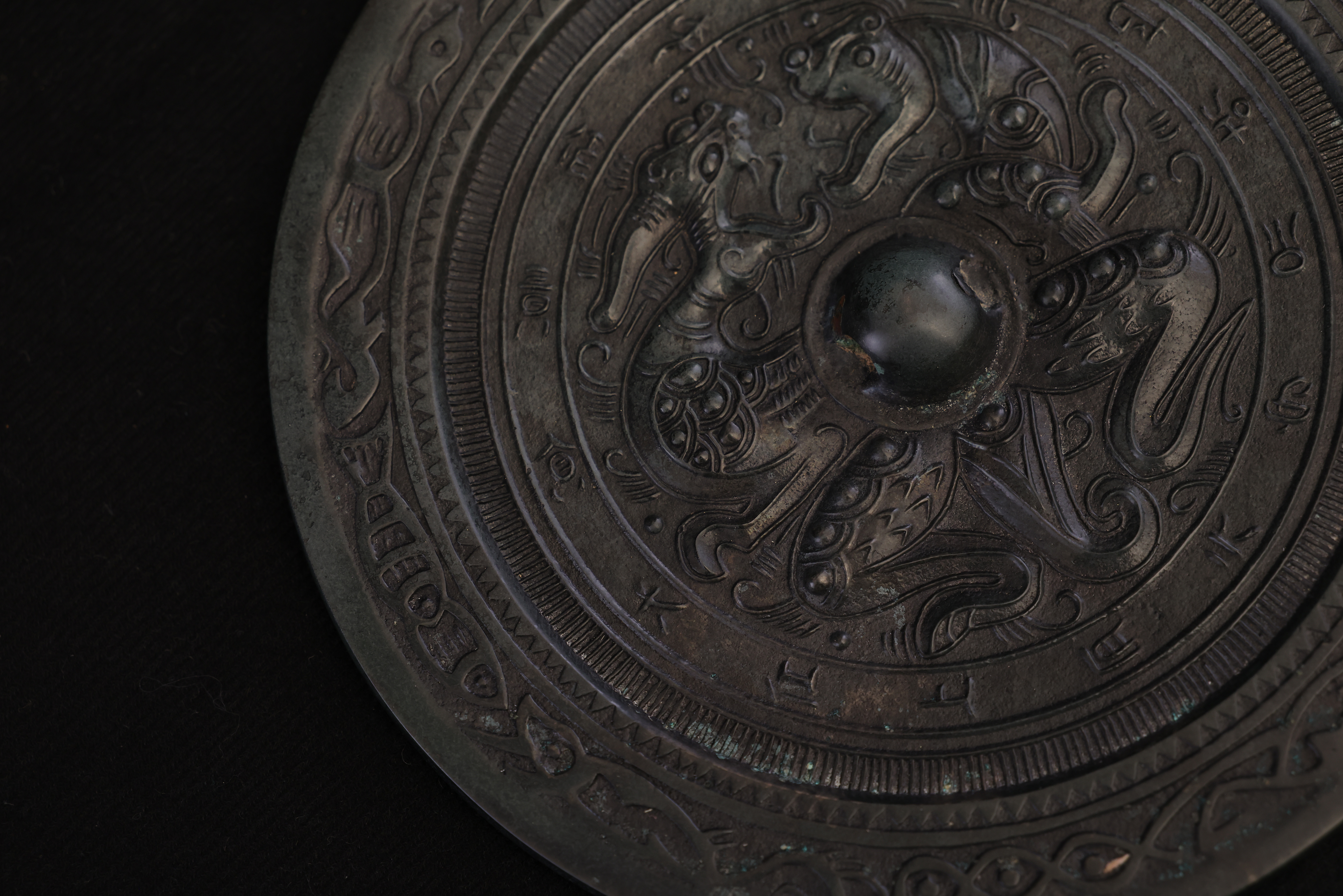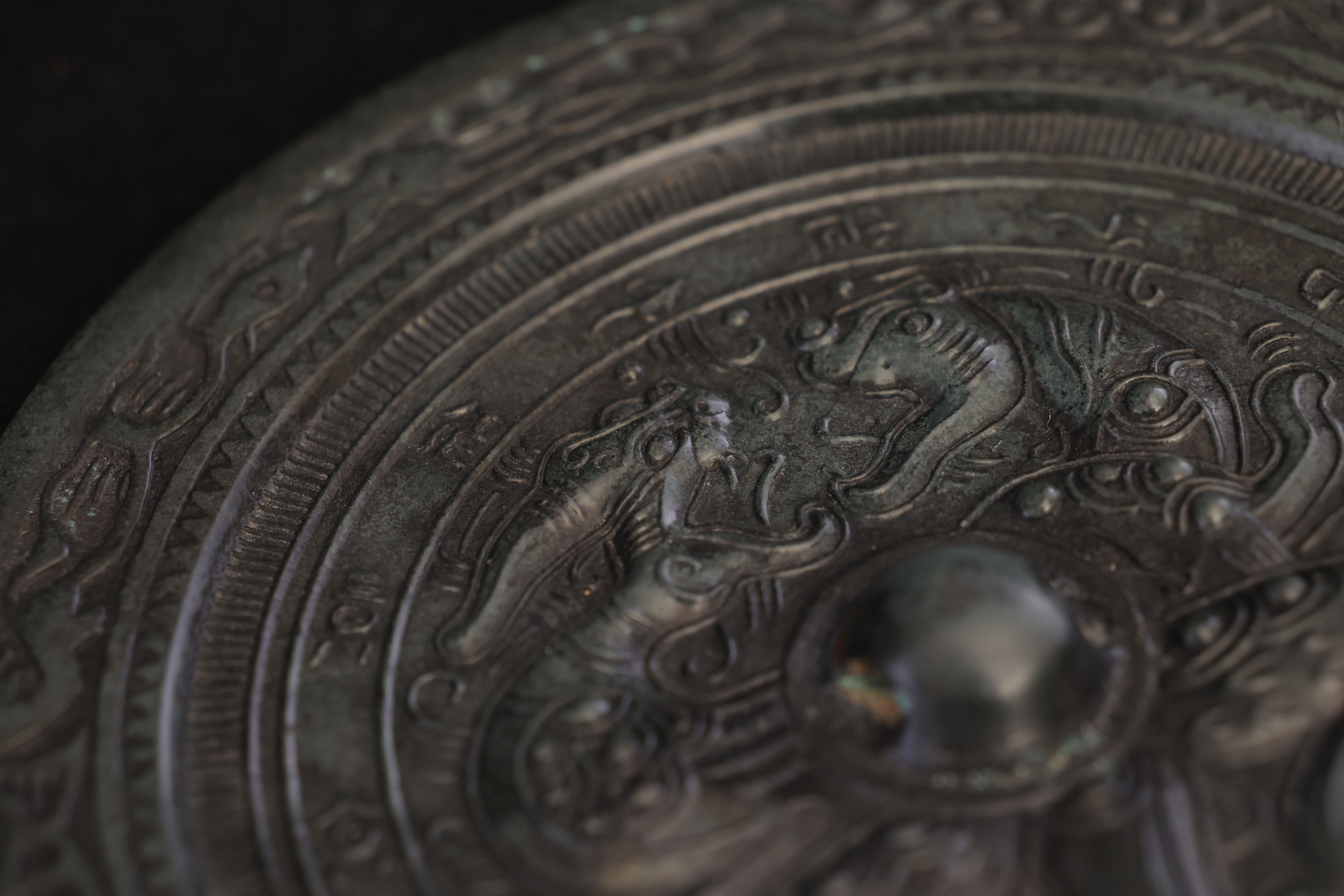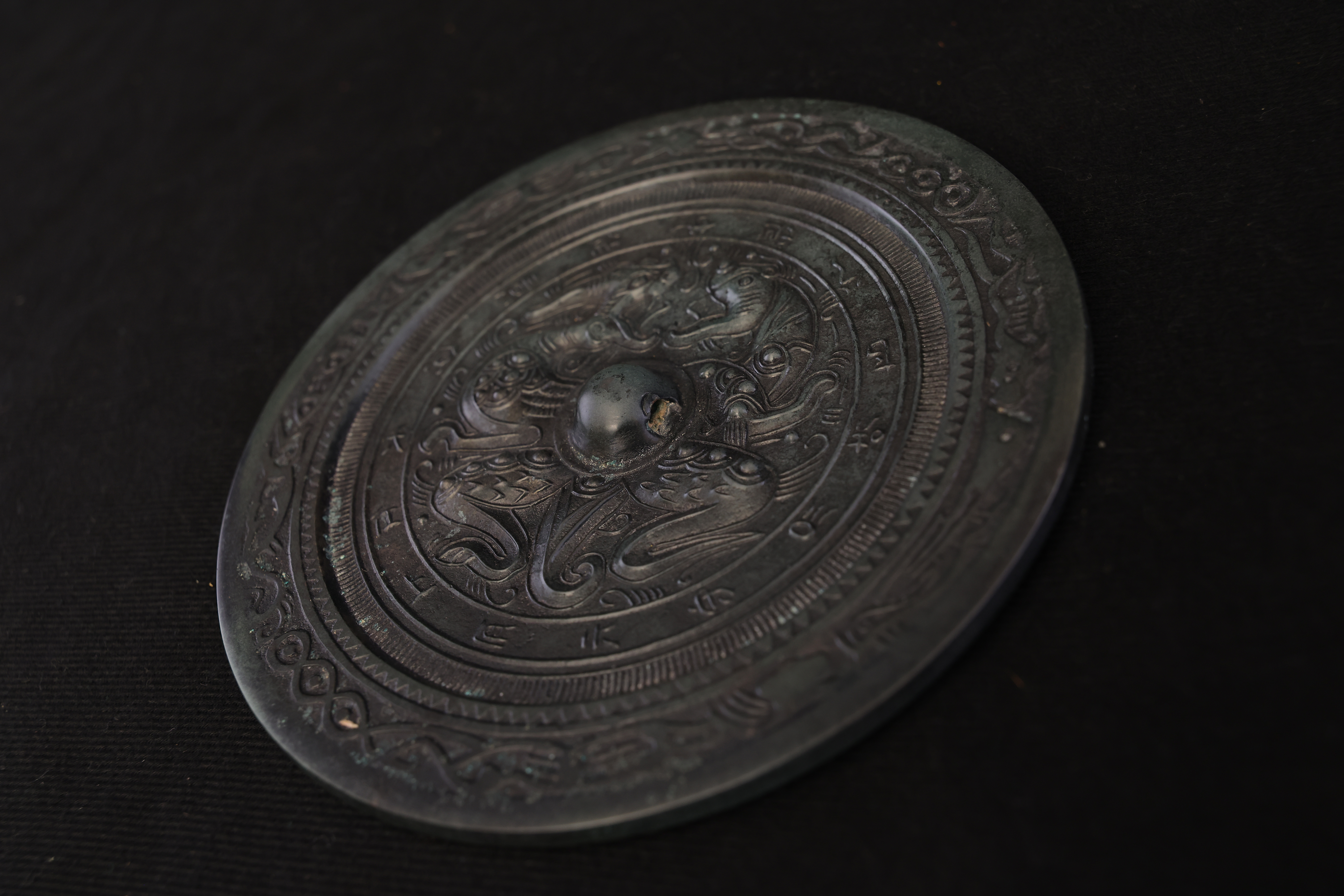 此面汉代錾龙虎斗铭文青铜镜,通体以精炼青铜铸造,质坚色古,铜光沉稳而含蓄。镜体呈圆形,造型端正,线条流畅。镜背中央设高钮,钮座环饰细密的连珠纹与锯齿纹,规整有序,尽显汉代铸镜工艺之严谨。镜面纹饰主题为“龙虎相斗”,中央龙虎相向而势腾,龙身盘曲,鳞爪精细,气势矫健;虎体伏跃,筋骨遒劲,目光炯然。二兽腾挪之间,腾云驾雾,周围辅以流云与火纹,动势呼应,生气勃勃,象征天地阴阳对峙与万物生化的宇宙观。龙虎之间寓“斗而生和”,既含阳刚奋发之气,又寓镇邪辟恶、祈福延祥之意。外缘铸铭文一周,文字以小篆书体铸刻,笔画挺拔,线条圆劲流畅,铭曰吉语,寓意安康富贵。铭文外环饰以蛇纹与卷云纹,线条婉转盘旋,与内区龙虎图案互为映衬,结构严谨,布局分明。整镜纹饰繁而不乱,铸工精湛,刀痕细致,铜质温润而古雅。此镜不仅为照面之具,更为汉代贵族案头陈设或随葬重器,象征威仪与祥瑞。