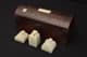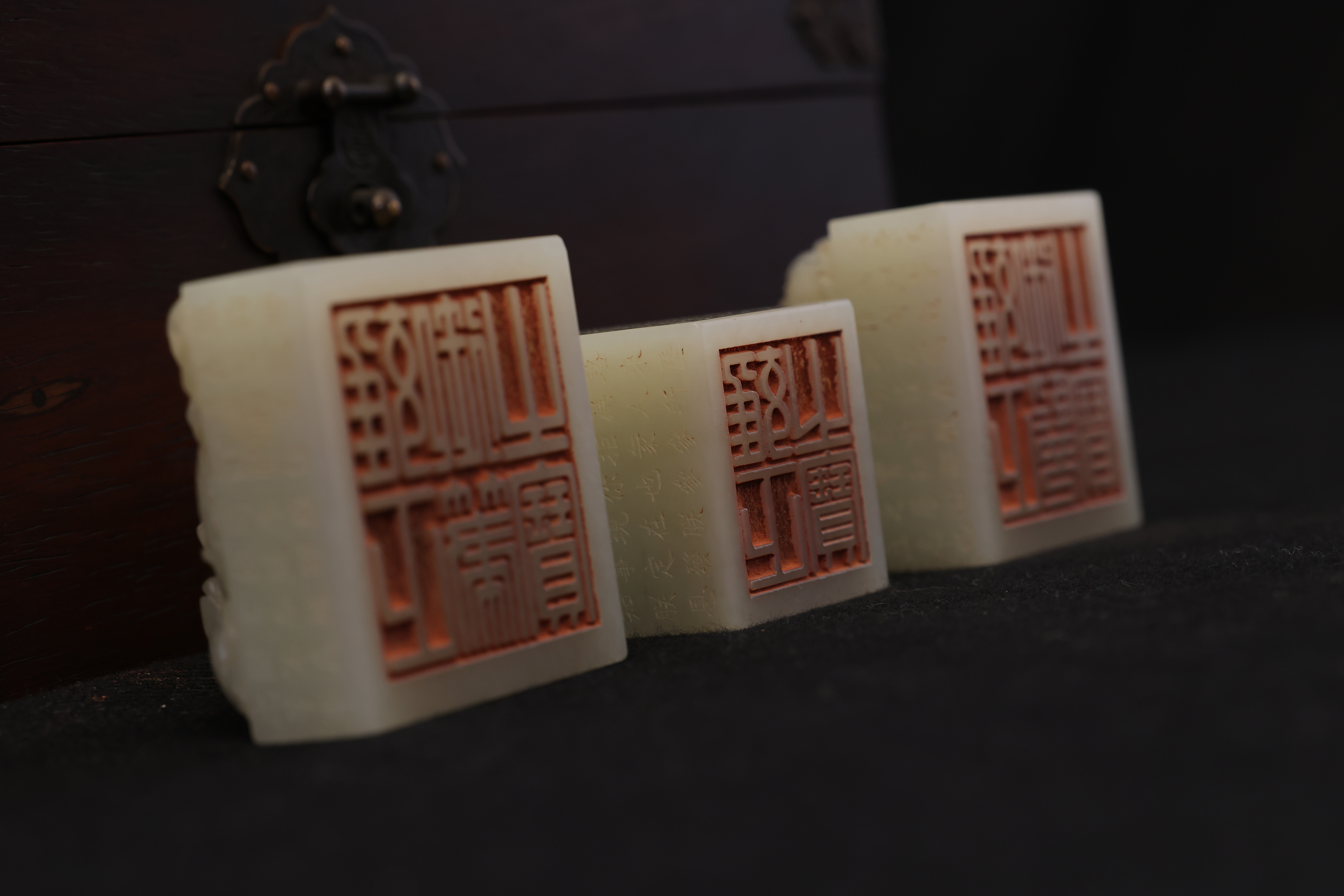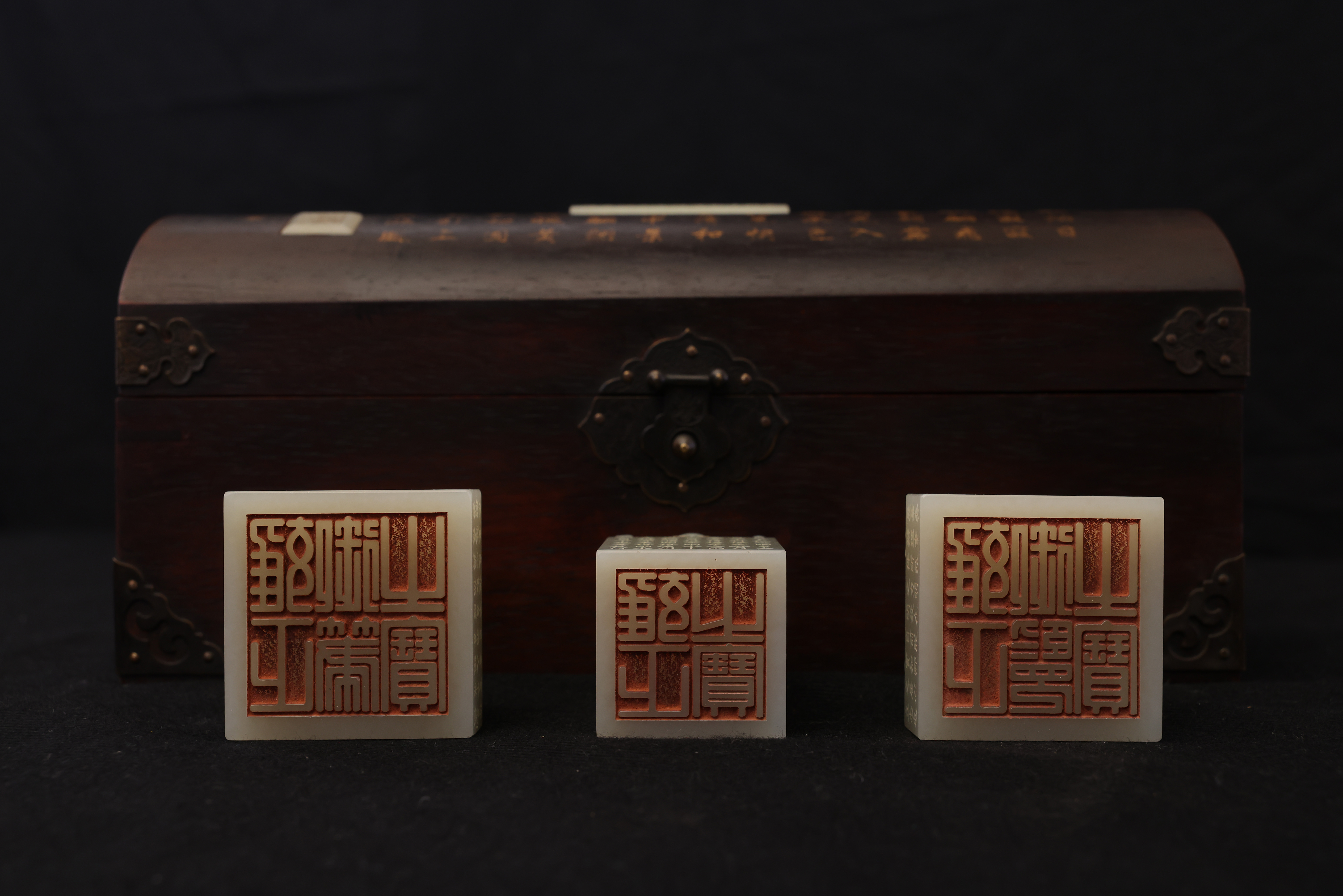 匣内铺以织金锦缎,纹饰缜密,陈设三方御玺,分别为:雍正御笔之宝、雍正之宝,雍正御览之宝。玉质油润洁白,温光内敛。印钮雕螭龙伏兽,线条流转,气势矫健,刀工细腻入微。印面朱文,篆法精绝,四边镌楷书御制铭文,规整清晰。