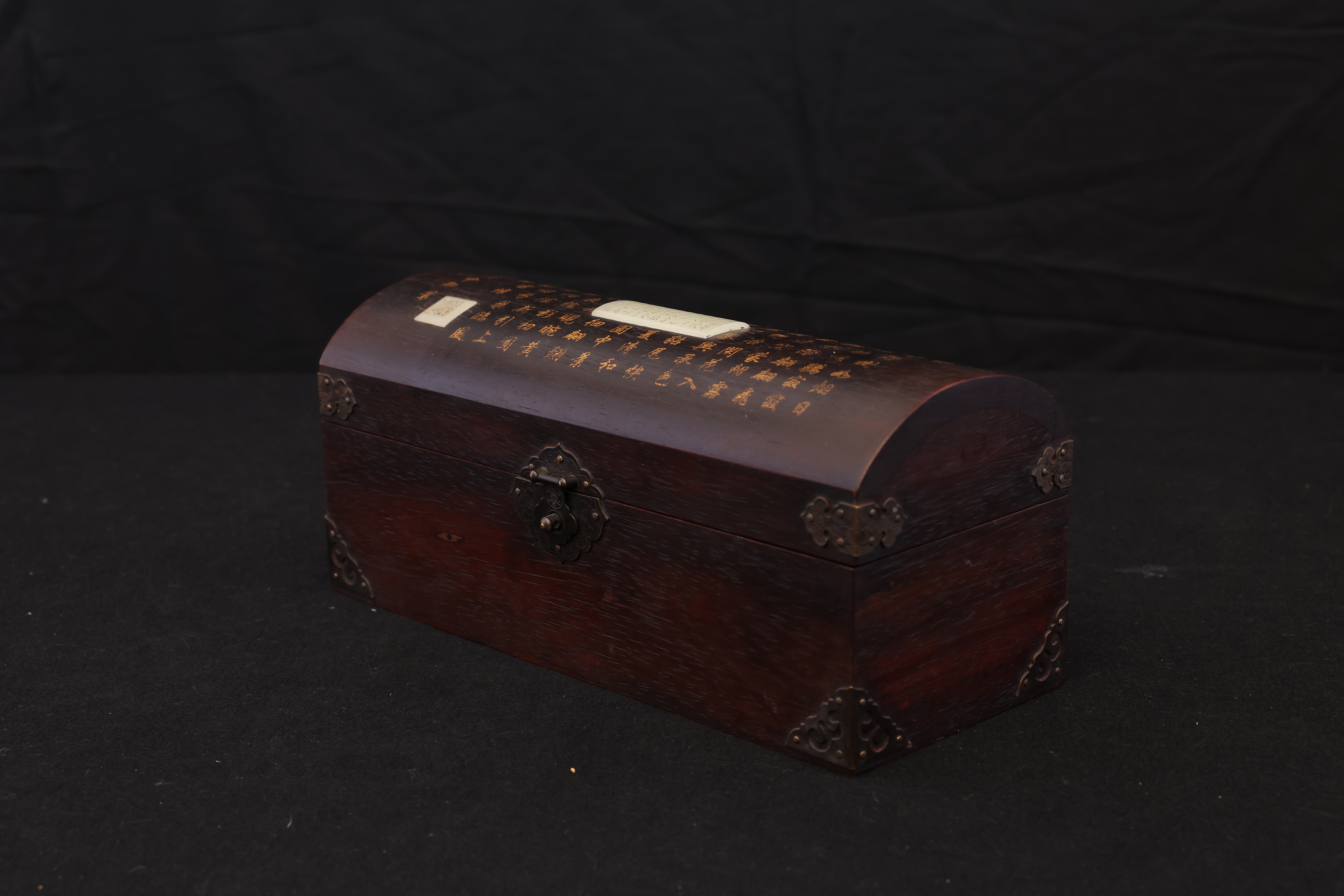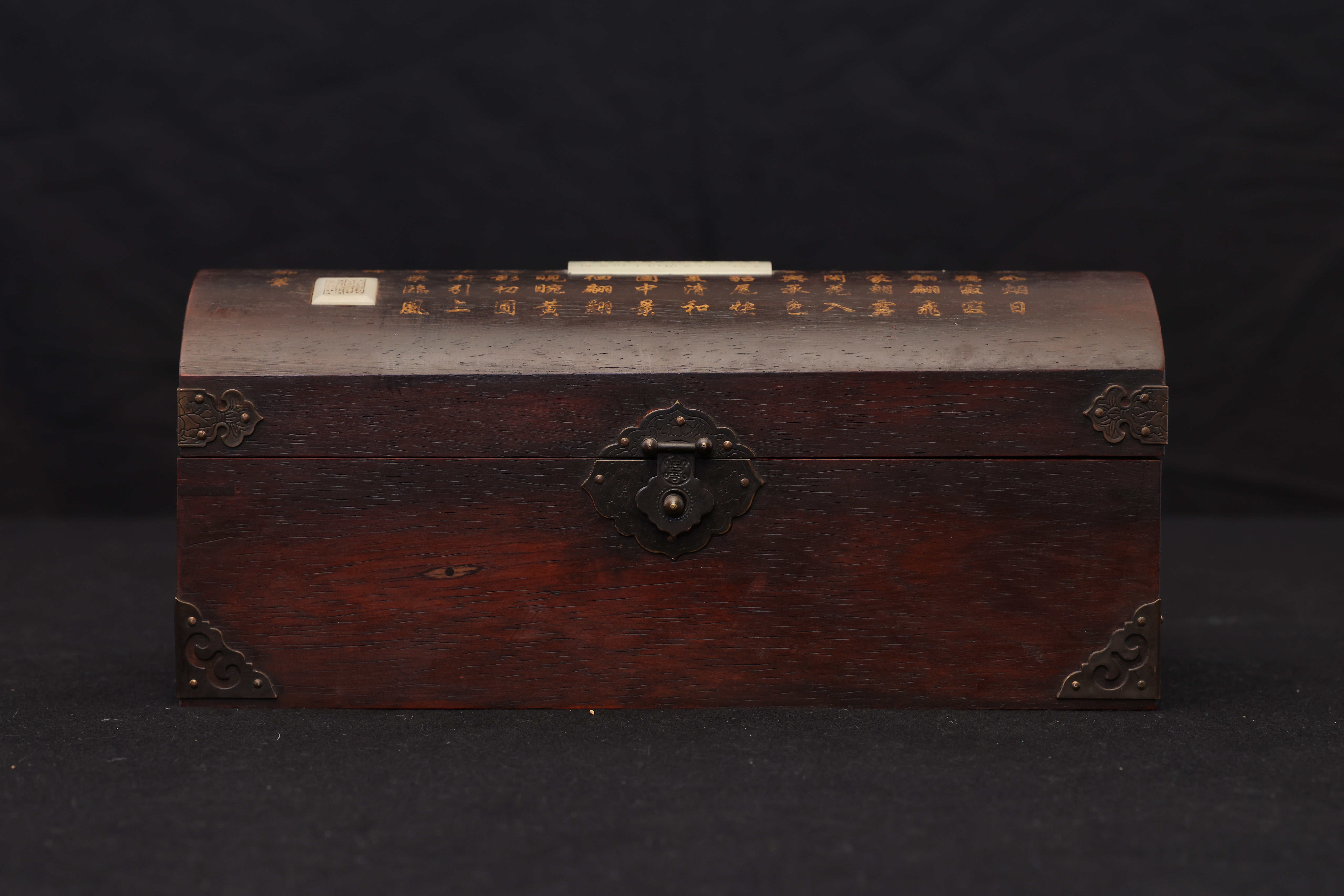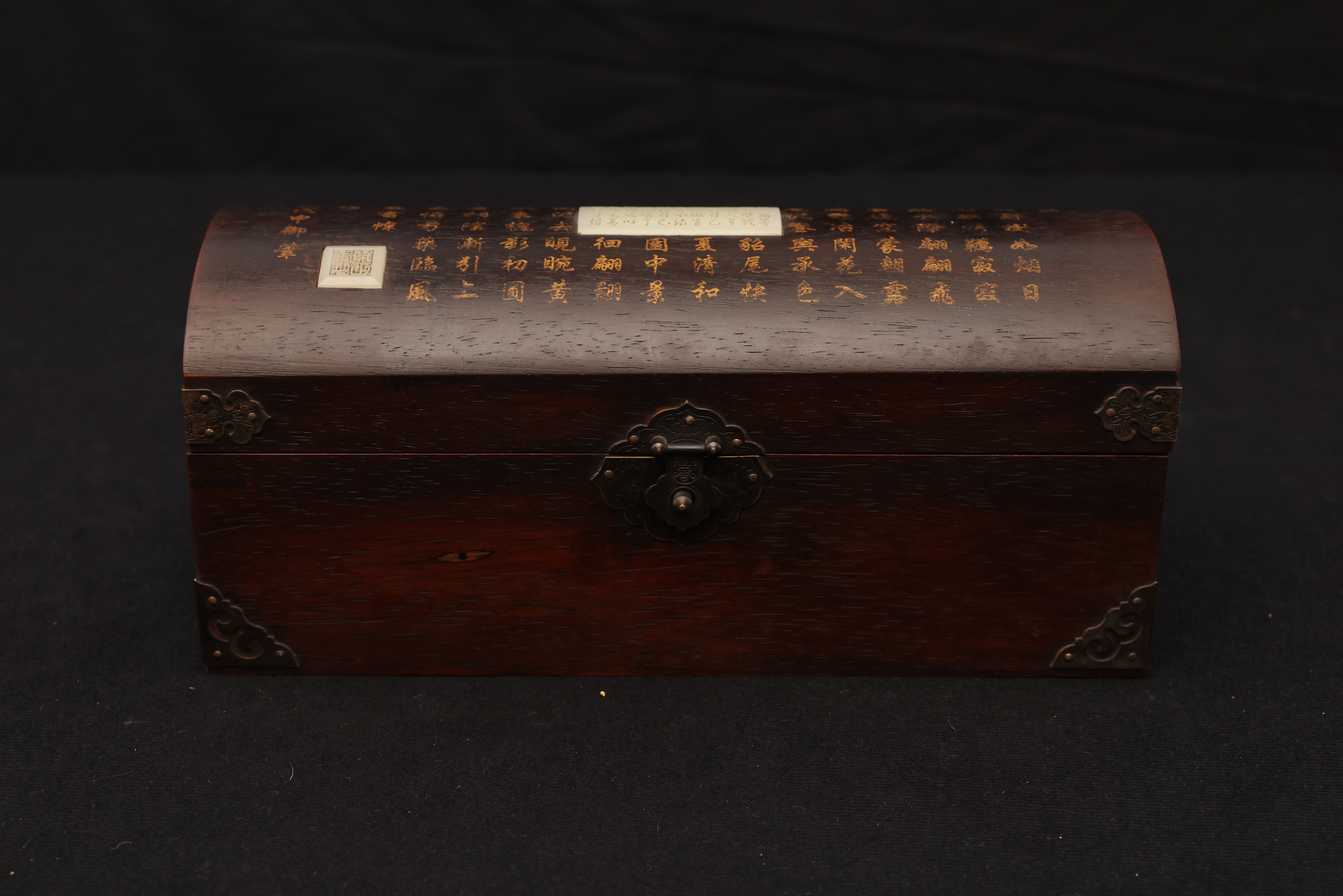 此套清雍正和田玉玺连宫廷原装紫檀盒,材制非凡,品相庄重雅致,堪称帝王御玺中之瑰宝。整匣以紫檀木精制,木纹沉穆,光泽深敛,覆以鎏金铜饰,拱锁如意,华而不侈。盖面以金填楷书镌刻御题诗文,笔法端严俊逸,显示雍正帝崇尚理性与秩序的帝王气度。