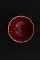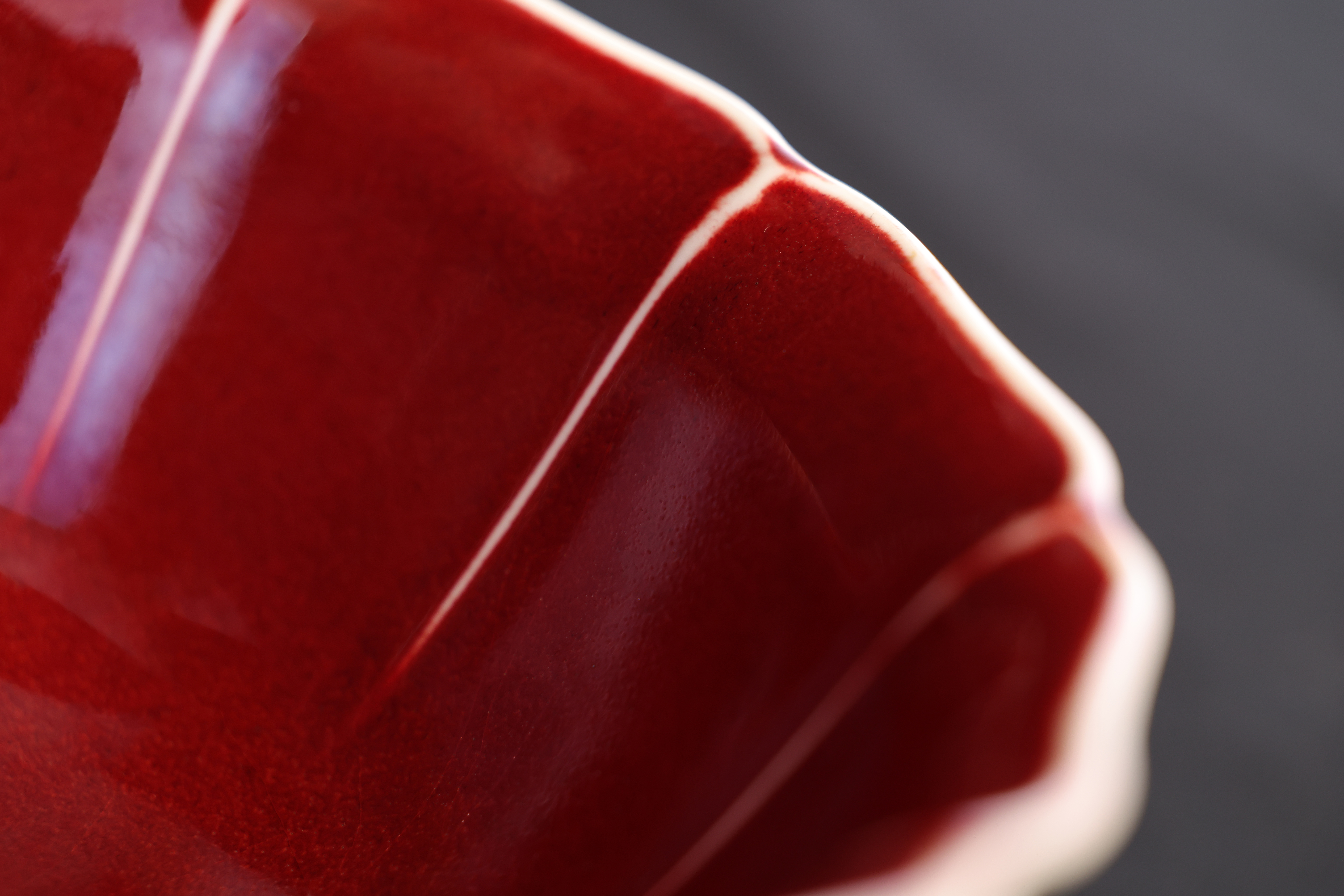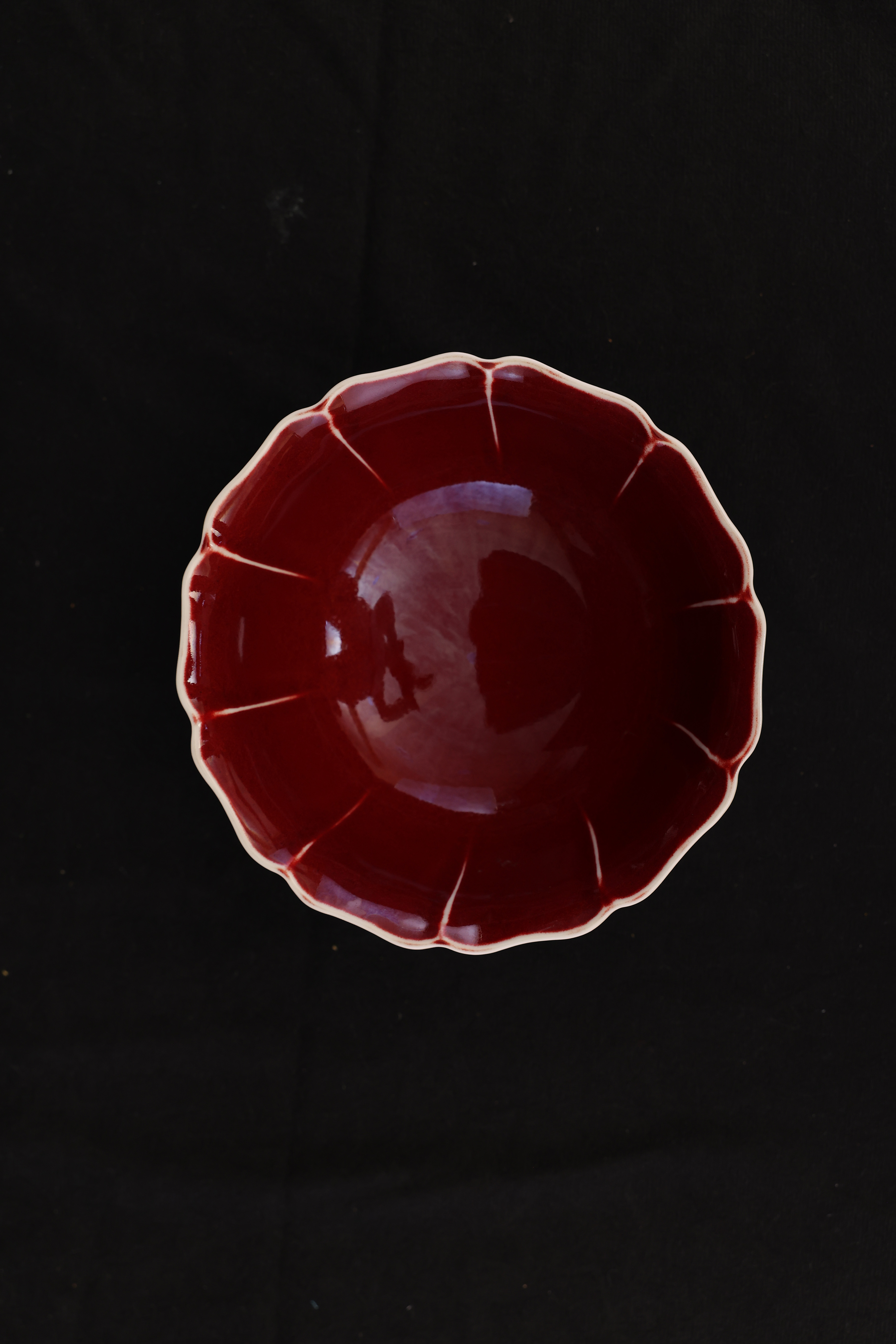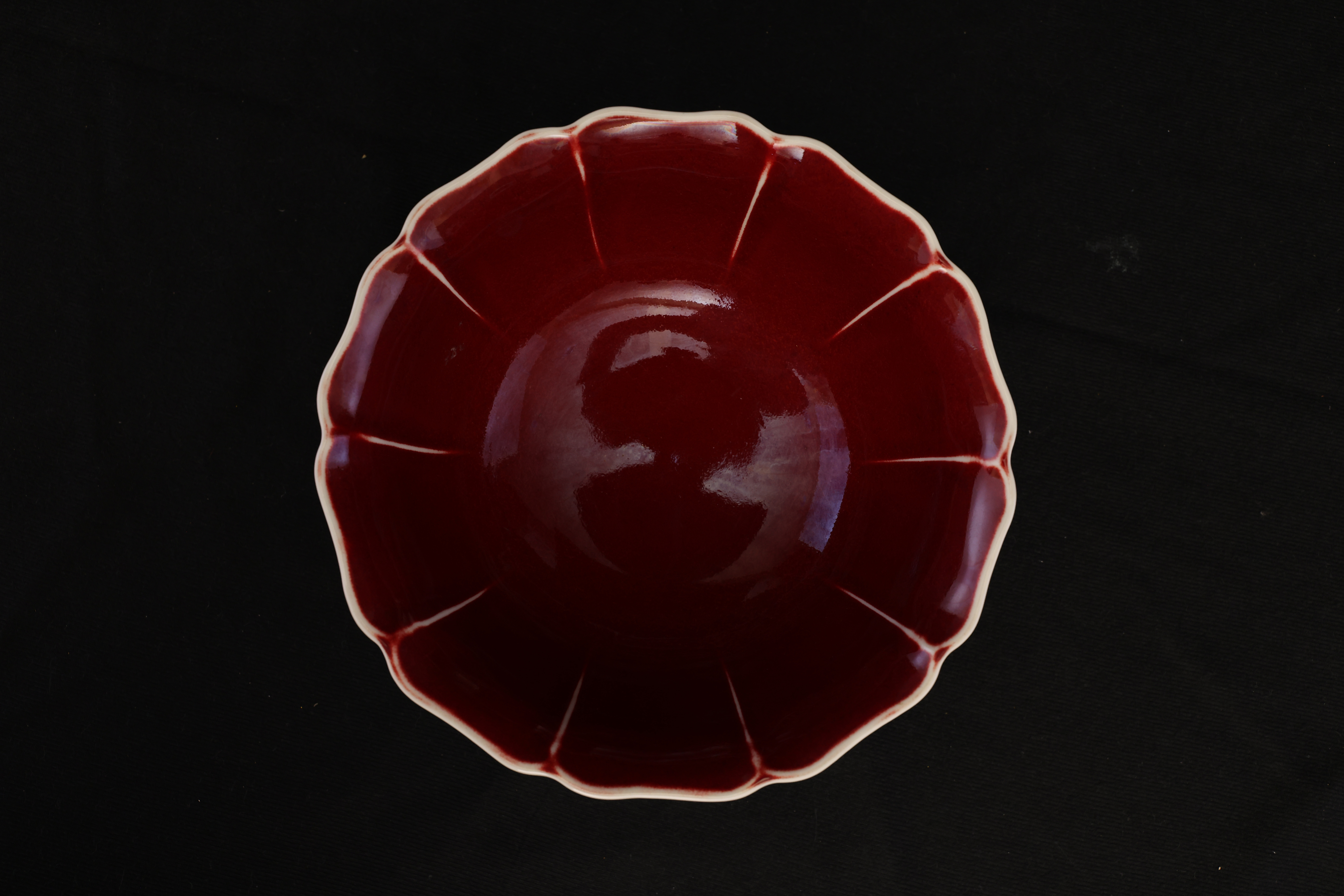 大碗敞口,口沿微外撇,器口、碗壁与圈足均作十弧五瓣葵花式,内外壁各呈十道凹凸棱线,姿态整饬而富于节奏。圈足外撇,底部露胎。碗内通体施宣德红釉,色泽沉凝端雅。底部以青花书写「大明宣德年制」六字双行楷书款。