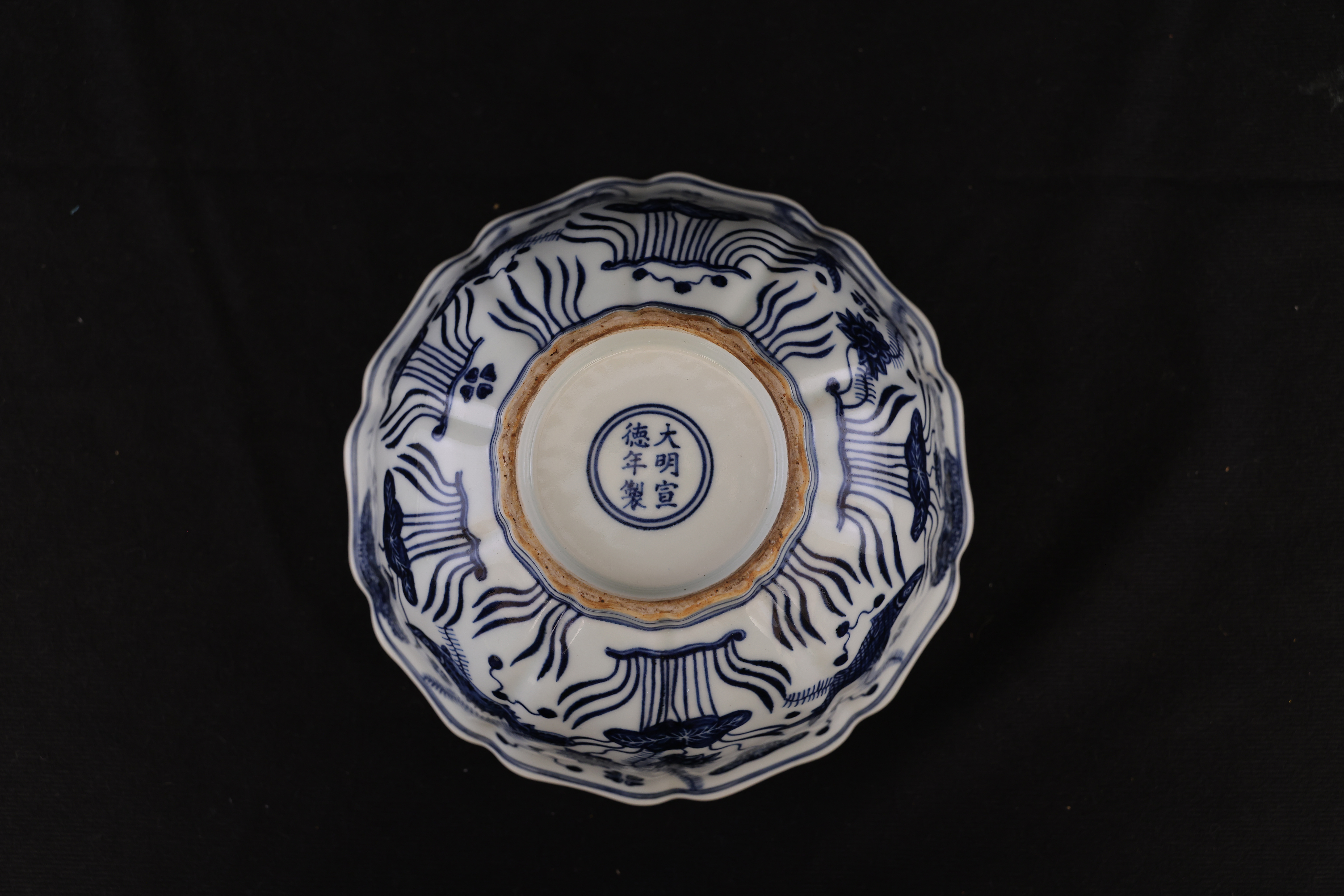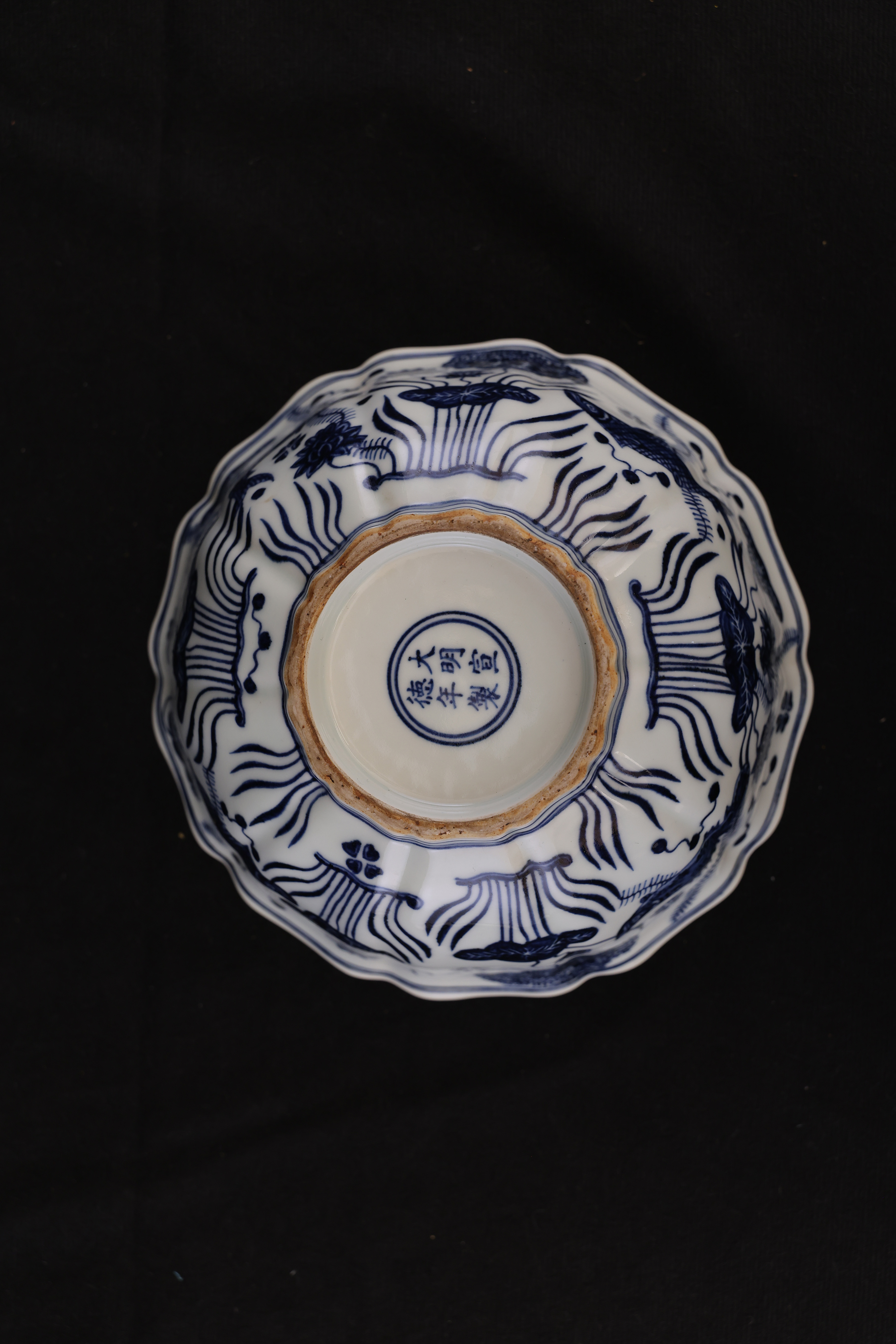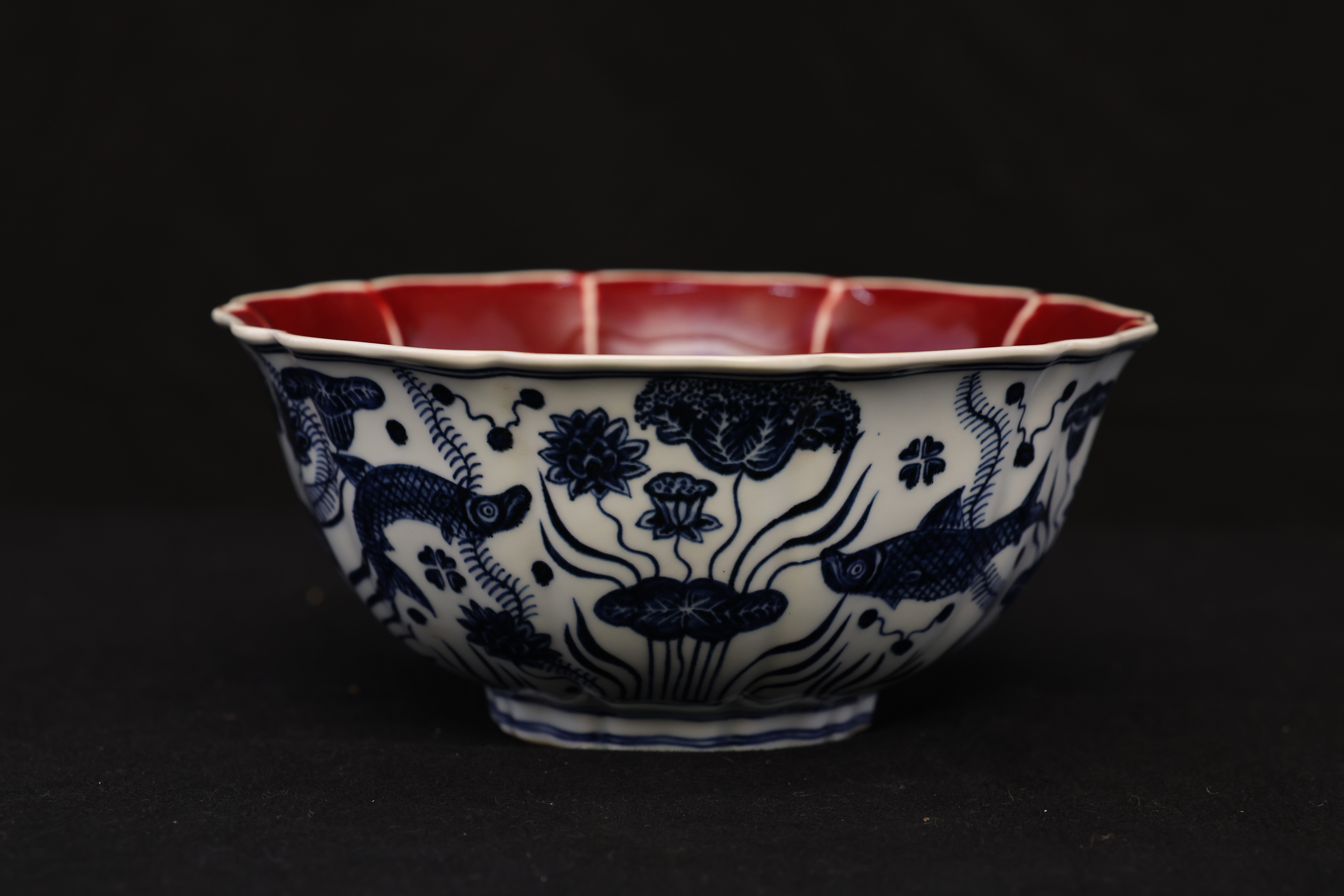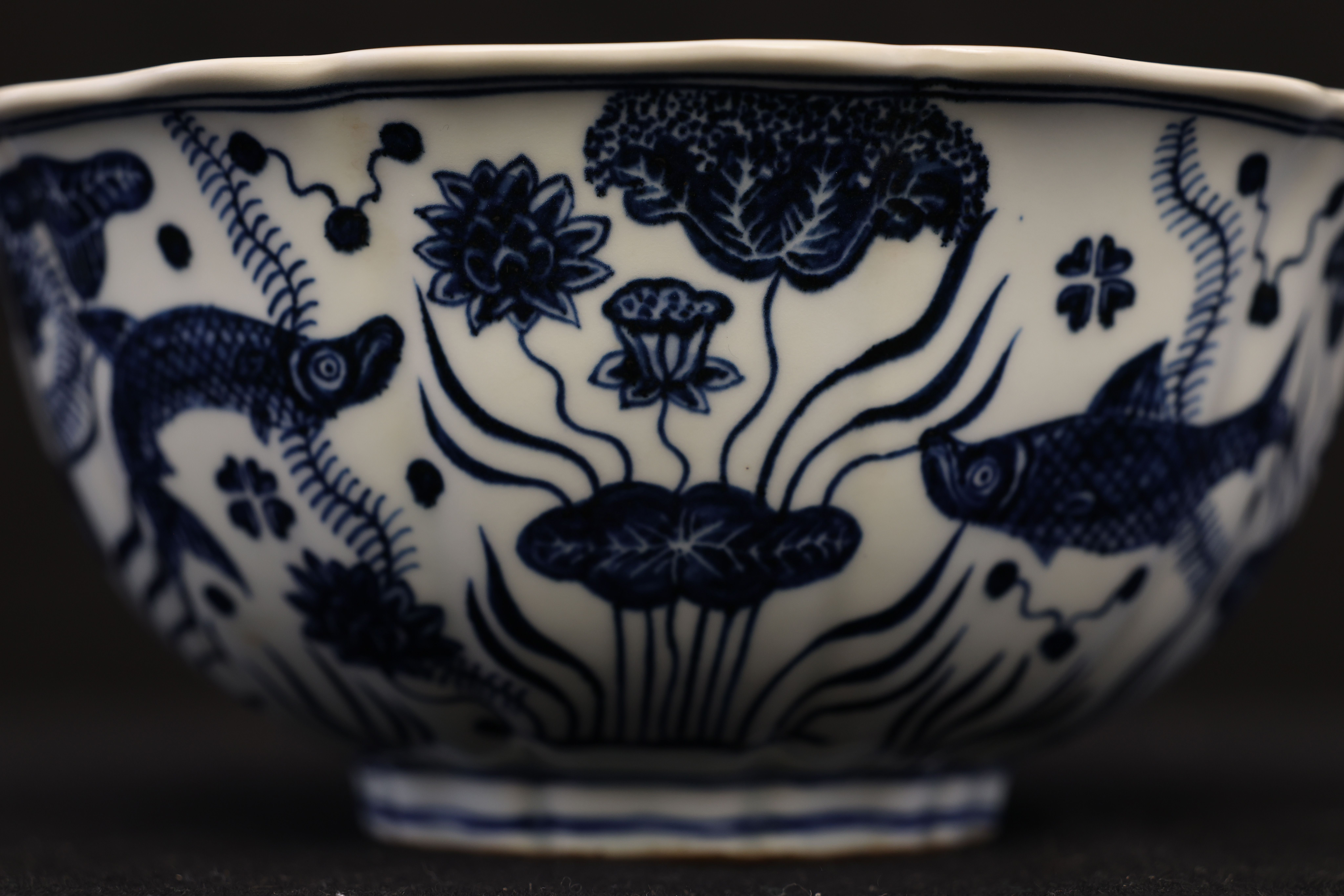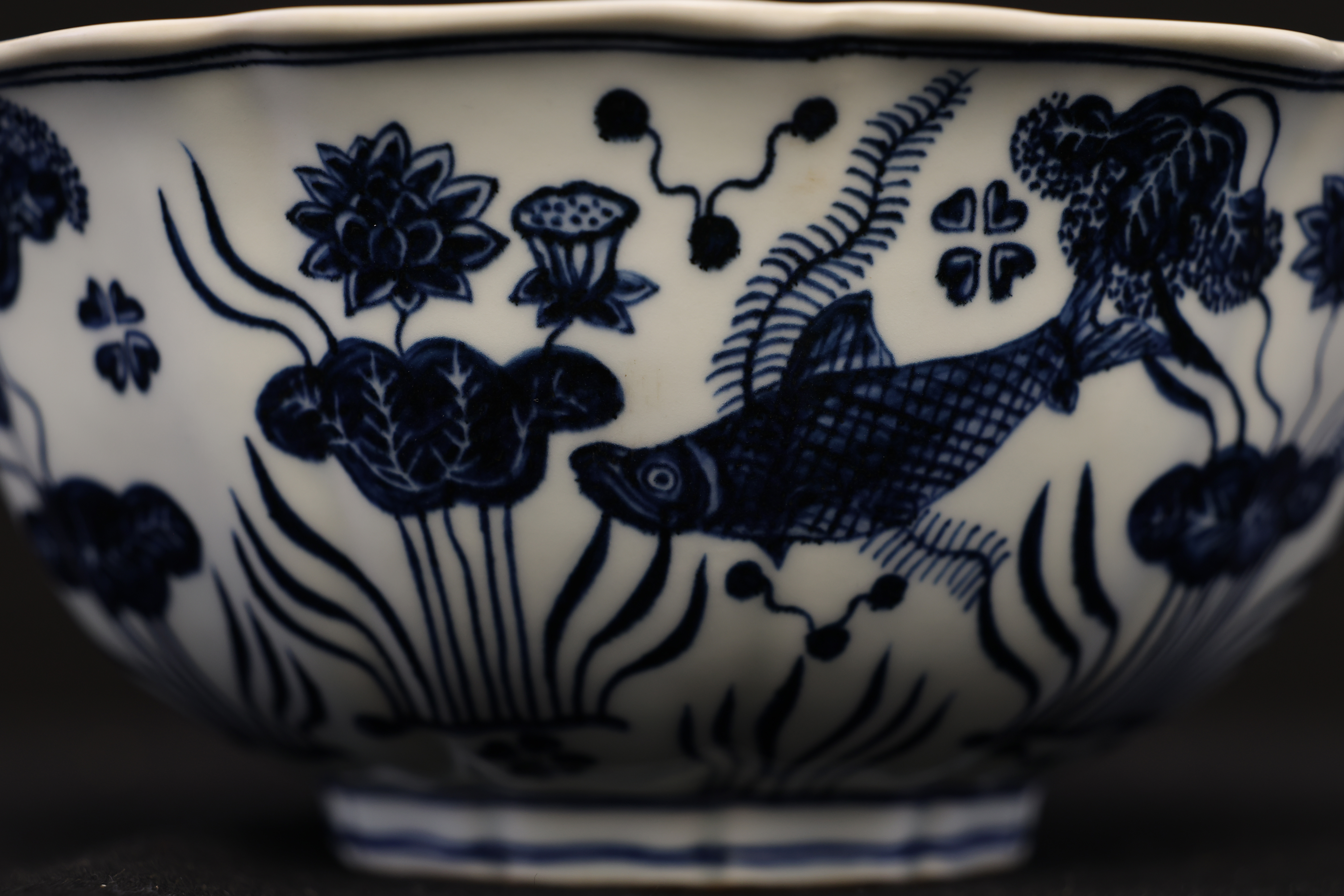 全器深腹、菱口,匠者以巧思作十棱,其峰脊明快流丽,沿足随形起伏,如微澜轻漾,富有动感,生气勃勃。绘者运钴青尤见功力,以浓淡五阶分色,层次丰厚;以靛蓝定骨架,以淡青敷渲染,鱼姿舒展,神采毕现。