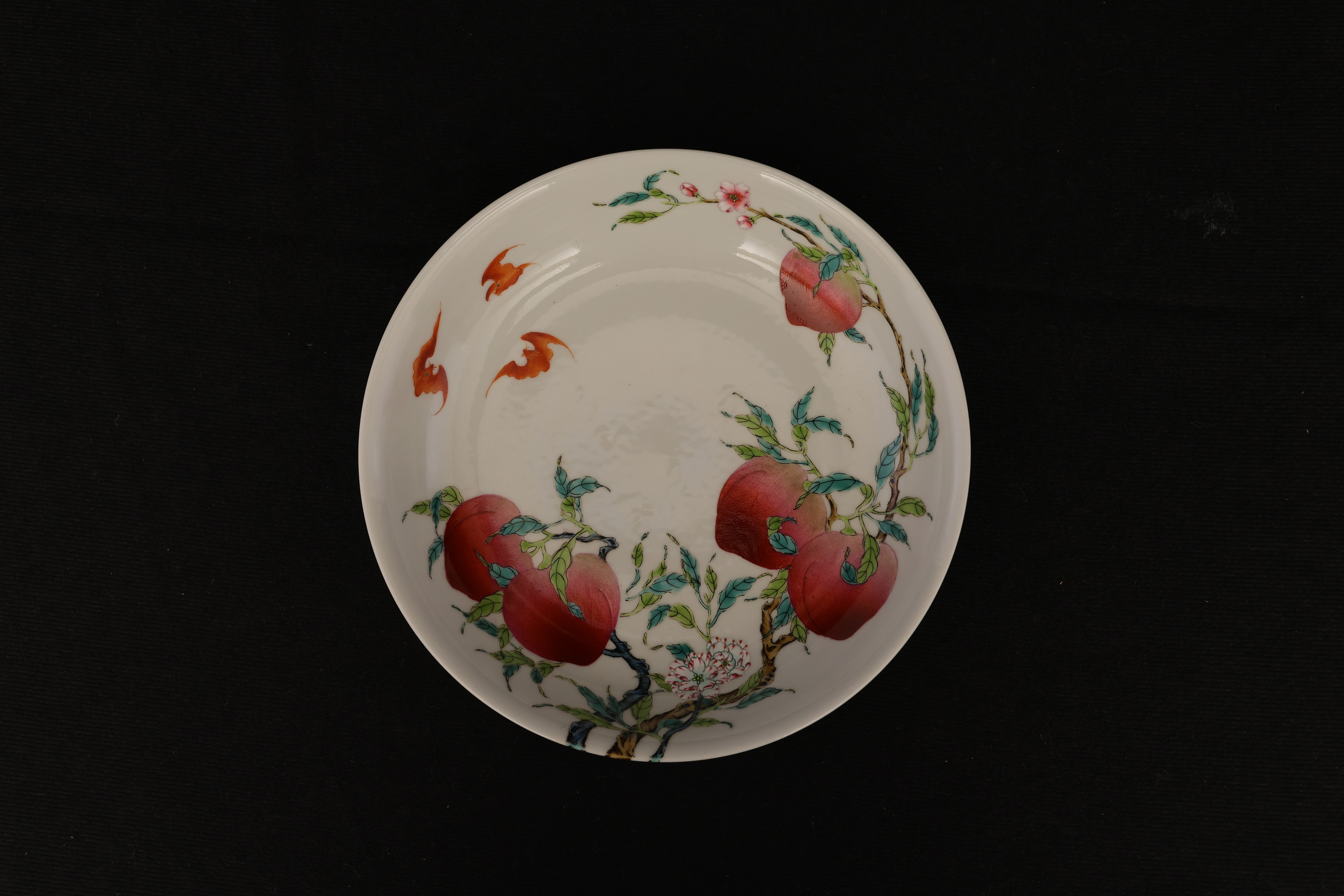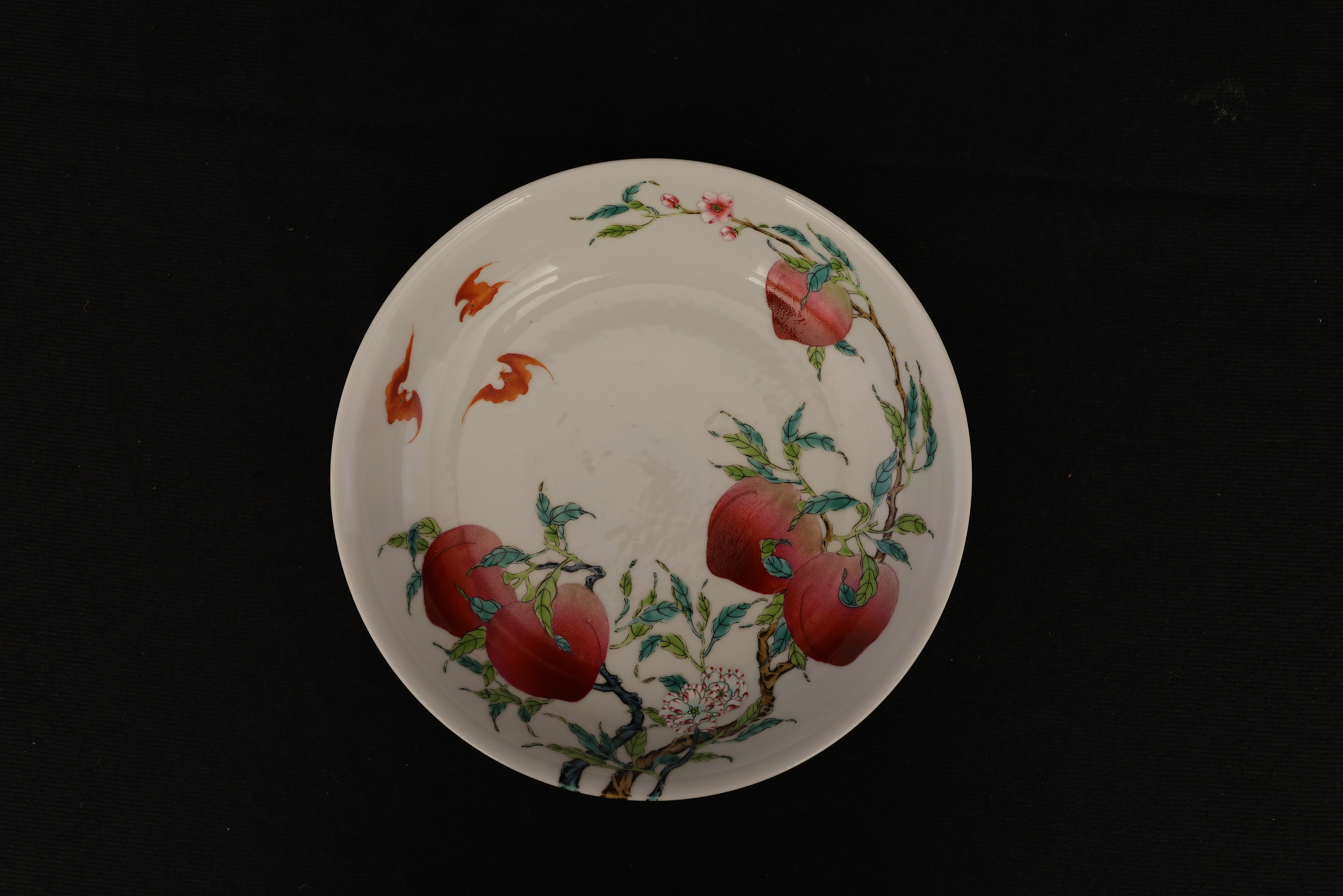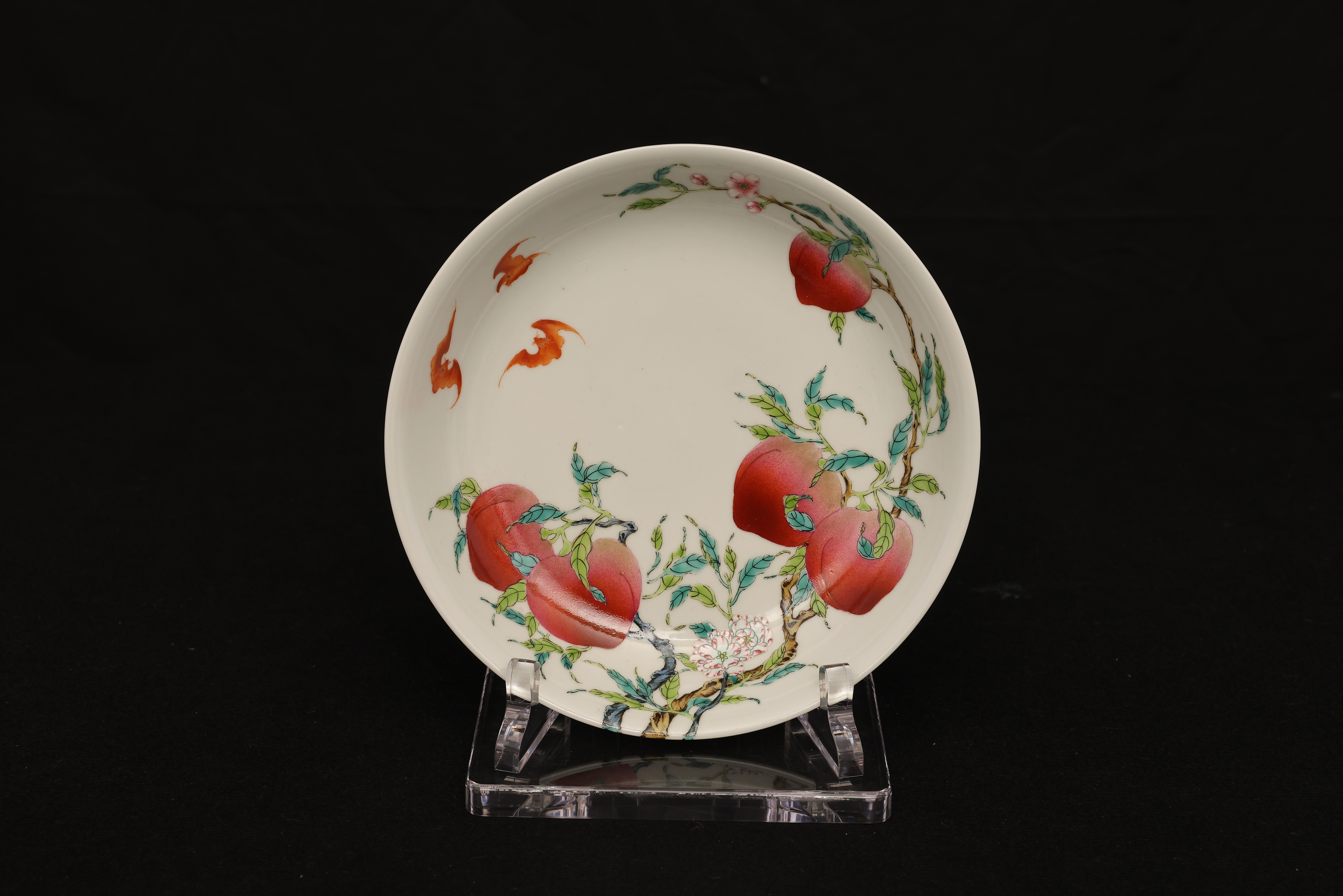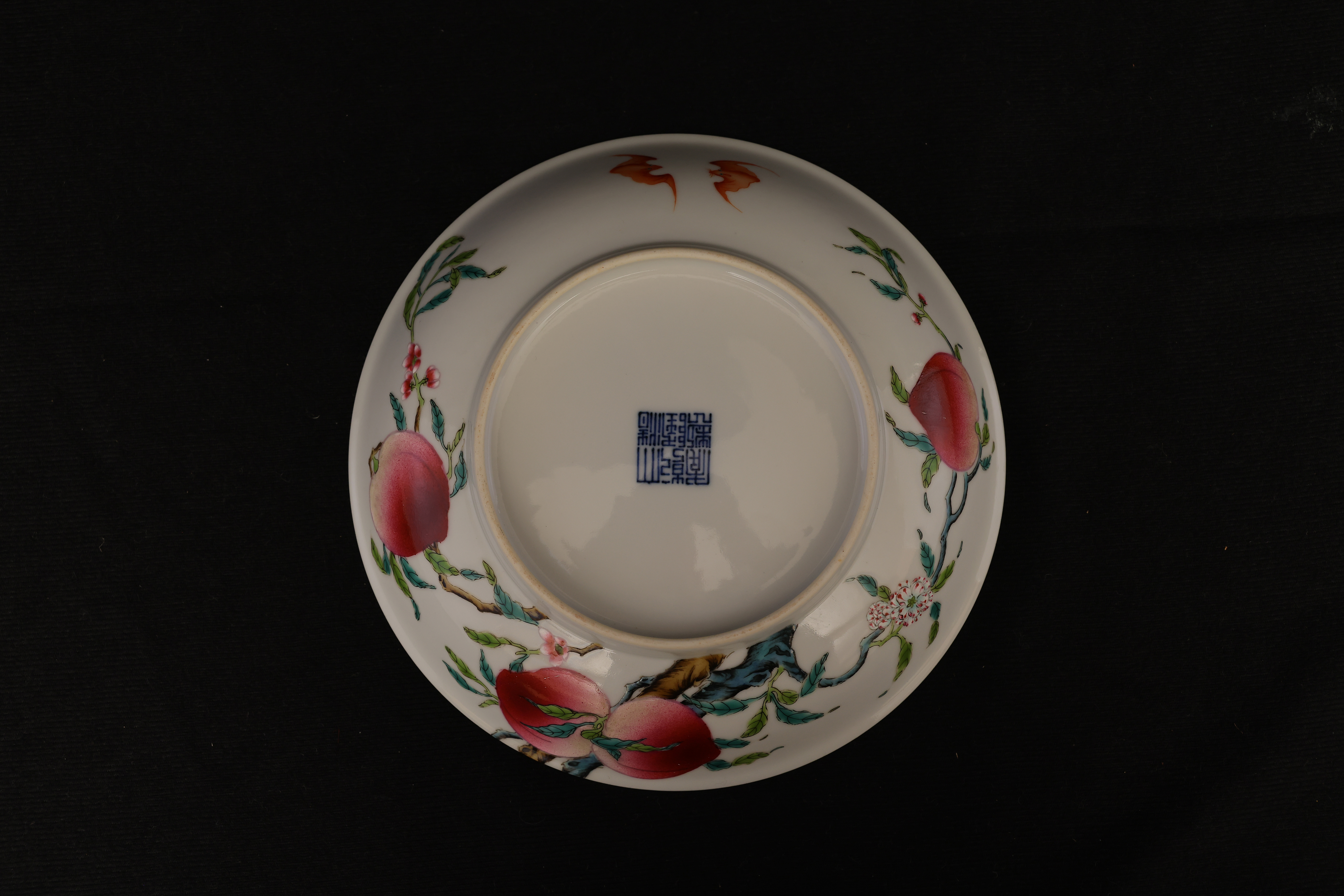 此盘敞口,弧腹,圈足规整,底部青花书「大清乾隆年制」六字篆书款。器形秀雅端正,内外以粉彩装饰。盘心绘桃枝一束,五枚寿桃错落分布,设色层次丰富,浓淡相宜,桃果娇艳欲滴,枝干苍劲挺拔。其间三只蝙蝠彩翼纷呈,姿态灵动,与外腹翩然飞舞的两只蝙蝠内外呼应,画面婀娜生动。蟠桃象征长寿,“蝠”谐“福”音,所绘“五桃”“五蝠”乃典型“五福捧寿”题材,寓意福寿双全、吉庆恒昌。整体构图富丽而不失秀雅,粉彩发色柔媚清润,是乾隆粉彩御瓷中吉祥题材的上佳之作。