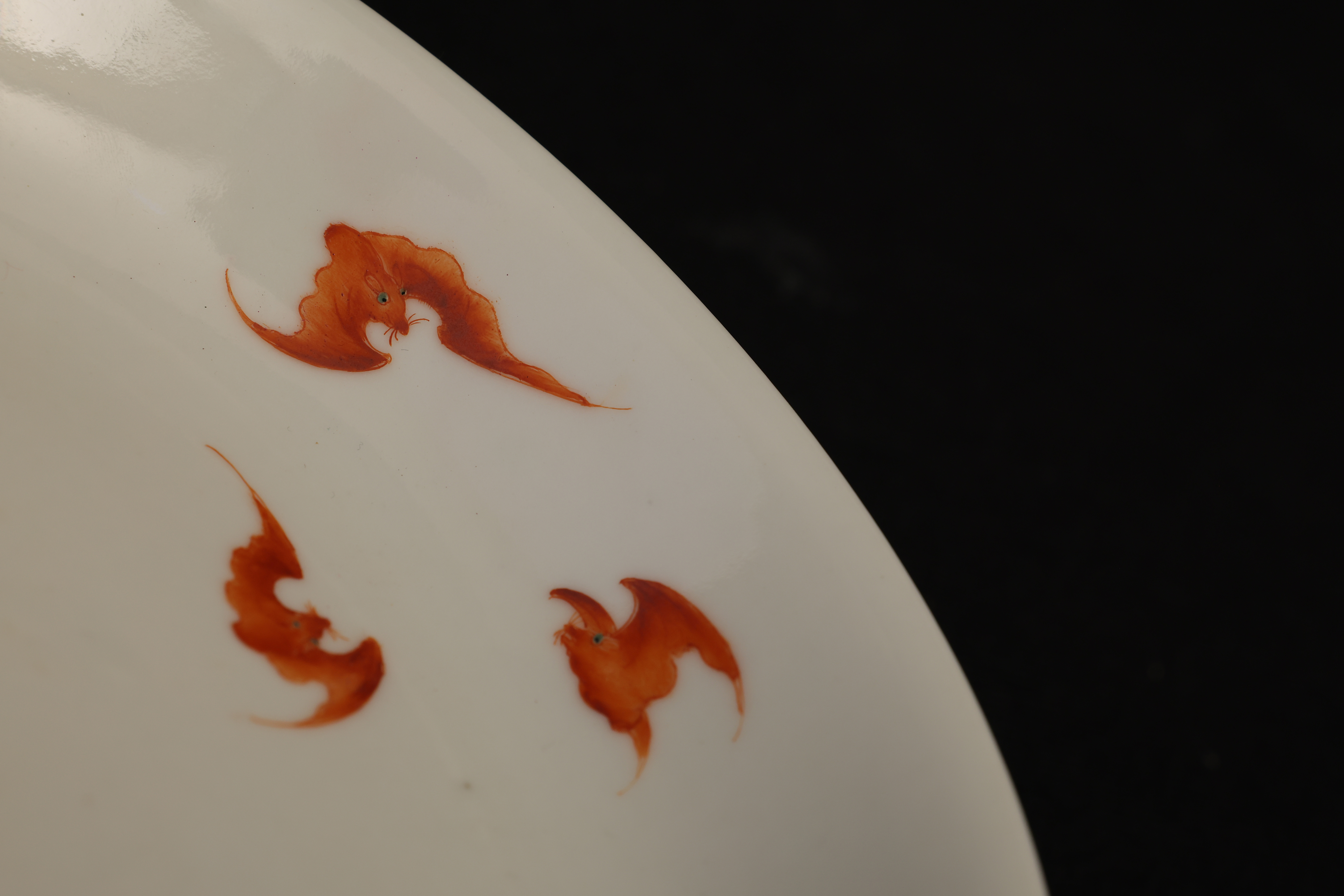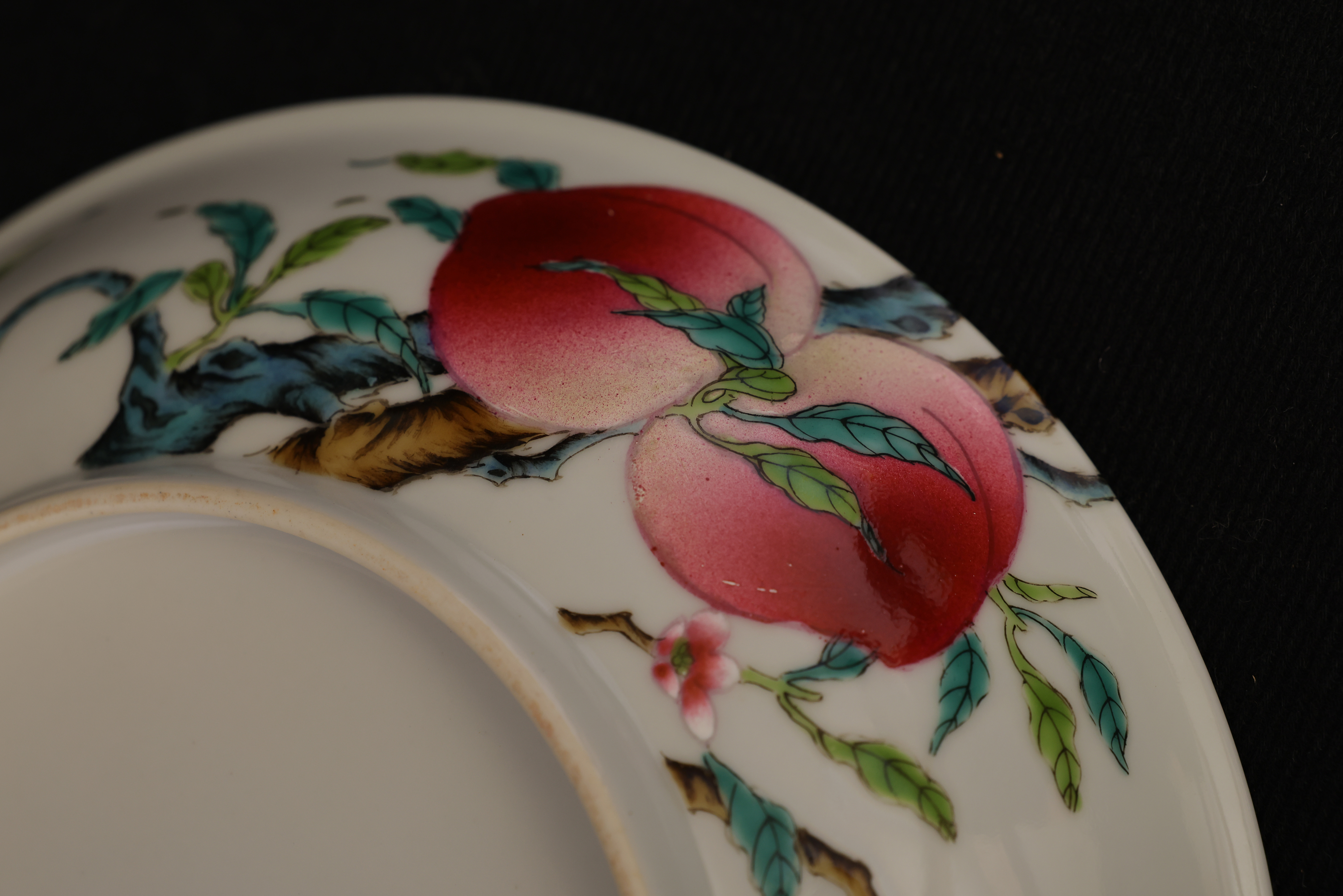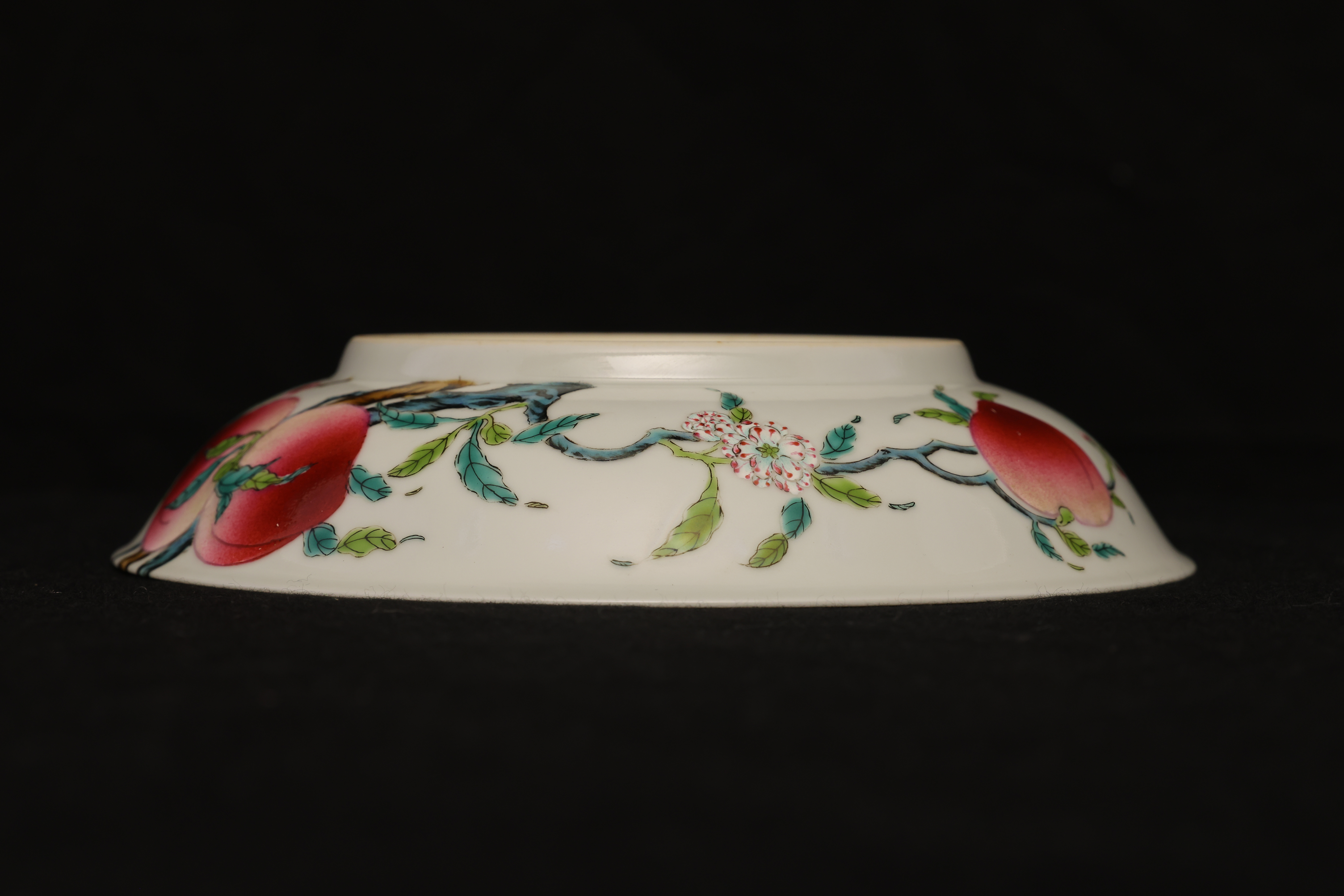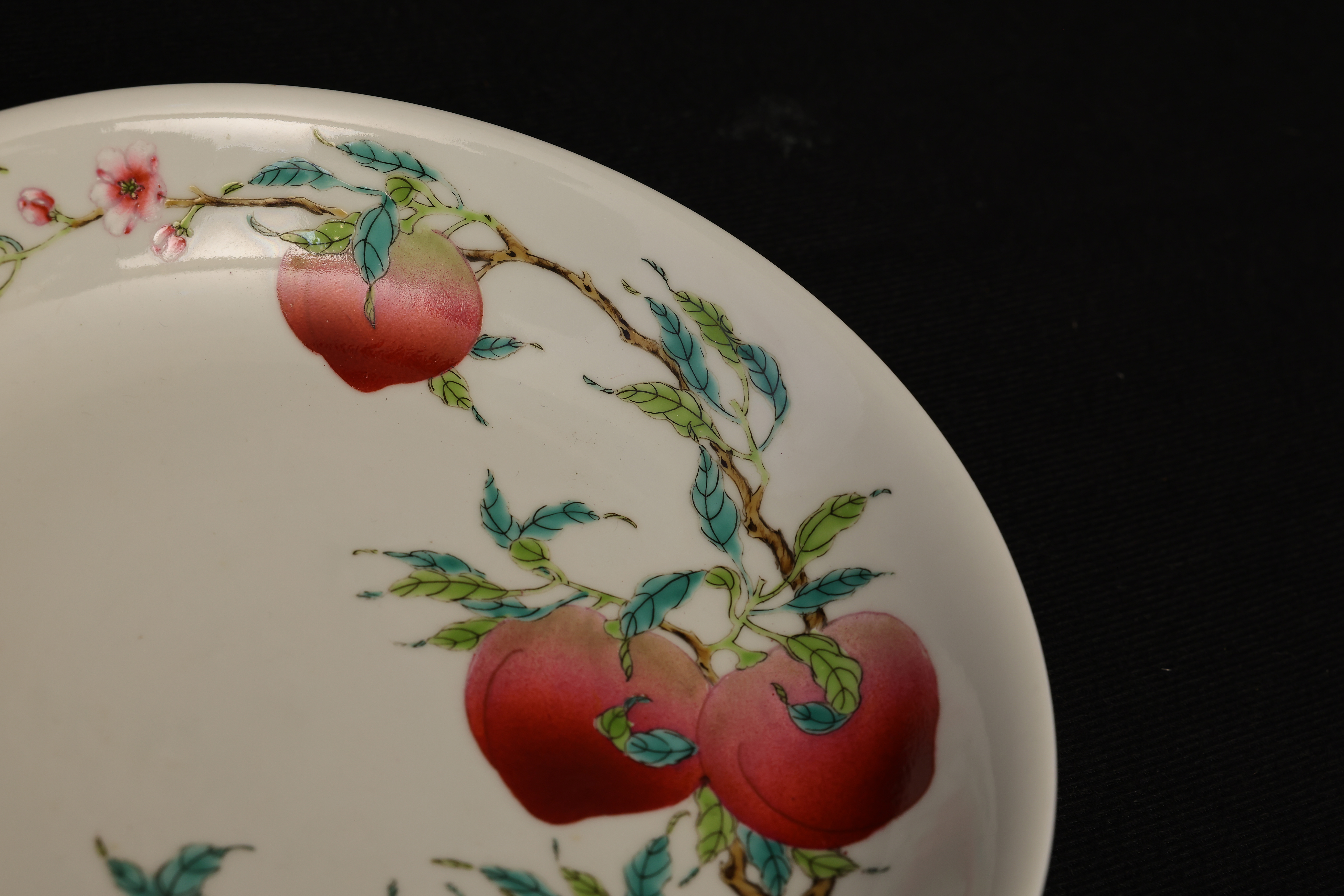 此盘敞口,弧腹,圈足规整,底部青花书「大清乾隆年制」六字篆书款。器形秀雅端正,内外以粉彩装饰。盘心绘桃枝一束,五枚寿桃错落分布,设色层次丰富,浓淡相宜,桃果娇艳欲滴,枝干苍劲挺拔。其间三只蝙蝠彩翼纷呈,姿态灵动,与外腹翩然飞舞的两只蝙蝠内外呼应,画面婀娜生动。蟠桃象征长寿,“蝠”谐“福”音,所绘“五桃”“五蝠”乃典型“五福捧寿”题材,寓意福寿双全、吉庆恒昌。整体构图富丽而不失秀雅,粉彩发色柔媚清润,是乾隆粉彩御瓷中吉祥题材的上佳之作。