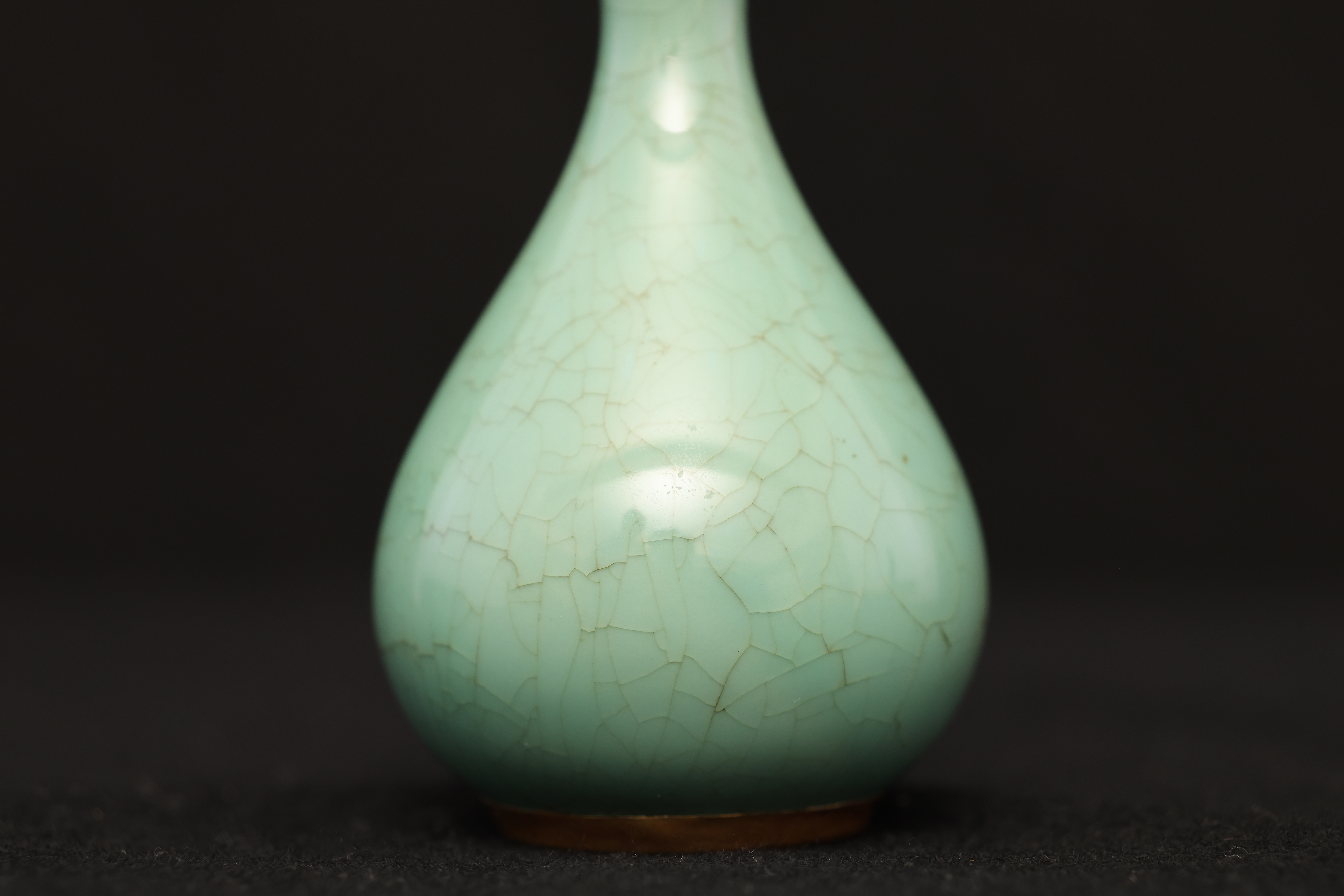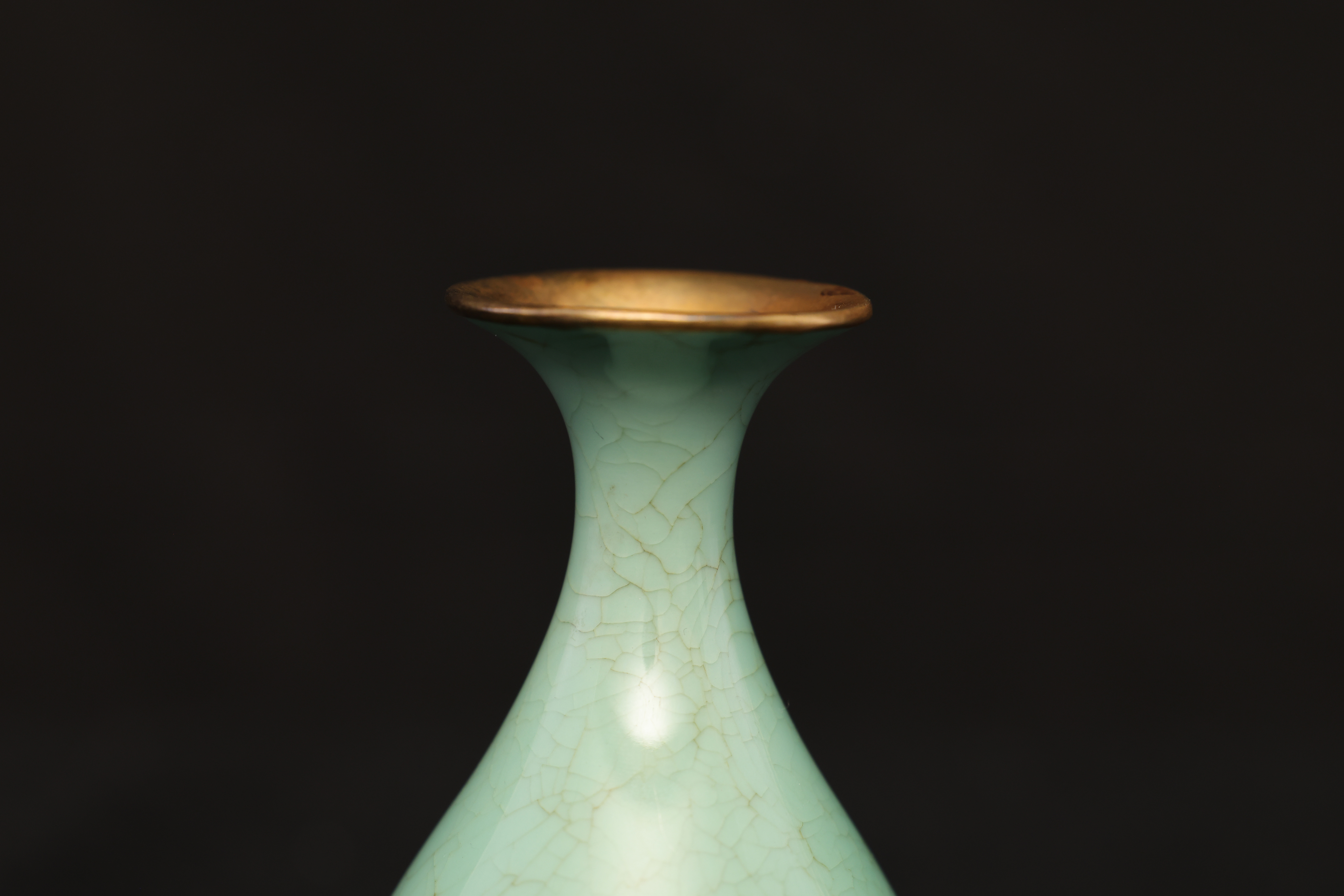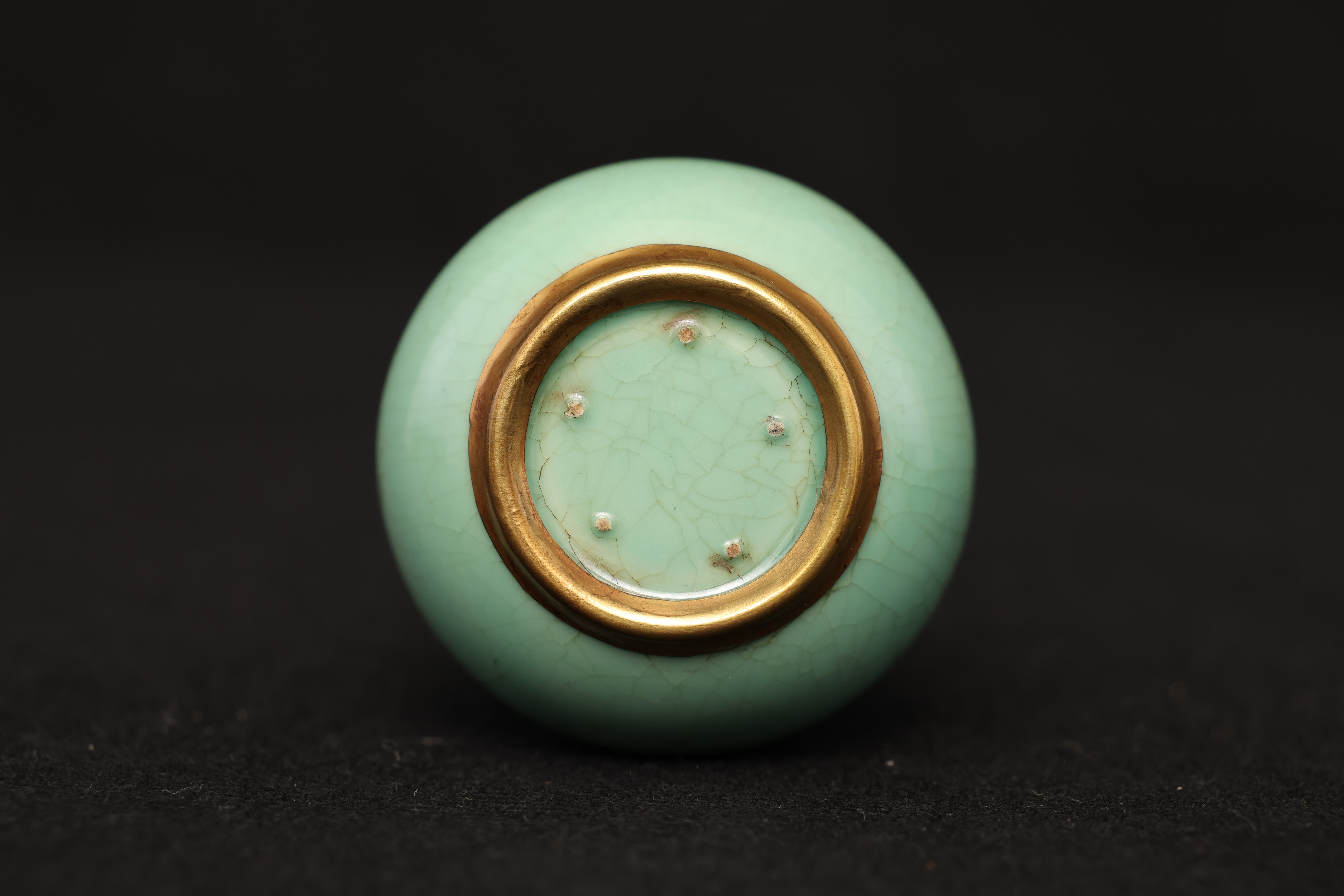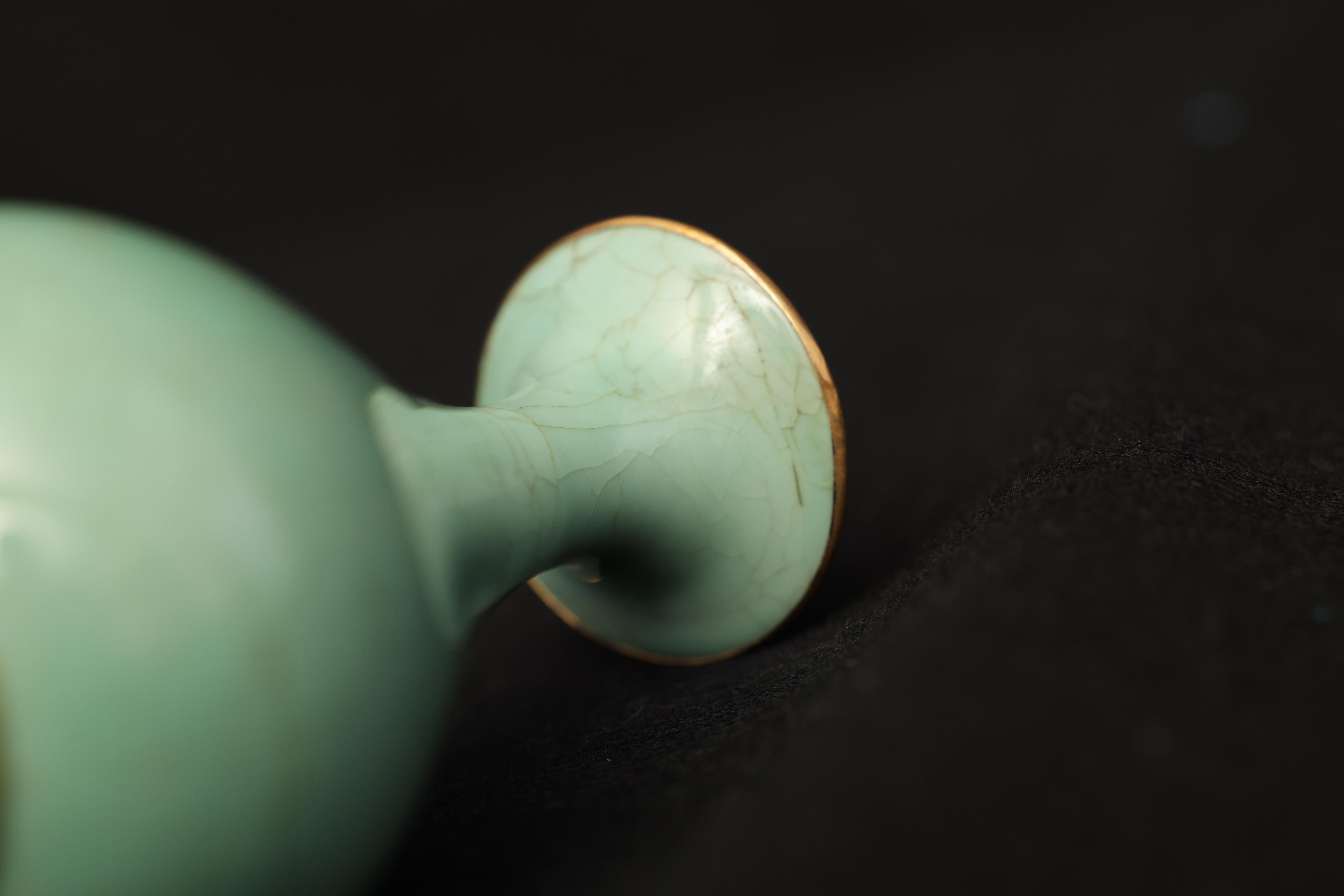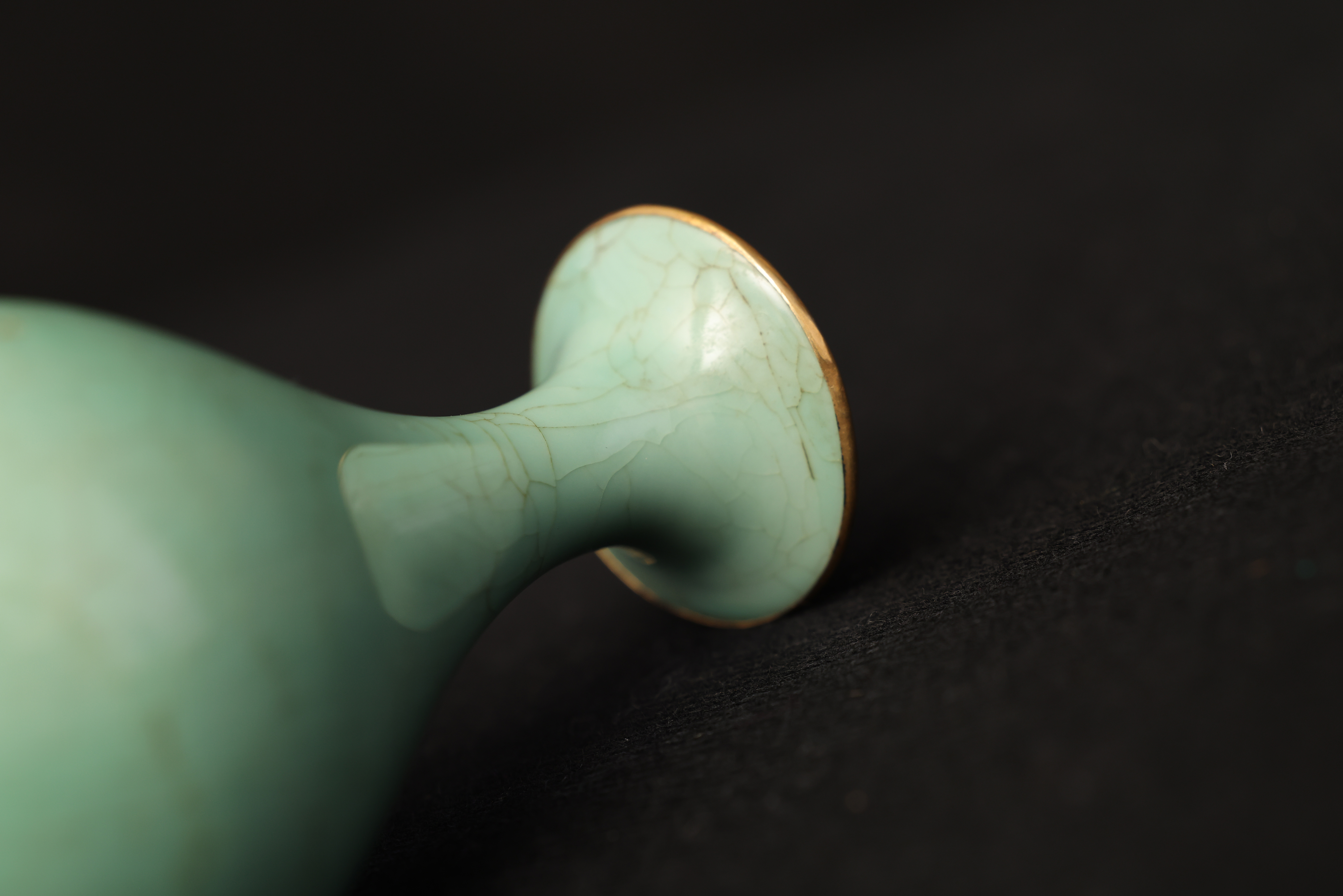 此玉壶春瓶圆口,微外撇,口沿贴金,颈部修长,腹部自然垂收,线条宛如新月初升,柔婉之间暗含力量。圈足亦施贴金。玉壶春器形向来被誉为“瓷器中的仕女图”,以其婀娜雅姿著称。通体施天青釉,釉面开片若冰裂纹,纹理间隐现淡黄沁色,光影下呈现“青如天、面如玉”的润泽质感。胎体轻薄,仅数毫米,采用典型“香灰胎”配方,轻叩声清脆如磬,质地沉静内敛。底部可见细小“芝麻粒”支钉痕,星点细弱,如夜空繁星,乃汝窑真品特征之一。整体器形端丽,釉色温润如玉,尽显汝窑“温润含蓄、清雅绝尘”的审美旨趣。