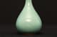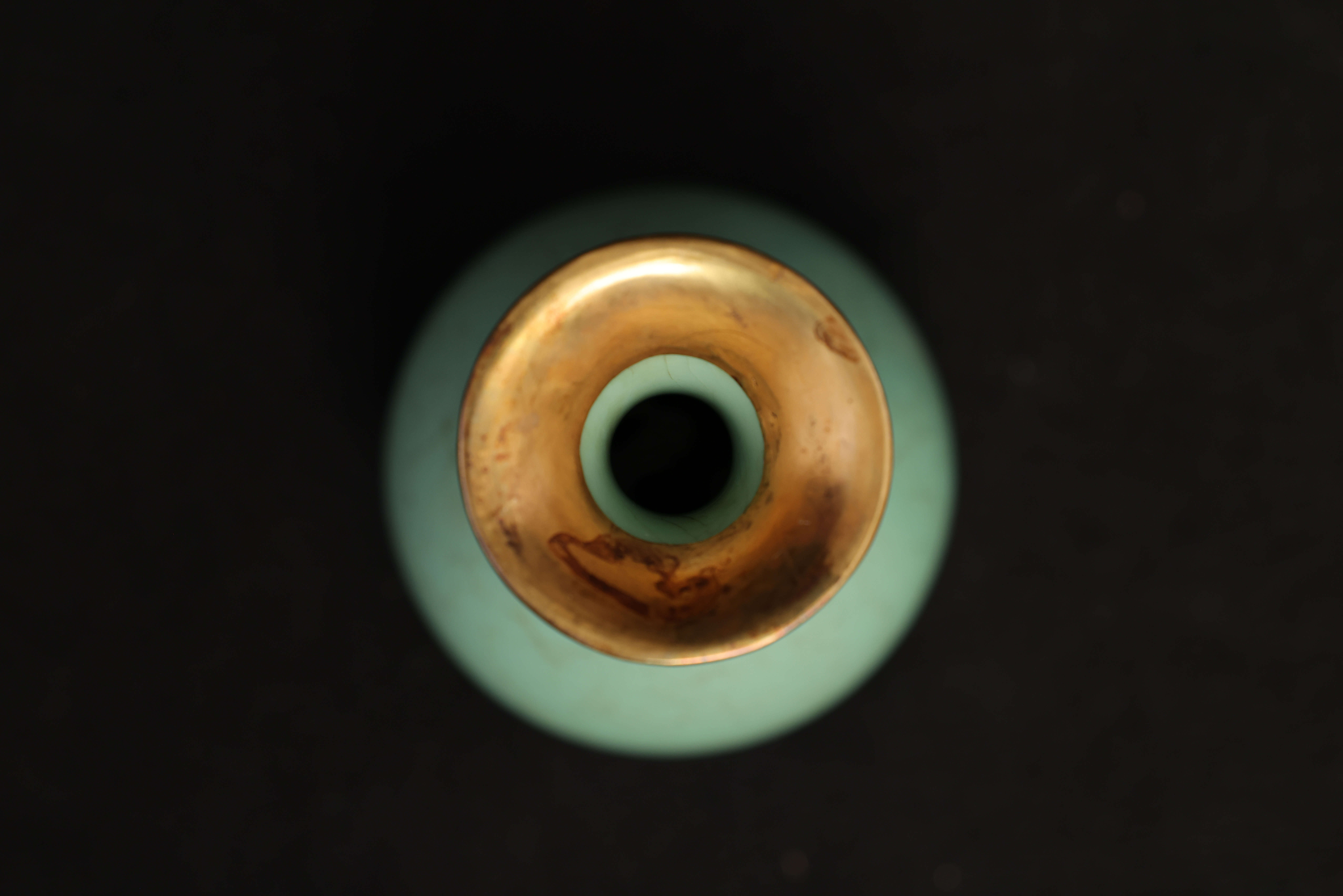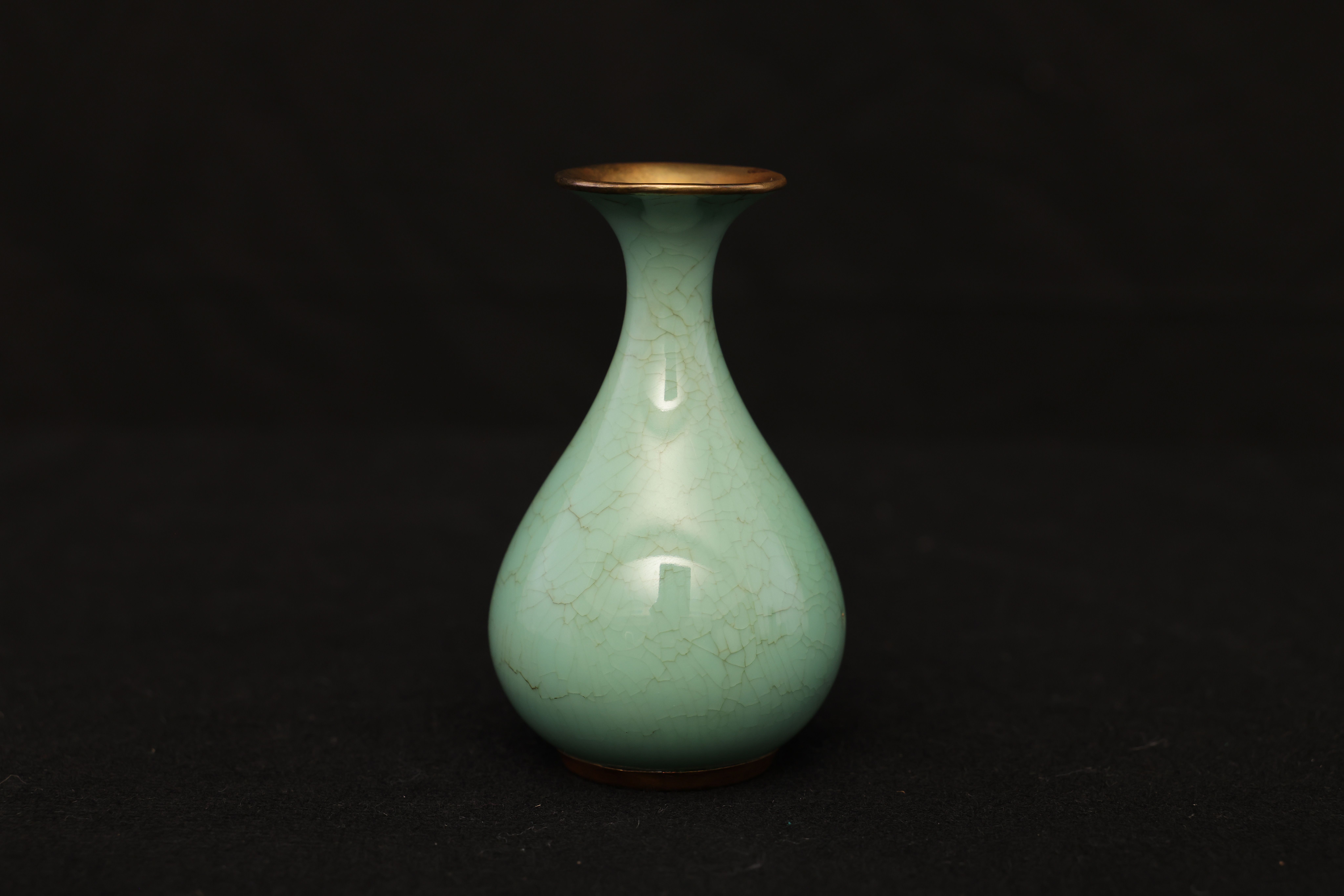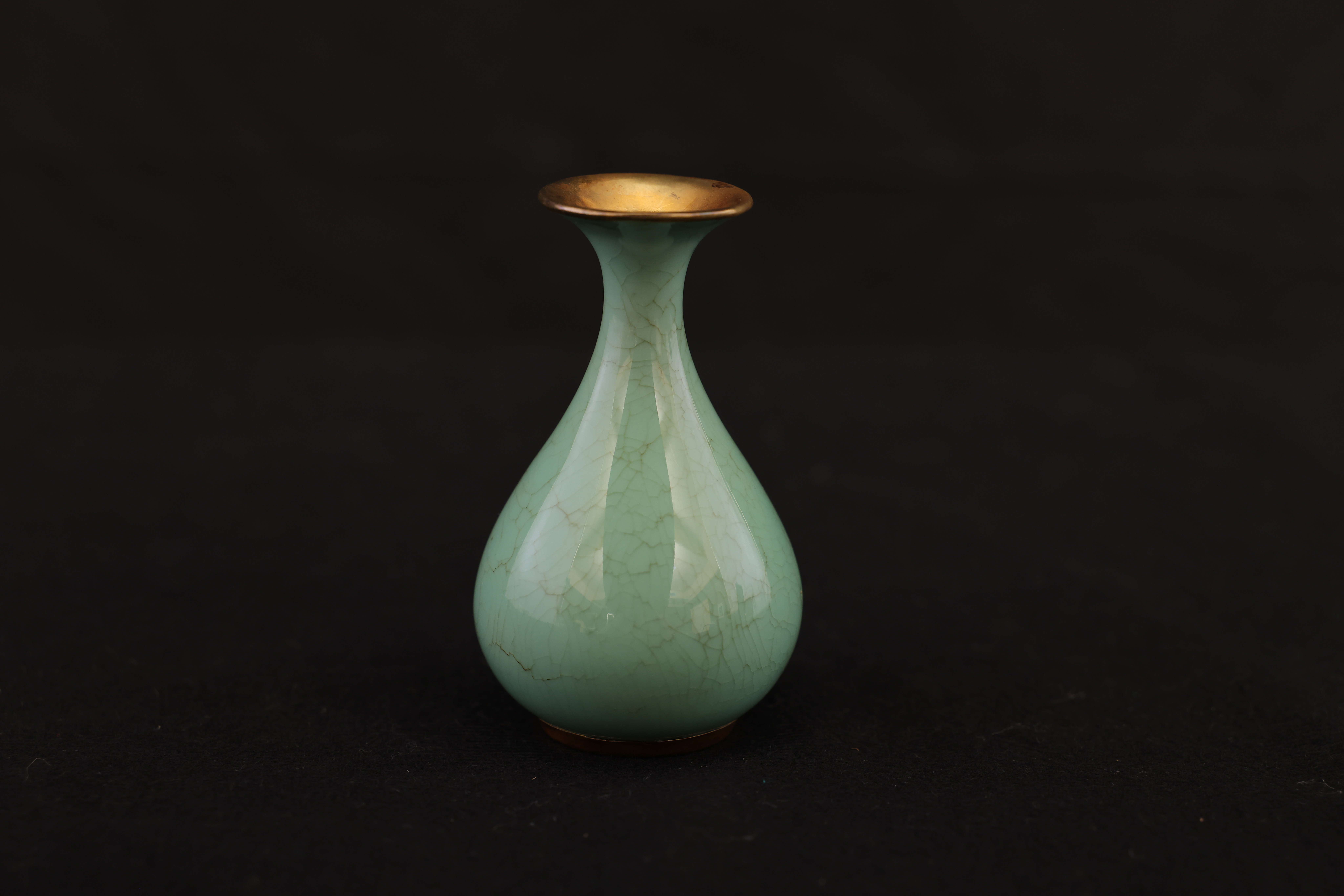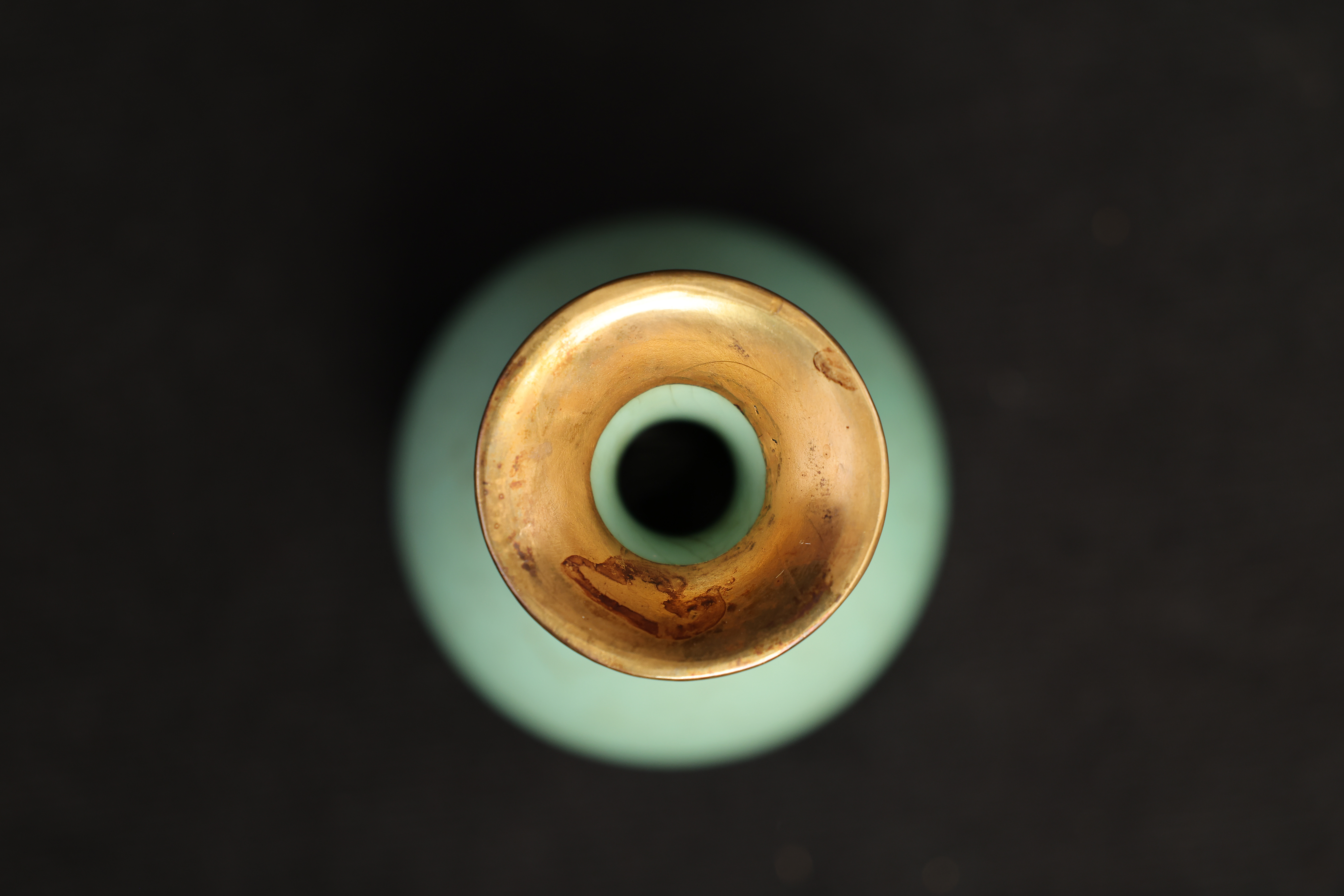 此玉壶春瓶圆口,微外撇,口沿贴金,颈部修长,腹部自然垂收,线条宛如新月初升,柔婉之间暗含力量。圈足亦施贴金。玉壶春器形向来被誉为“瓷器中的仕女图”,以其婀娜雅姿著称。通体施天青釉,釉面开片若冰裂纹,纹理间隐现淡黄沁色,光影下呈现“青如天、面如玉”的润泽质感。胎体轻薄,仅数毫米,采用典型“香灰胎”配方,轻叩声清脆如磬,质地沉静内敛。底部可见细小“芝麻粒”支钉痕,星点细弱,如夜空繁星,乃汝窑真品特征之一。整体器形端丽,釉色温润如玉,尽显汝窑“温润含蓄、清雅绝尘”的审美旨趣。