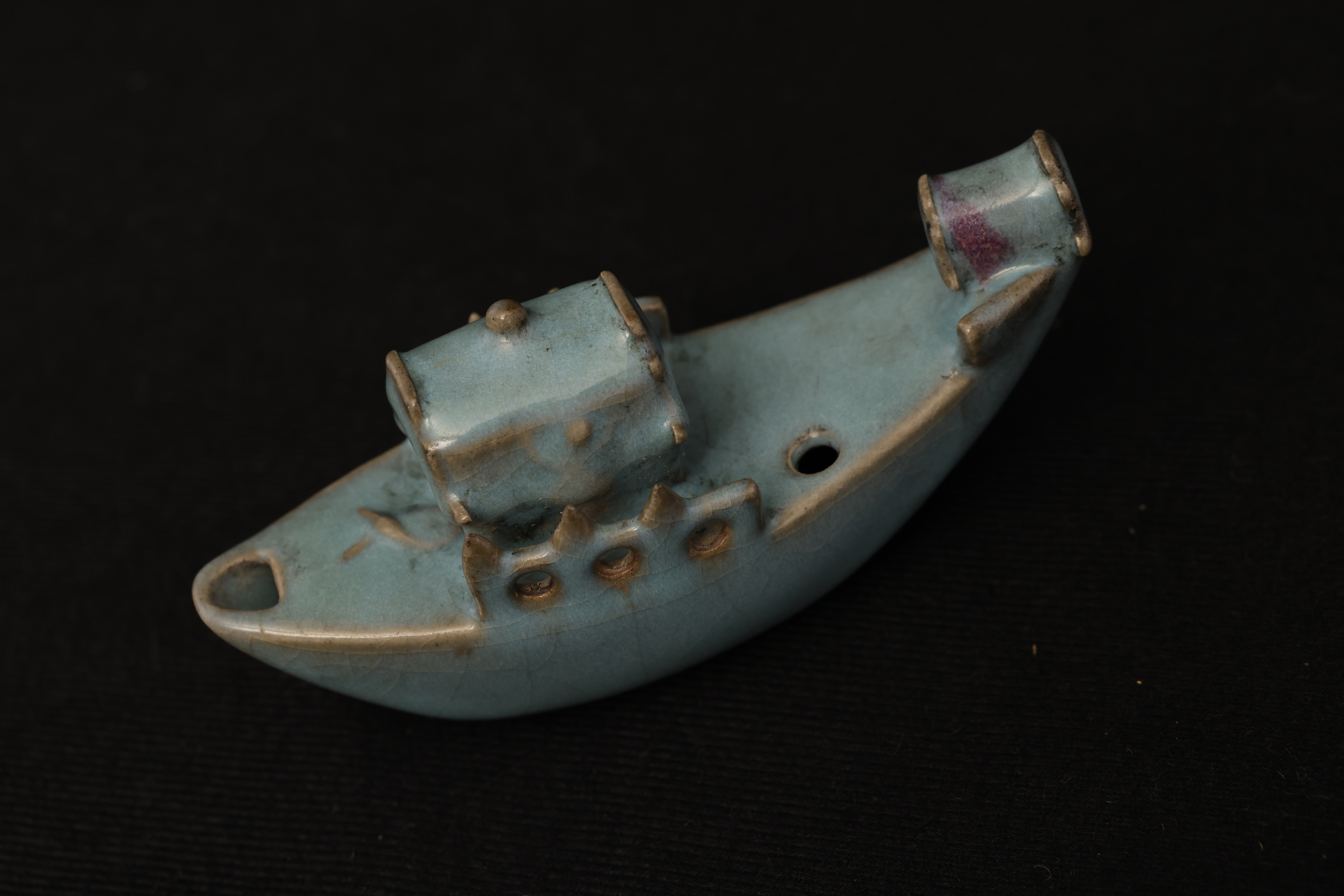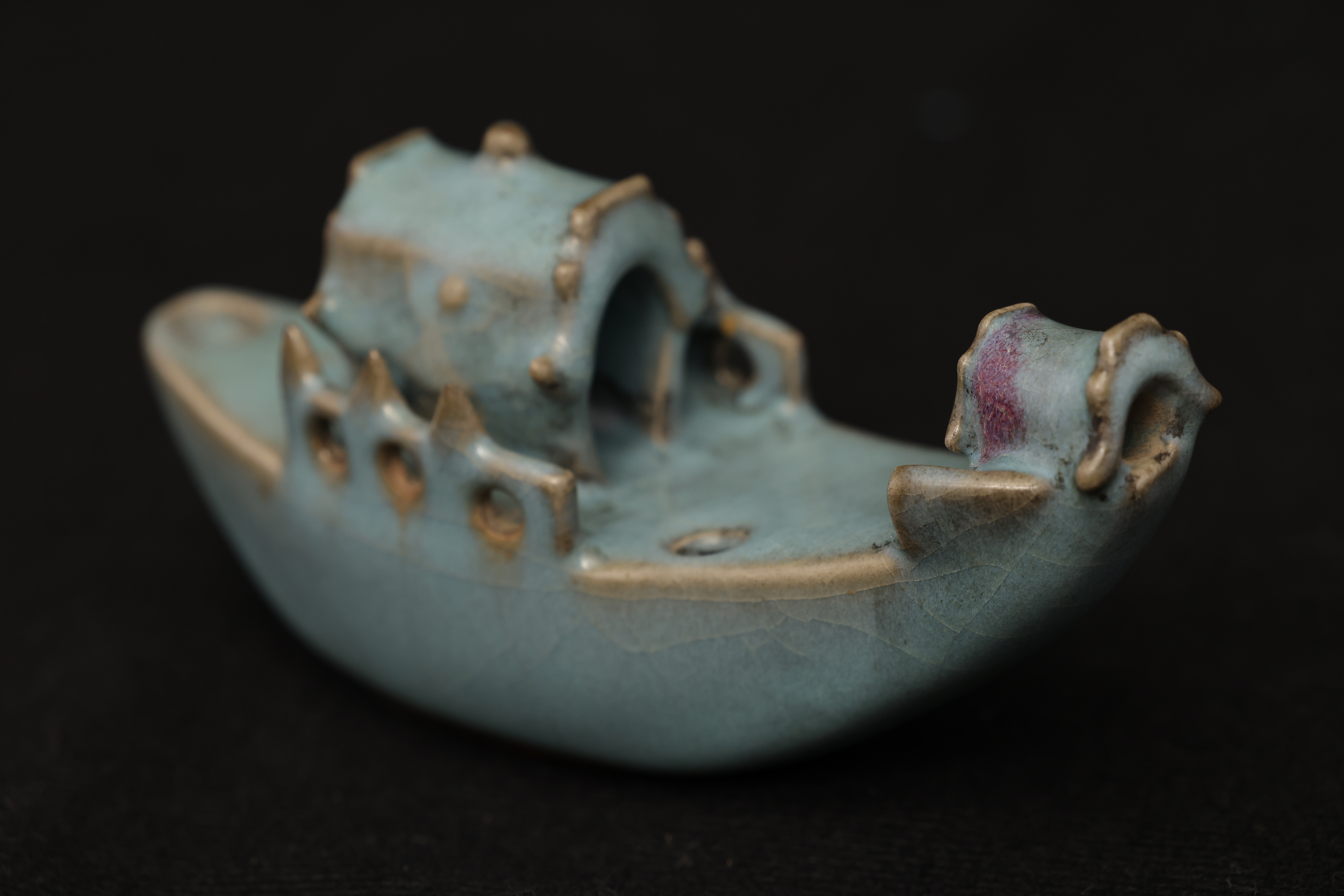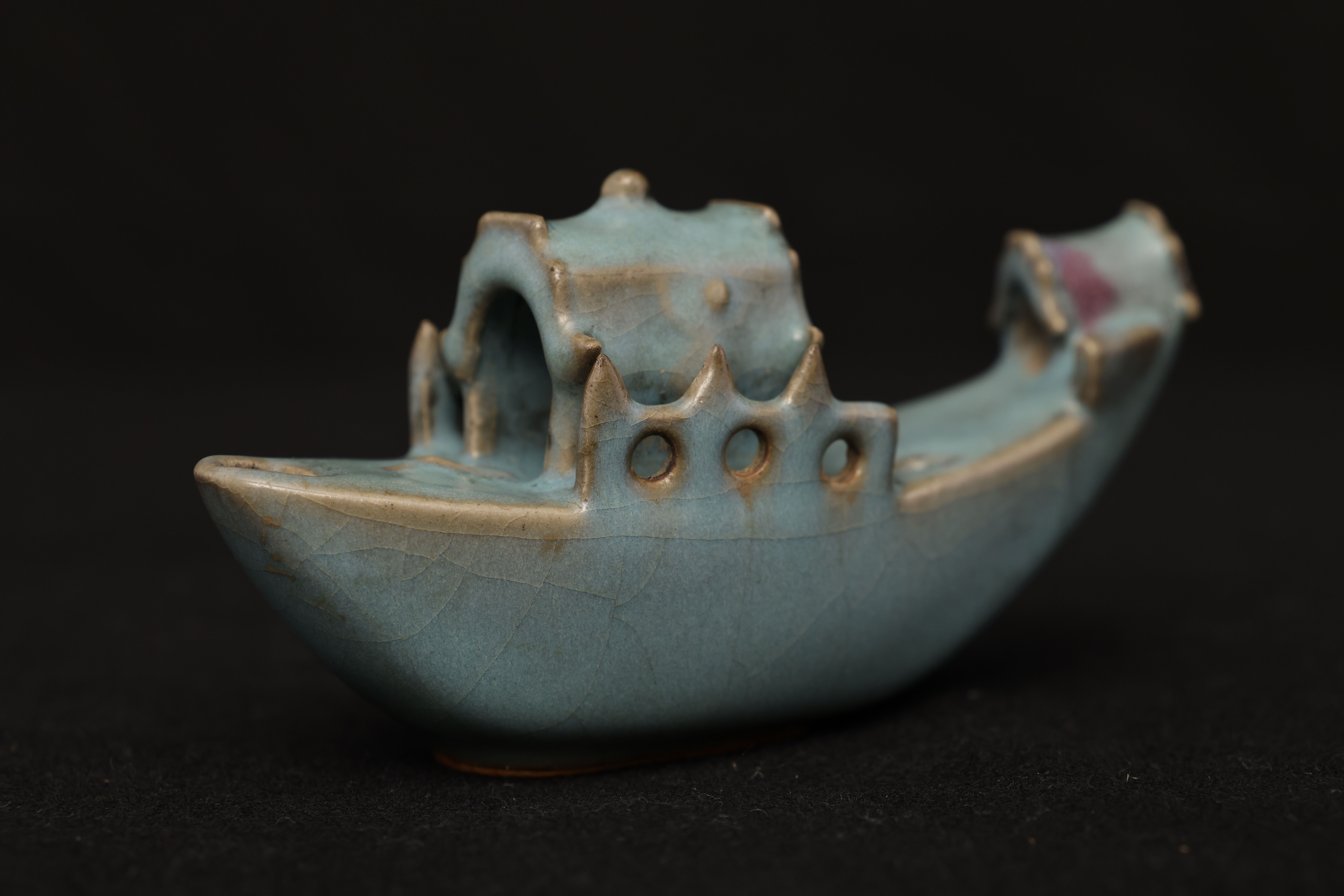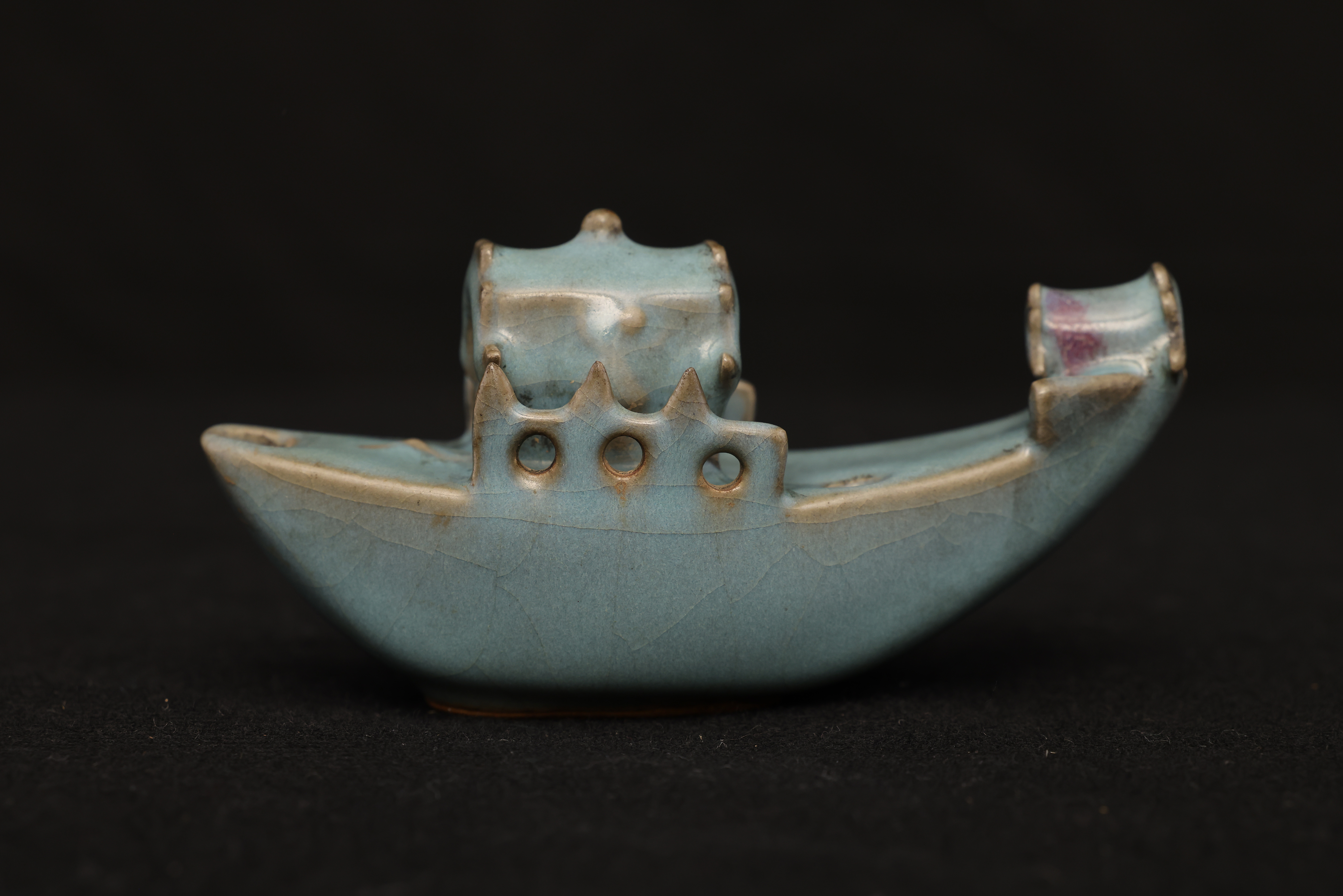 此砚滴作舟形,首尾尖翘,略作上扬,船身设栏与船篷,造型奇巧别致,匠心独具。通体釉色天青中泛紫,晕染自然,开片纹理疏朗舒展,富有钧瓷窑变的自然之美。