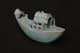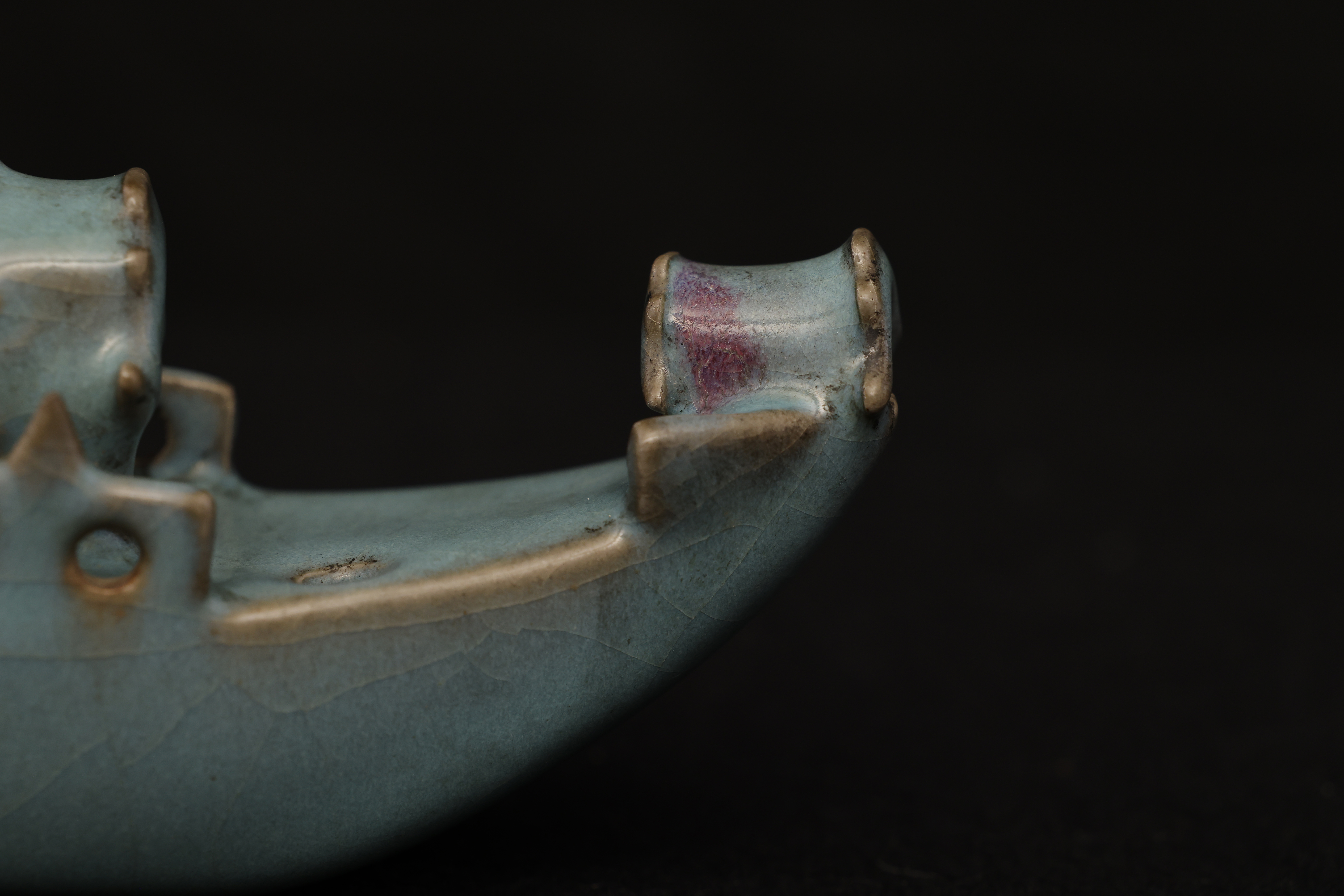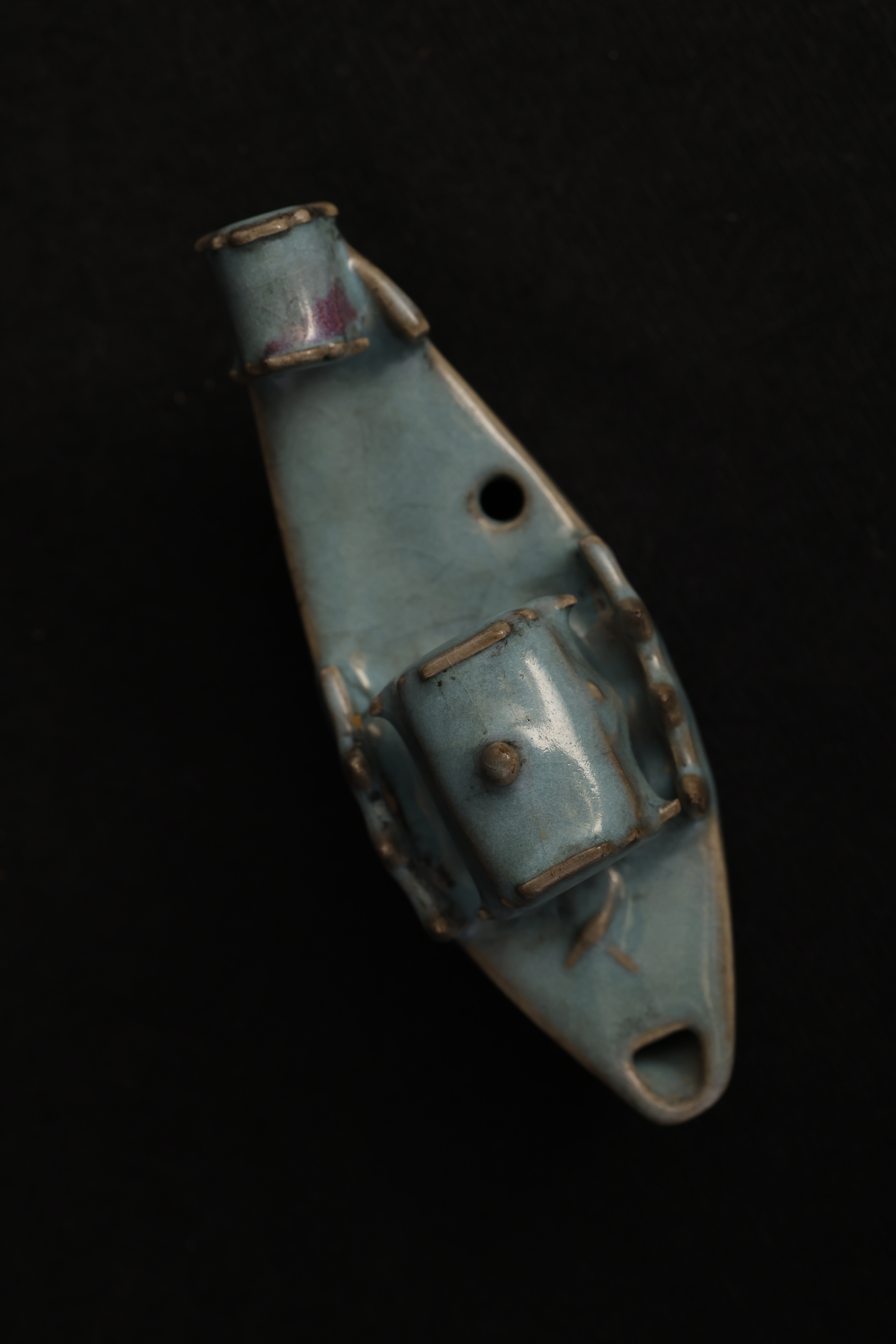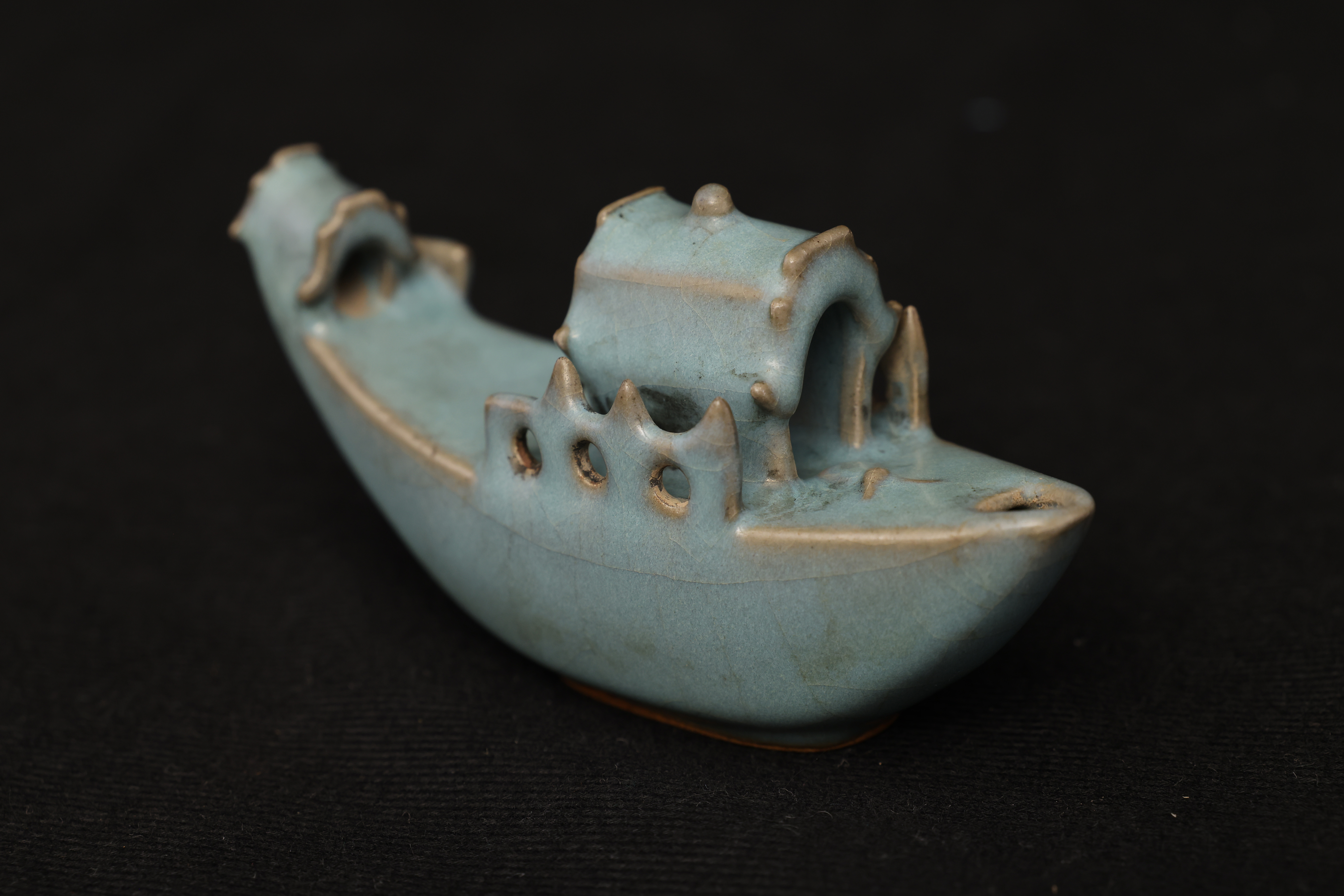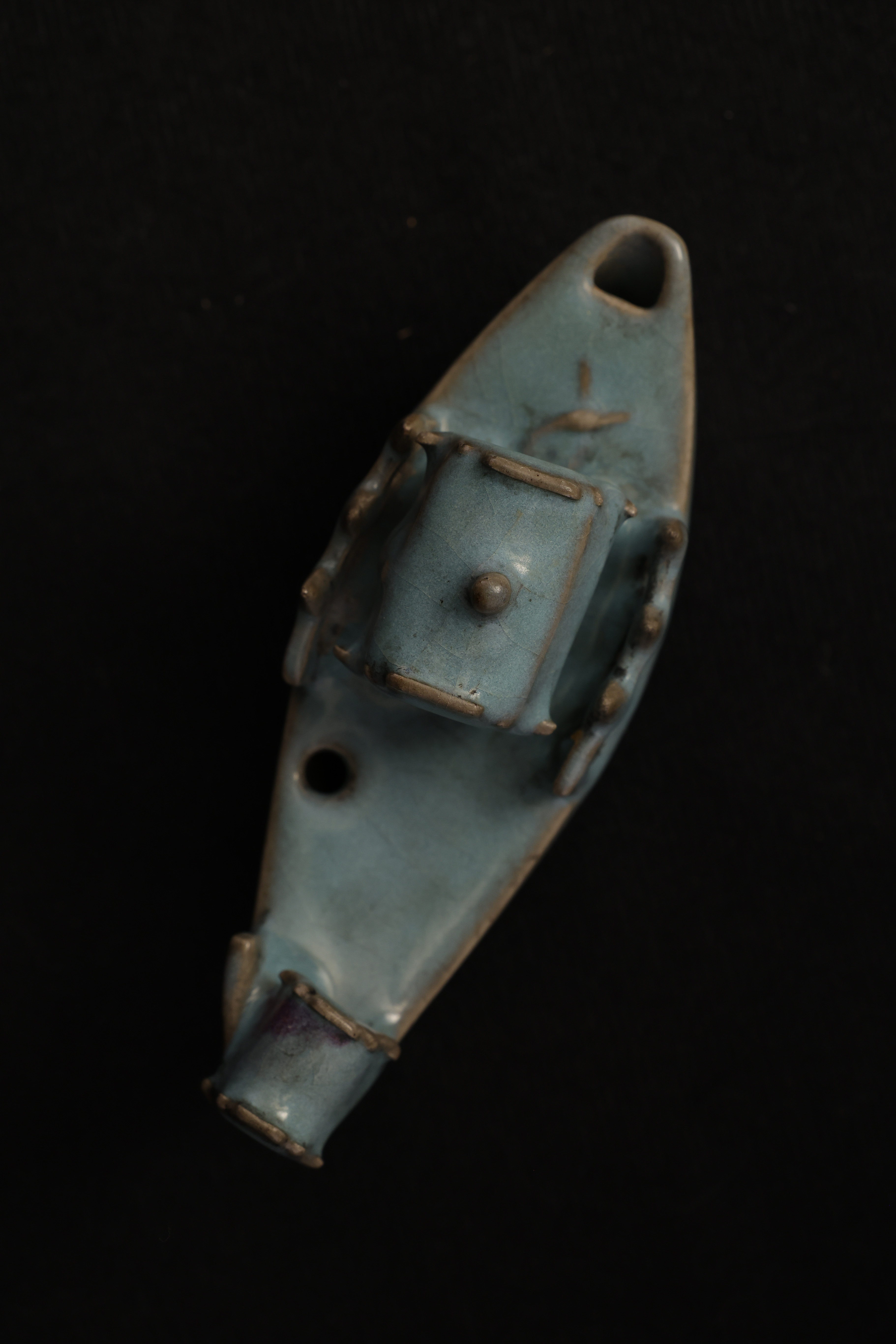 此砚滴作舟形,首尾尖翘,略作上扬,船身设栏与船篷,造型奇巧别致,匠心独具。通体釉色天青中泛紫,晕染自然,开片纹理疏朗舒展,富有钧瓷窑变的自然之美。