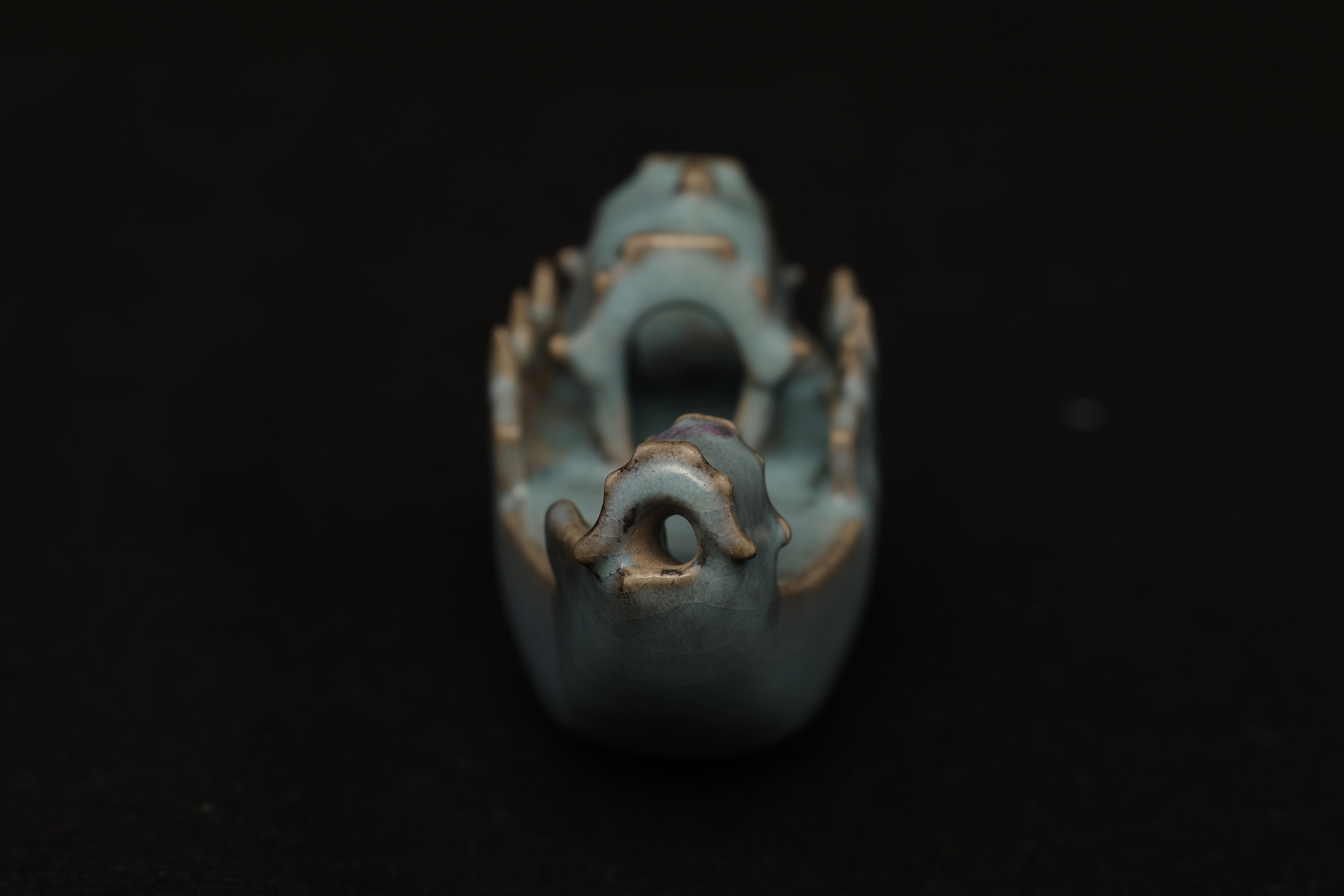 许之衡《饮流斋说瓷》亦载,水滴像形者甚古,如蟾滴、龟滴,古以铜作,后世以瓷为之,至明代更有蹲龙、宝象诸式。凡小容量、专用于少量注水者,皆名“滴”,非“盂”。此件船型砚滴造型生动,釉色窑变自然灵动,兼具使用功能与形制雅趣,是宋钧窑文房器中难得之精品。