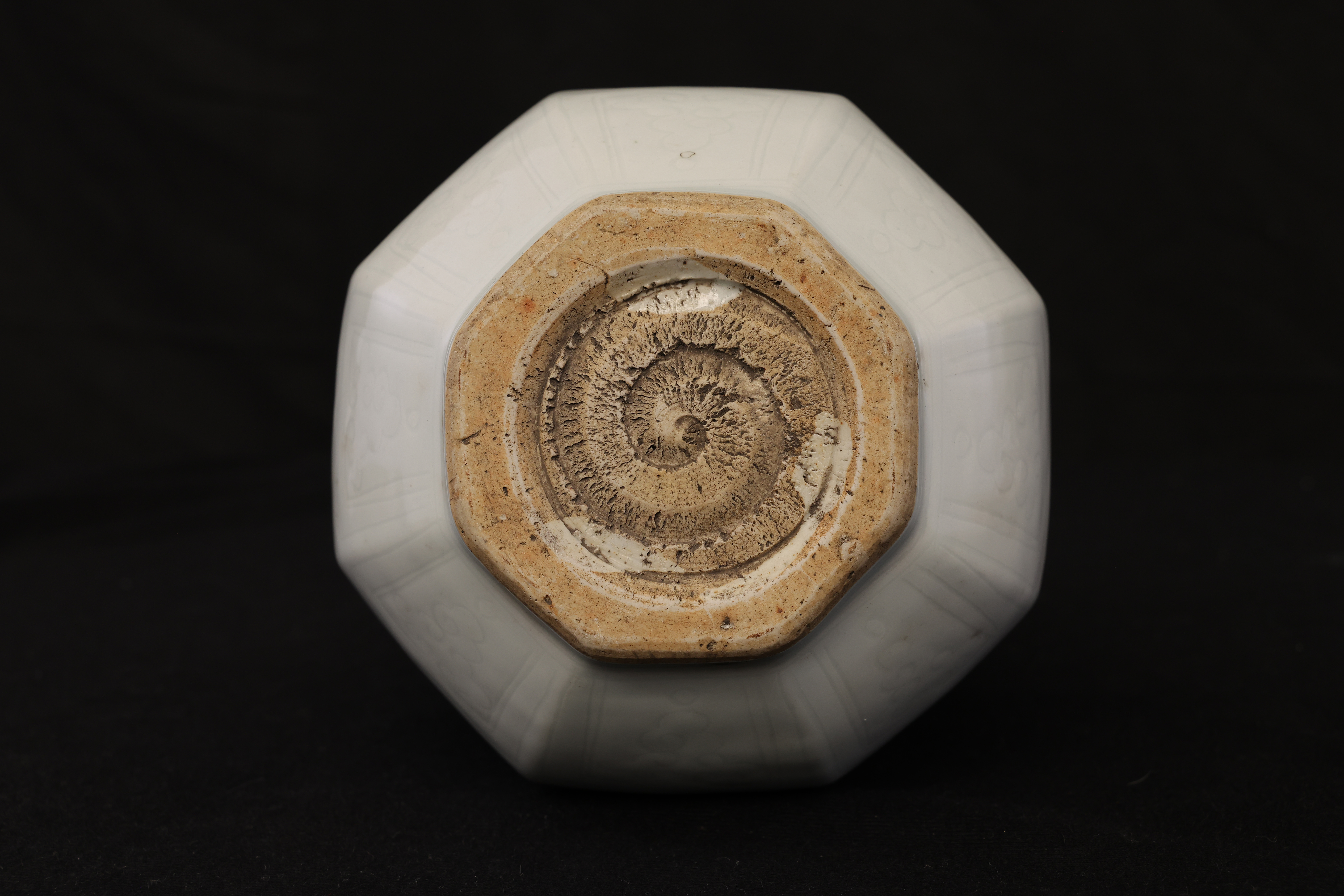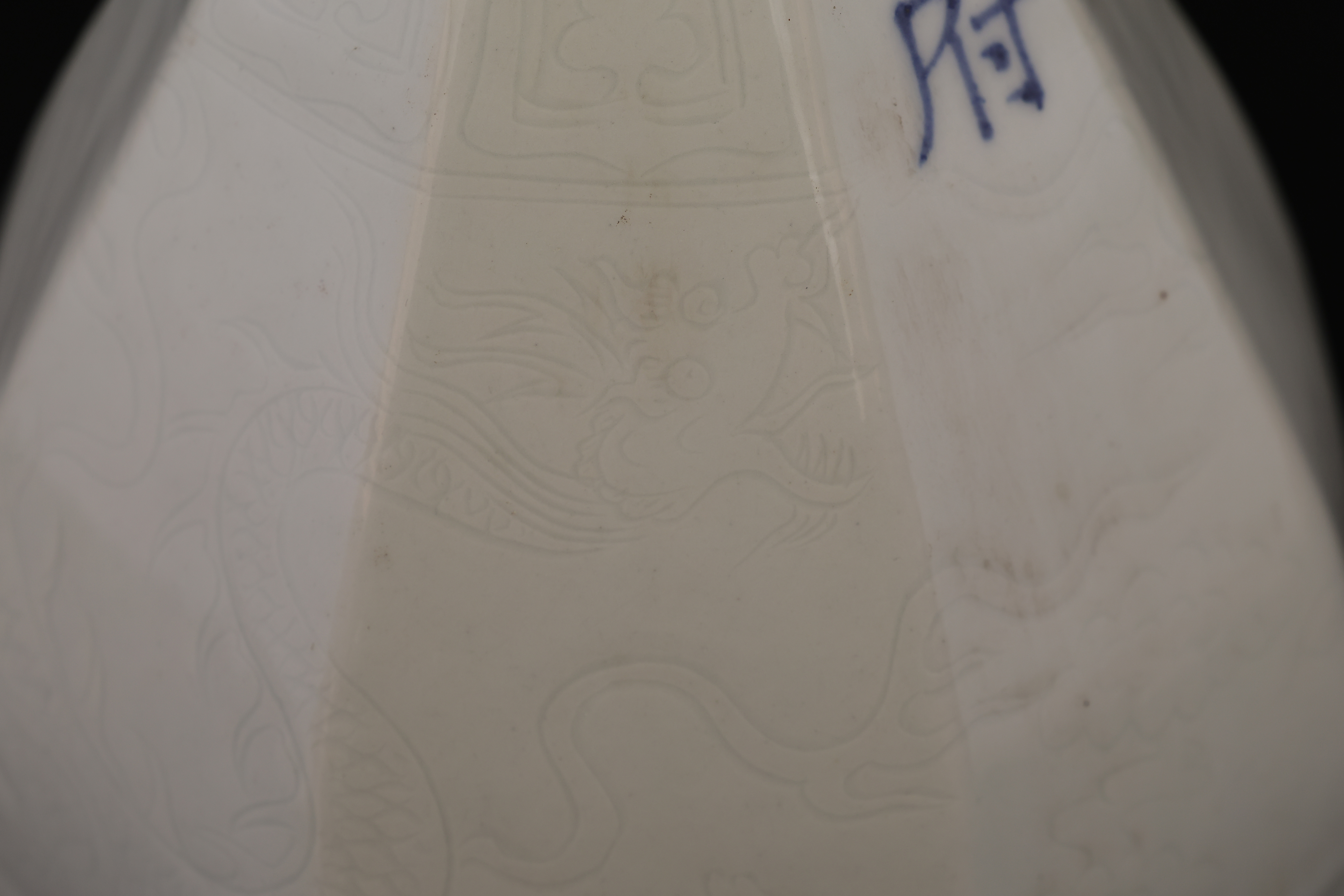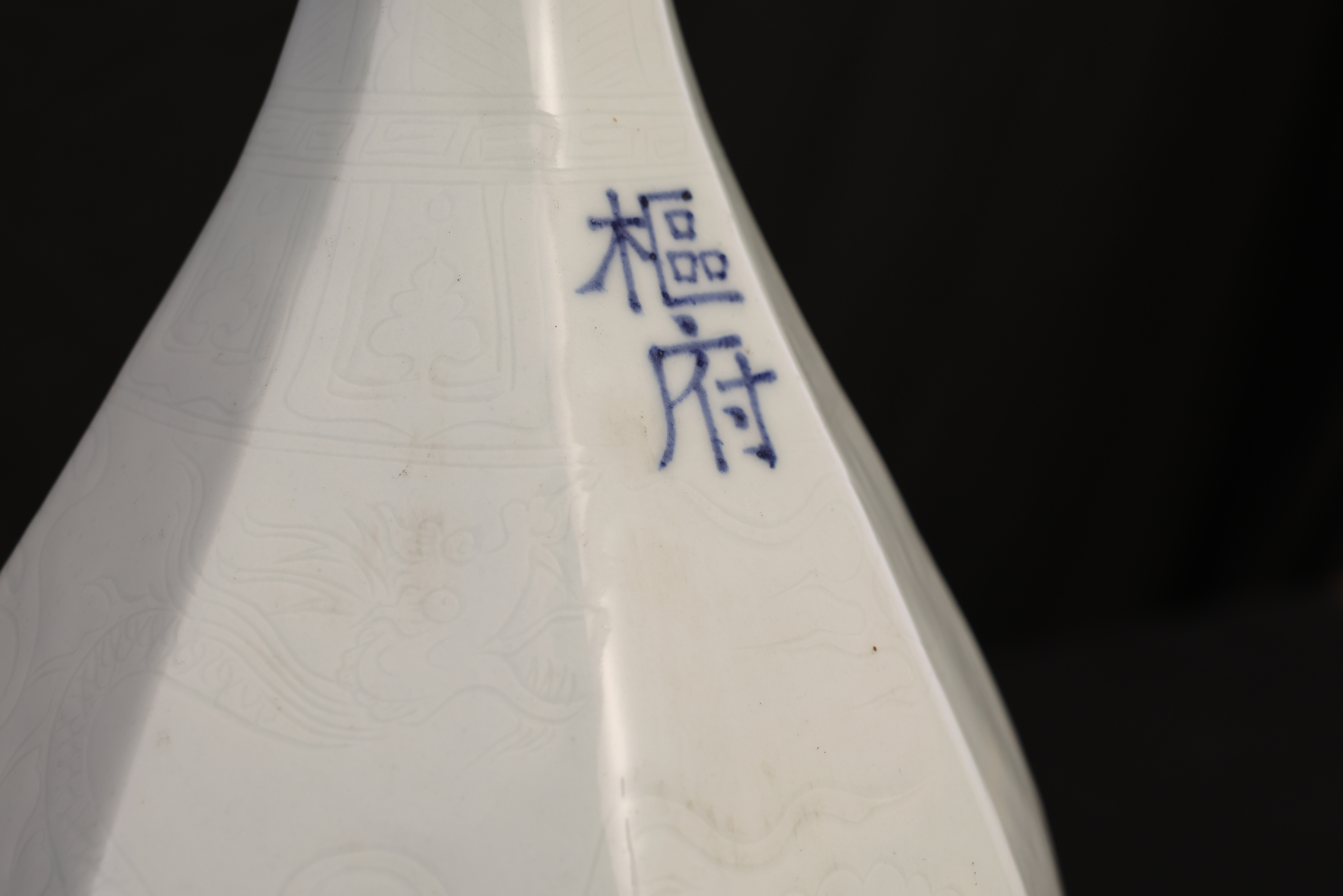 此玉壶春瓶八棱圆盘口,束颈长身,下宽而溜肩,鼓腹,圈足稳重,棱角分明,器形端庄刚劲而含柔和之美。通体施枢府白釉,釉质淡雅细腻,温润如玉。颈部饰蕉叶纹及回纹,肩部饰莲瓣纹,腹部施暗刻龙纹,龙身矫健,生动威严;足墙饰仰莲纹,线条流畅自然。肩部青花书“枢府”二字楷书款,典雅端庄,寓意器物身份与价值。整体造型比例和谐,纹饰丰富而层次分明,既体现宫廷御用瓷的庄重与精致,又兼具玉壶春瓶的温润端庄气韵。此件器物不仅是观赏珍品,也是宋元以来官窑与文房用瓷的精华代表,反映出制瓷工艺在结构造型、釉色运用及纹饰表现上的高度成熟。