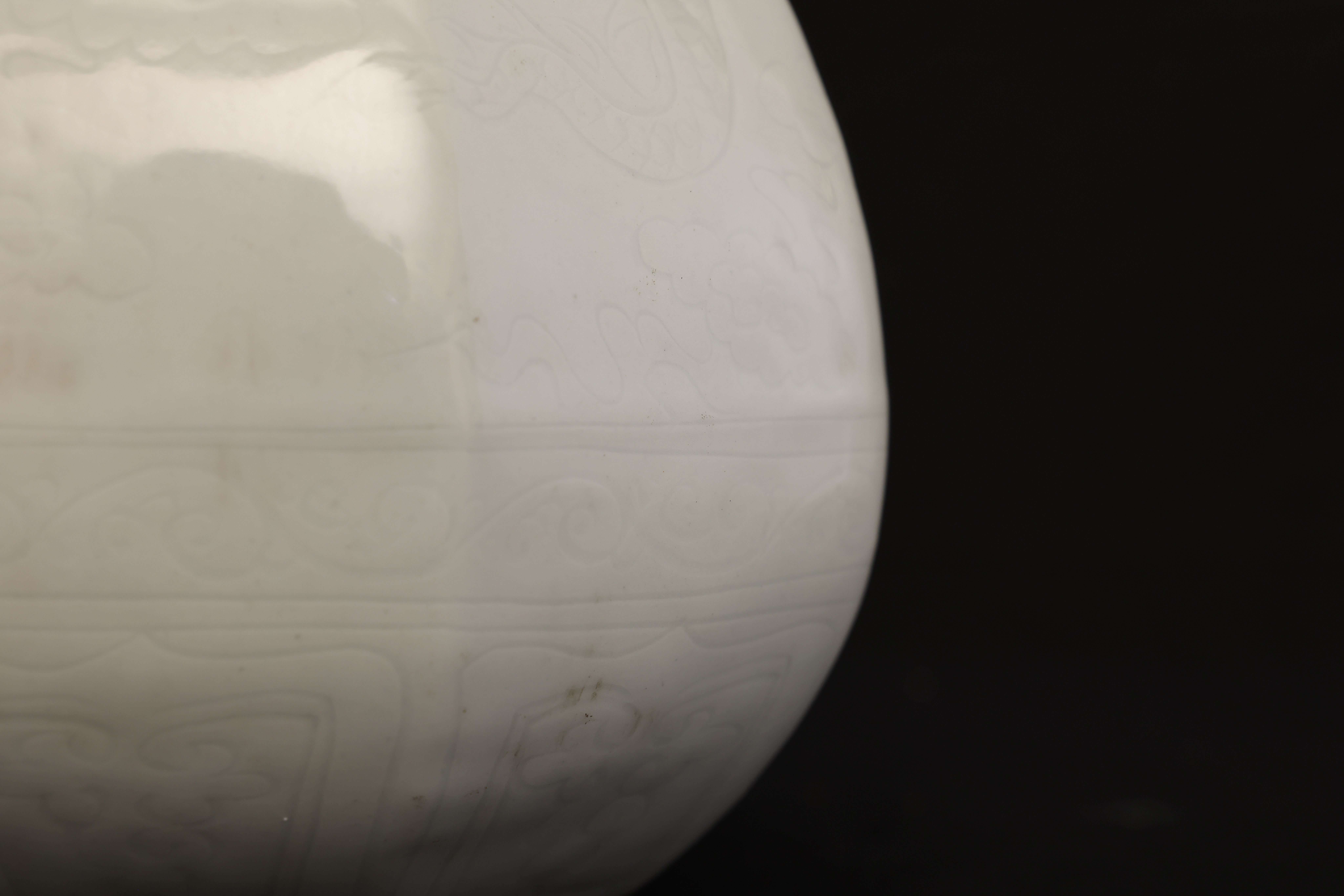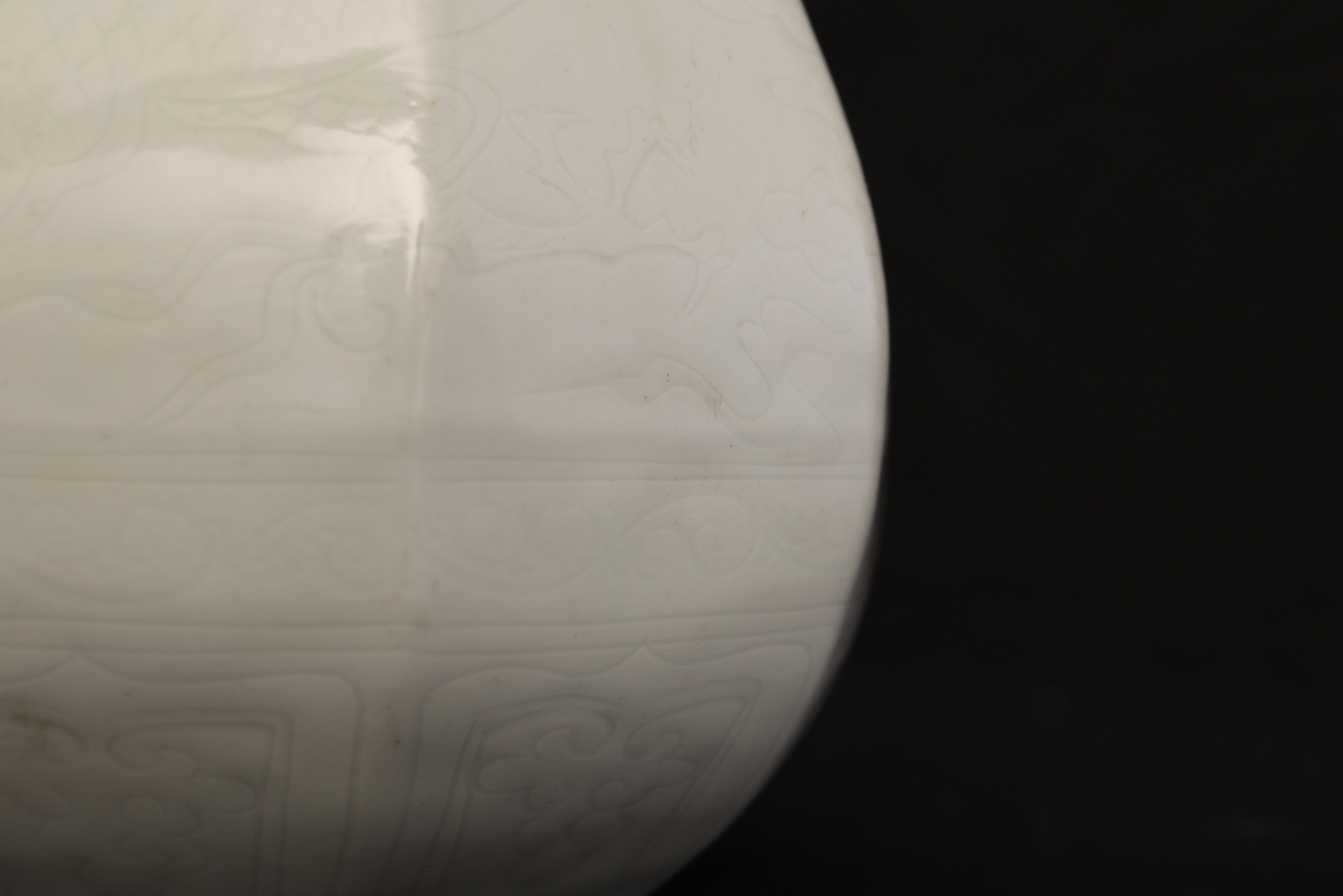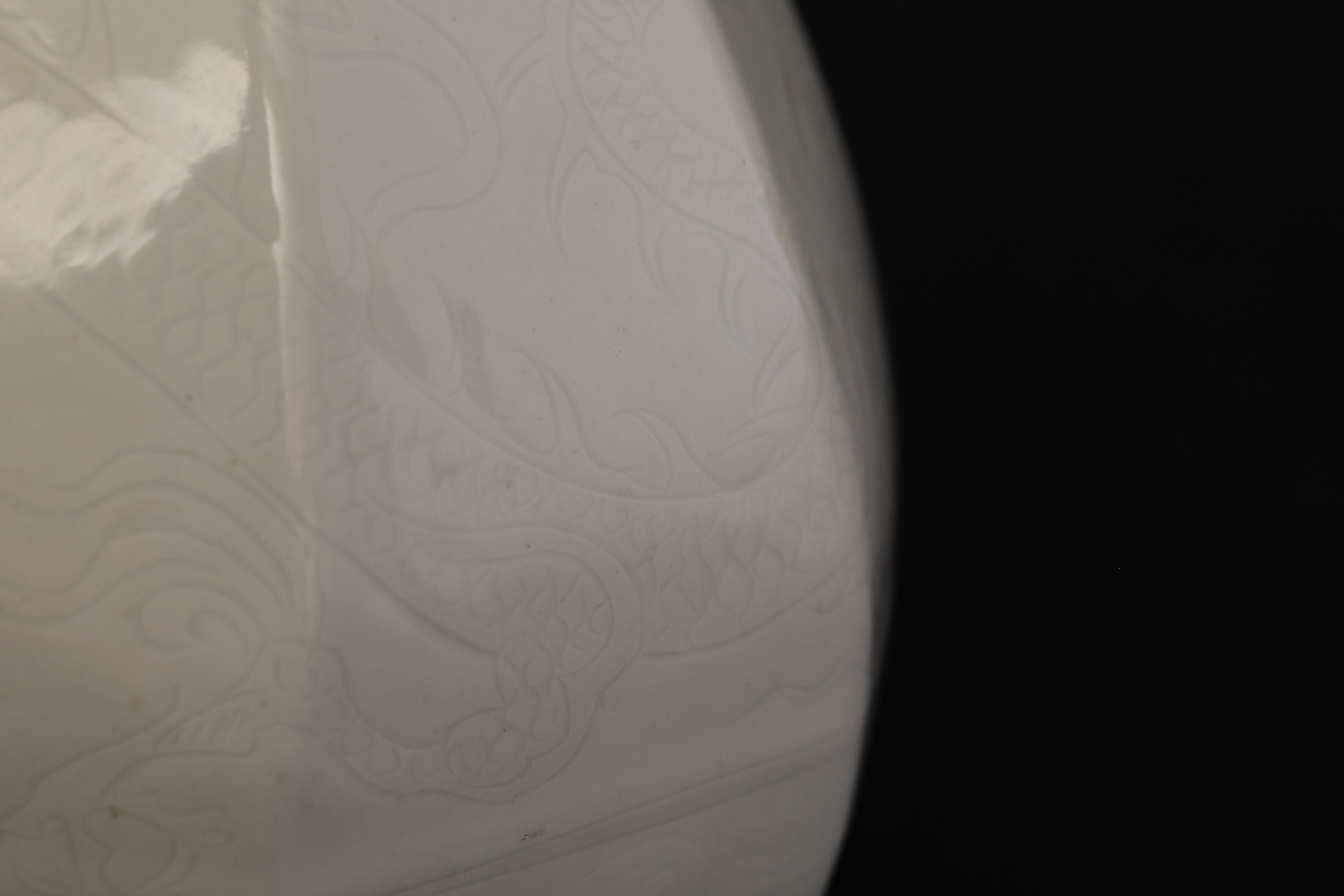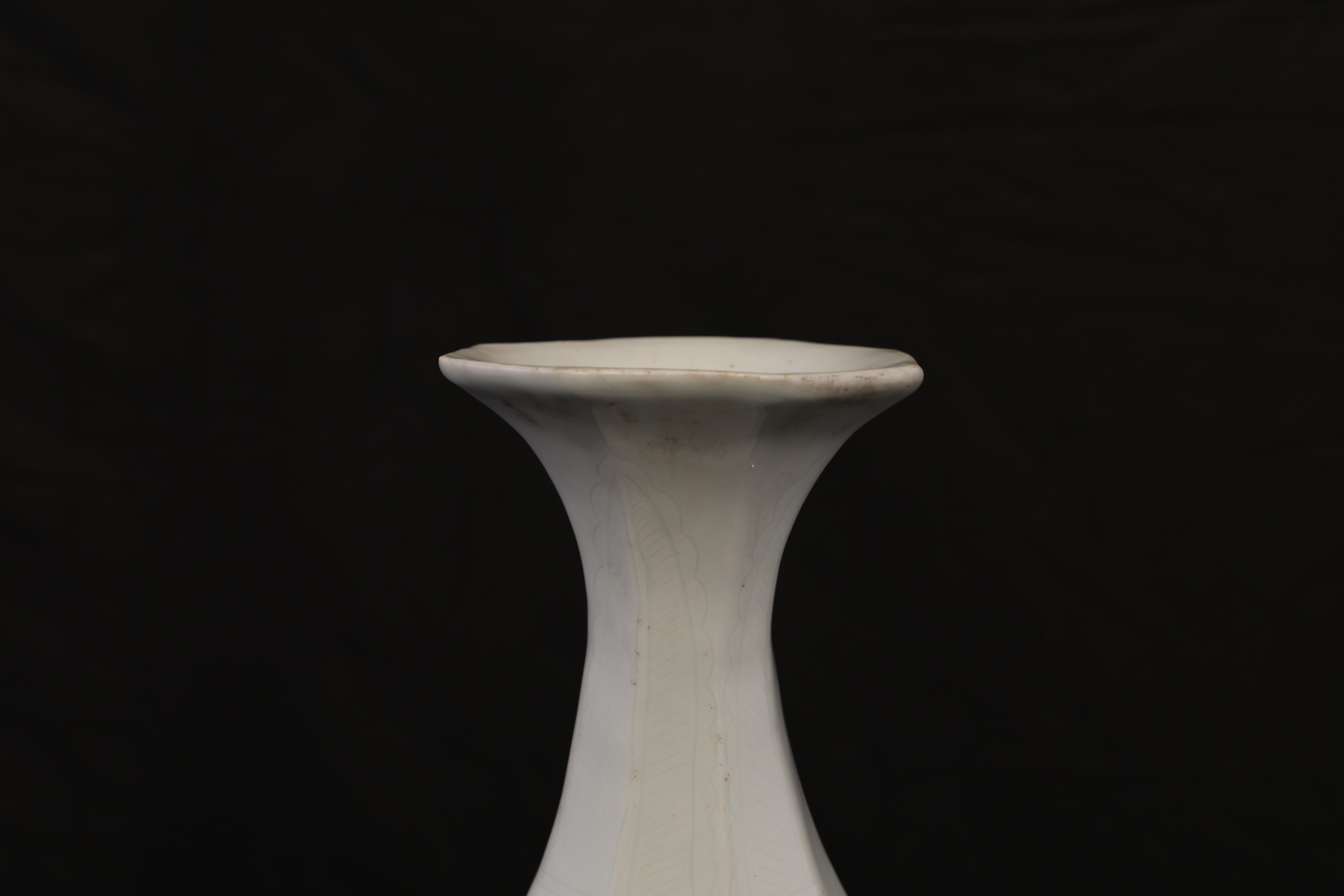 此玉壶春瓶八棱圆盘口,束颈长身,下宽而溜肩,鼓腹,圈足稳重,棱角分明,器形端庄刚劲而含柔和之美。通体施枢府白釉,釉质淡雅细腻,温润如玉。颈部饰蕉叶纹及回纹,肩部饰莲瓣纹,腹部施暗刻龙纹,龙身矫健,生动威严;足墙饰仰莲纹,线条流畅自然。肩部青花书“枢府”二字楷书款,典雅端庄,寓意器物身份与价值。整体造型比例和谐,纹饰丰富而层次分明,既体现宫廷御用瓷的庄重与精致,又兼具玉壶春瓶的温润端庄气韵。此件器物不仅是观赏珍品,也是宋元以来官窑与文房用瓷的精华代表,反映出制瓷工艺在结构造型、釉色运用及纹饰表现上的高度成熟。