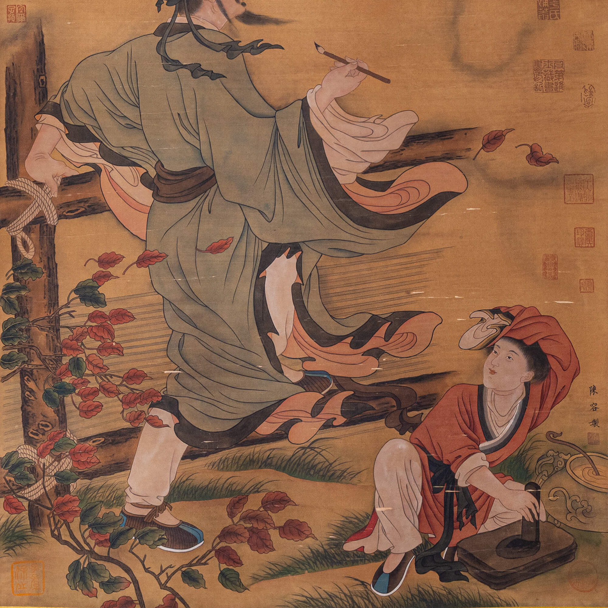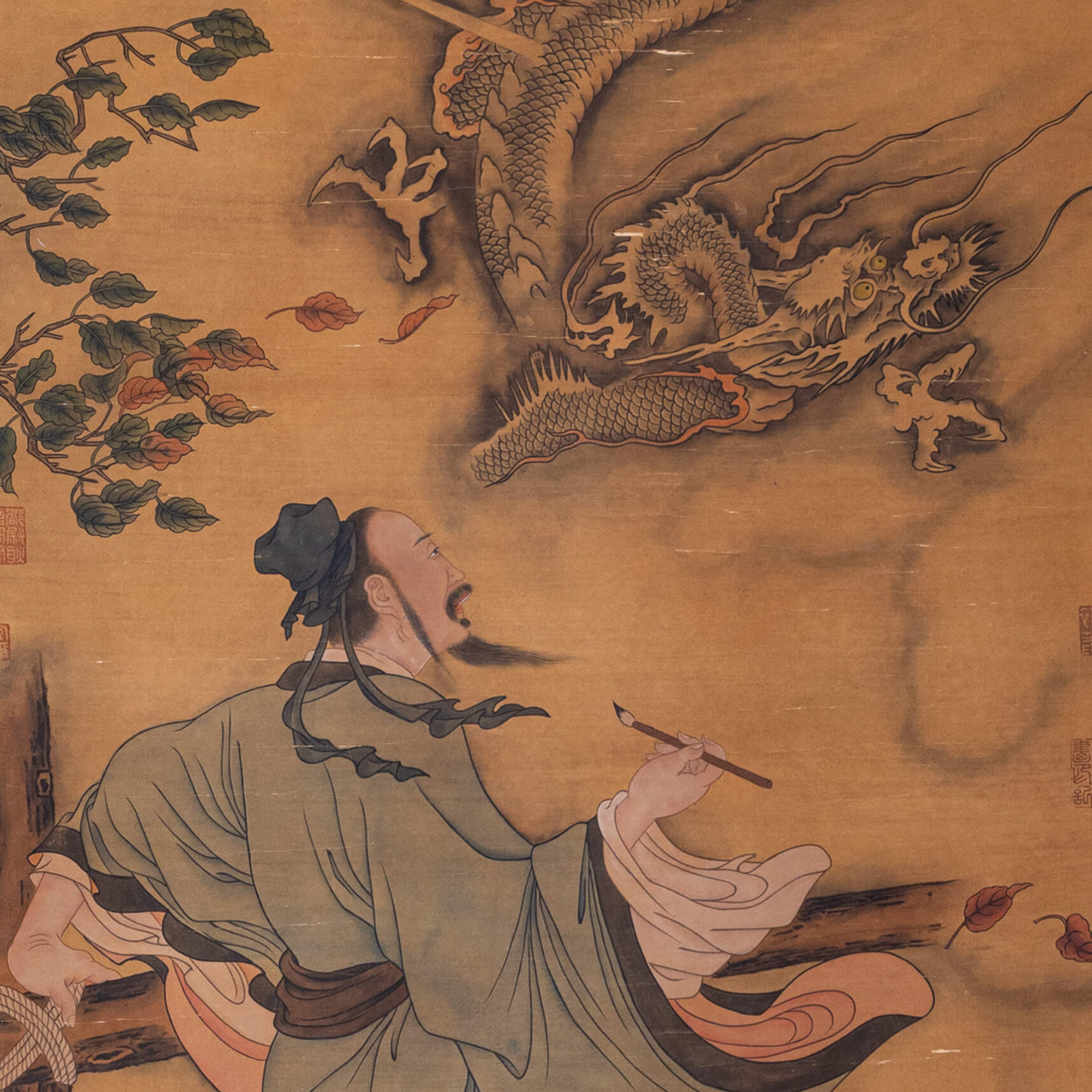 畫面上方的乾隆禦題「九重真龍出洪荒萬古開」,將龍作為帝王象征的威力進一步凸顯,彰顯古代帝王與天命的深刻聯系。畫面右下角落「陳容製」款,更顯珍貴。整幅作品氣勢磅礴,神韻獨具,在陳容存世不多的作品中,既展現了「所翁龍」的特點,又體現其人物畫的精妙,充分展現了南宋畫龍的超高水平。