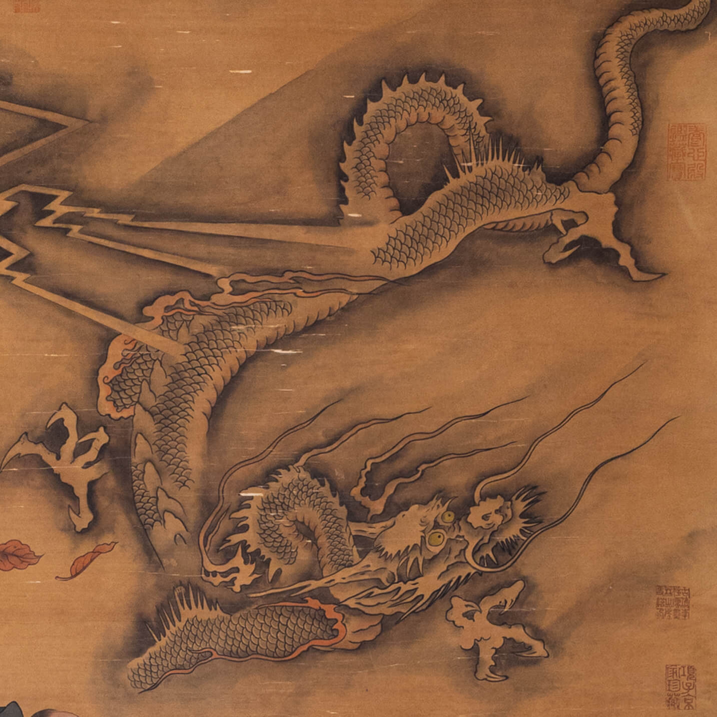 作品為立軸,絹本水墨,此畫為陳容畫龍經典作品之一,以水墨繪龍騰雲天,自右上向左下取勢,龍體呈拉長的「c」形盤旋,呼嘯俯沖而下,動感強烈。龍首右仰,須發噴張,龍爪向前,電閃雷鳴,雲層滾滾,成呼風喚雨而來之勢。龍體筆力酋勁,煙雲飄渺,形成對比,烘托出龍叱咤風雲的雄壯意氣。左下方繪人物執筆,昂首望向龍來的方向,衣袂飄飄,右下方繪一童子,一手研磨,一手扶額,望向遠方,四周花草,枝葉翻飛。人物線條簡潔明快,色彩豐富不失雅致。整幅作品仿佛繪製了作者心中,龍來的真實時刻,那一瞬間,天地失色,風起雲湧,波濤詭譎,龍身閃現,驚喜又驚詫。通過細膩的點、勾、渲、染技法,陳容將雲霧繚繞、波濤洶湧的景象呈現得淋漓盡致,傳達出超越世俗的心境。