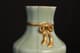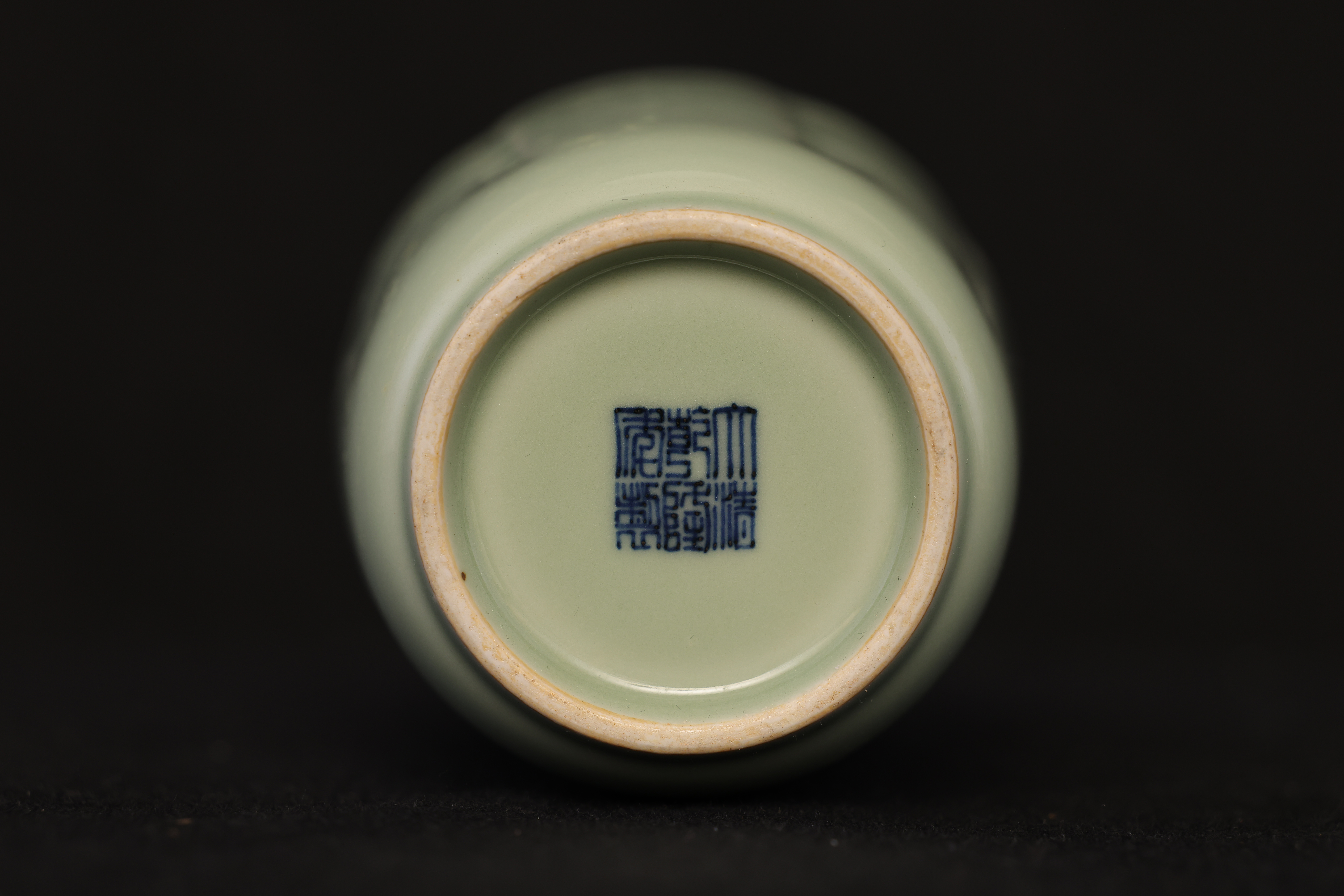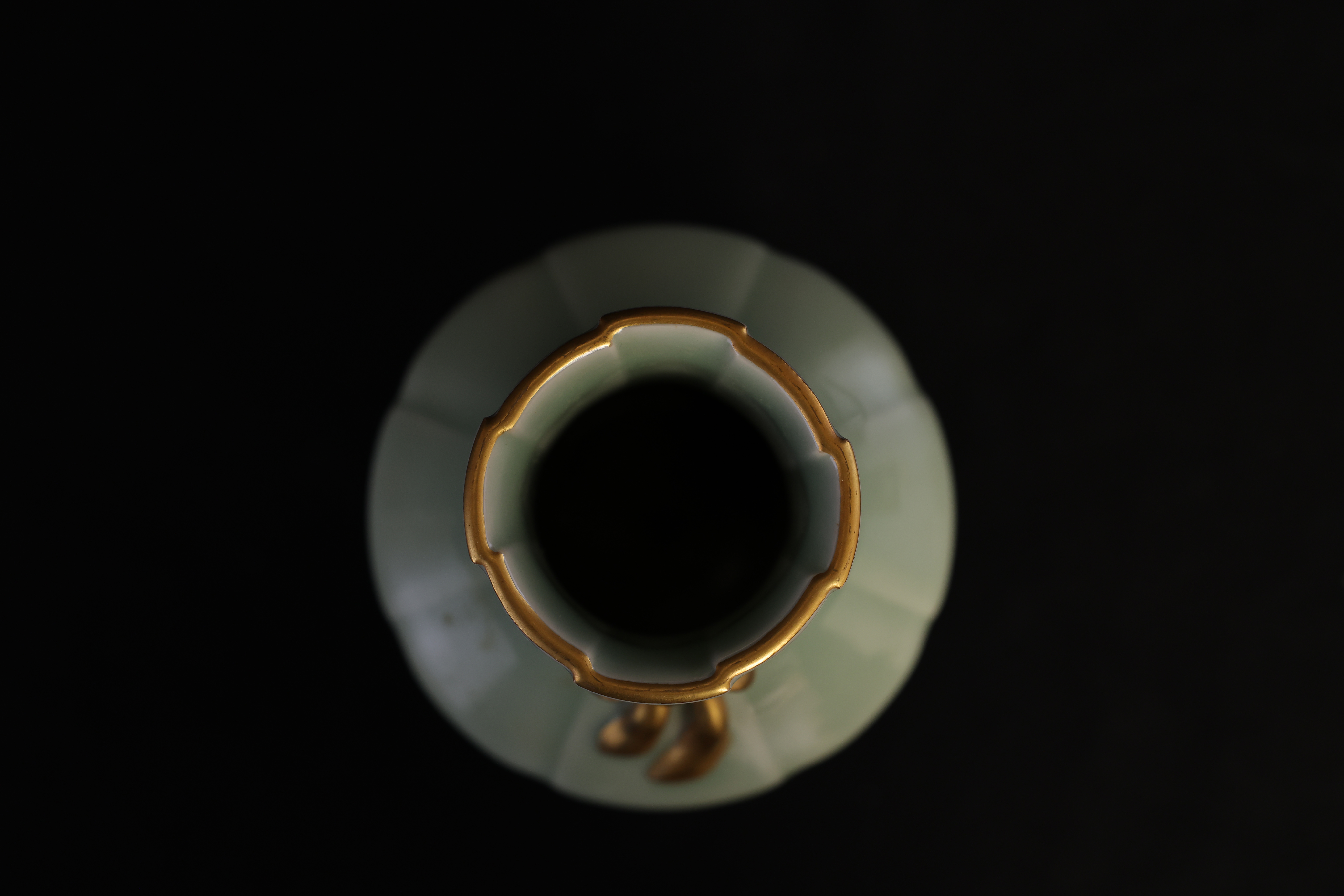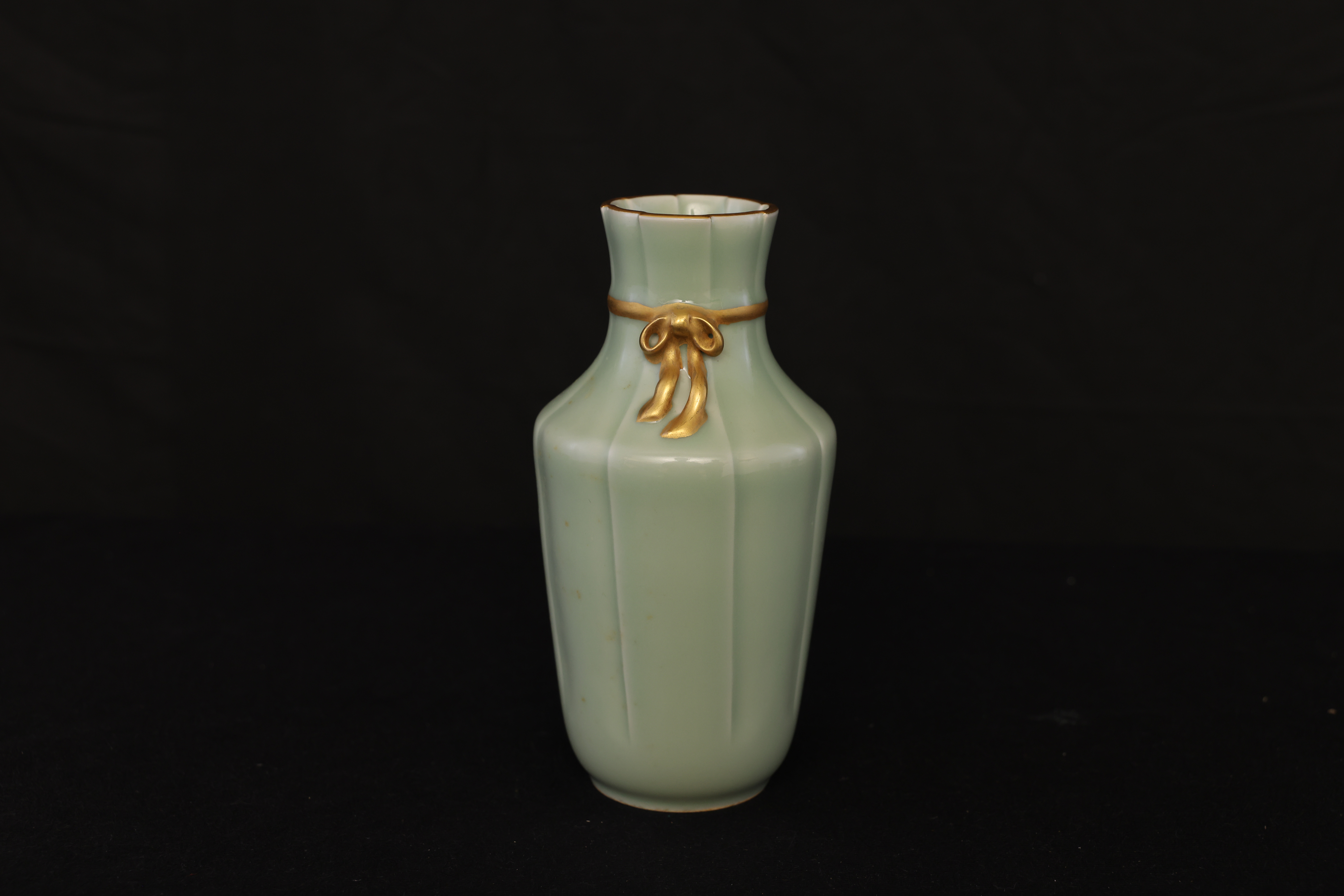 此尊以瓜棱爲形,敞口外撇,口沿描金,短頸挺拔。頸部飾凸雕包袱紋,布紋褶皺細致入微,壹條绶帶自頸部環繞系結,呈蝴蝶結狀,並以描金點綴,更顯富麗雅致。通體施豆青釉,釉面肥腴細膩,聚釉處色澤青翠欲滴。器身下承圈足,足底露胎呈潔白細膩之色。底部書“大清乾隆年制”六字三行篆書款,規整端嚴。