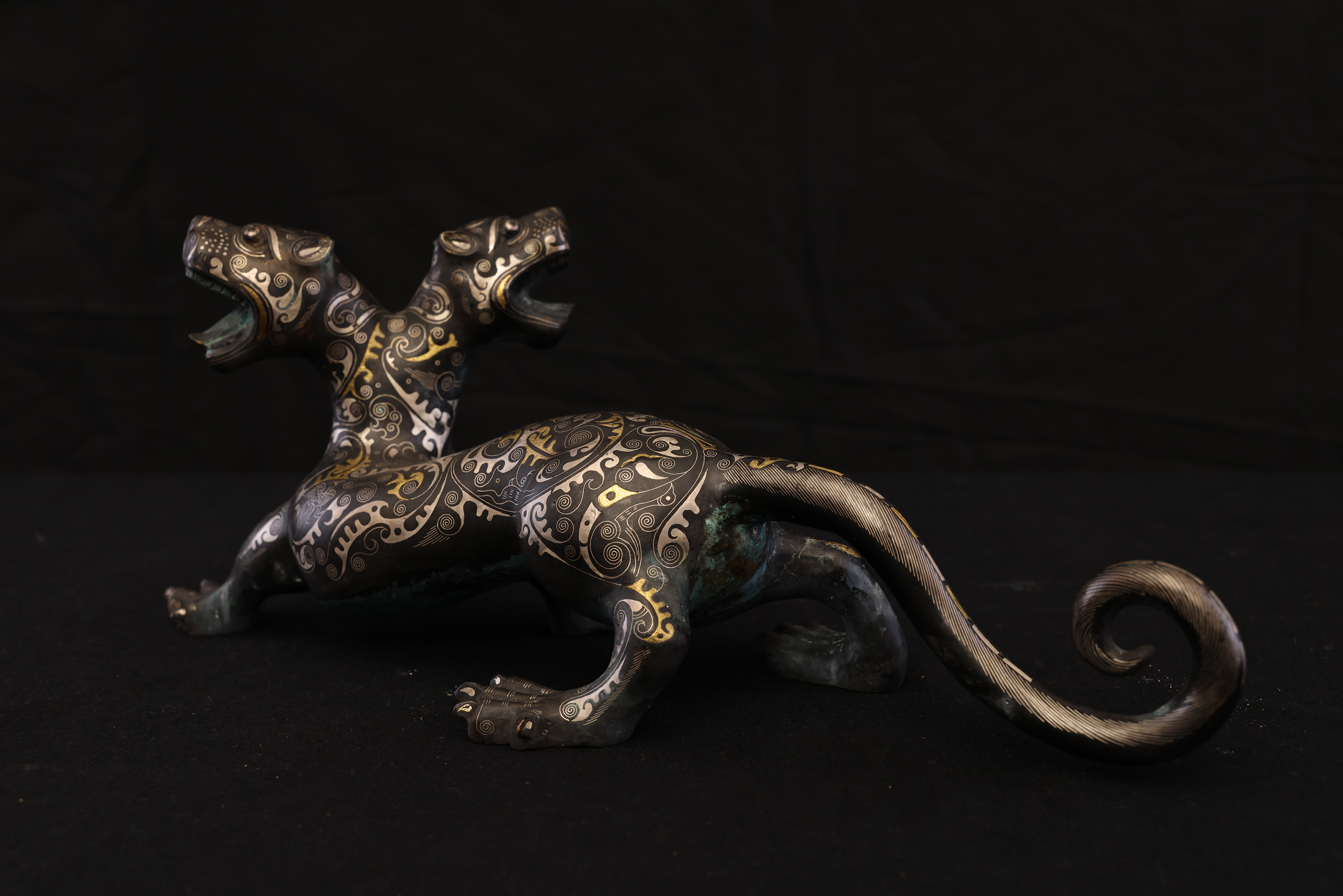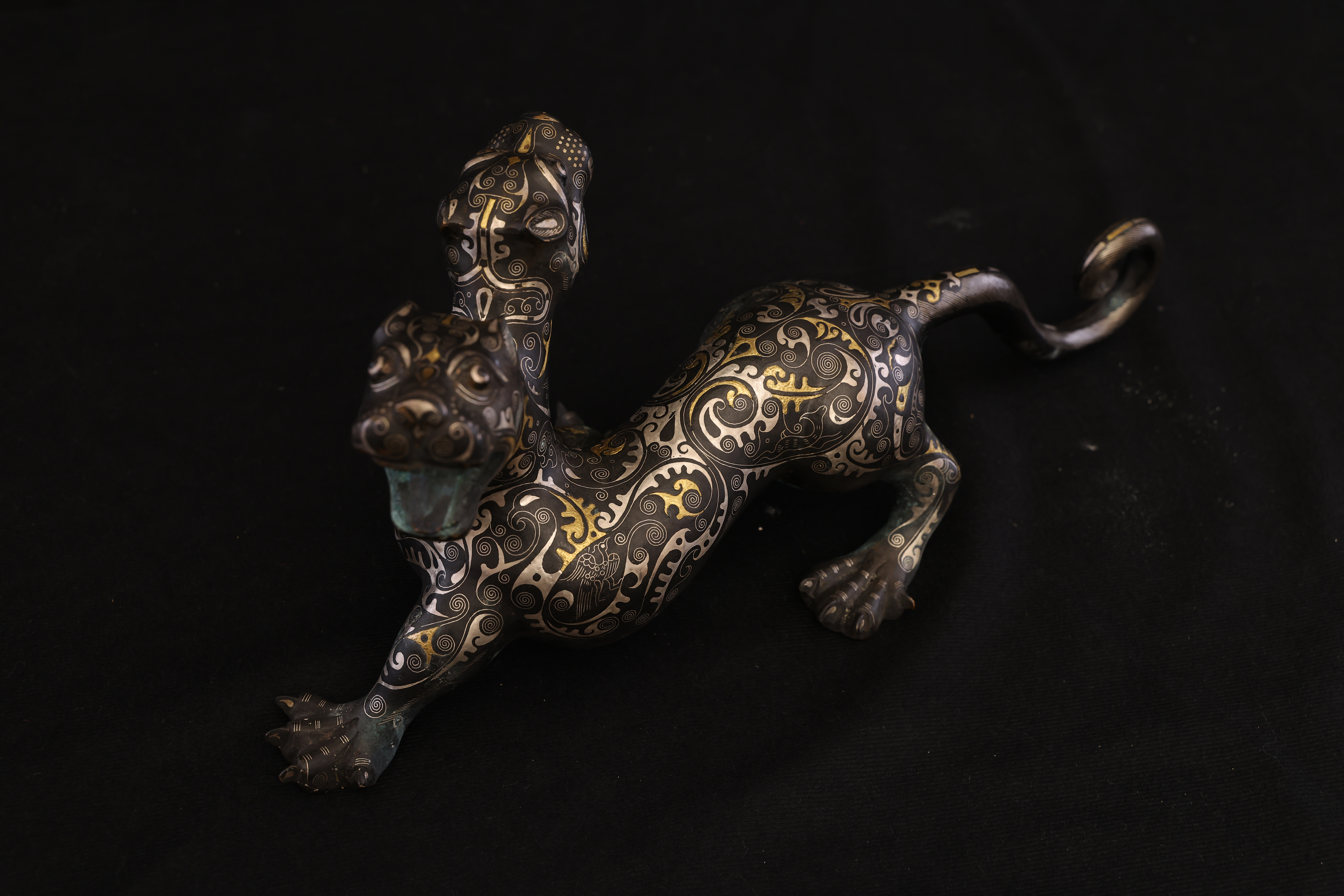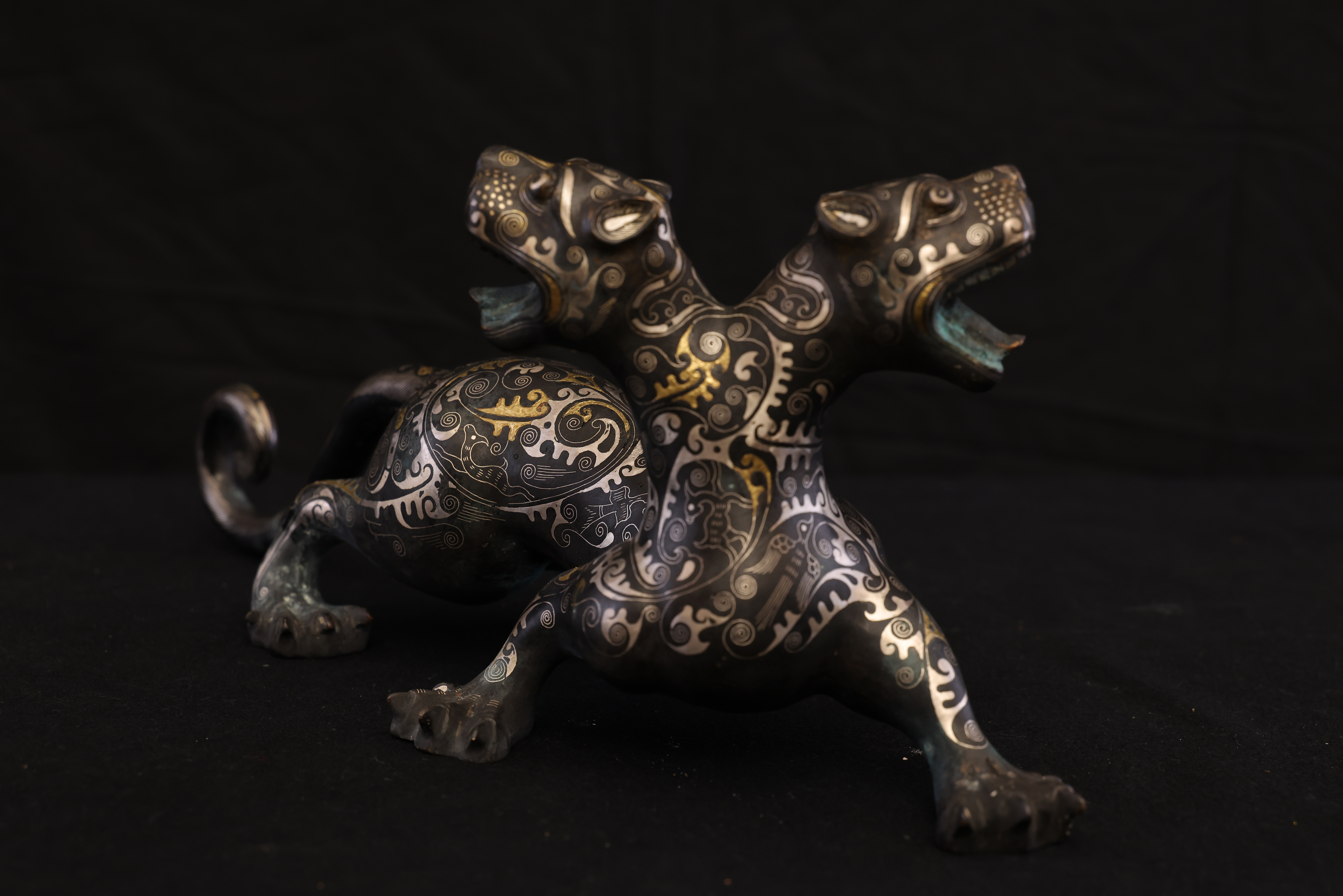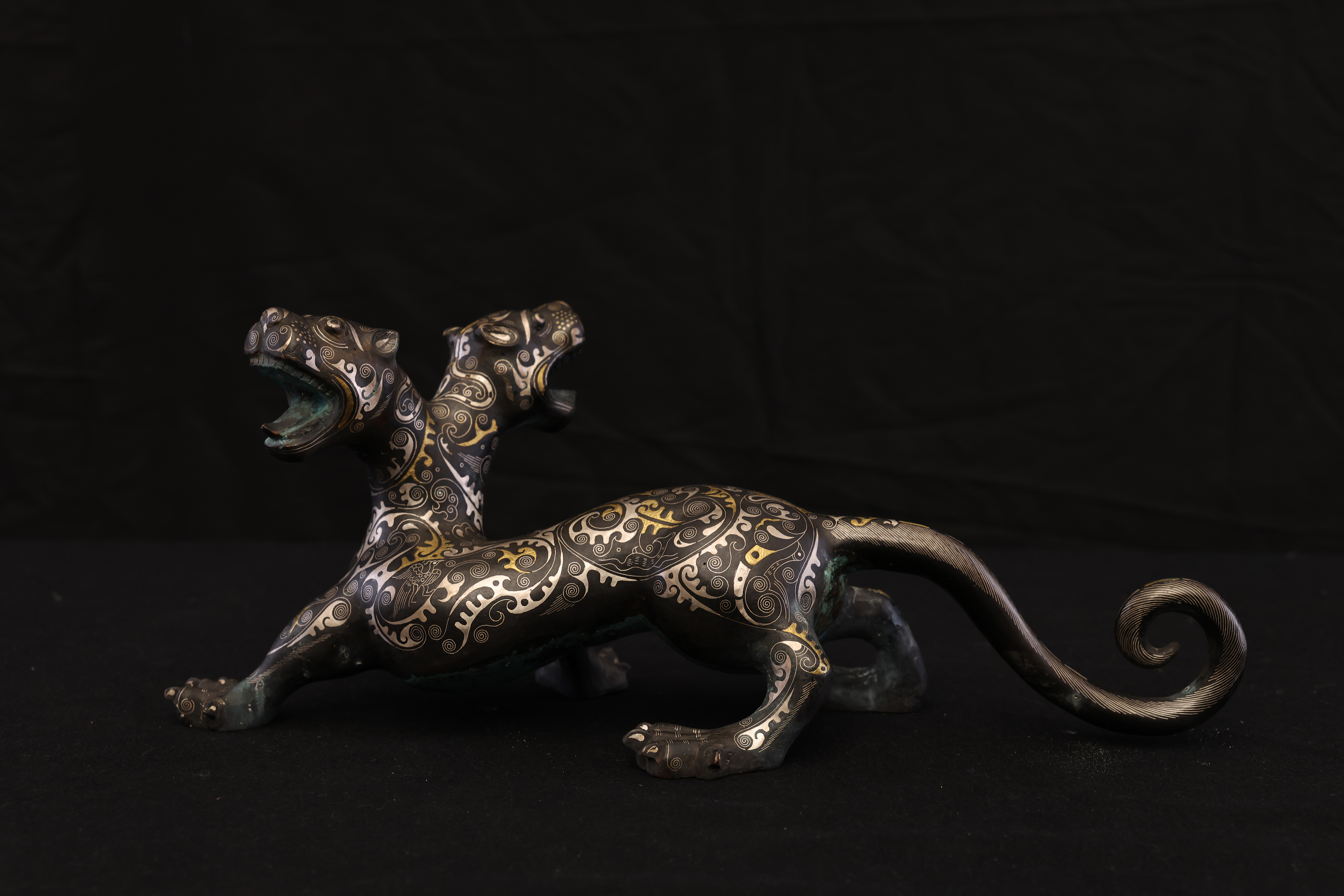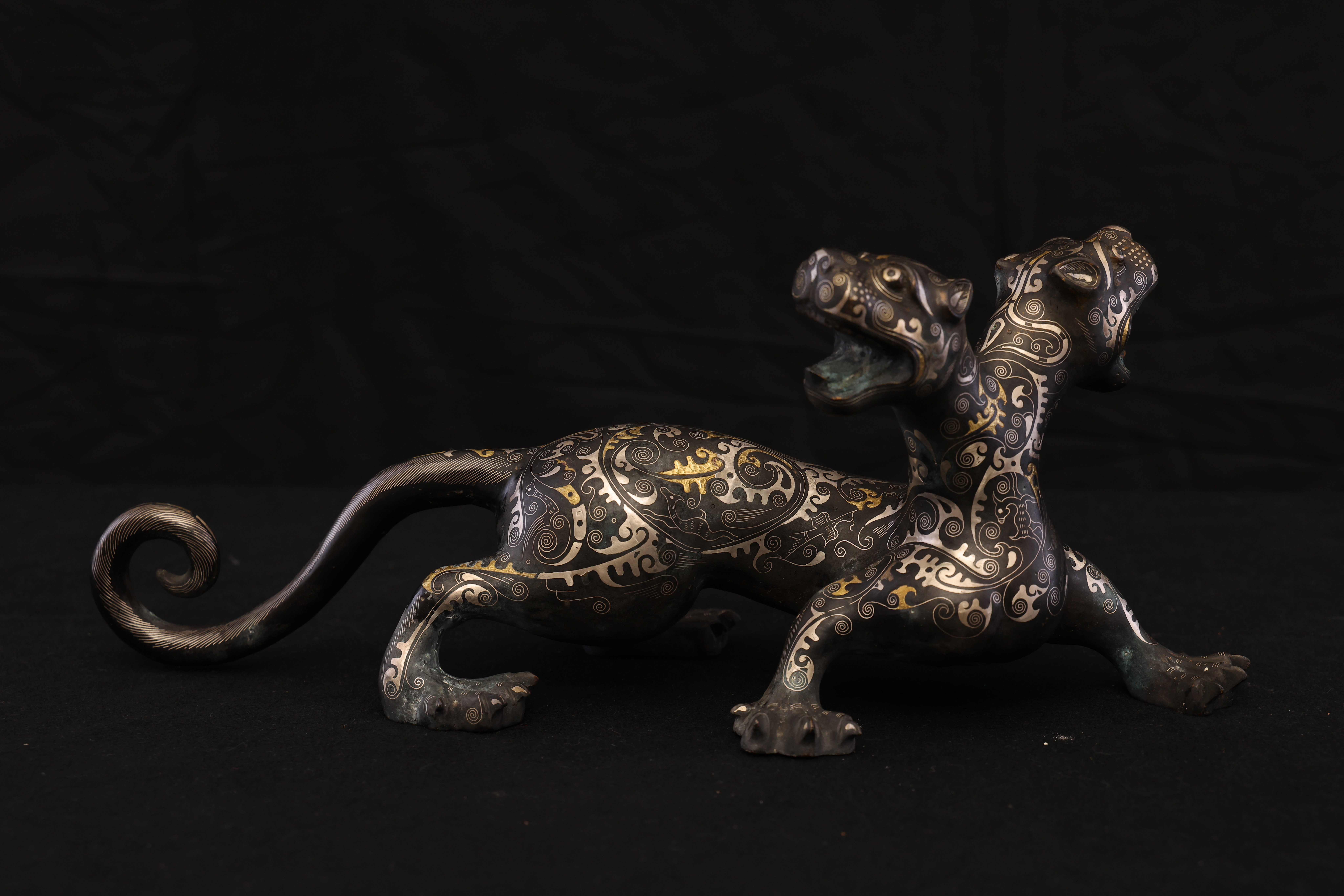 此件東周錯金銀雙頭虎,造型奇詭雄勁,寓意深遠,爲戰國時期青銅藝術與錯金銀工藝的巅峰代表。通體以青銅鑄成,虎身修長矯健,四肢騰摯有力,尾部上卷作旋,動勢宛若蓄勢待發。最爲獨特者在于其“雙首”之形——前後兩端皆爲虎首,壹張口咆哮,壹俯首凝視,形象威猛,意象奇幻,象征守護與威懾、陰陽對峙之力。器表以錯金銀工藝精飾,紋飾繁密而和諧。滿身布列細密雲雷、卷渦與夔龍紋,以金絲勾勒輪廓,以銀線填飾旋紋,層次分明,光影流轉之間金銀輝映。其裝飾布局對稱而富節奏感,金銀錯嵌線條如行雲流水,既表現出虎之筋骨之美,又顯匠師審美的理性秩序。此類錯金銀工藝爲東周貴族重器的代表技術,制作極爲繁複,須在青銅表面錾刻出紋路,再以金、銀絲嵌入並錘實抛光,方成其璀璨流光之效。雙頭虎的形制與圖騰性極強,或爲辟邪鎮墓之神獸,亦可能用于權力象征的陳設器。其“首尾呼應、陰陽相生”的造型寓意宇宙循環與生死不息的哲理。整體風格剛健而靈動,裝飾體系嚴謹而富變化,兼具力量與華麗的美學張力。