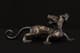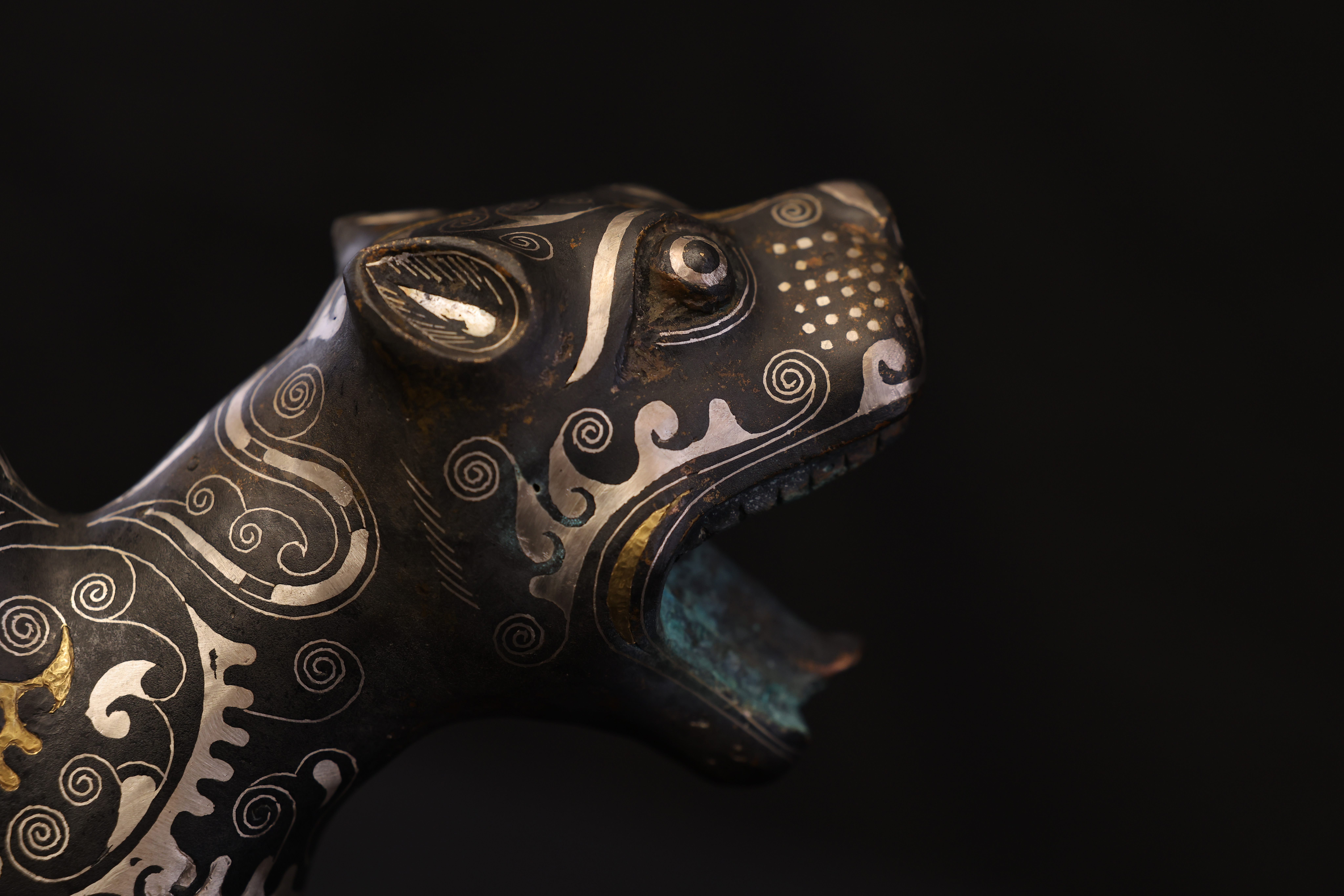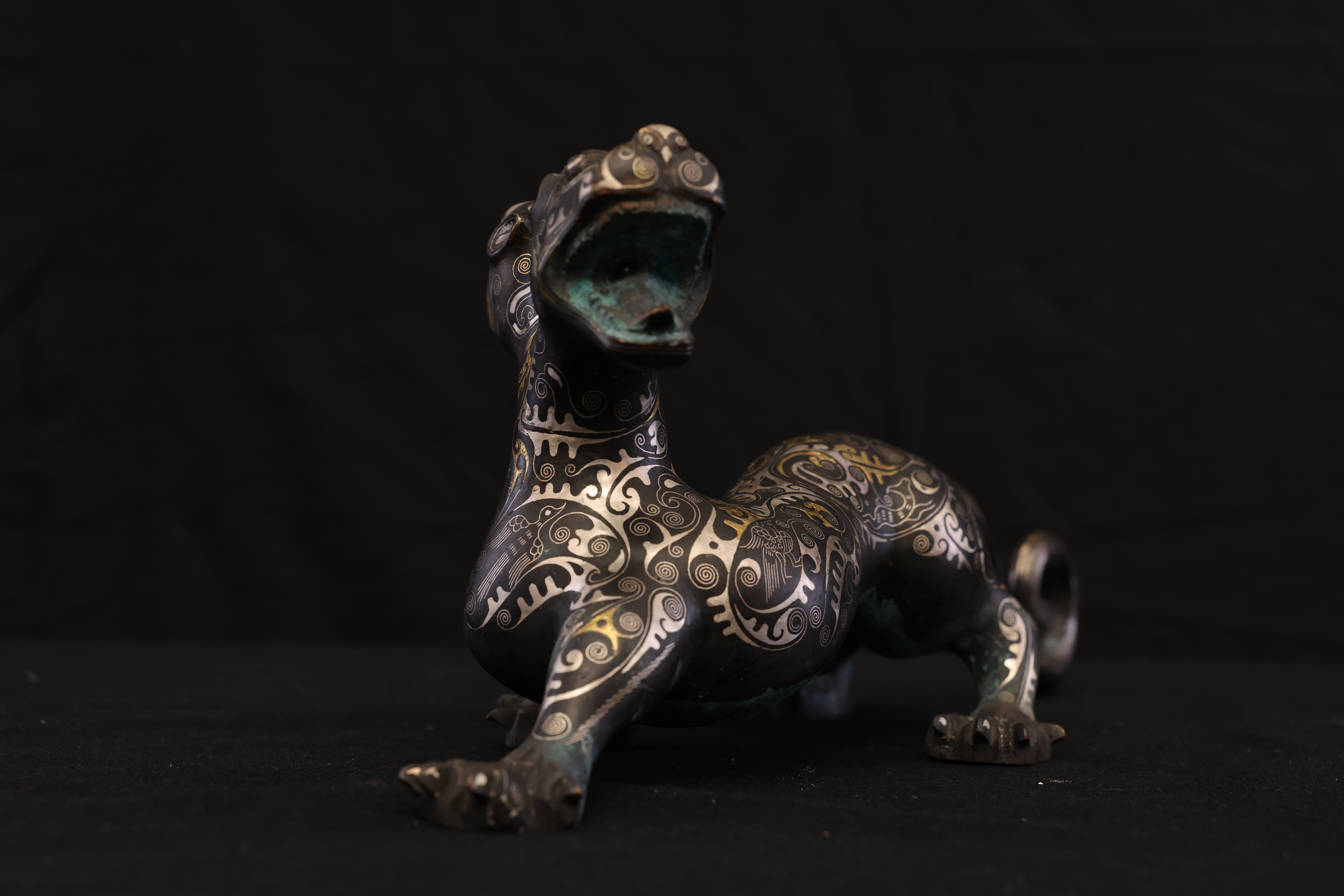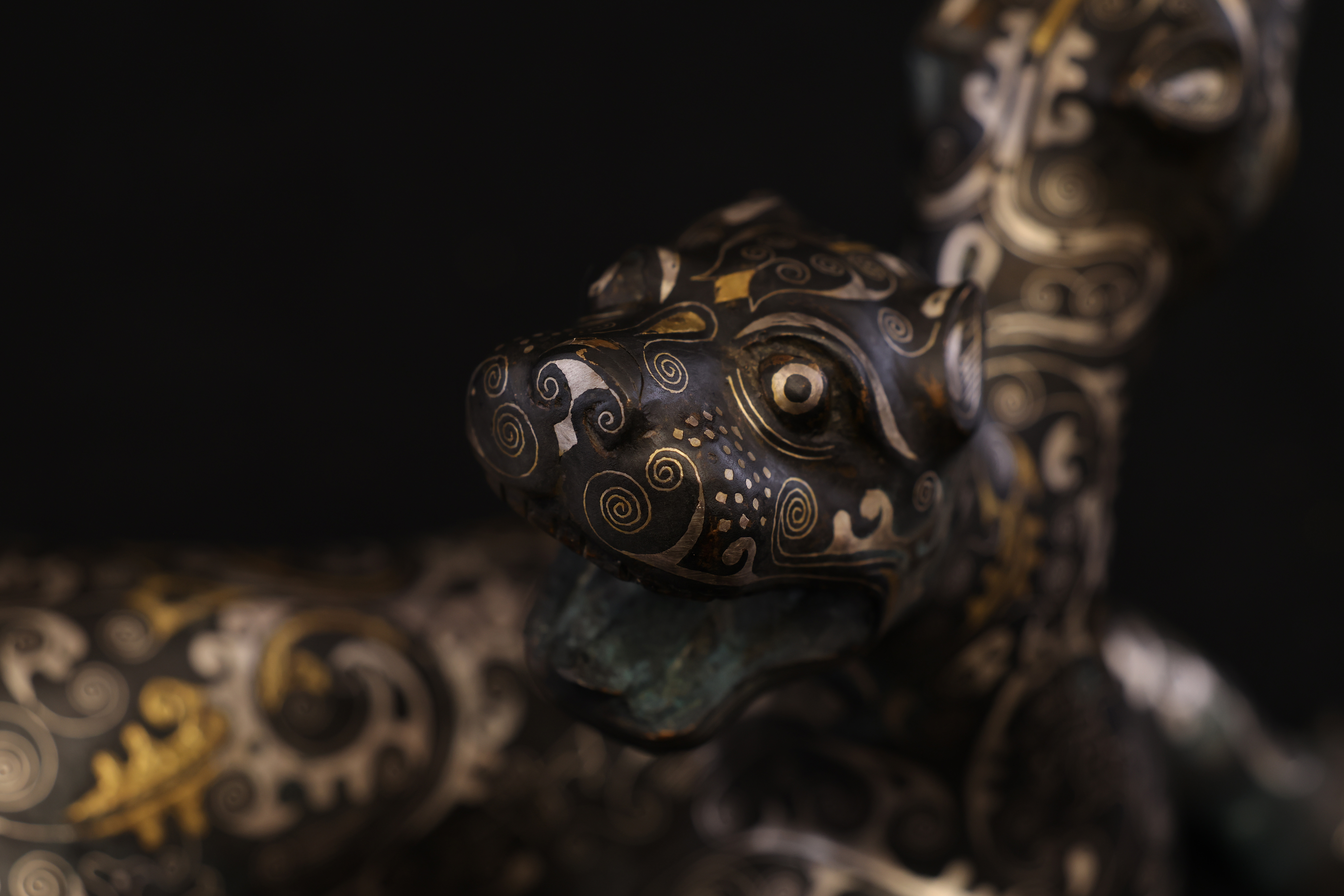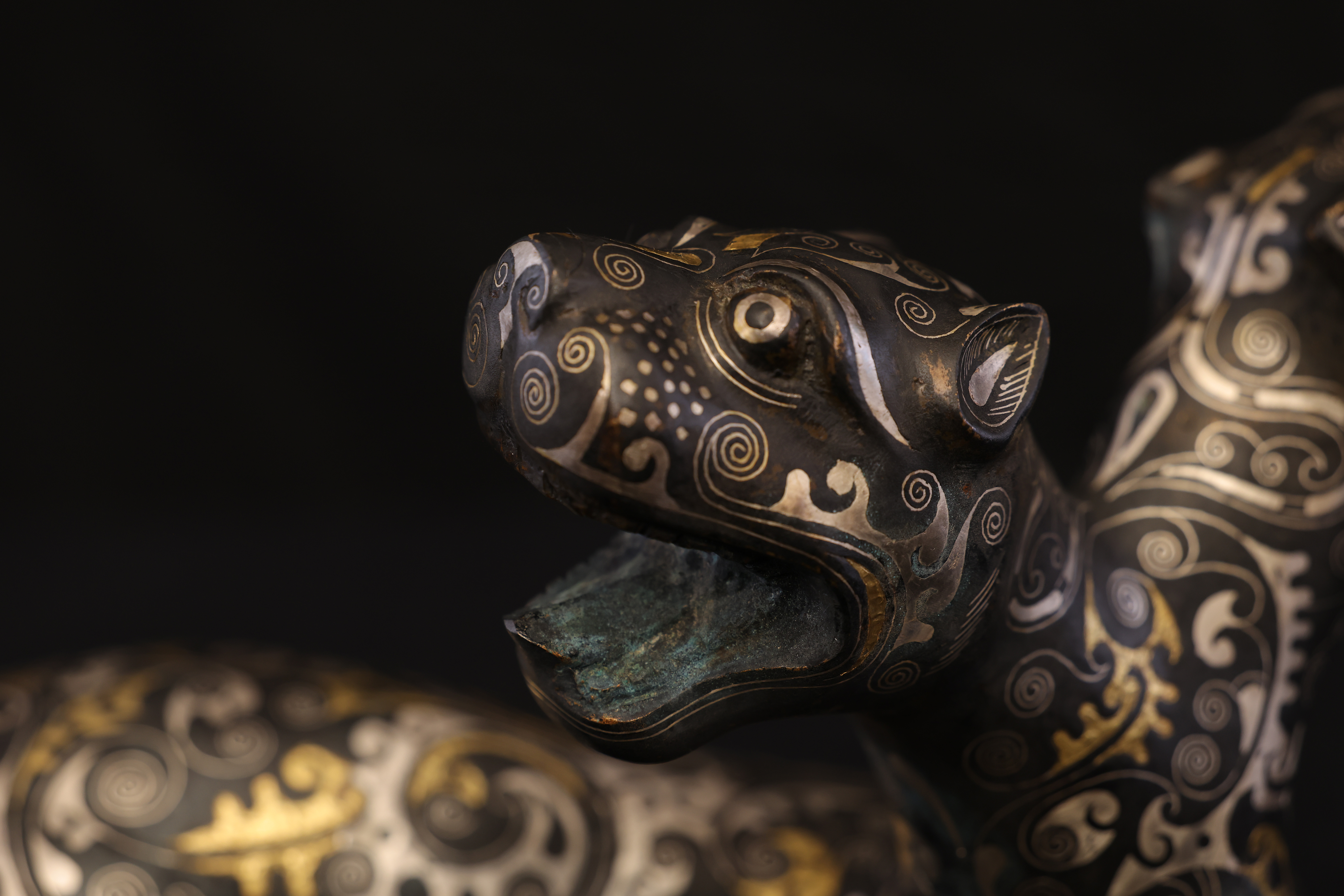 此件東周錯金銀雙頭虎,造型奇詭雄勁,寓意深遠,爲戰國時期青銅藝術與錯金銀工藝的巅峰代表。通體以青銅鑄成,虎身修長矯健,四肢騰摯有力,尾部上卷作旋,動勢宛若蓄勢待發。最爲獨特者在于其“雙首”之形——前後兩端皆爲虎首,壹張口咆哮,壹俯首凝視,形象威猛,意象奇幻,象征守護與威懾、陰陽對峙之力。器表以錯金銀工藝精飾,紋飾繁密而和諧。滿身布列細密雲雷、卷渦與夔龍紋,以金絲勾勒輪廓,以銀線填飾旋紋,層次分明,光影流轉之間金銀輝映。其裝飾布局對稱而富節奏感,金銀錯嵌線條如行雲流水,既表現出虎之筋骨之美,又顯匠師審美的理性秩序。此類錯金銀工藝爲東周貴族重器的代表技術,制作極爲繁複,須在青銅表面錾刻出紋路,再以金、銀絲嵌入並錘實抛光,方成其璀璨流光之效。雙頭虎的形制與圖騰性極強,或爲辟邪鎮墓之神獸,亦可能用于權力象征的陳設器。其“首尾呼應、陰陽相生”的造型寓意宇宙循環與生死不息的哲理。整體風格剛健而靈動,裝飾體系嚴謹而富變化,兼具力量與華麗的美學張力。