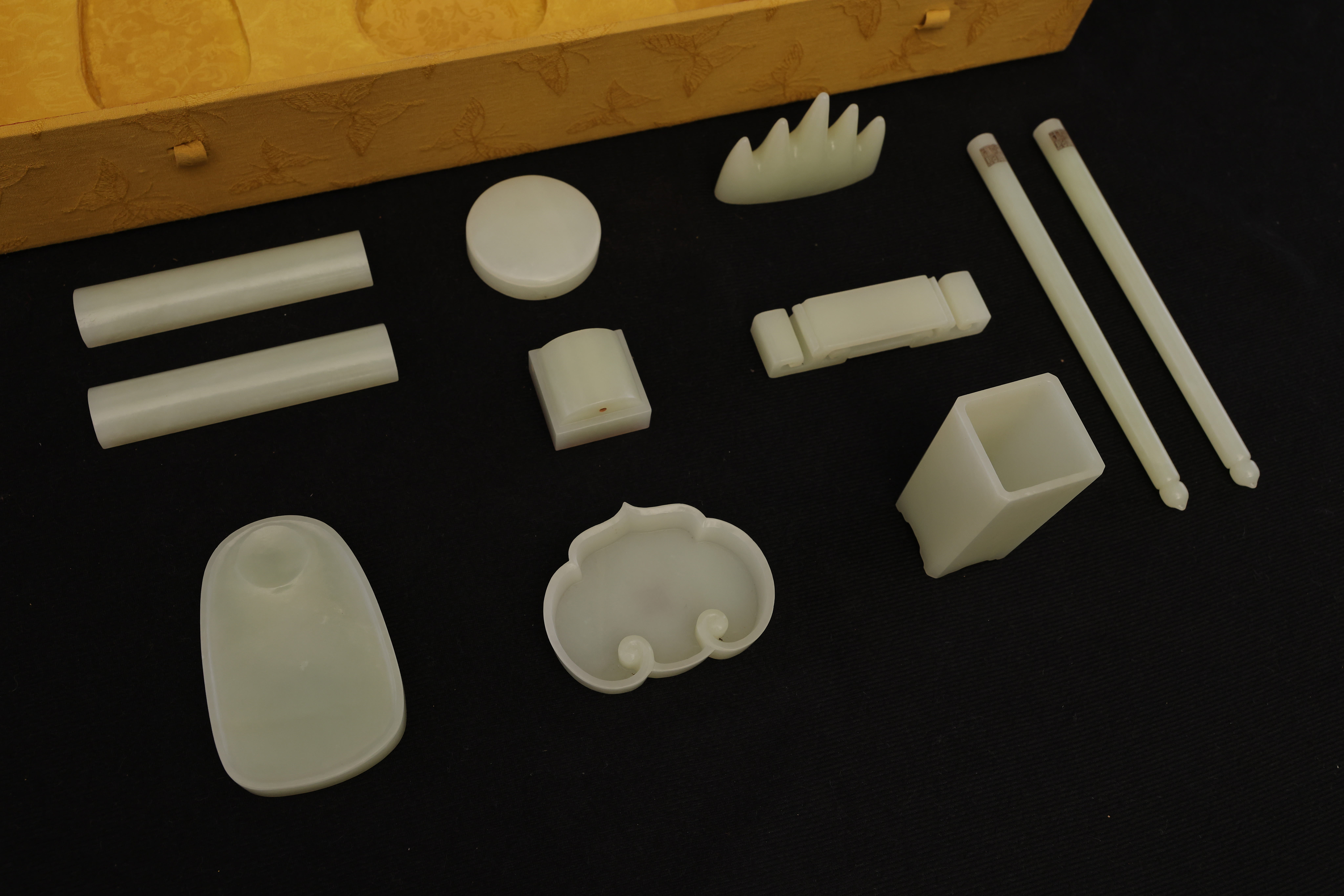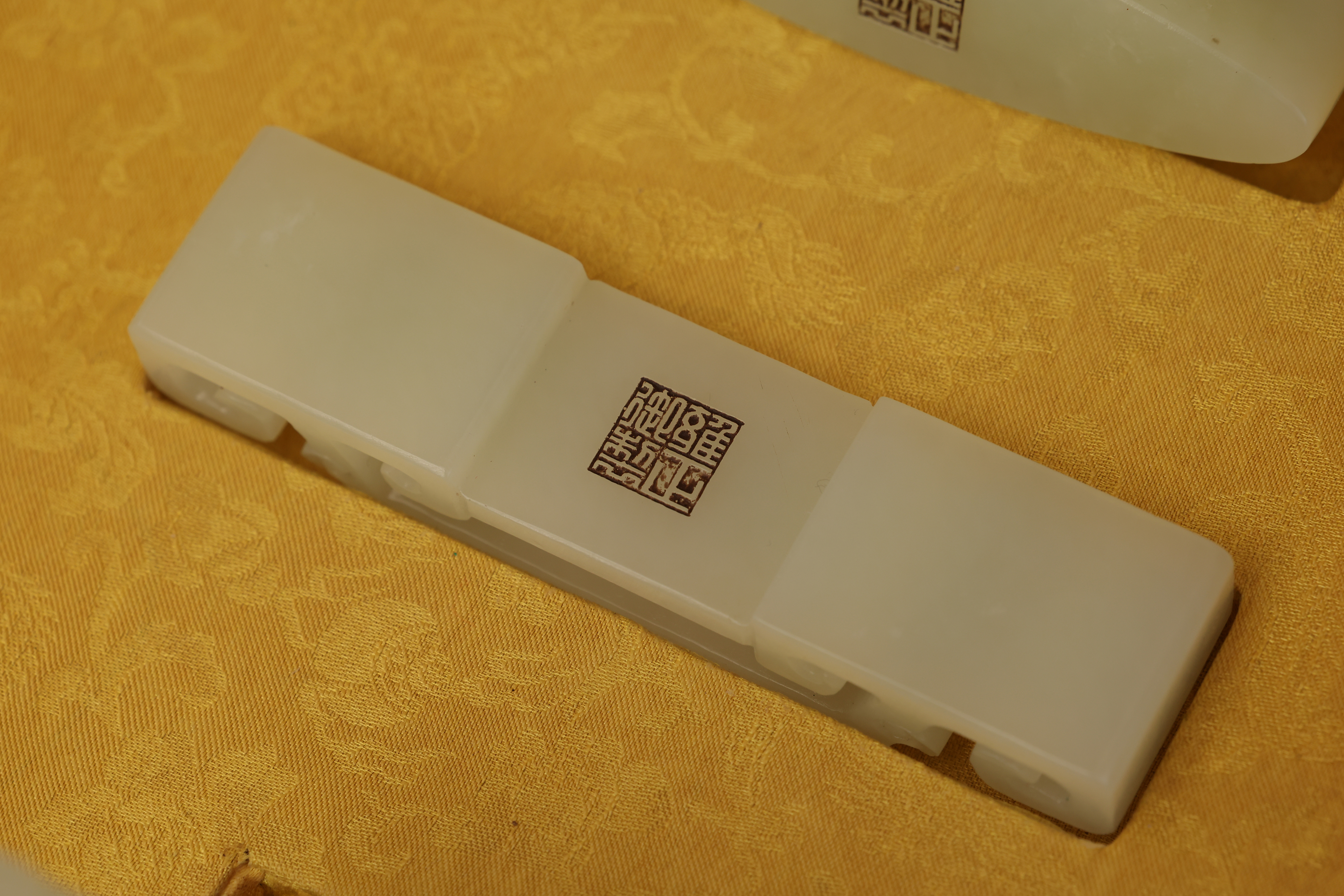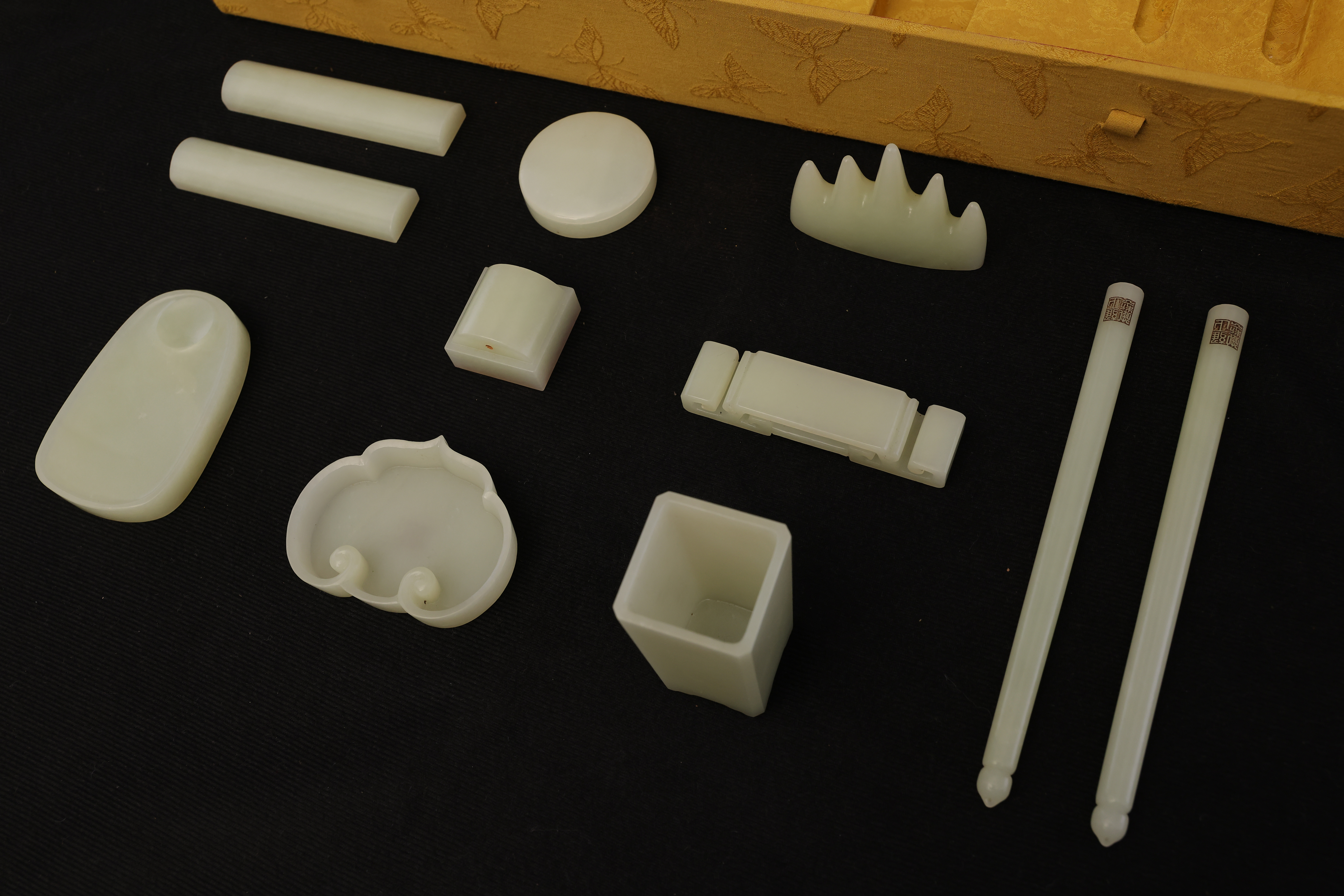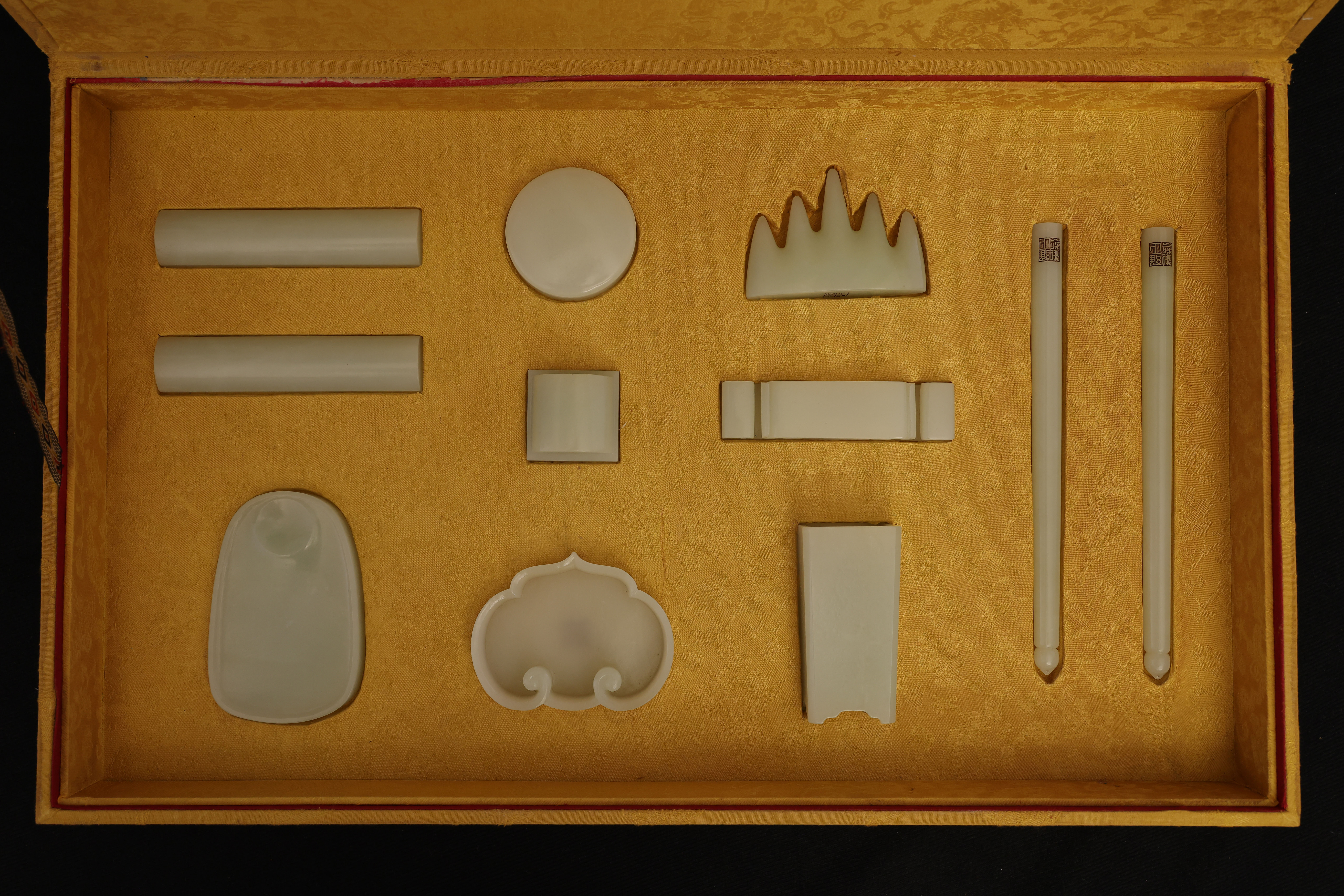 全器共成套制十件,包括筆杆、筆筒、鎮紙、印章、筆洗、水盛、印盒、鎮尺、圭尺等,造型簡潔,比例精准,線條圓轉流暢,盡顯“靜、簡、淨、雅”的雍正宮廷風格。玉器打磨極爲精細,棱角分明而無鋒芒,表面抛光如鏡,隱隱透出古玉的溫潤靈性。其中禦玺壹方,陰刻篆文“雍正禦筆之寶”,朱文方整,筆意勁峻而清朗,印面規整,邊欄平正,堪稱宮廷玉玺中之法度典範。此類文房用具,不僅爲帝王書畫所用,更寓“文以載道”“玉以比德”之旨,象征天子之文治風範與君德之光。此套文房器融合宮廷審美與工藝巅峰,溫潤之玉與皇家氣象相映成輝,展現出雍正帝崇尚簡靜、追求理治的精神風貌,是清代禦制文房體系中極具代表性的傳世之作。