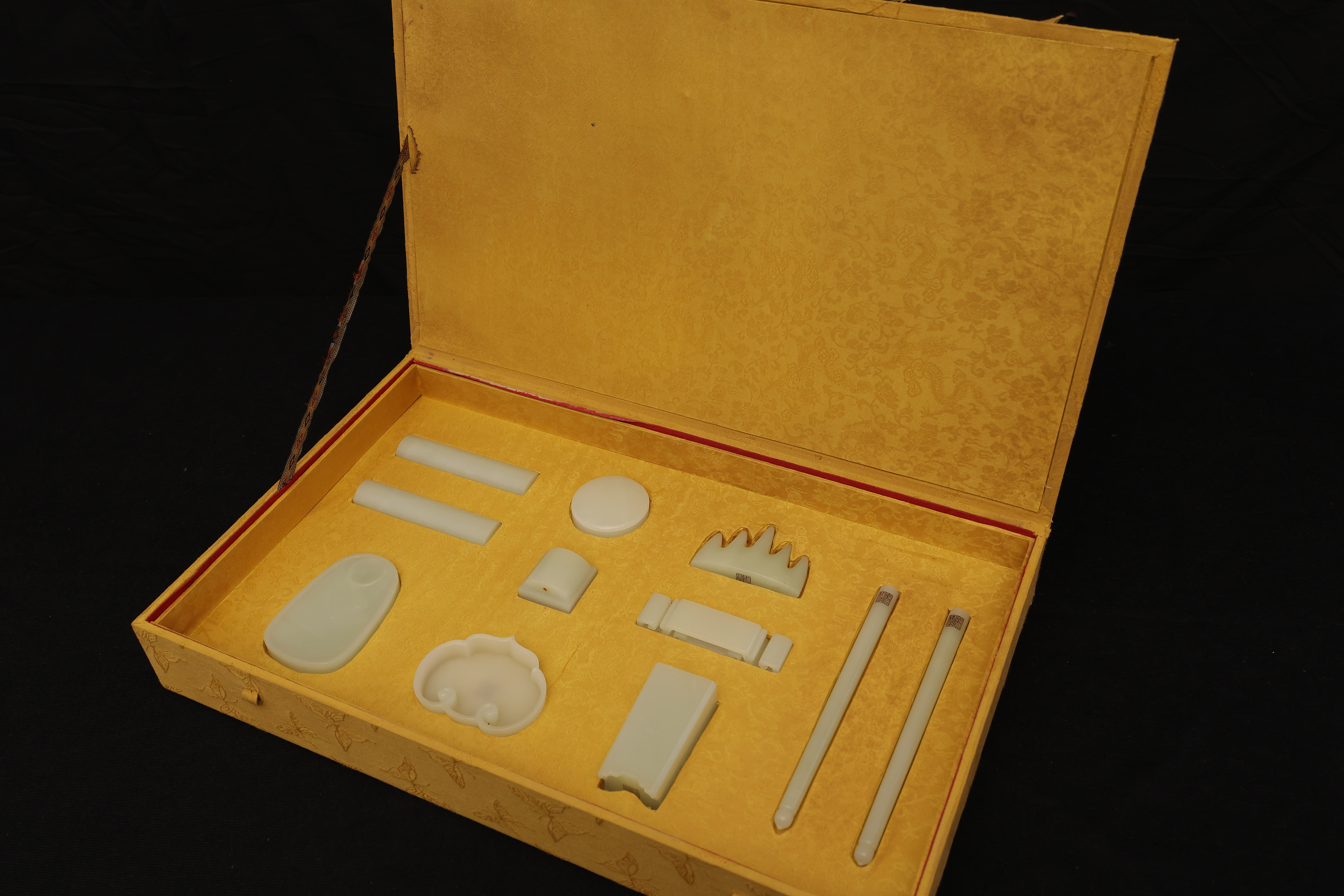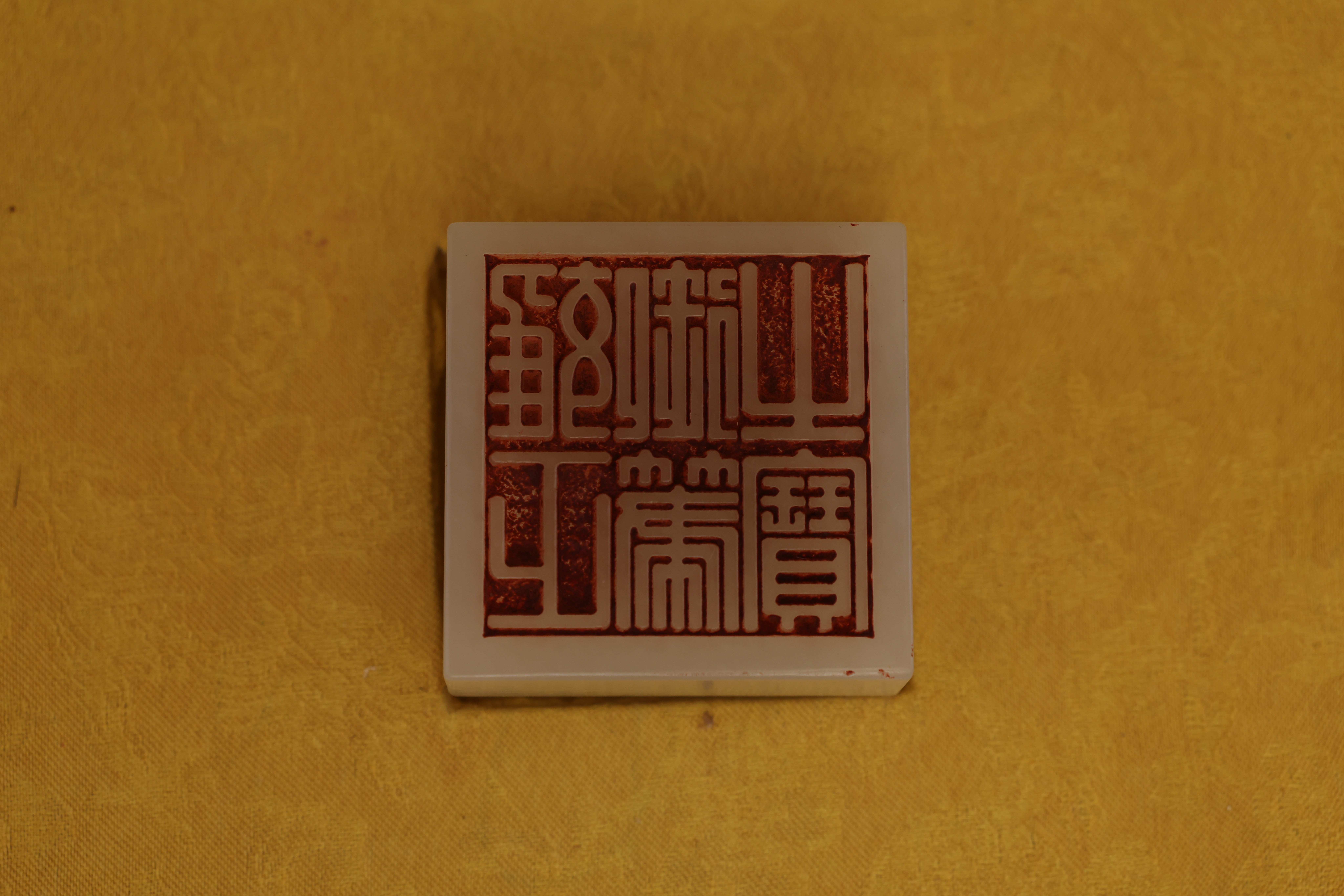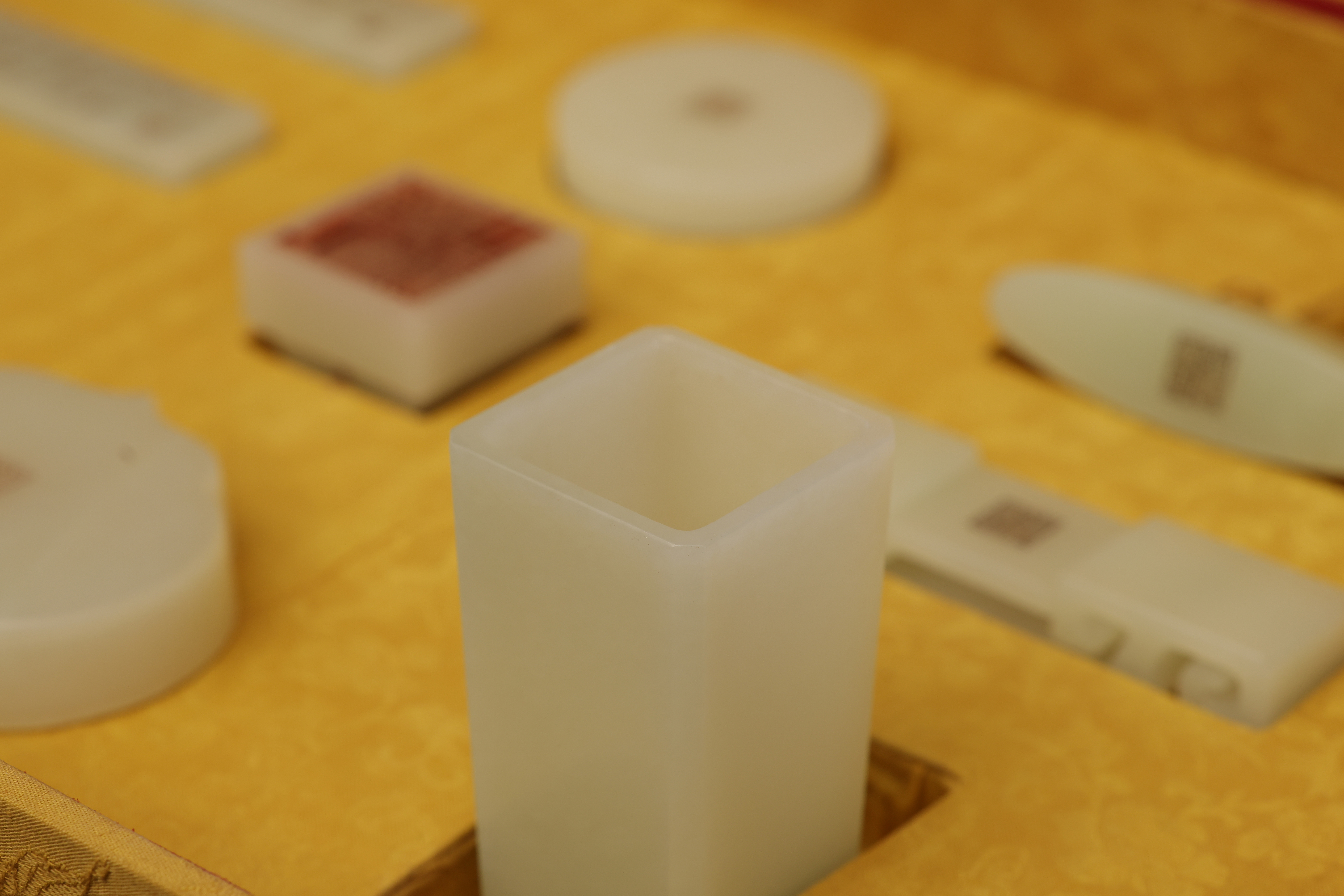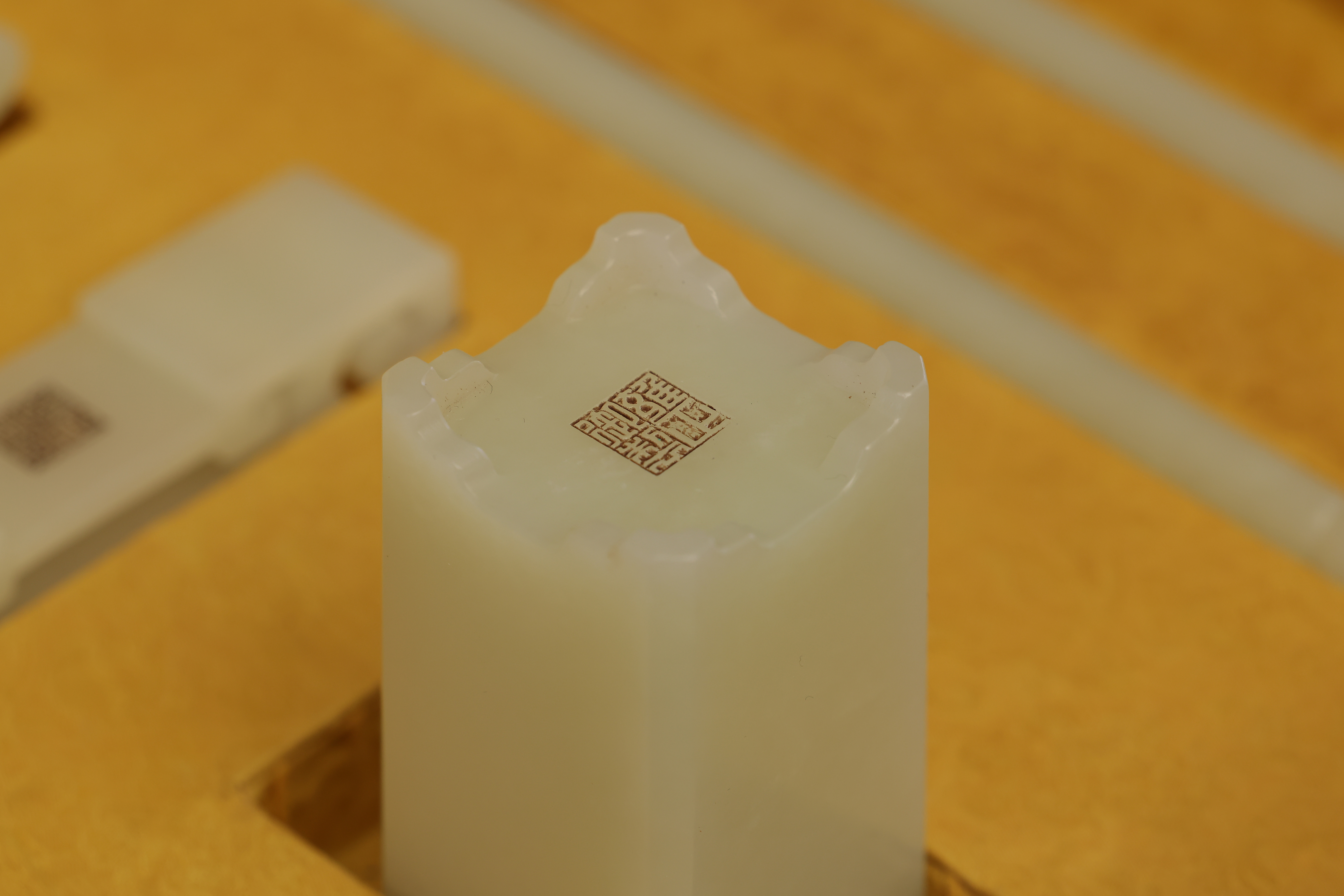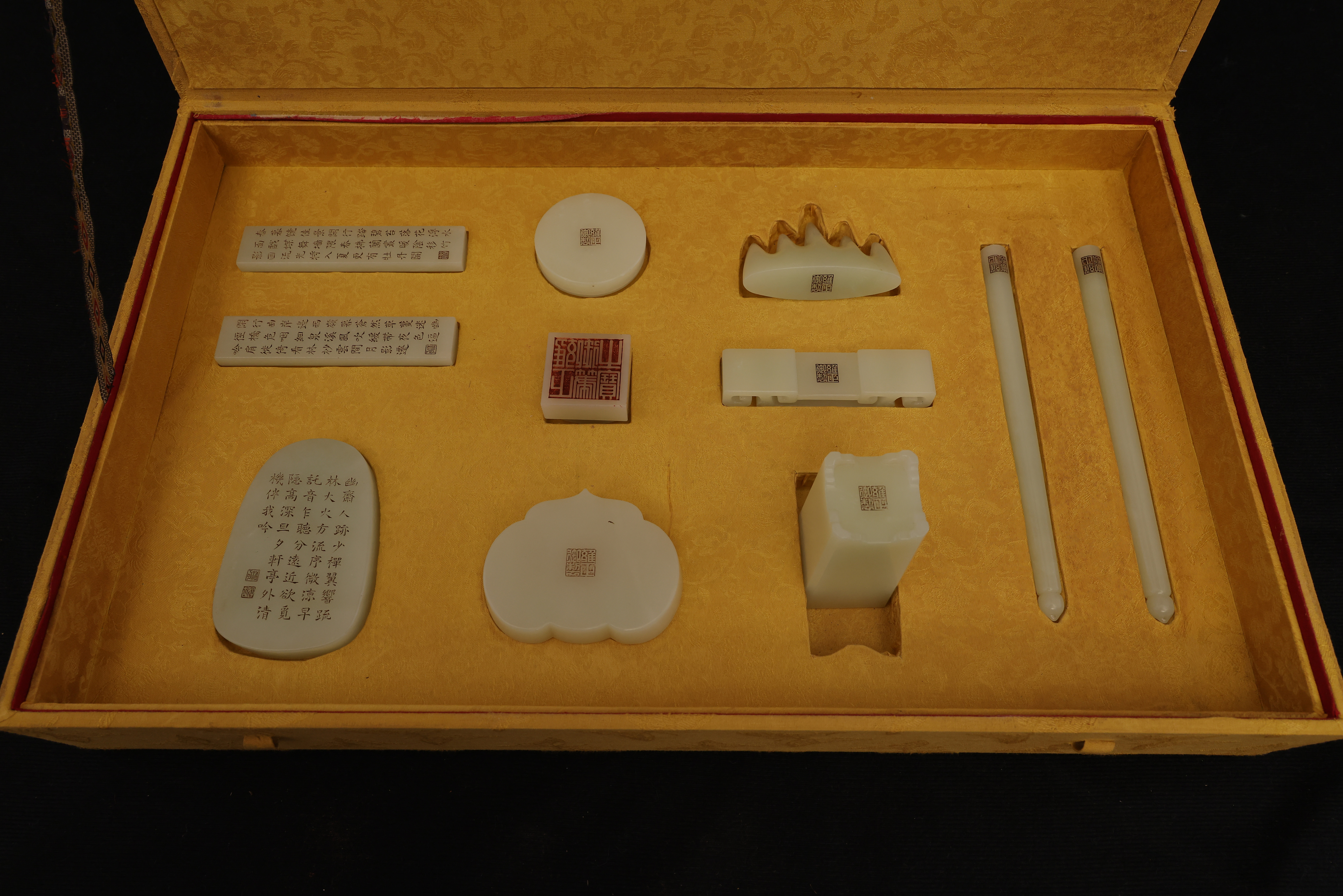全器共成套制十件,包括筆杆、筆筒、鎮紙、印章、筆洗、水盛、印盒、鎮尺、圭尺等,造型簡潔,比例精准,線條圓轉流暢,盡顯“靜、簡、淨、雅”的雍正宮廷風格。玉器打磨極爲精細,棱角分明而無鋒芒,表面抛光如鏡,隱隱透出古玉的溫潤靈性。其中禦玺壹方,陰刻篆文“雍正禦筆之寶”,朱文方整,筆意勁峻而清朗,印面規整,邊欄平正,堪稱宮廷玉玺中之法度典範。此類文房用具,不僅爲帝王書畫所用,更寓“文以載道”“玉以比德”之旨,象征天子之文治風範與君德之光。此套文房器融合宮廷審美與工藝巅峰,溫潤之玉與皇家氣象相映成輝,展現出雍正帝崇尚簡靜、追求理治的精神風貌,是清代禦制文房體系中極具代表性的傳世之作。