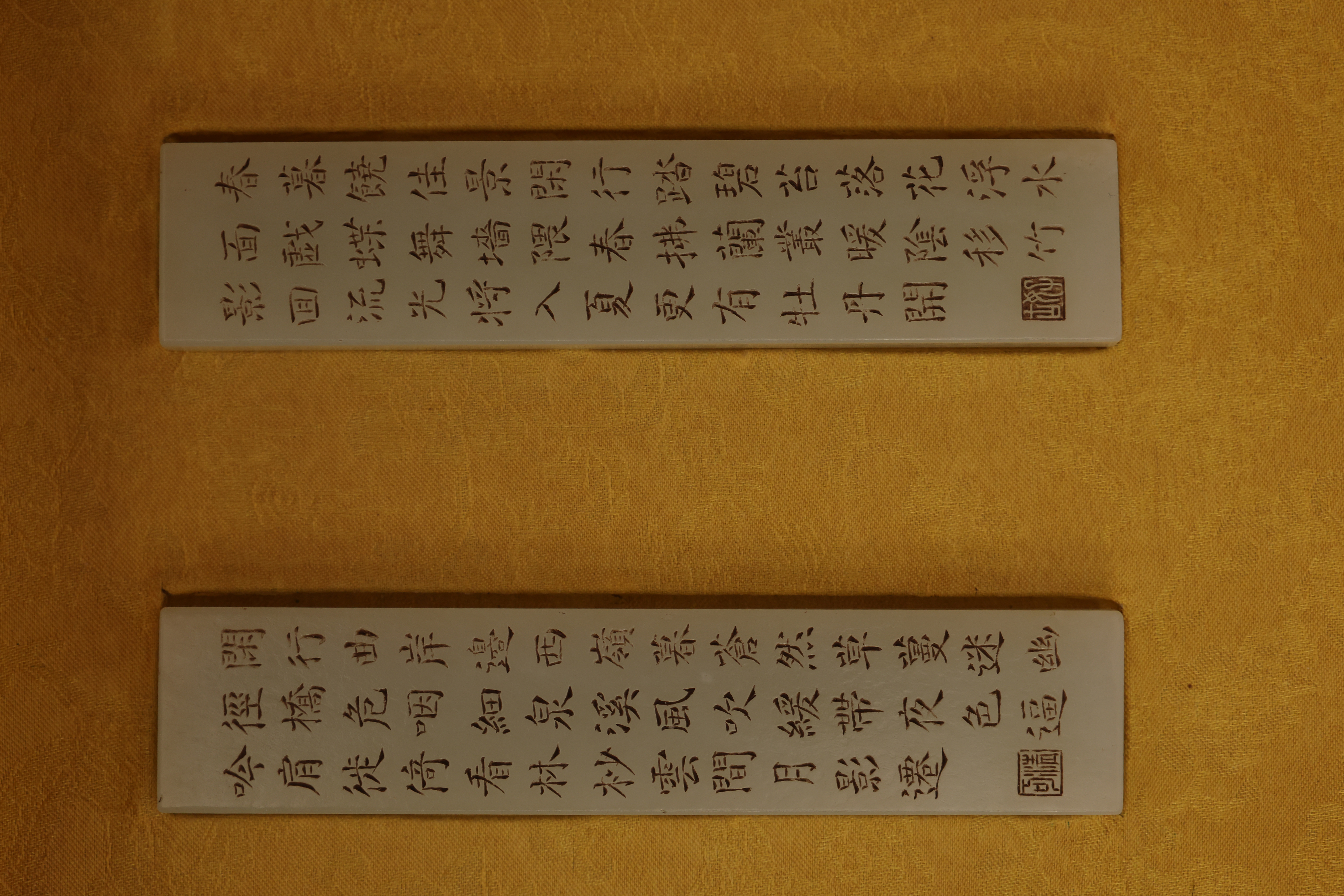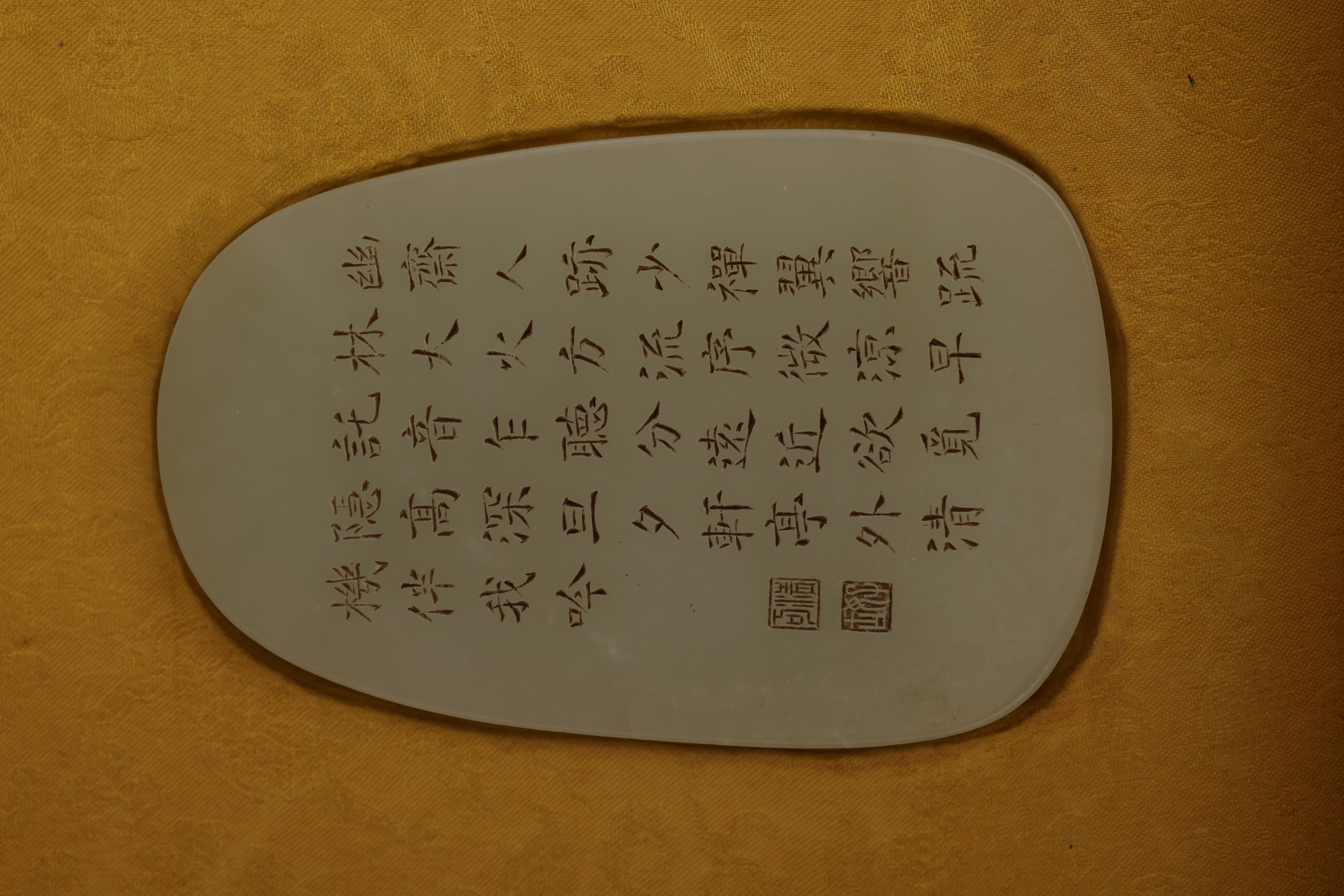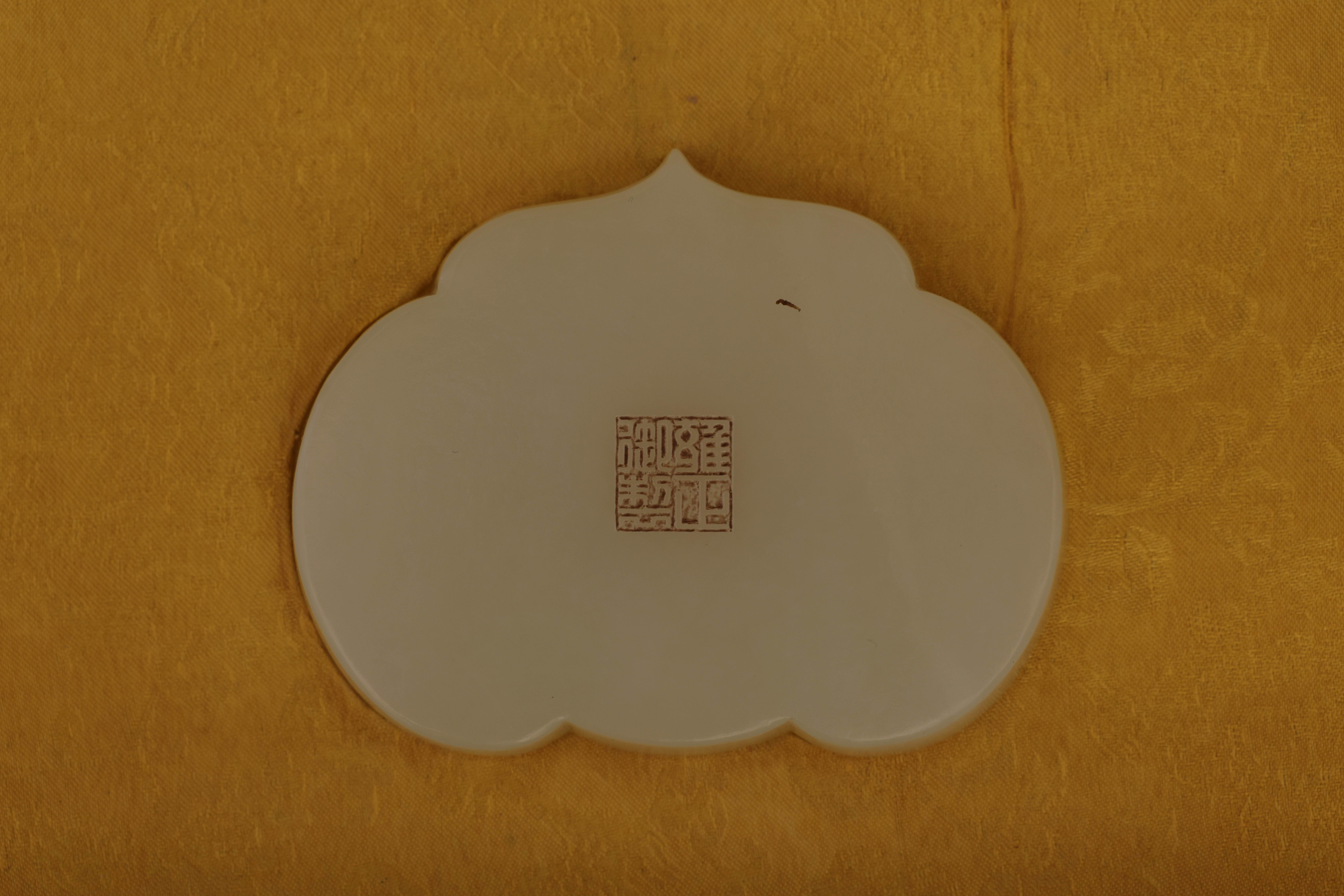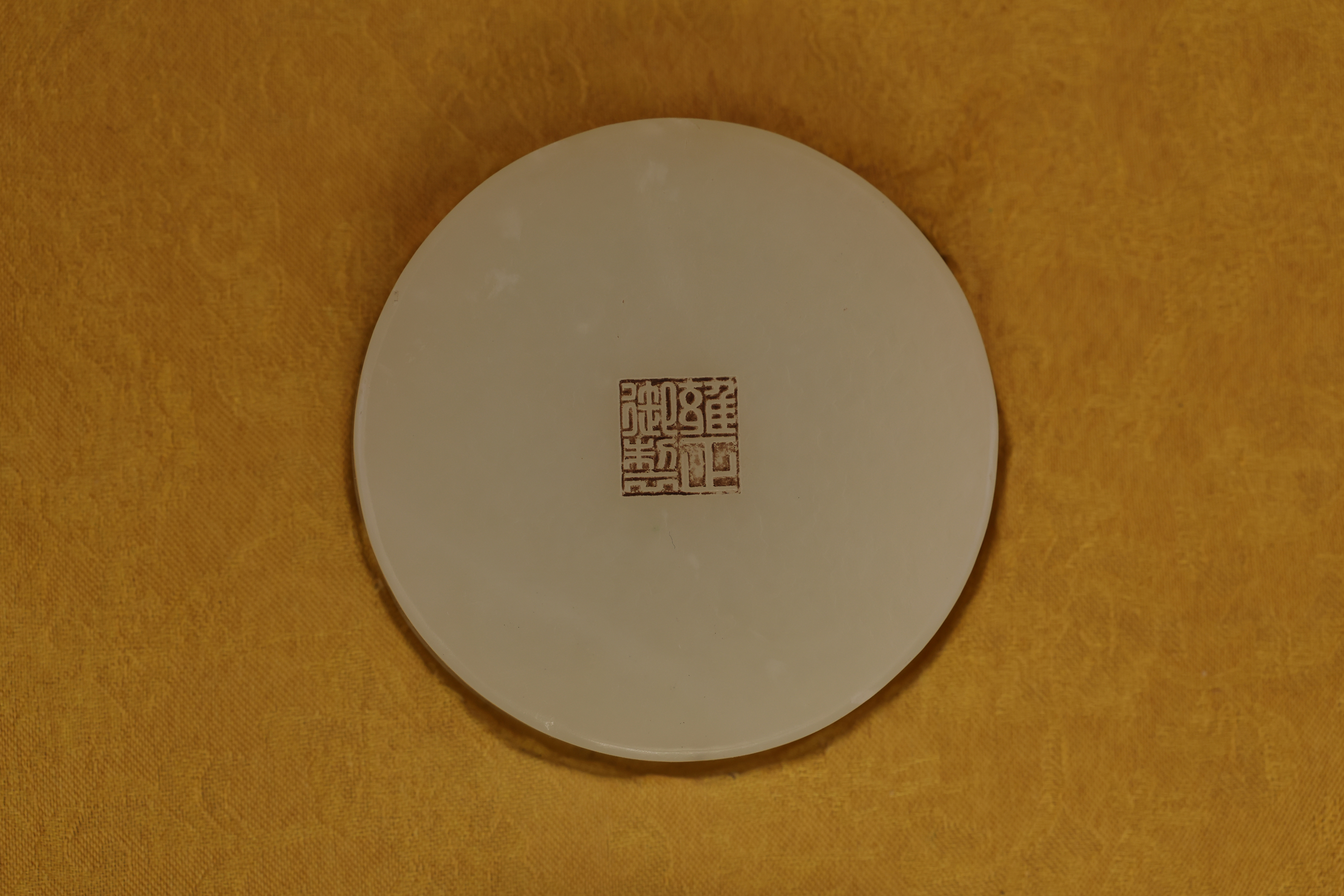 全器共成套制十件,包括筆杆、筆筒、鎮紙、印章、筆洗、水盛、印盒、鎮尺、圭尺等,造型簡潔,比例精准,線條圓轉流暢,盡顯“靜、簡、淨、雅”的雍正宮廷風格。玉器打磨極爲精細,棱角分明而無鋒芒,表面抛光如鏡,隱隱透出古玉的溫潤靈性。其中禦玺壹方,陰刻篆文“雍正禦筆之寶”,朱文方整,筆意勁峻而清朗,印面規整,邊欄平正,堪稱宮廷玉玺中之法度典範。此類文房用具,不僅爲帝王書畫所用,更寓“文以載道”“玉以比德”之旨,象征天子之文治風範與君德之光。此套文房器融合宮廷審美與工藝巅峰,溫潤之玉與皇家氣象相映成輝,展現出雍正帝崇尚簡靜、追求理治的精神風貌,是清代禦制文房體系中極具代表性的傳世之作。