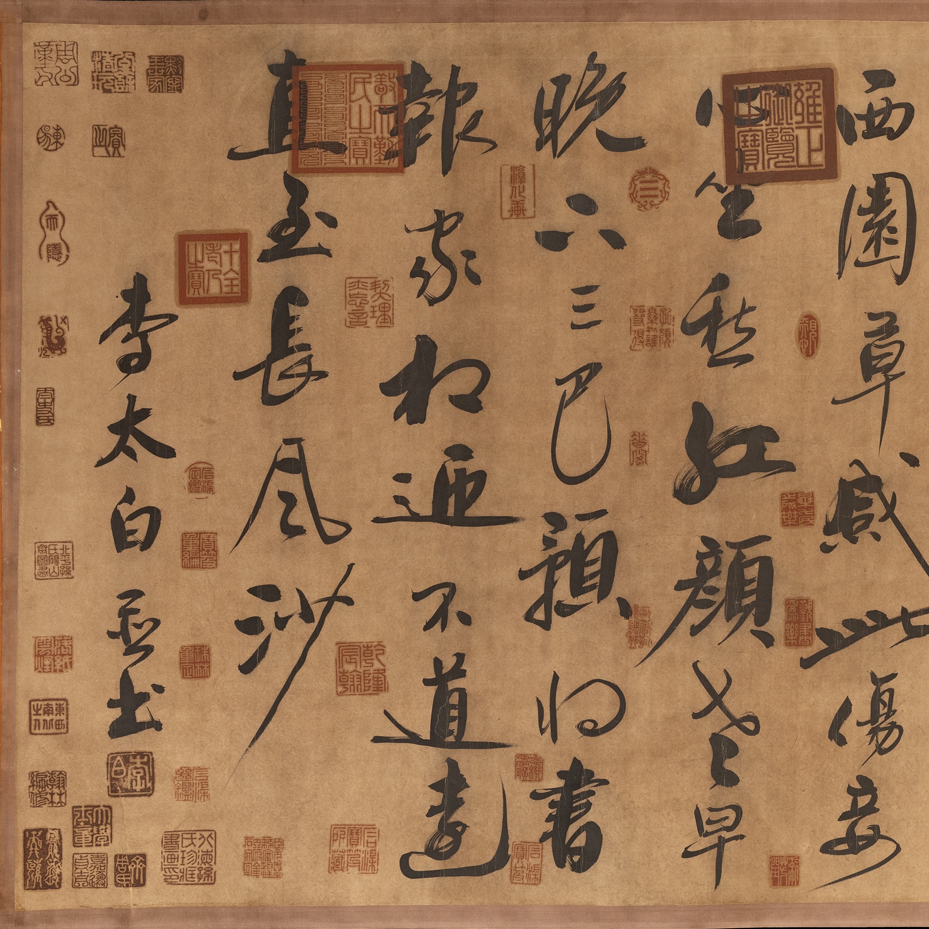 Chang Gan Xing · Qi Yi, handscroll on silk, ink brush, cursive script (caoshu), five-character poem, signed Li Taibai bishu. Total 160 characters. The calligraphy is vigorous, bold, and free-flowing, with uneven rhythm and natural vitality. The title is precise and compact, while the body flows gracefully, showing tension and release in brushwork. Viewing the scroll, one can sense the character of the poet himself: elegant, bold, and transcendent. The opening includes Qianlong’s imperial inscription “Guan Jue Gujin,” praising the work, while the end carries Huizong’s inscription “Hao Zong Piaoyi,” accurately characterizing its style. The scroll features 109 collector’s seals spanning emperors, nobles, and literati; Qianlong’s seals alone total over 70. This handscroll’s provenance is exceptionally well-documented and historically rare.