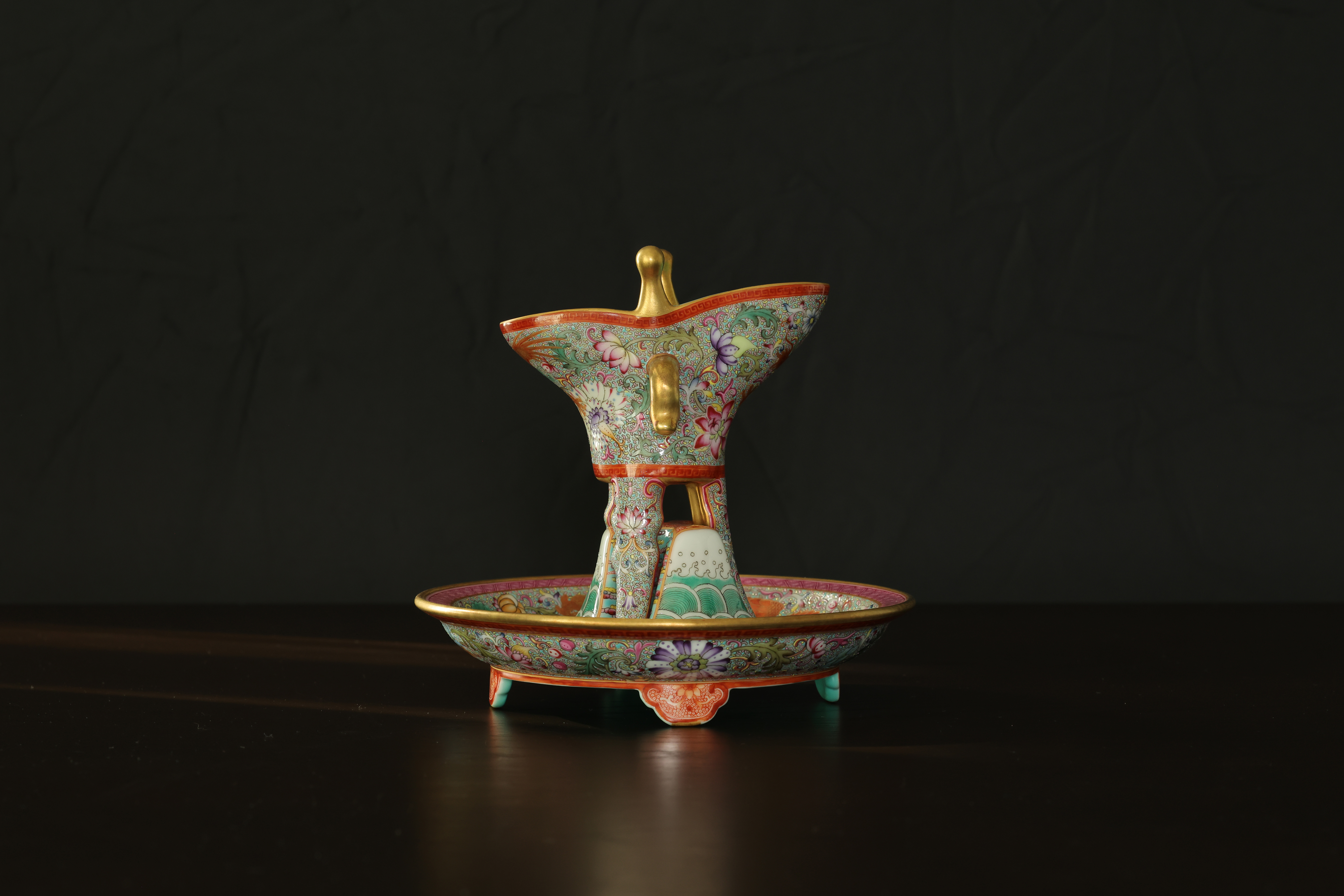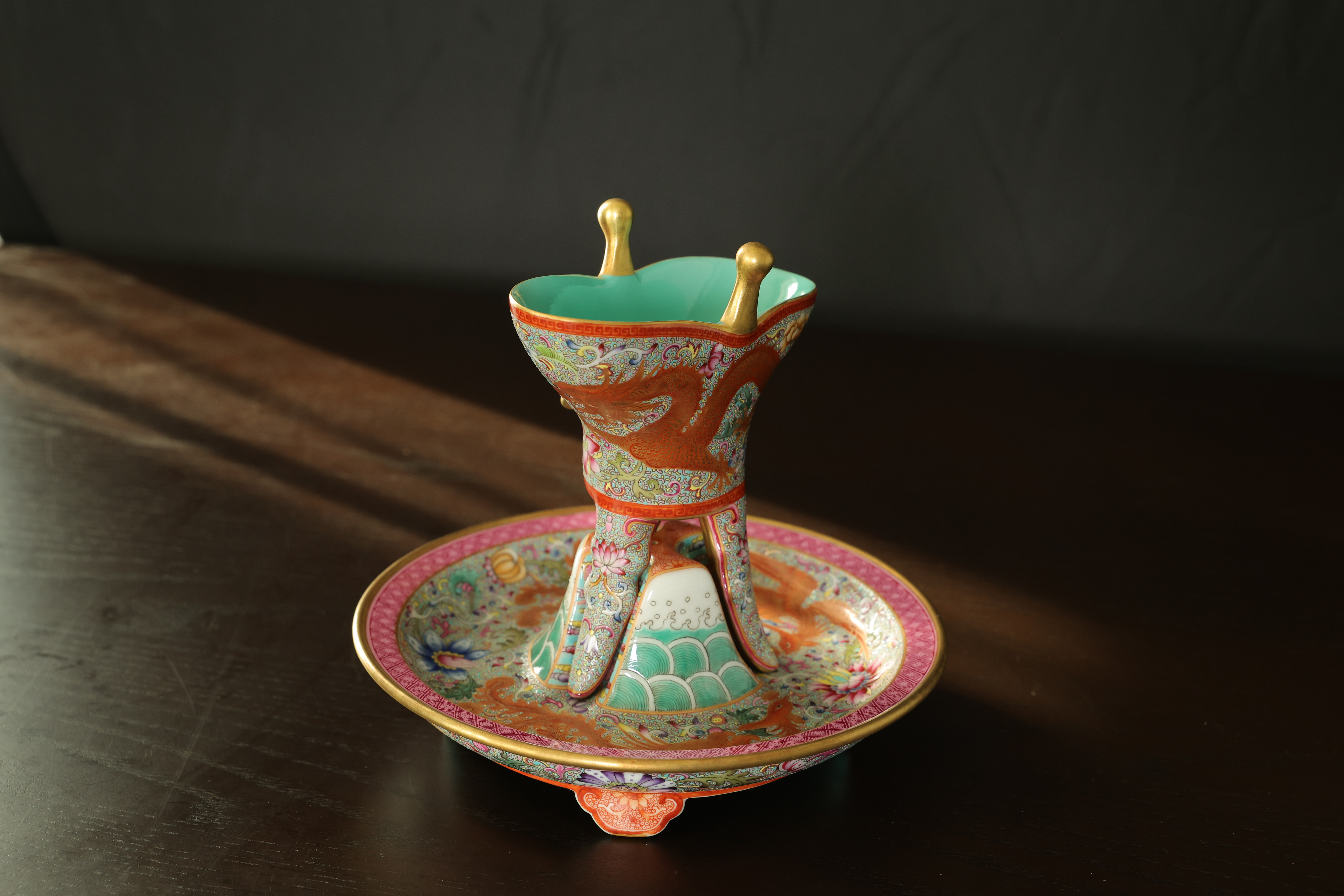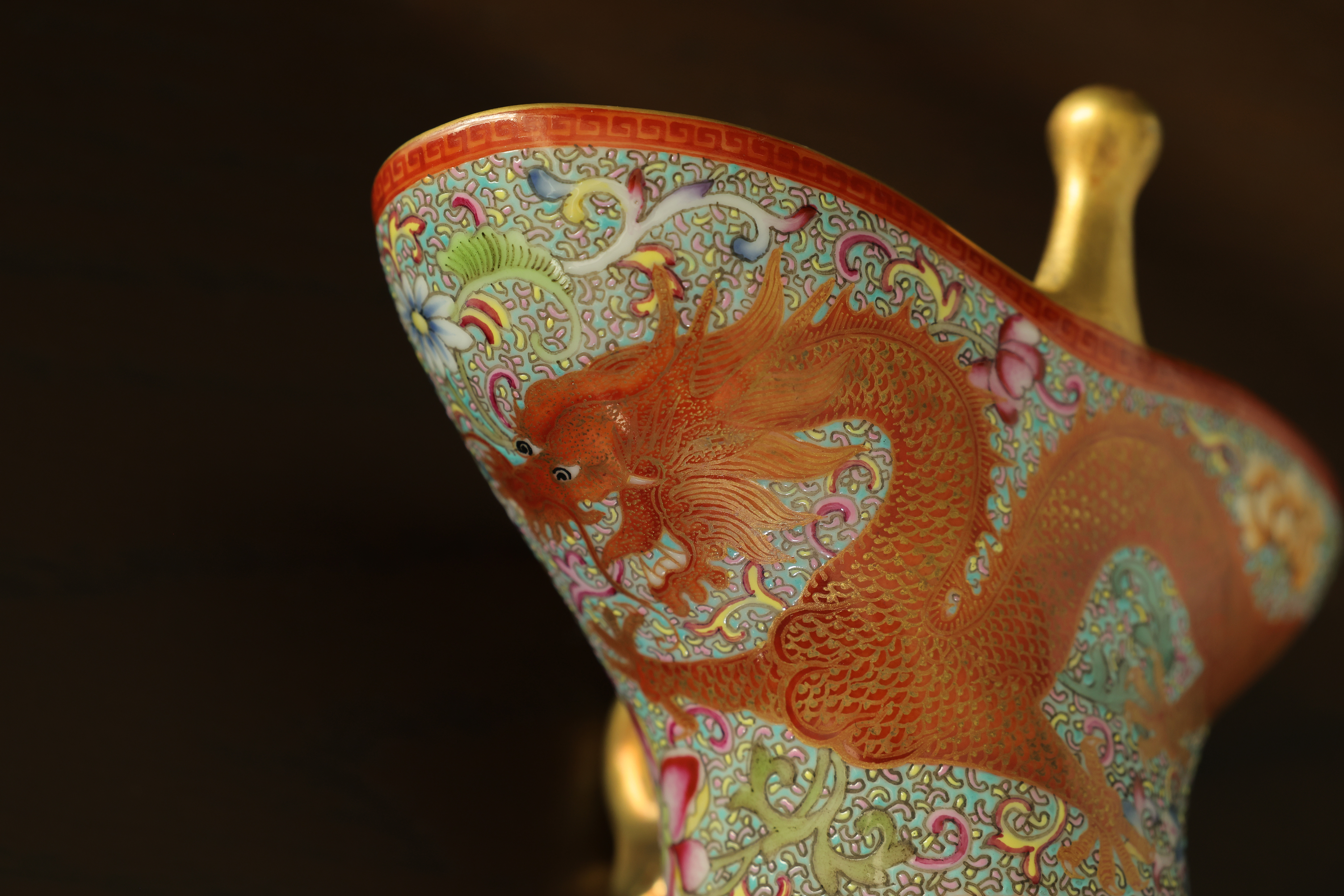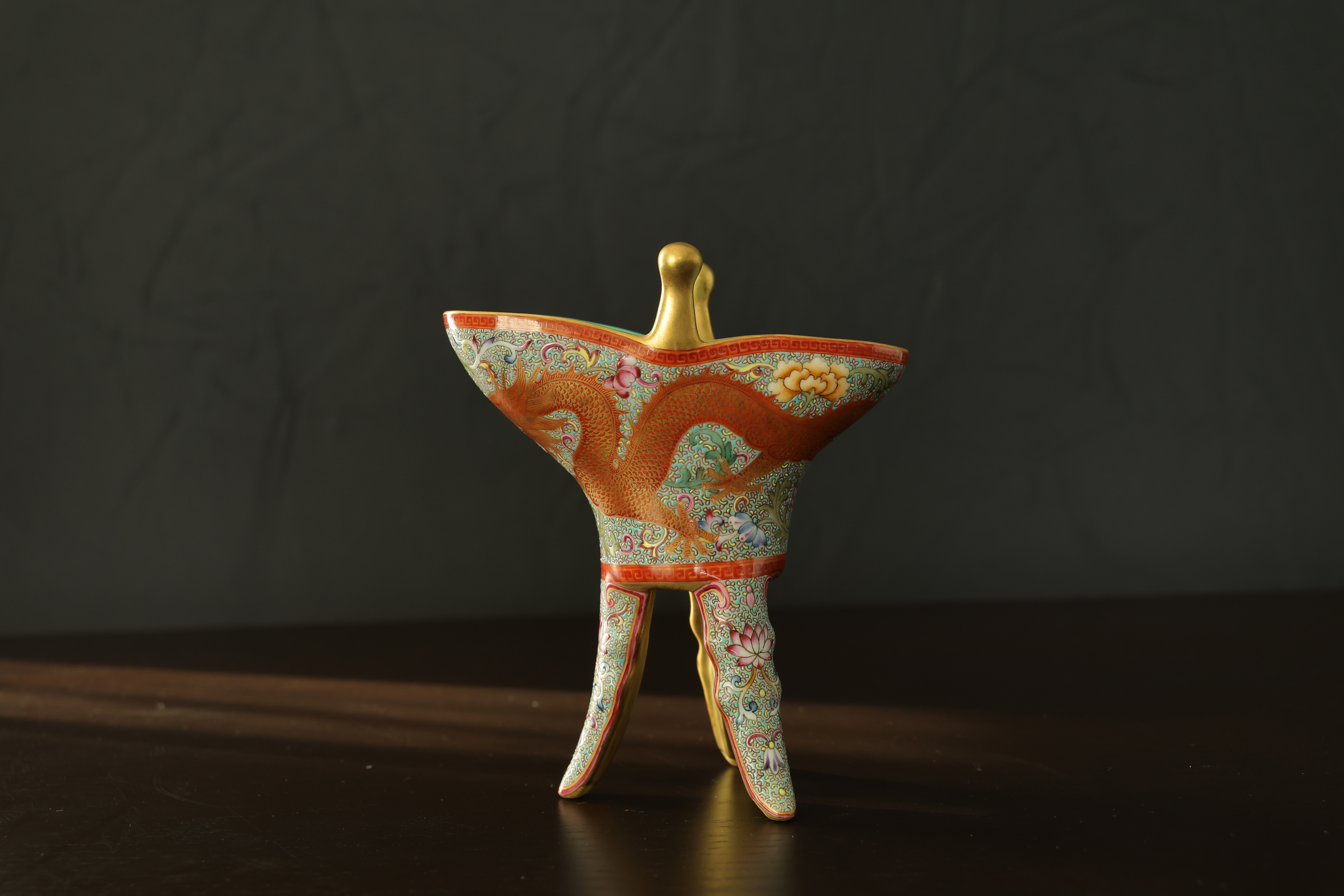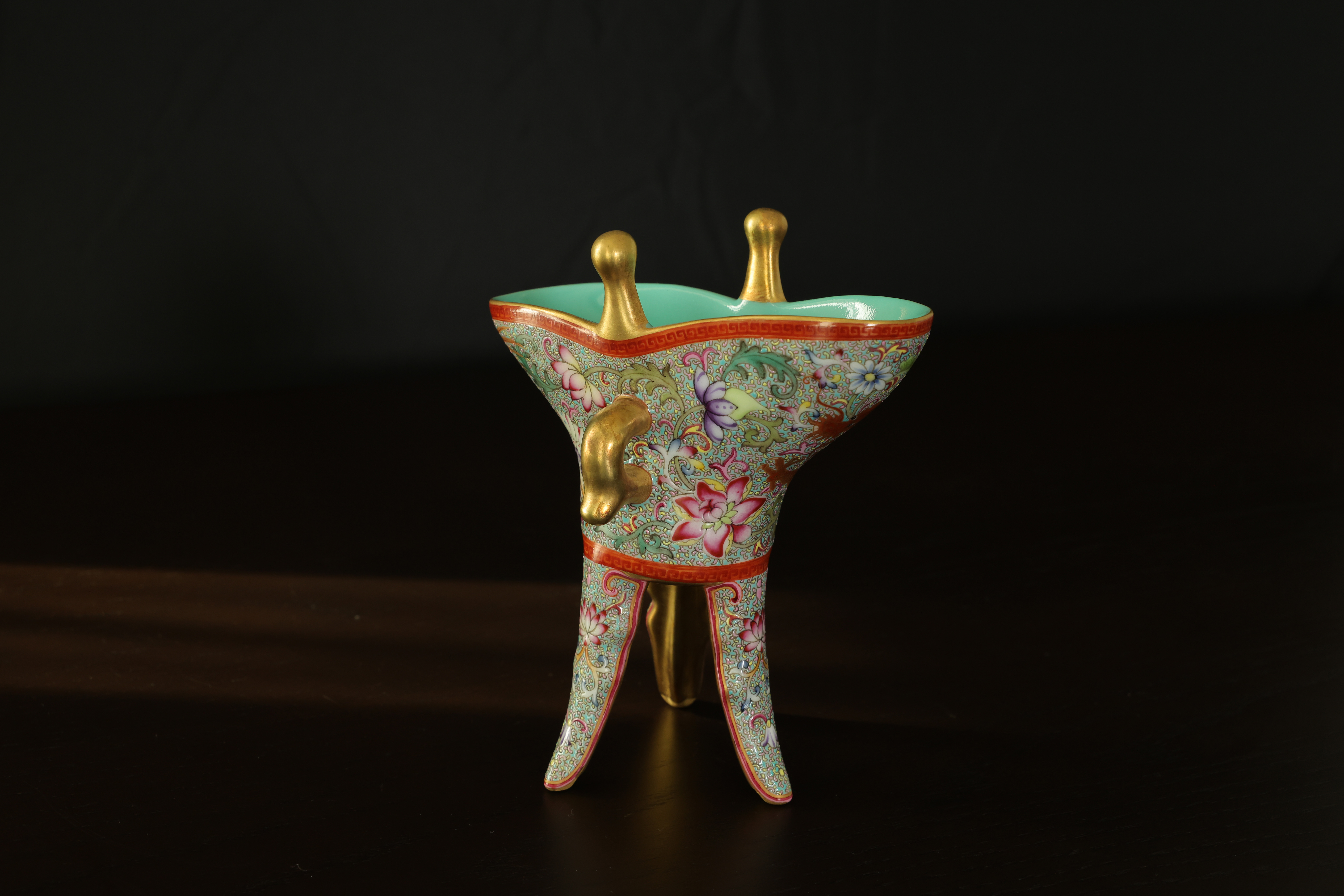 此器为清乾隆御制珐琅彩三足鼎立杯,造型仿古青铜觚爵式样,三足挺立,口微侈,流口与尾柱相对,整体形制庄重典雅,寓意承古启今、鼎盛昌隆。通体以珐琅彩装饰,地子以粉绿为主,细绘缠枝莲、蕉叶、回纹等纹饰,间以粉彩粉红、松石绿、湖蓝等色,层次丰富,彩绘精细入微。杯身两侧饰鎏金流尾,华贵庄严。腹部彩绘红龙穿云戏珠,龙鳞以金彩细描,形态矫健生动,神采奕奕,祥云翻卷,气势腾跃,寓“九五至尊”之象。器底鎏金地心,书青花楷款“乾隆年制”四字,庄雅肃穆。整器工艺繁缛而不失秩序,色彩浓丽而和雅,金彩辉映,雍容华贵,体现乾隆朝宫廷艺术的极致工艺与帝王气象,堪称清代珐琅彩御瓷中集古典精神与皇家审美于一体之杰作。