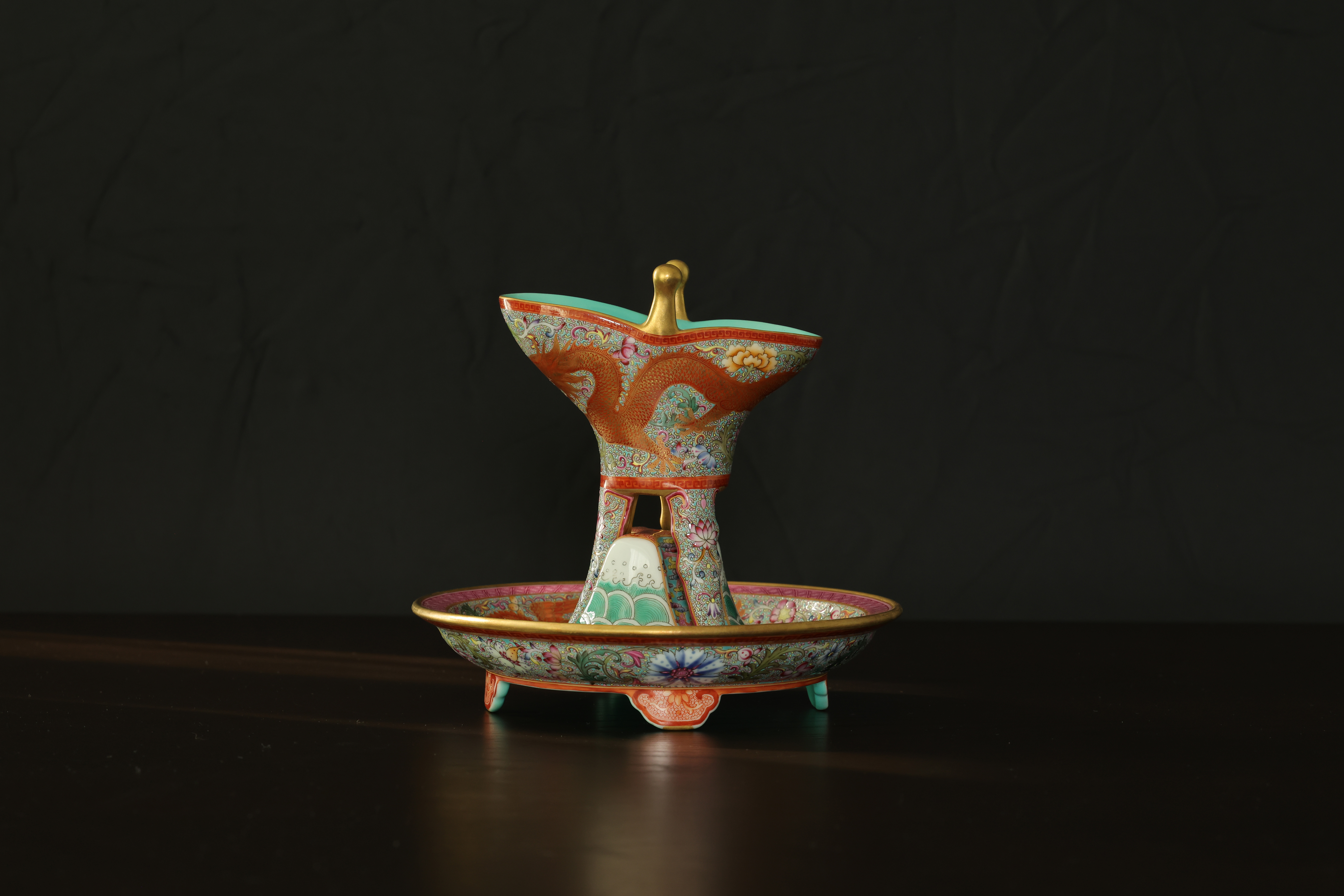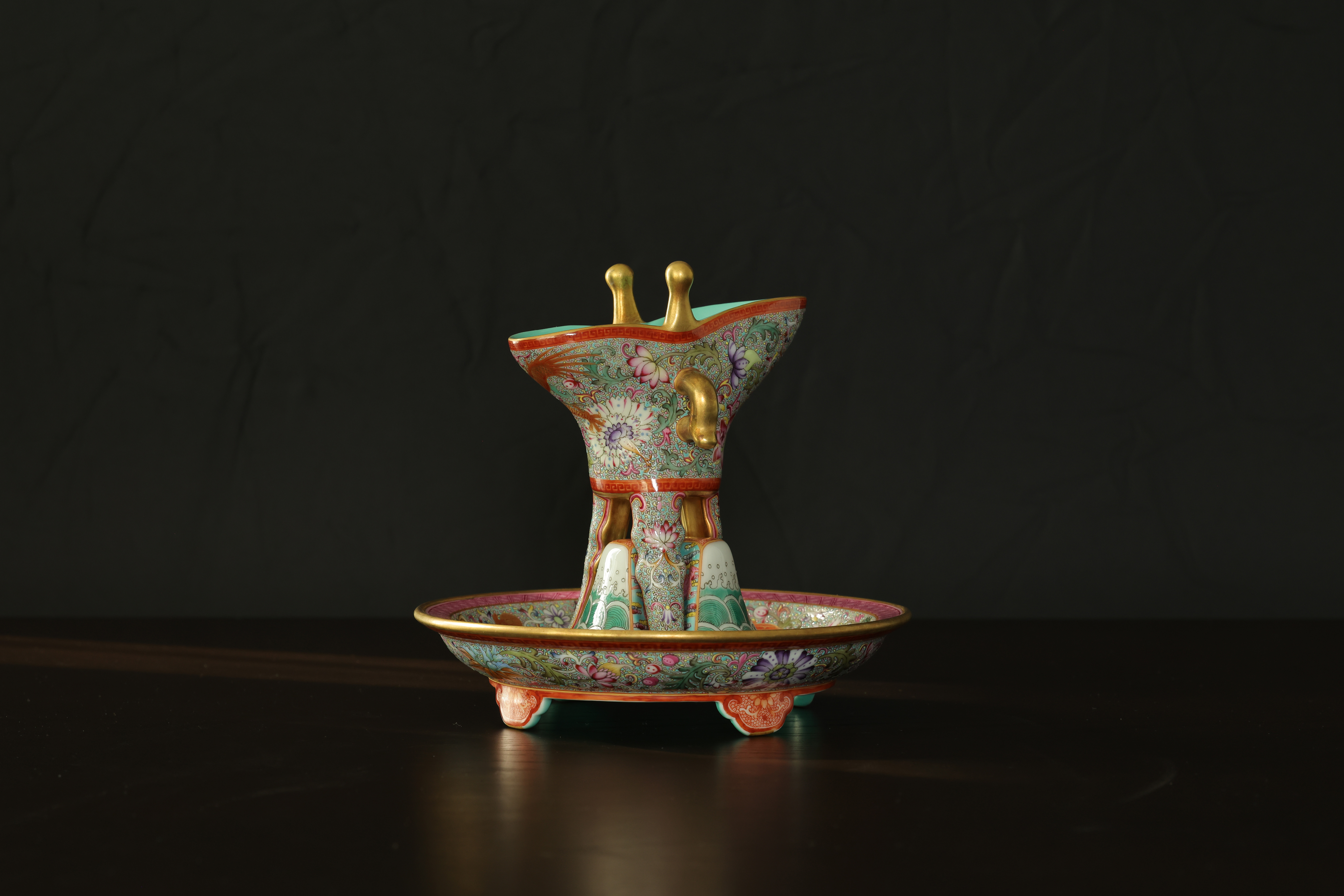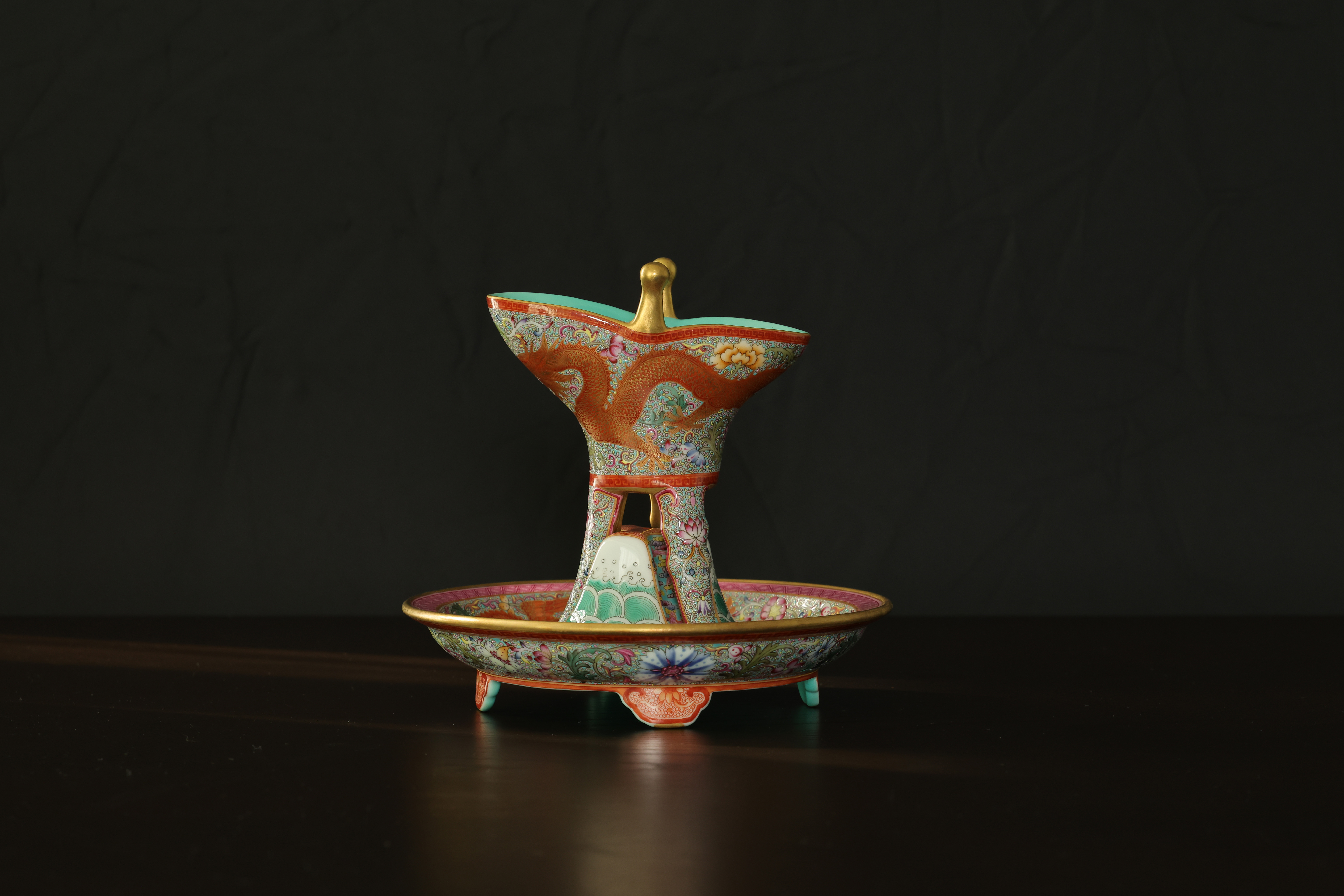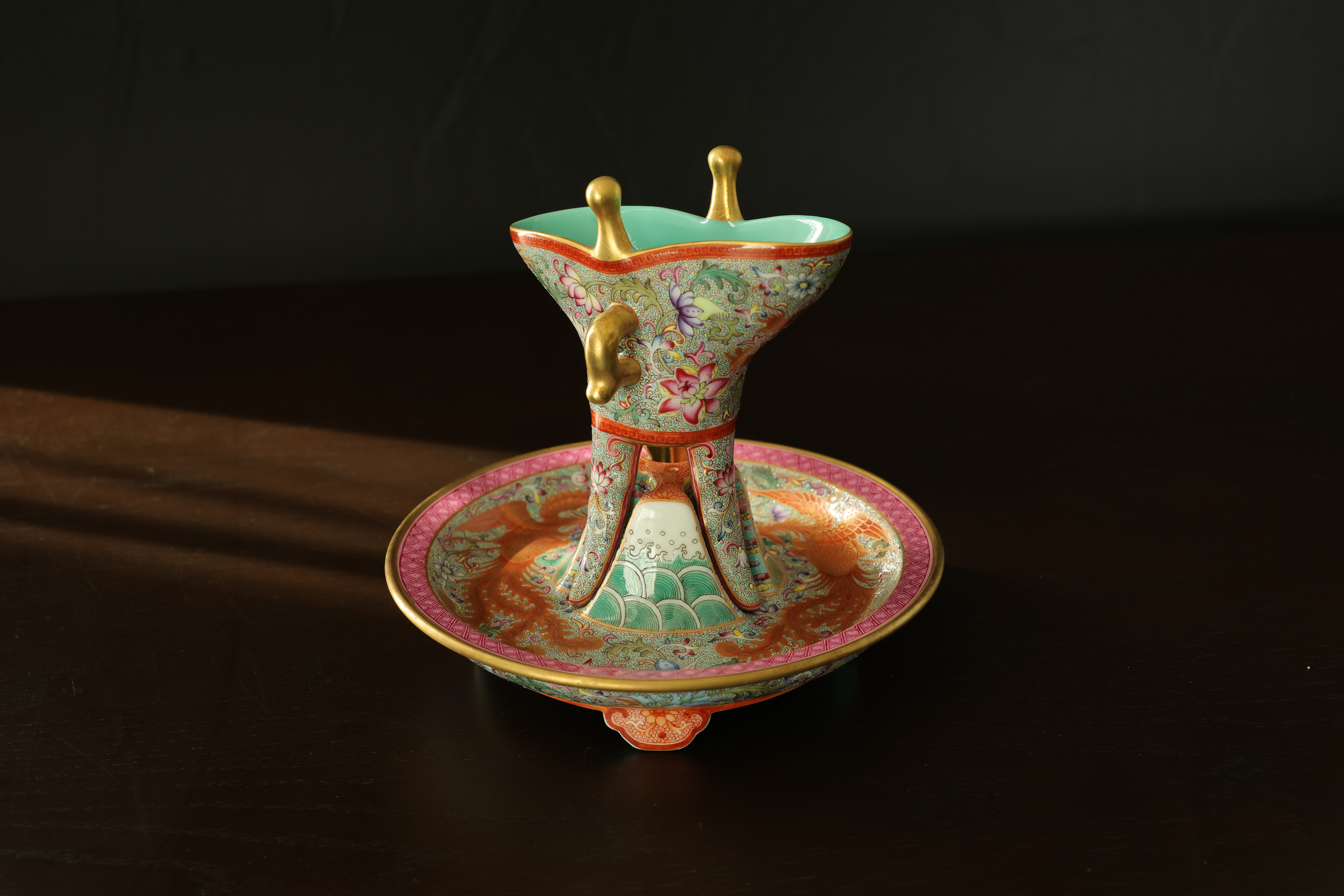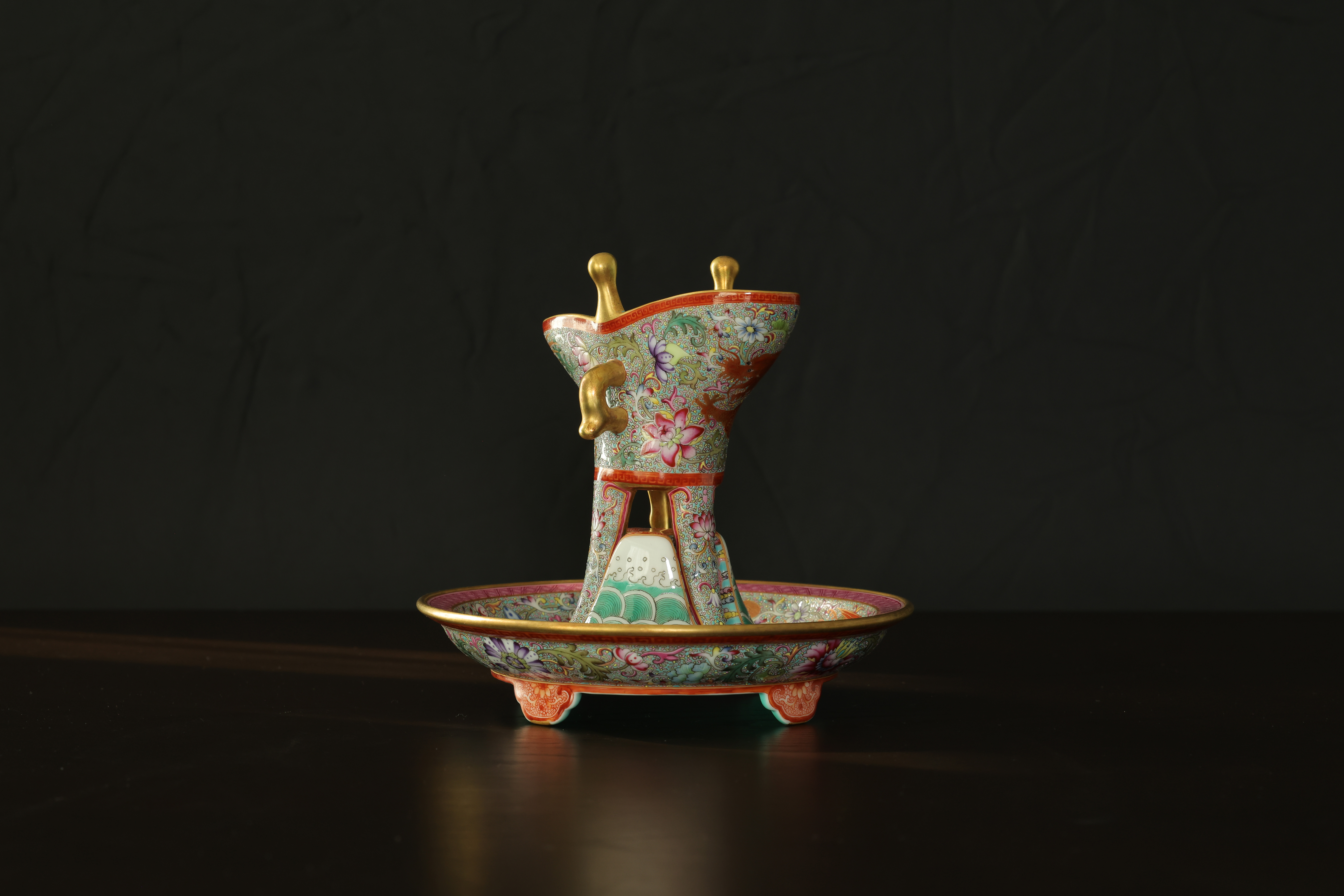 此器为清乾隆御制珐琅彩三足鼎立杯,造型仿古青铜觚爵式样,三足挺立,口微侈,流口与尾柱相对,整体形制庄重典雅,寓意承古启今、鼎盛昌隆。通体以珐琅彩装饰,地子以粉绿为主,细绘缠枝莲、蕉叶、回纹等纹饰,间以粉彩粉红、松石绿、湖蓝等色,层次丰富,彩绘精细入微。杯身两侧饰鎏金流尾,华贵庄严。腹部彩绘红龙穿云戏珠,龙鳞以金彩细描,形态矫健生动,神采奕奕,祥云翻卷,气势腾跃,寓“九五至尊”之象。器底鎏金地心,书青花楷款“乾隆年制”四字,庄雅肃穆。整器工艺繁缛而不失秩序,色彩浓丽而和雅,金彩辉映,雍容华贵,体现乾隆朝宫廷艺术的极致工艺与帝王气象,堪称清代珐琅彩御瓷中集古典精神与皇家审美于一体之杰作。
