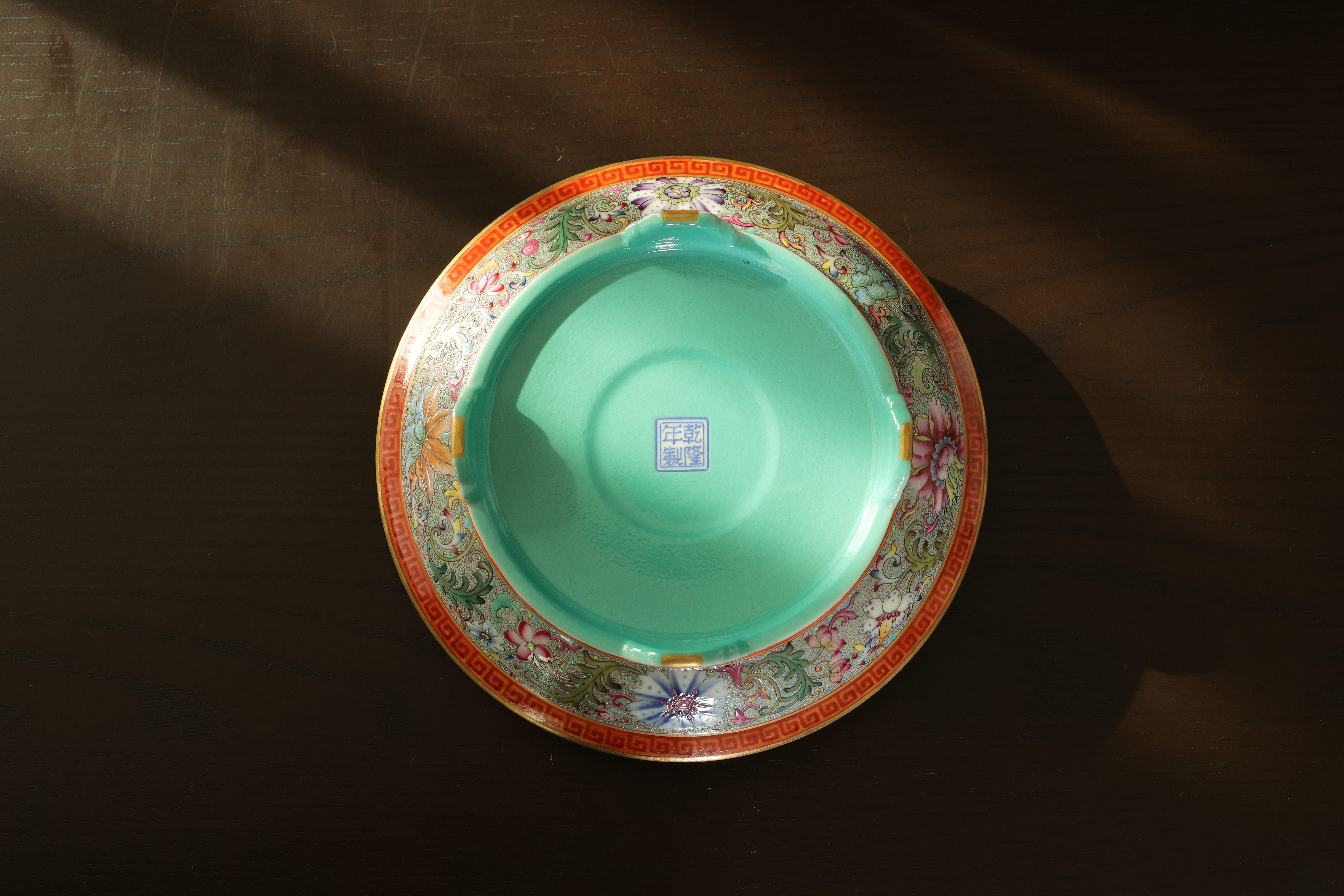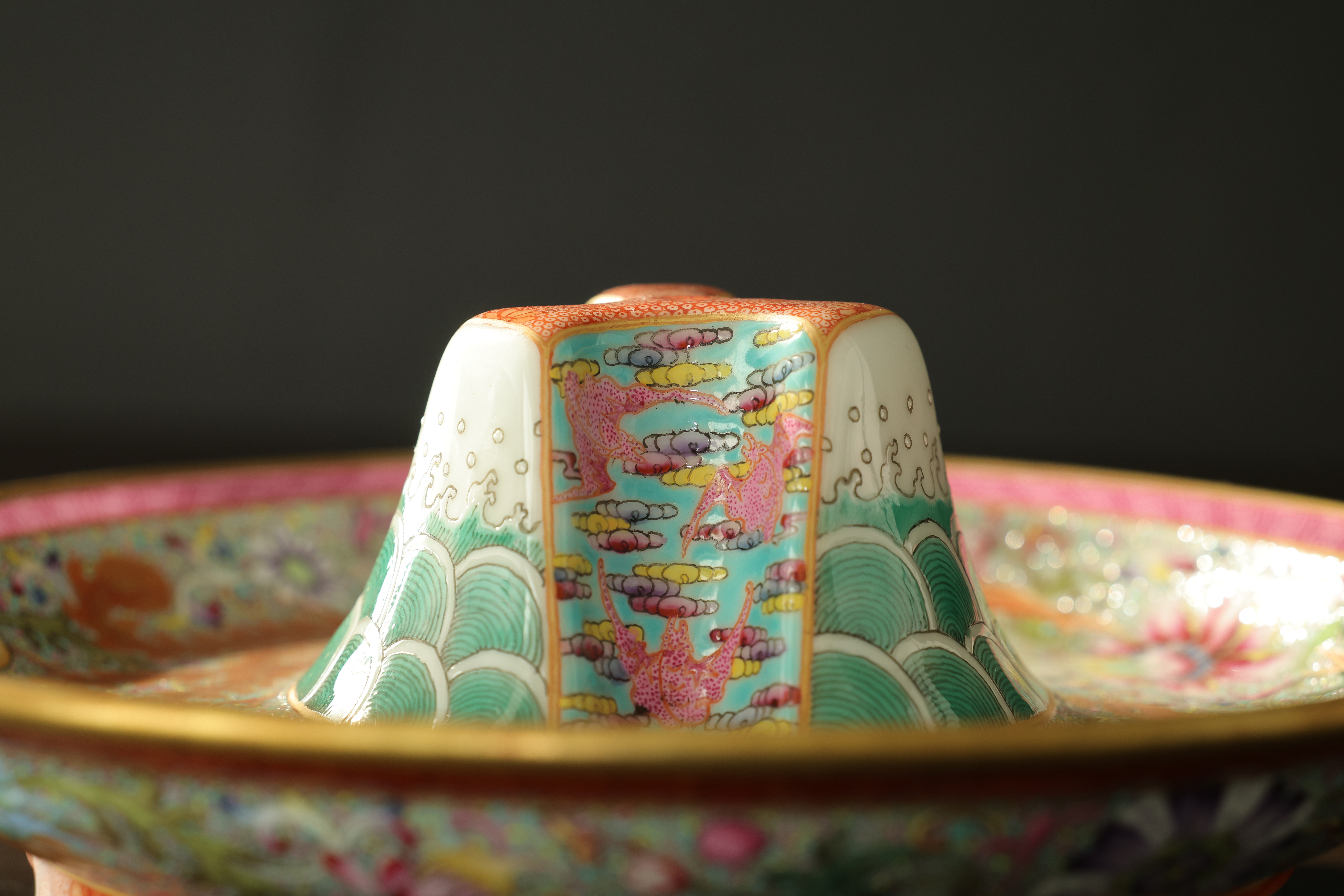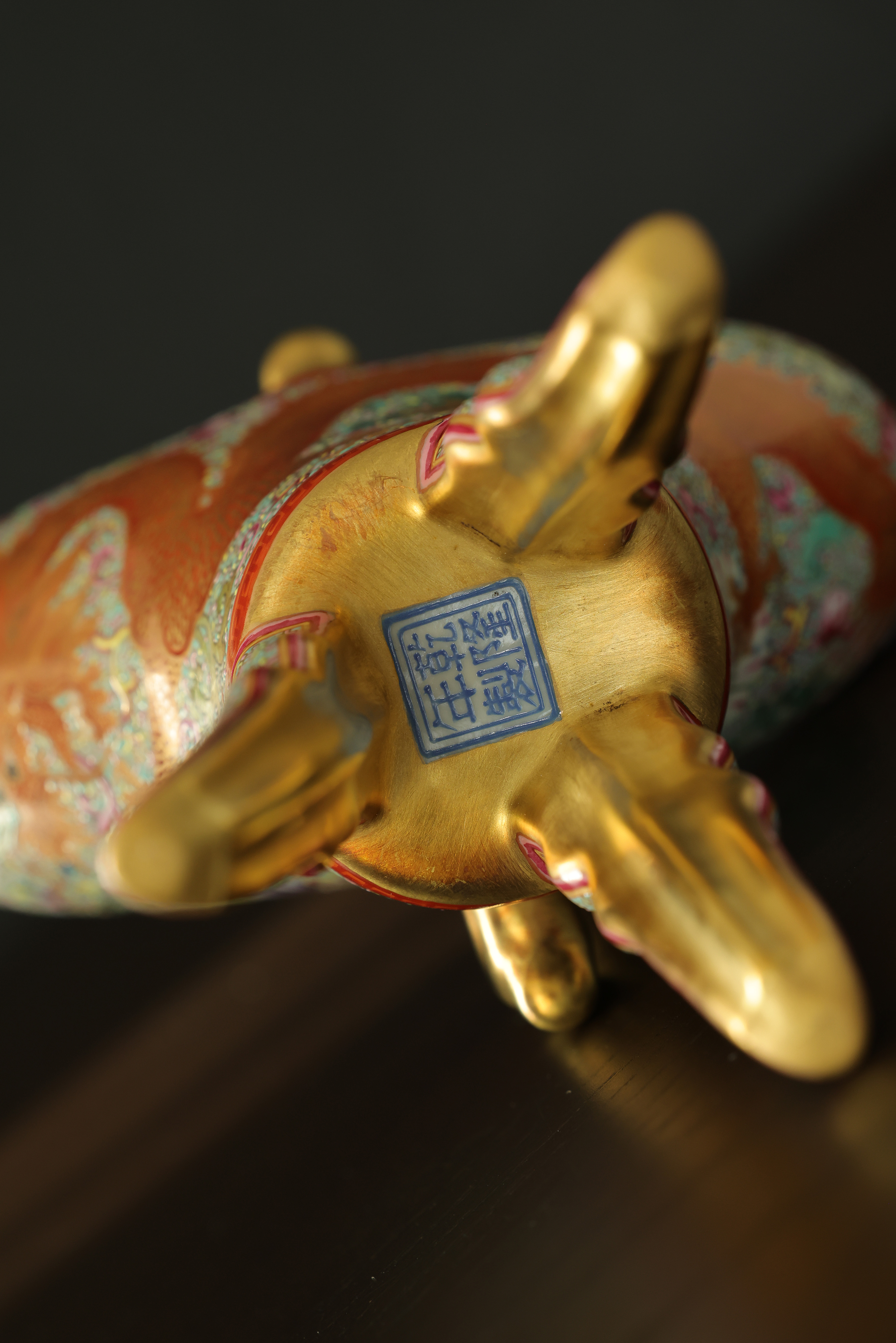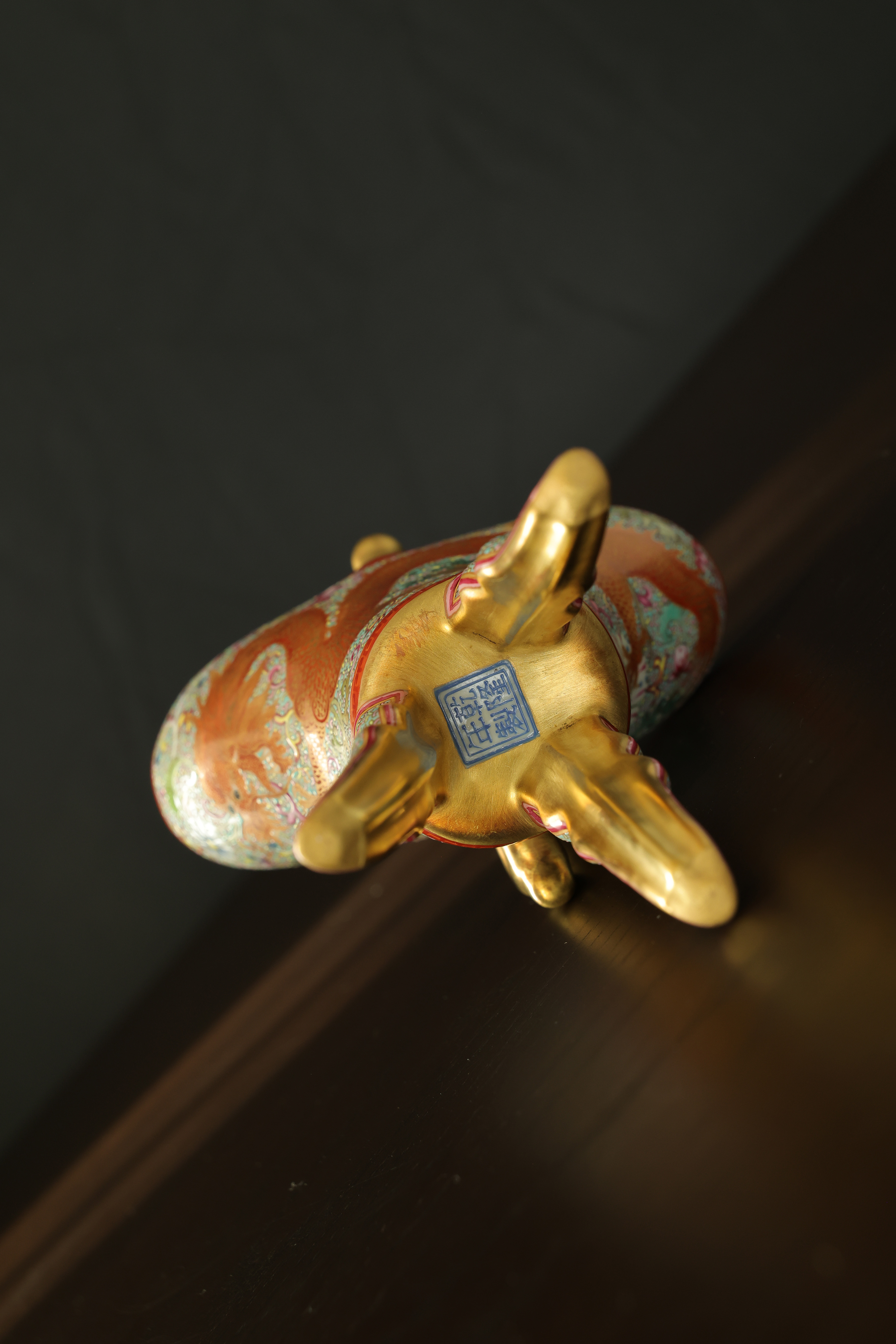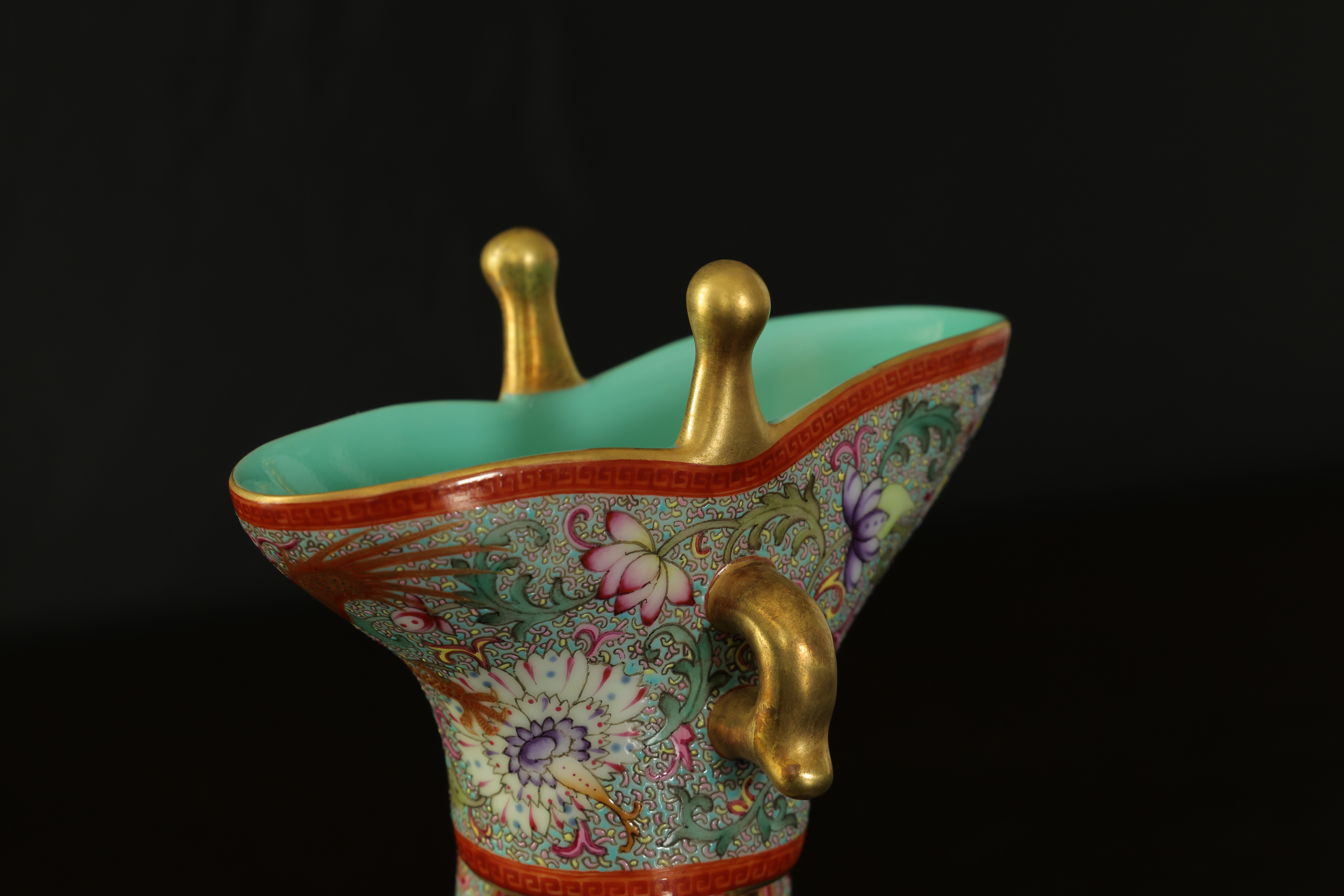 此器为清乾隆御制珐琅彩三足鼎立杯,造型仿古青铜觚爵式样,三足挺立,口微侈,流口与尾柱相对,整体形制庄重典雅,寓意承古启今、鼎盛昌隆。通体以珐琅彩装饰,地子以粉绿为主,细绘缠枝莲、蕉叶、回纹等纹饰,间以粉彩粉红、松石绿、湖蓝等色,层次丰富,彩绘精细入微。杯身两侧饰鎏金流尾,华贵庄严。腹部彩绘红龙穿云戏珠,龙鳞以金彩细描,形态矫健生动,神采奕奕,祥云翻卷,气势腾跃,寓“九五至尊”之象。器底鎏金地心,书青花楷款“乾隆年制”四字,庄雅肃穆。整器工艺繁缛而不失秩序,色彩浓丽而和雅,金彩辉映,雍容华贵,体现乾隆朝宫廷艺术的极致工艺与帝王气象,堪称清代珐琅彩御瓷中集古典精神与皇家审美于一体之杰作。