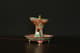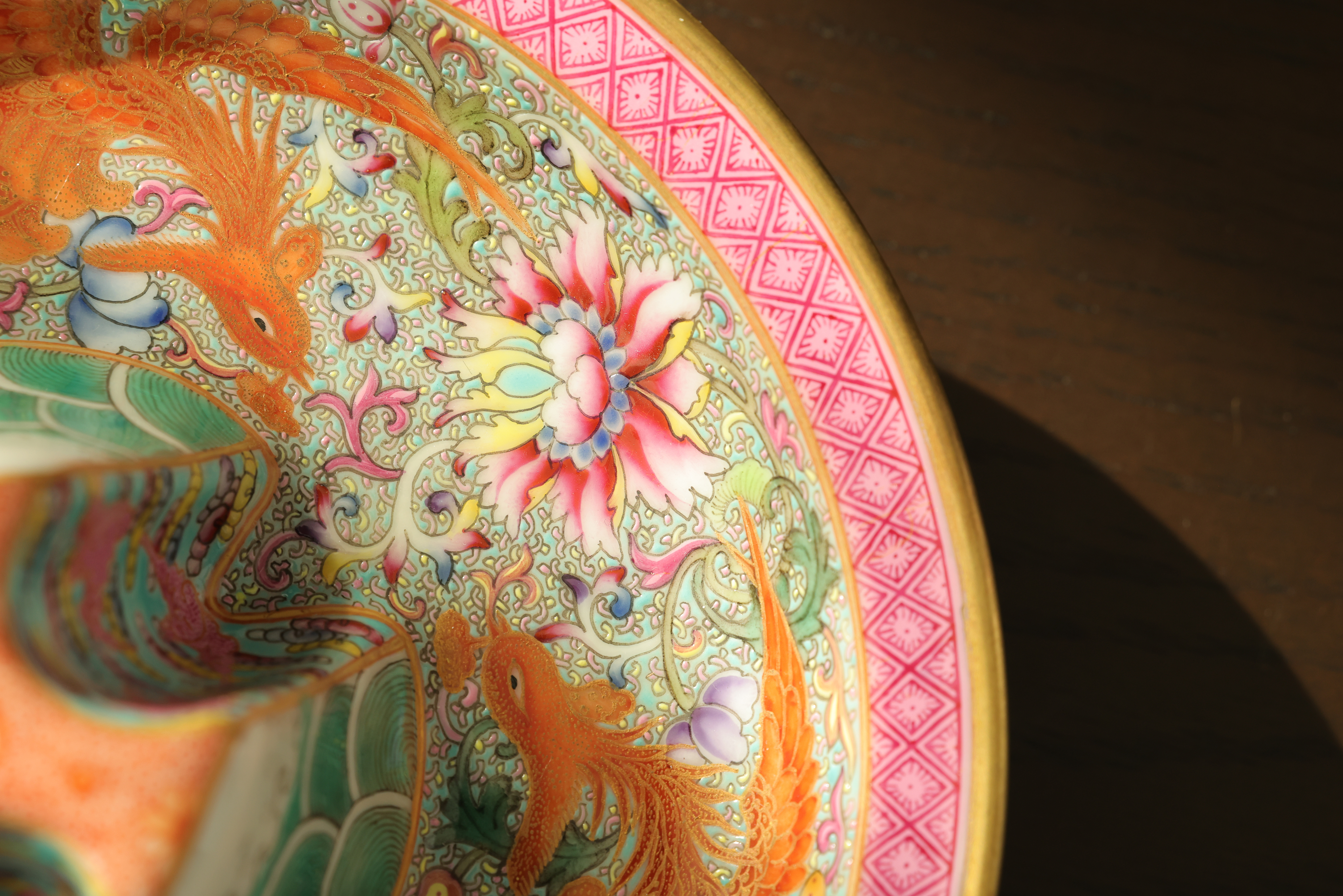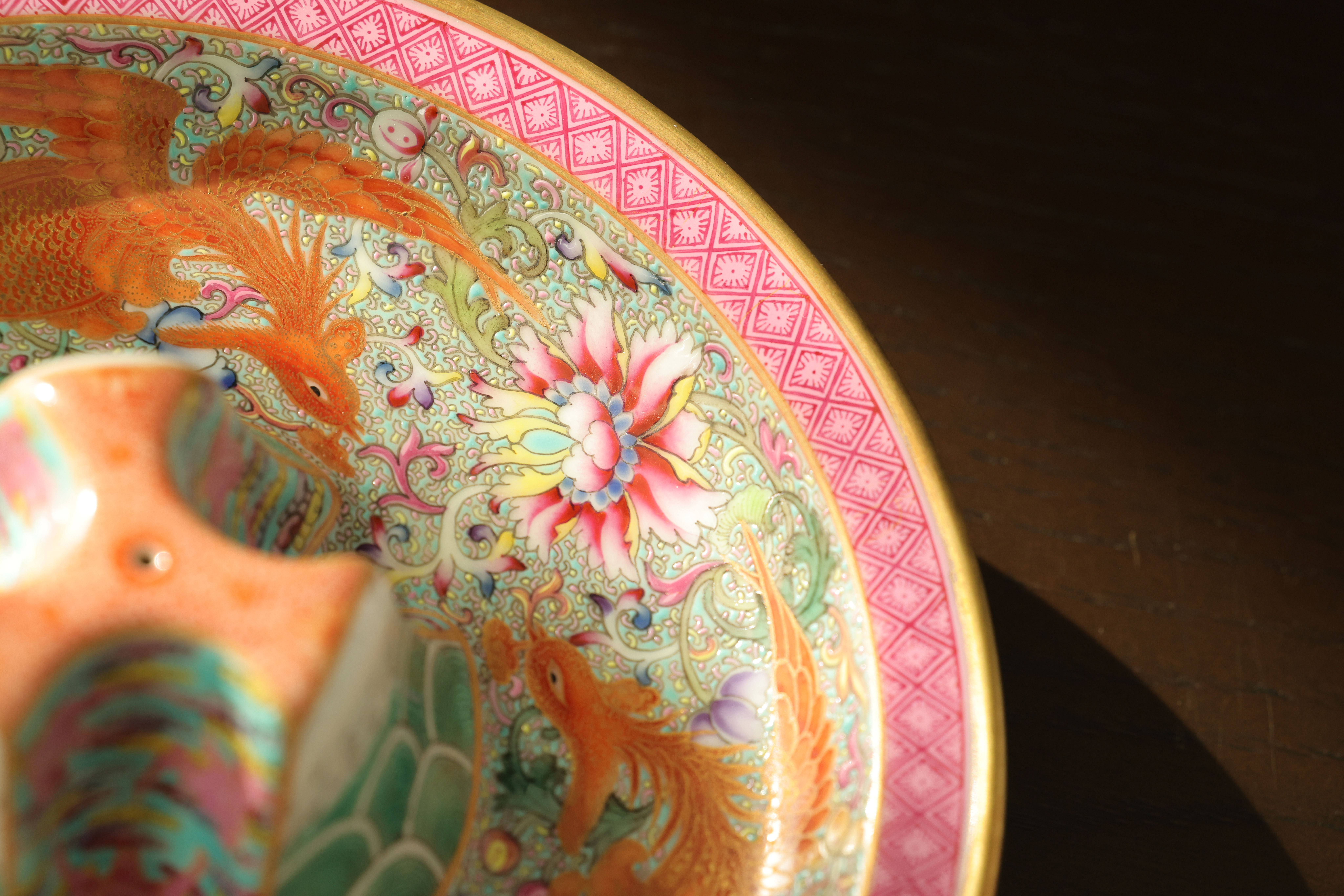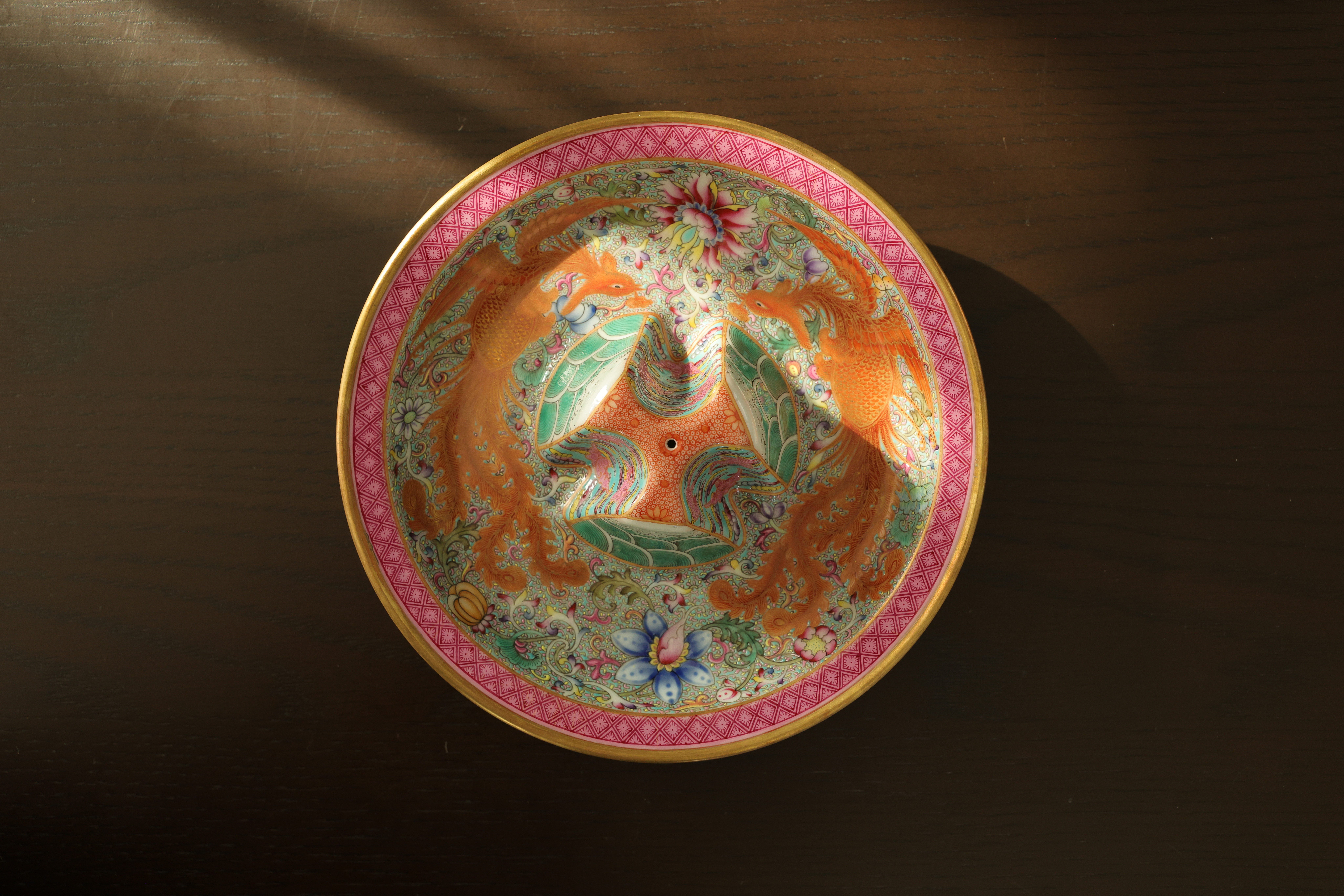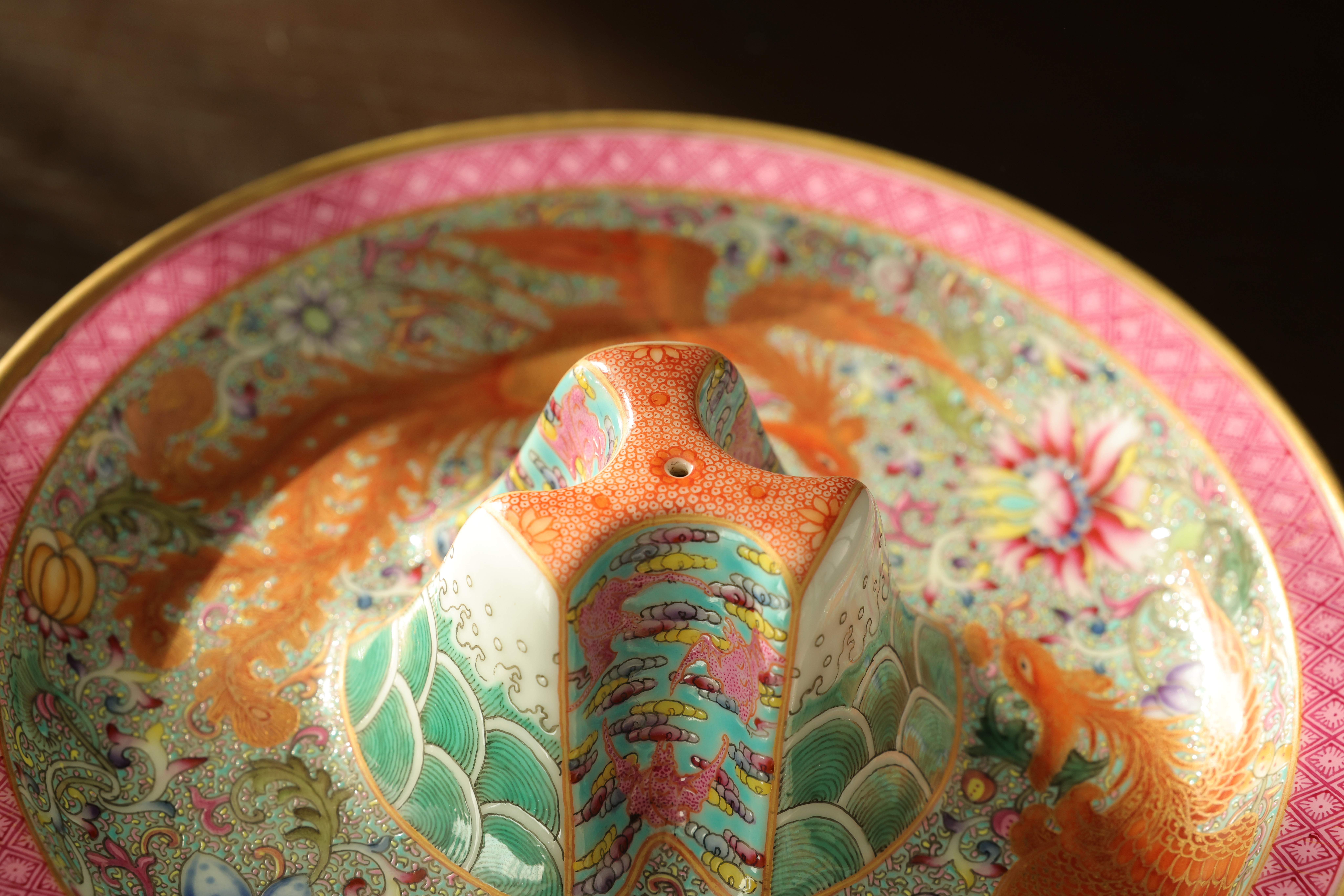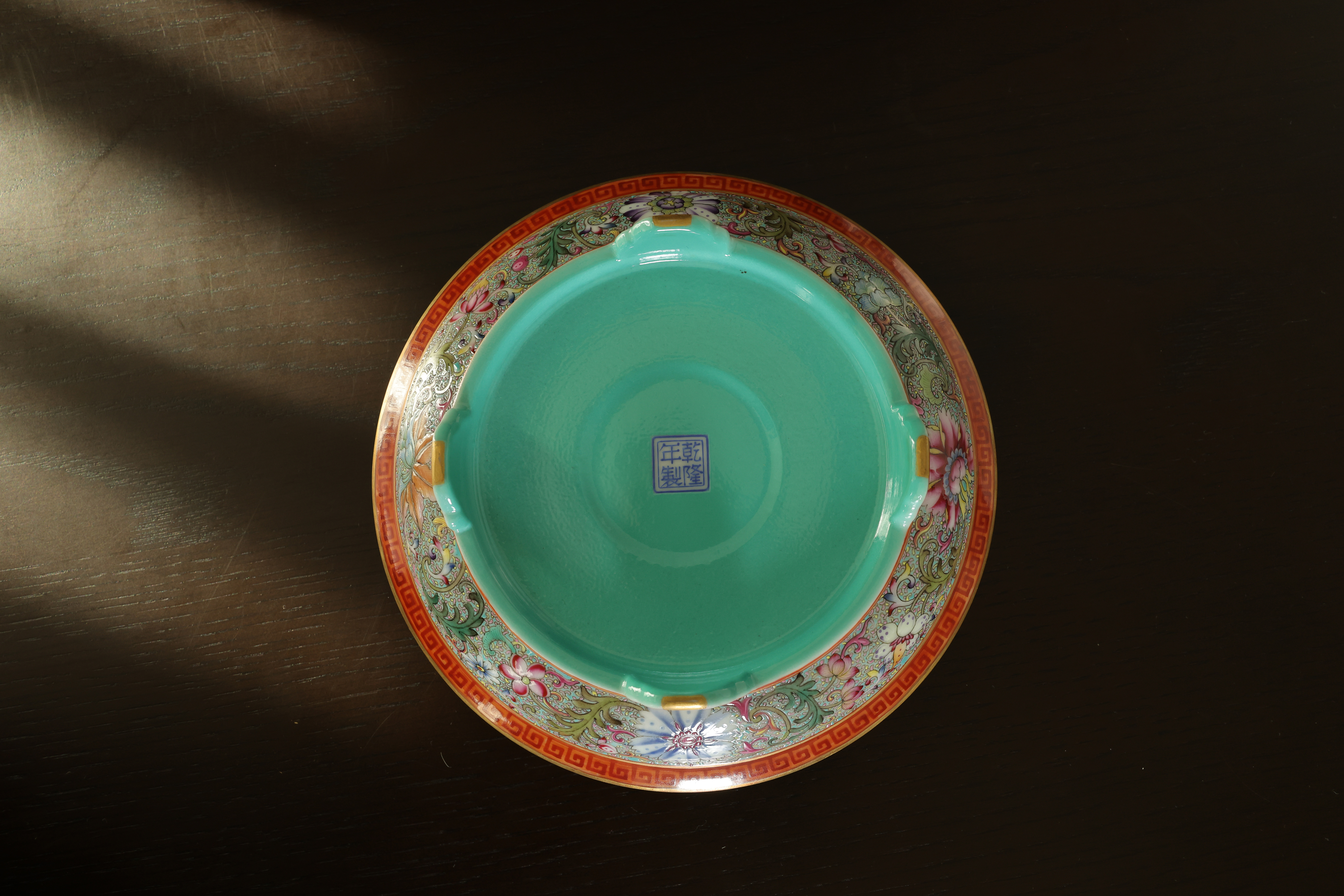 此器为清乾隆御制珐琅彩三足鼎立杯,造型仿古青铜觚爵式样,三足挺立,口微侈,流口与尾柱相对,整体形制庄重典雅,寓意承古启今、鼎盛昌隆。通体以珐琅彩装饰,地子以粉绿为主,细绘缠枝莲、蕉叶、回纹等纹饰,间以粉彩粉红、松石绿、湖蓝等色,层次丰富,彩绘精细入微。杯身两侧饰鎏金流尾,华贵庄严。腹部彩绘红龙穿云戏珠,龙鳞以金彩细描,形态矫健生动,神采奕奕,祥云翻卷,气势腾跃,寓“九五至尊”之象。器底鎏金地心,书青花楷款“乾隆年制”四字,庄雅肃穆。整器工艺繁缛而不失秩序,色彩浓丽而和雅,金彩辉映,雍容华贵,体现乾隆朝宫廷艺术的极致工艺与帝王气象,堪称清代珐琅彩御瓷中集古典精神与皇家审美于一体之杰作。
