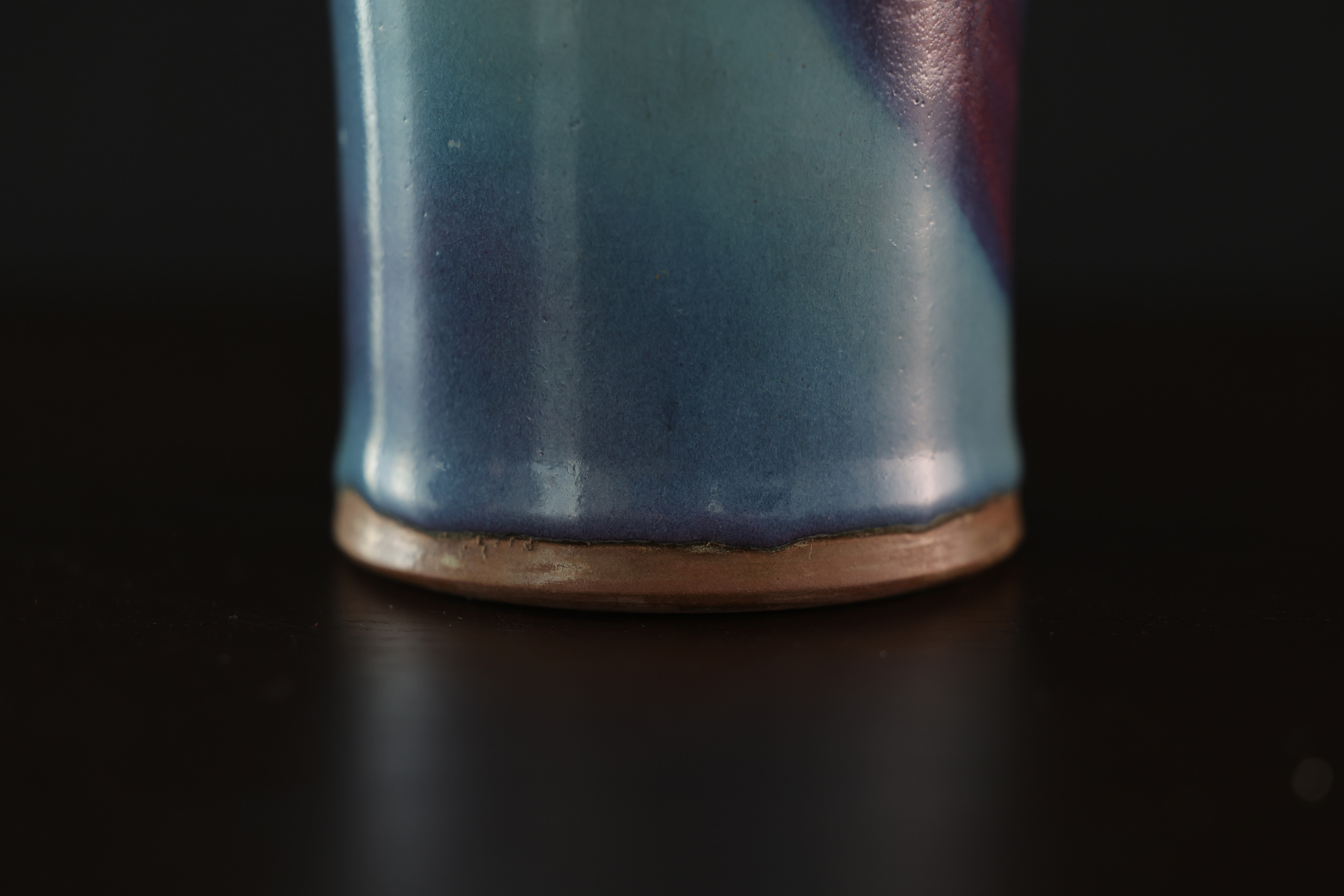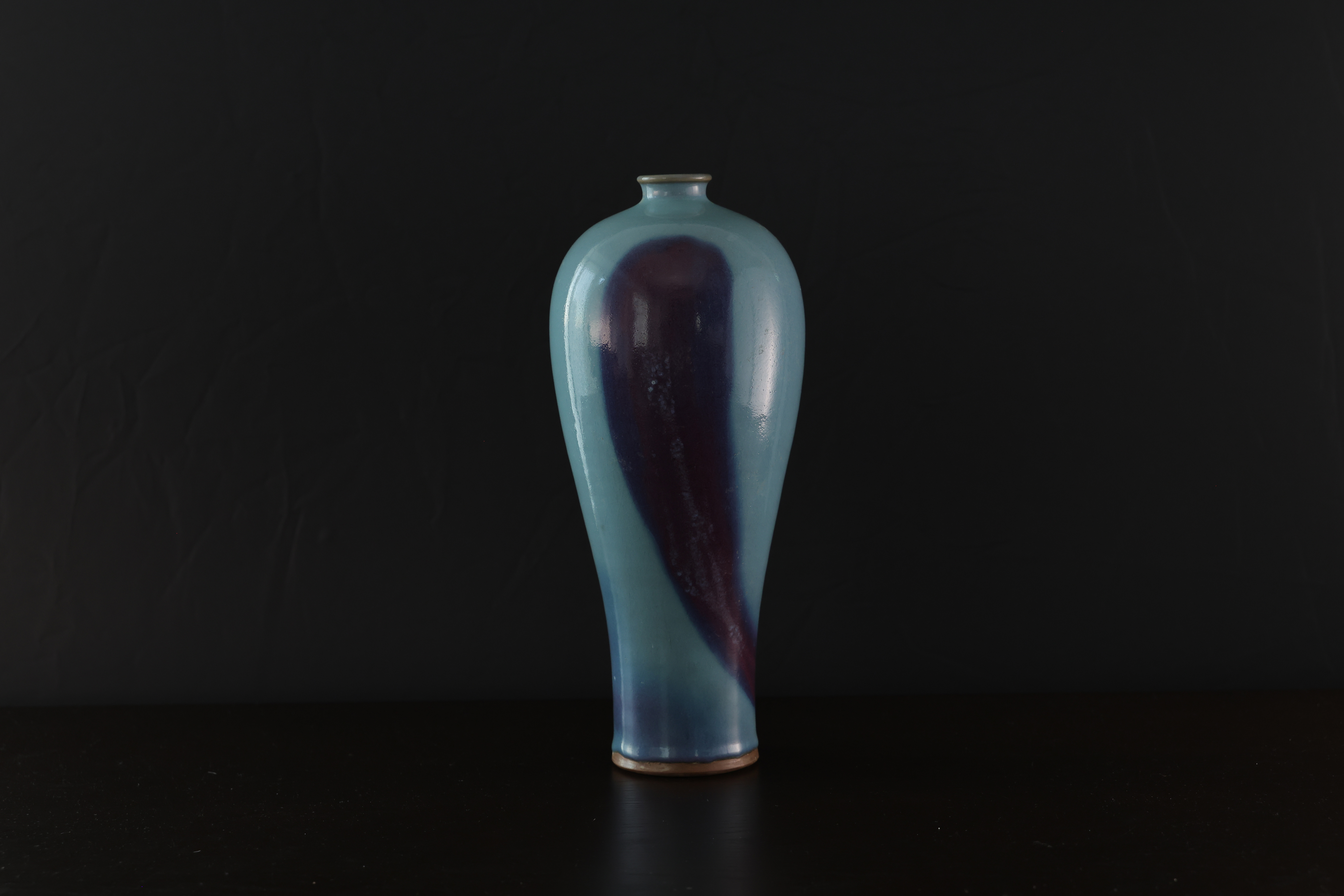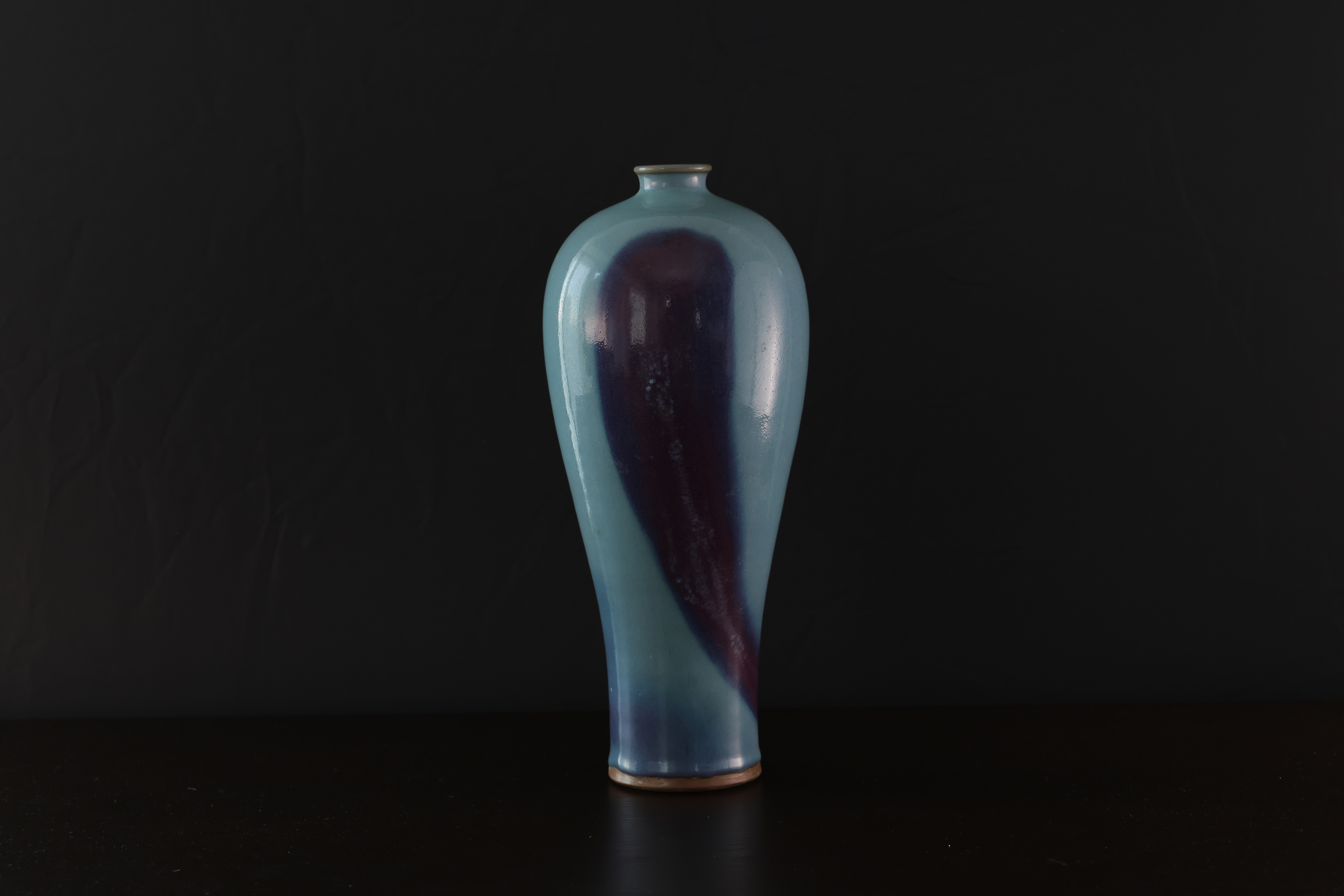 此为钧窑天青釉梅瓶,造型端庄挺拔,肩丰腹收,线条流畅自然,尽显古雅之韵。通体施天青釉,釉色莹润凝厚,如碧空映水,釉面光泽柔和,隐现开片。瓶身一侧自然垂流一抹紫斑,晕散渗化,色泽由深紫转为绀青,层次丰富,变化如云烟流动,呈现钧瓷“窑变”独有的自然美感。釉色融汇天工,紫红入青,似晚霞映水、丹霞入岫,极具诗意。口沿微撇,足底露胎呈火石红,胎质坚致细腻。整体气韵沉静内敛,釉彩灵动含蓄,体现钧窑“入窑一色,出窑万彩”的窑变神韵,为宋代钧瓷中梅瓶式样之典雅代表,亦为古人追求“天成之美”的极致体现。