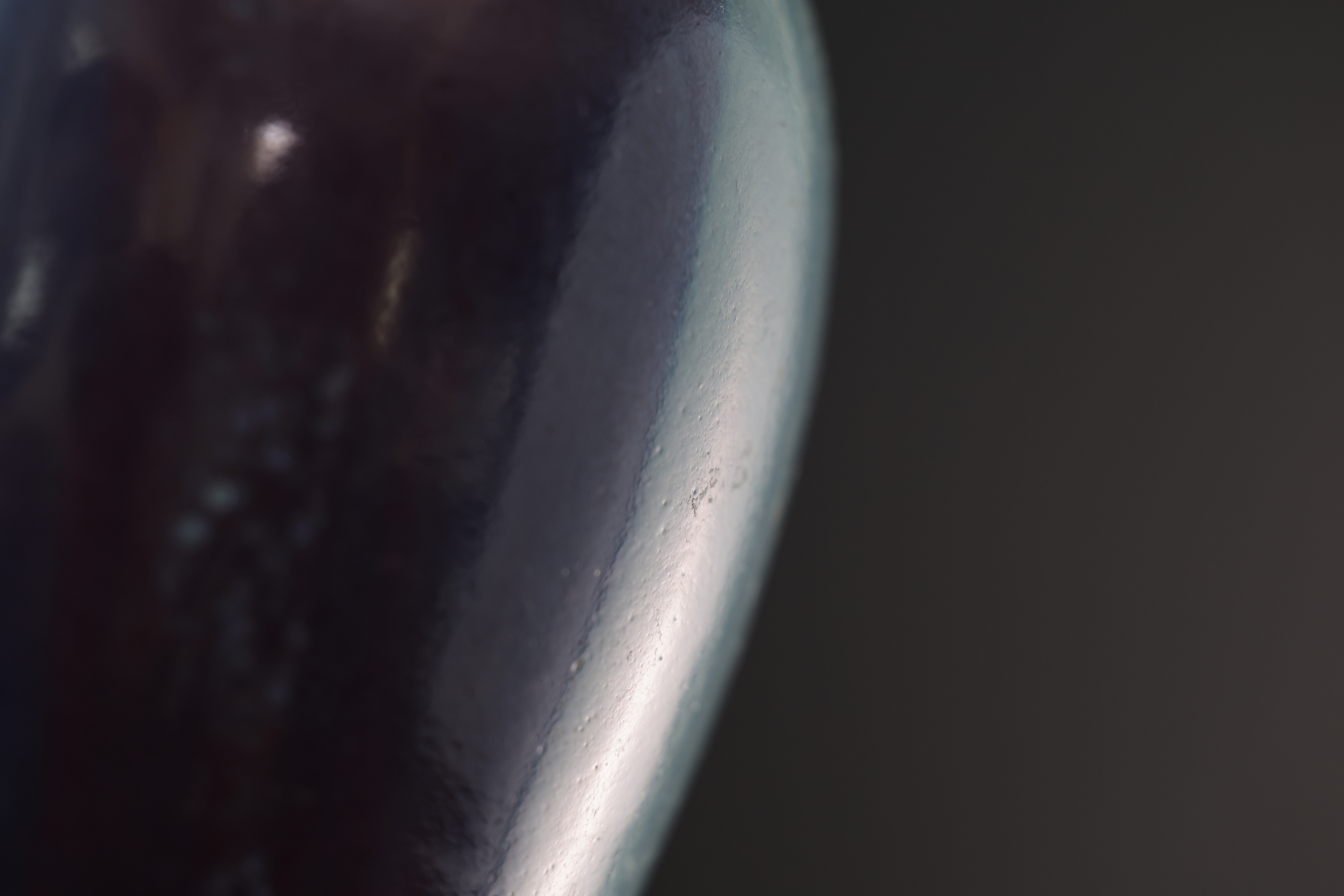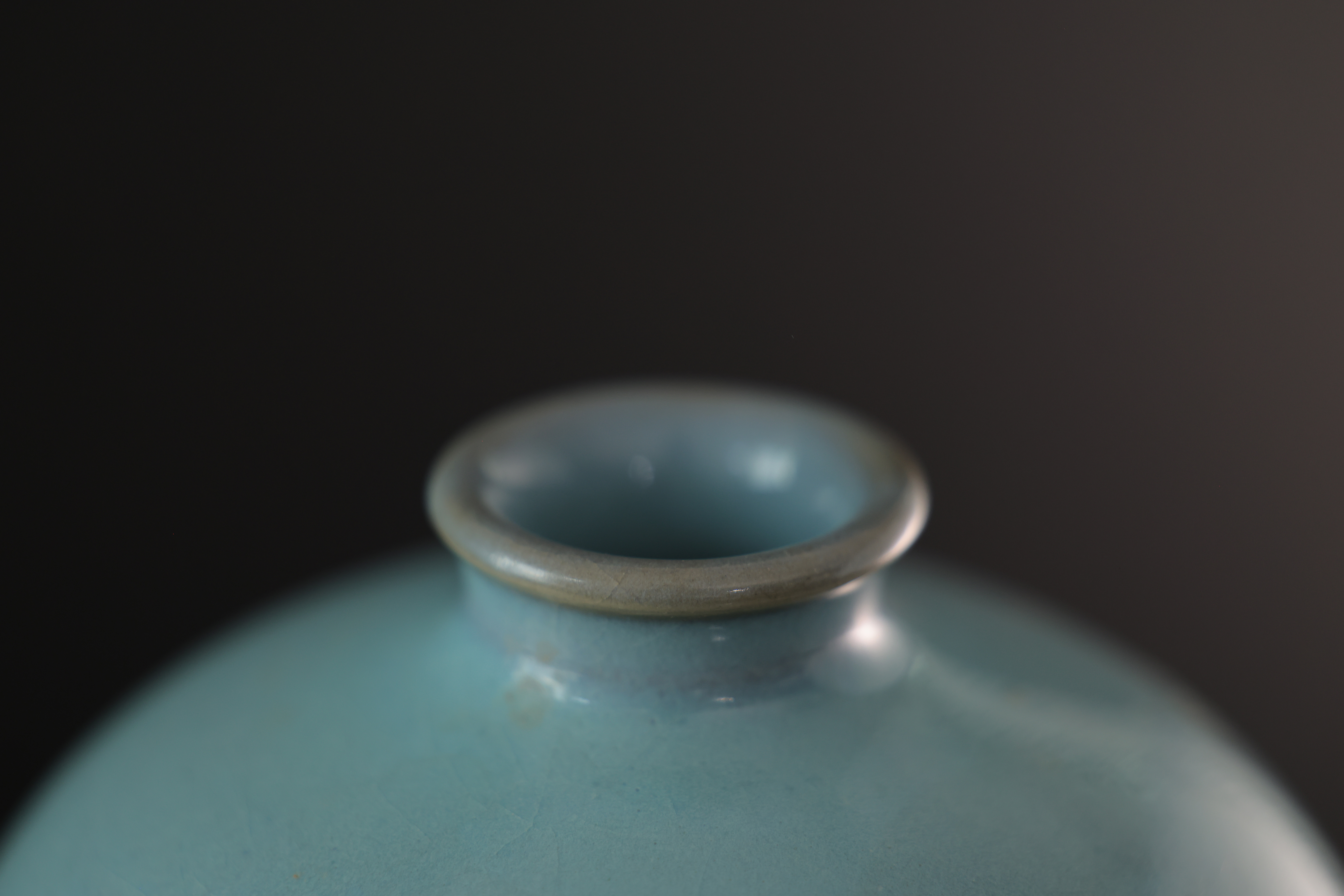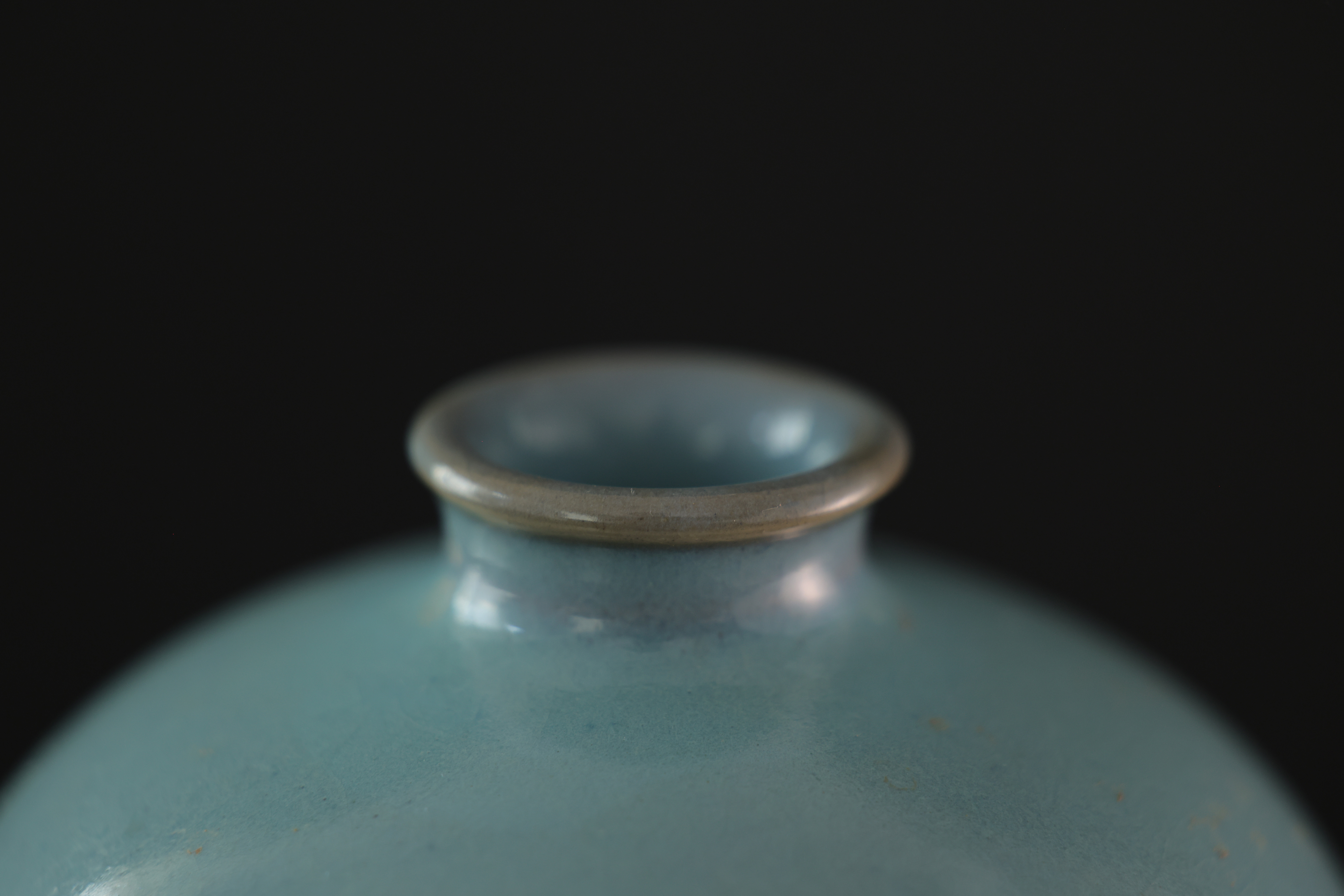 此为钧窑天青釉梅瓶,造型端庄挺拔,肩丰腹收,线条流畅自然,尽显古雅之韵。通体施天青釉,釉色莹润凝厚,如碧空映水,釉面光泽柔和,隐现开片。瓶身一侧自然垂流一抹紫斑,晕散渗化,色泽由深紫转为绀青,层次丰富,变化如云烟流动,呈现钧瓷“窑变”独有的自然美感。釉色融汇天工,紫红入青,似晚霞映水、丹霞入岫,极具诗意。口沿微撇,足底露胎呈火石红,胎质坚致细腻。整体气韵沉静内敛,釉彩灵动含蓄,体现钧窑“入窑一色,出窑万彩”的窑变神韵,为宋代钧瓷中梅瓶式样之典雅代表,亦为古人追求“天成之美”的极致体现。