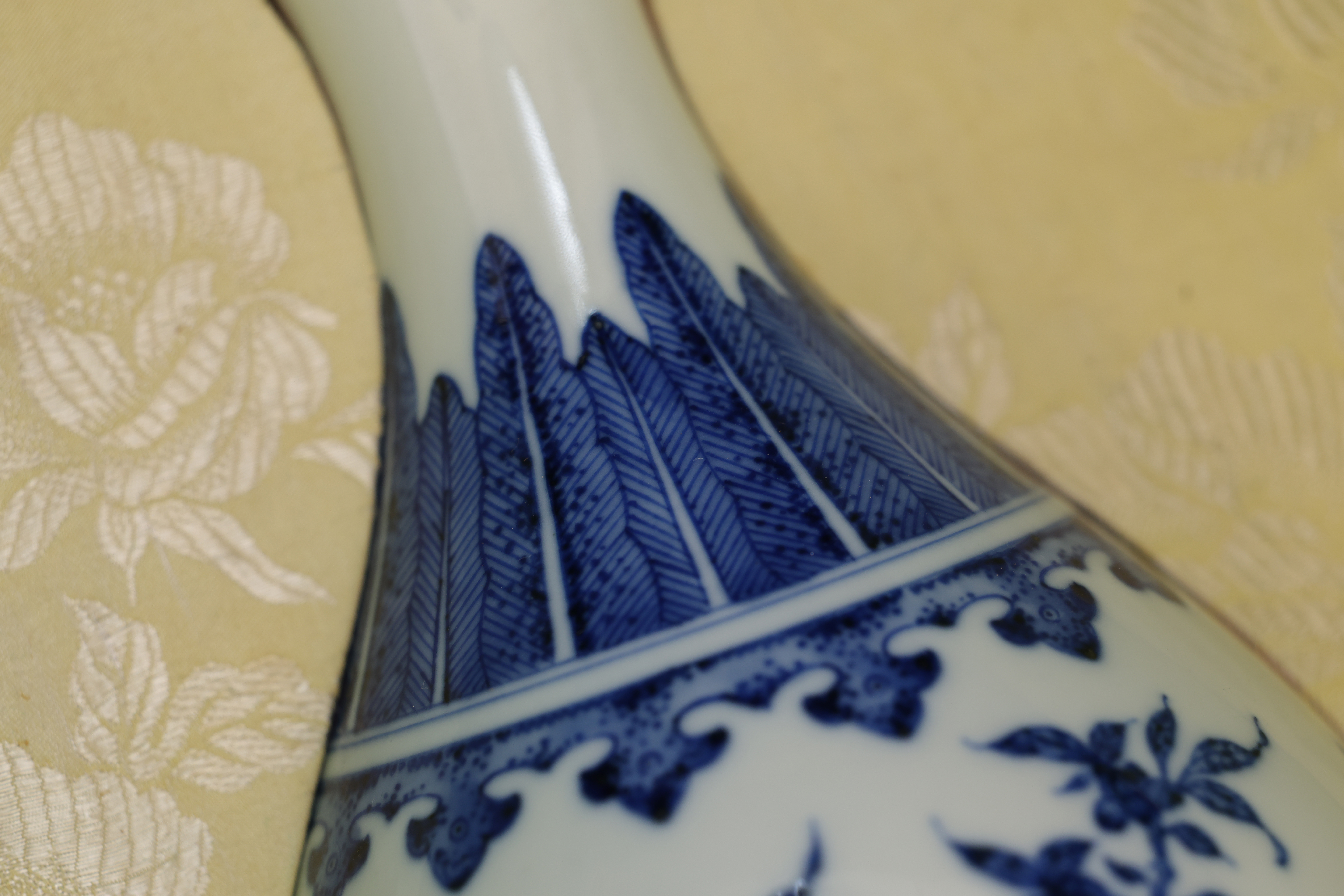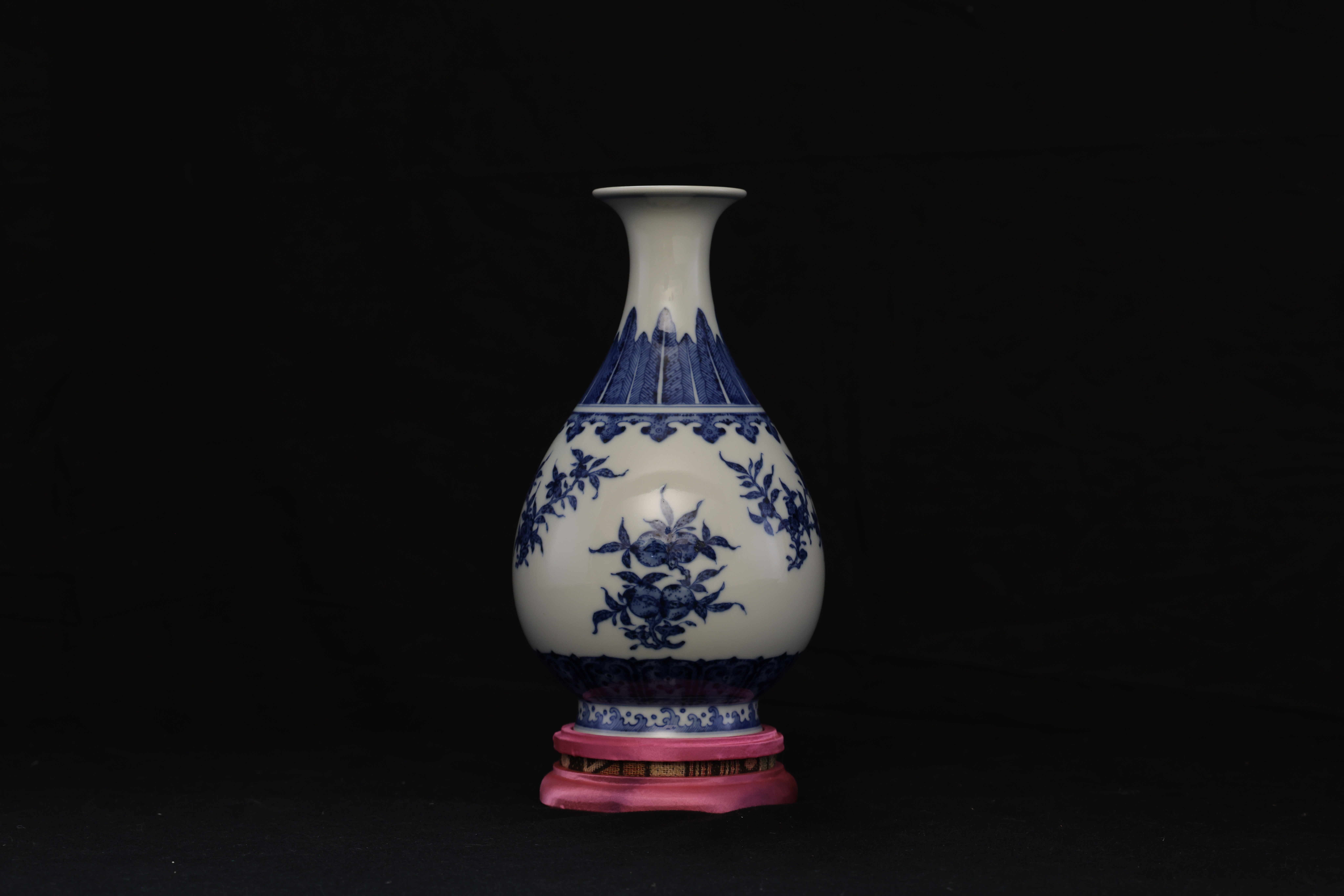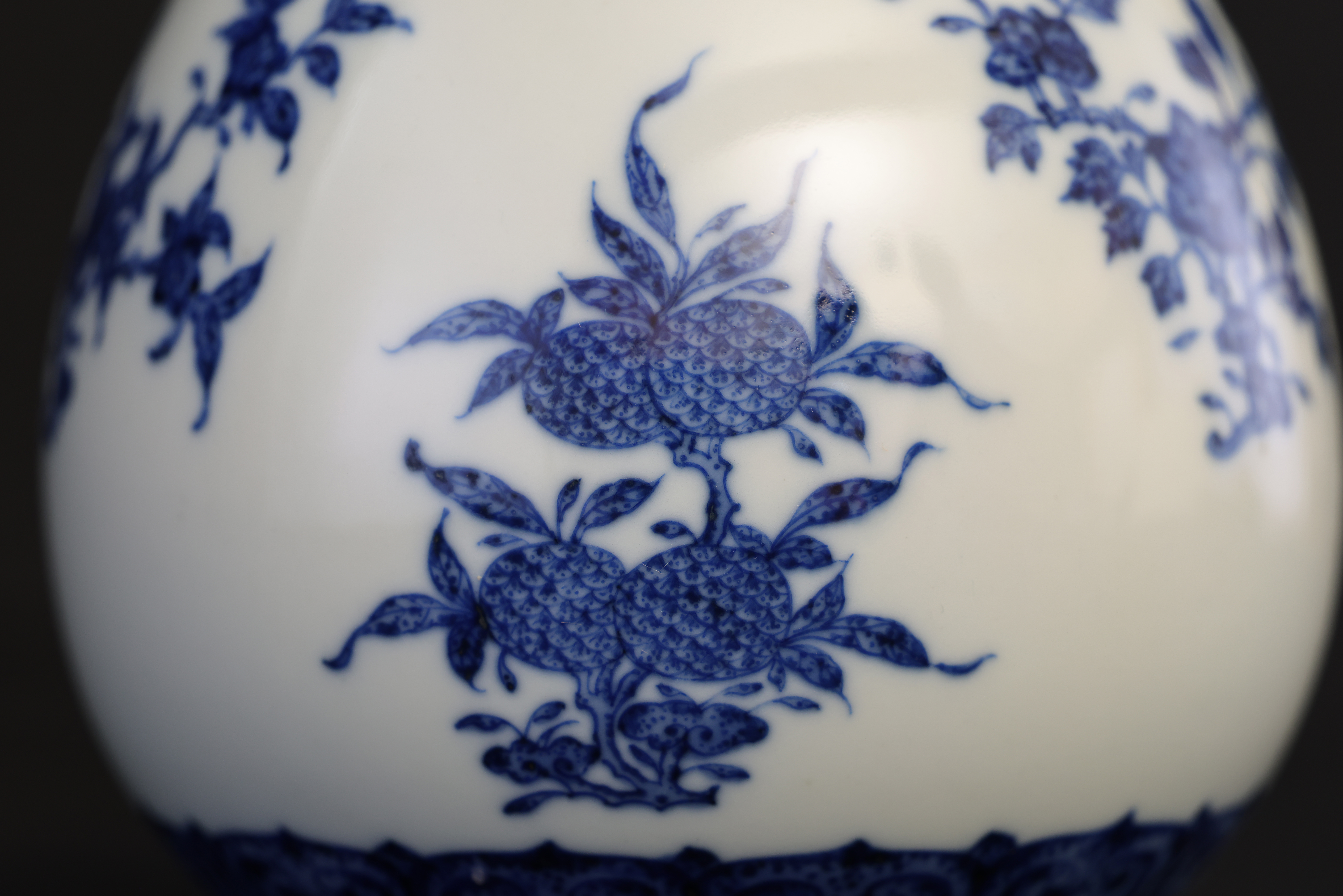 此件为清乾隆青花三多纹玉壶春瓶,造型秀美端庄,胎体坚致,釉面莹润如玉,体现乾隆御瓷精工巧制之极致水准。瓶体玉壶春式,撇口、长颈、丰肩、鼓腹、圈足,线条流畅自然,比例匀称,姿态婉约而不失华贵。全器以青花绘饰,画工精细入微,发色沉稳清朗,呈现出乾隆官窑青花特有的“青中泛翠”之美。纹饰主题为“三多”纹,即石榴、桃、佛手,寓意“多子、多寿、多福”,寄托吉祥富贵与绵延福祉之意。纹样构图疏密有致,布局分三层:颈部饰蕉叶纹与如意云头纹带,主腹绘三多果枝繁茂,枝叶翻转自然,果实饱满圆润;近足处饰仰莲纹一周,线条劲秀,装饰典雅。整器上下呼应,繁简得当。青花用料为进口“苏麻离青”,晕染层次分明,浓淡相宜,显示出御窑精细掌控火候与发色的高超工艺。釉面白中闪青,质感柔润细腻,通体光泽温润,宛若凝脂。底部青花书“大清乾隆年制”六字三行篆书款,笔意稳健,结构端庄,字口清晰无渗化,为乾隆官窑标准御款风格。整器气度高华,寓意吉祥,集造型之美、纹饰之雅与工艺之精于一体,堪称乾隆时期青花瓷艺术之典范。