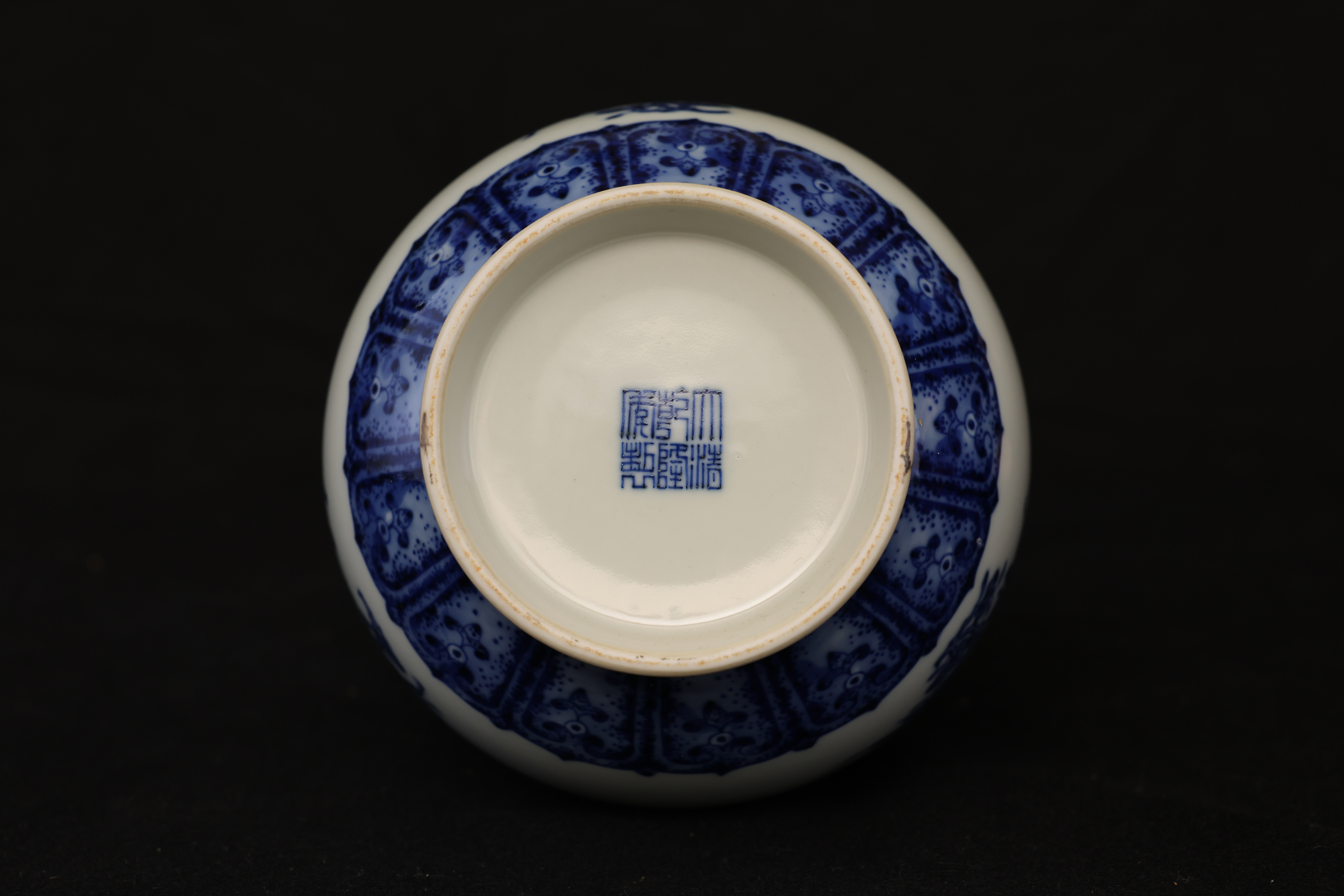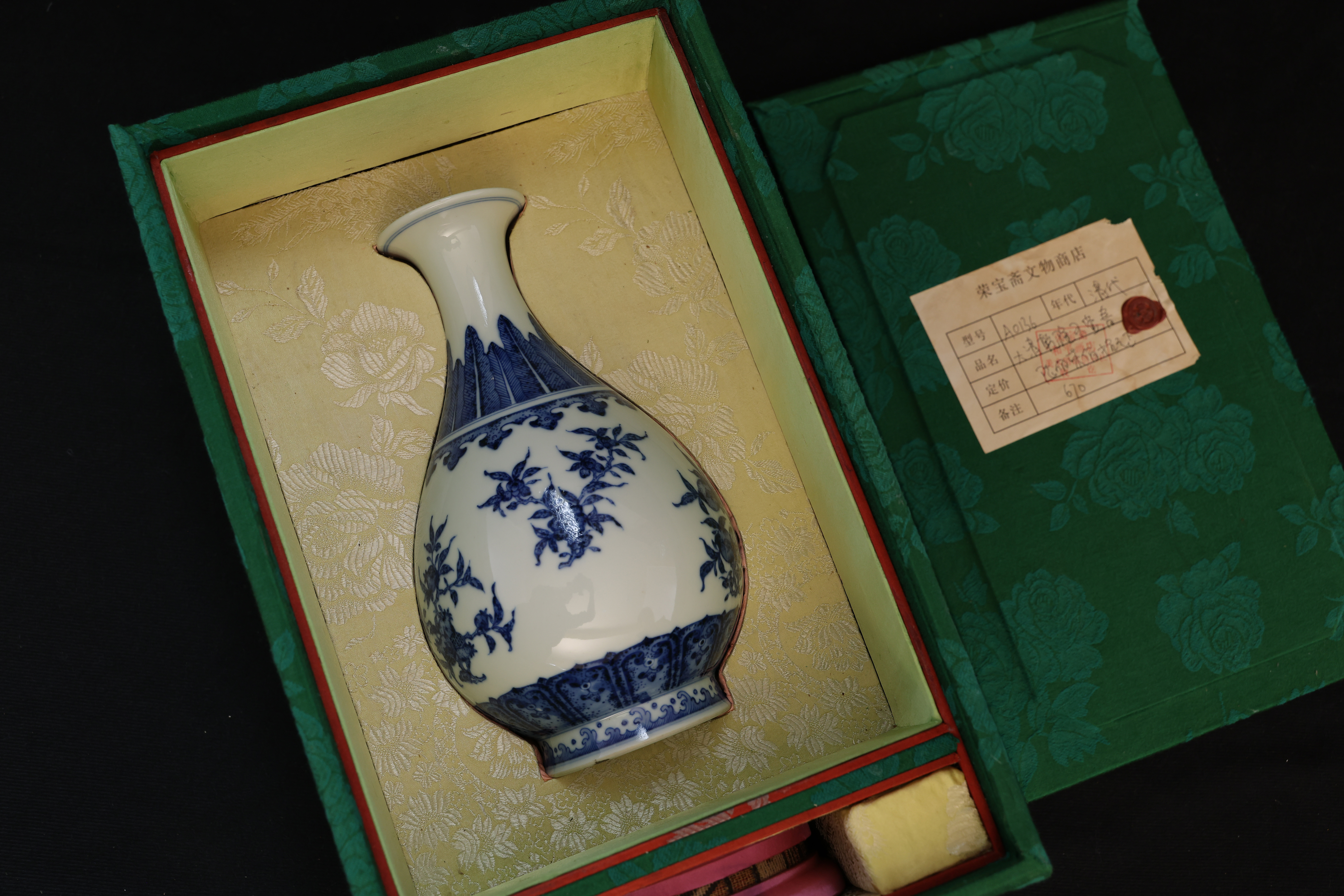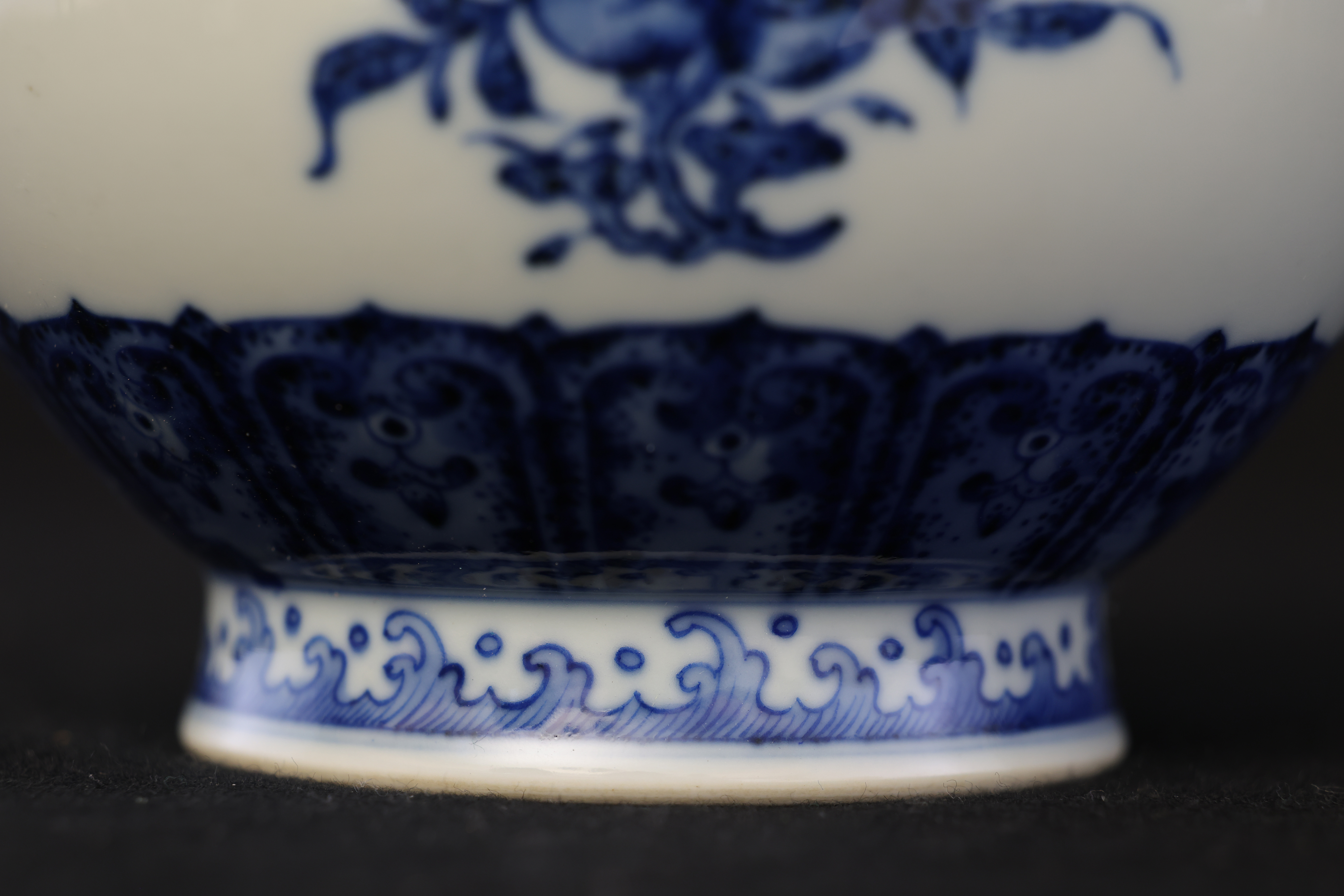 此件为清乾隆青花三多纹玉壶春瓶,造型秀美端庄,胎体坚致,釉面莹润如玉,体现乾隆御瓷精工巧制之极致水准。瓶体玉壶春式,撇口、长颈、丰肩、鼓腹、圈足,线条流畅自然,比例匀称,姿态婉约而不失华贵。全器以青花绘饰,画工精细入微,发色沉稳清朗,呈现出乾隆官窑青花特有的“青中泛翠”之美。纹饰主题为“三多”纹,即石榴、桃、佛手,寓意“多子、多寿、多福”,寄托吉祥富贵与绵延福祉之意。纹样构图疏密有致,布局分三层:颈部饰蕉叶纹与如意云头纹带,主腹绘三多果枝繁茂,枝叶翻转自然,果实饱满圆润;近足处饰仰莲纹一周,线条劲秀,装饰典雅。整器上下呼应,繁简得当。青花用料为进口“苏麻离青”,晕染层次分明,浓淡相宜,显示出御窑精细掌控火候与发色的高超工艺。釉面白中闪青,质感柔润细腻,通体光泽温润,宛若凝脂。底部青花书“大清乾隆年制”六字三行篆书款,笔意稳健,结构端庄,字口清晰无渗化,为乾隆官窑标准御款风格。整器气度高华,寓意吉祥,集造型之美、纹饰之雅与工艺之精于一体,堪称乾隆时期青花瓷艺术之典范。
