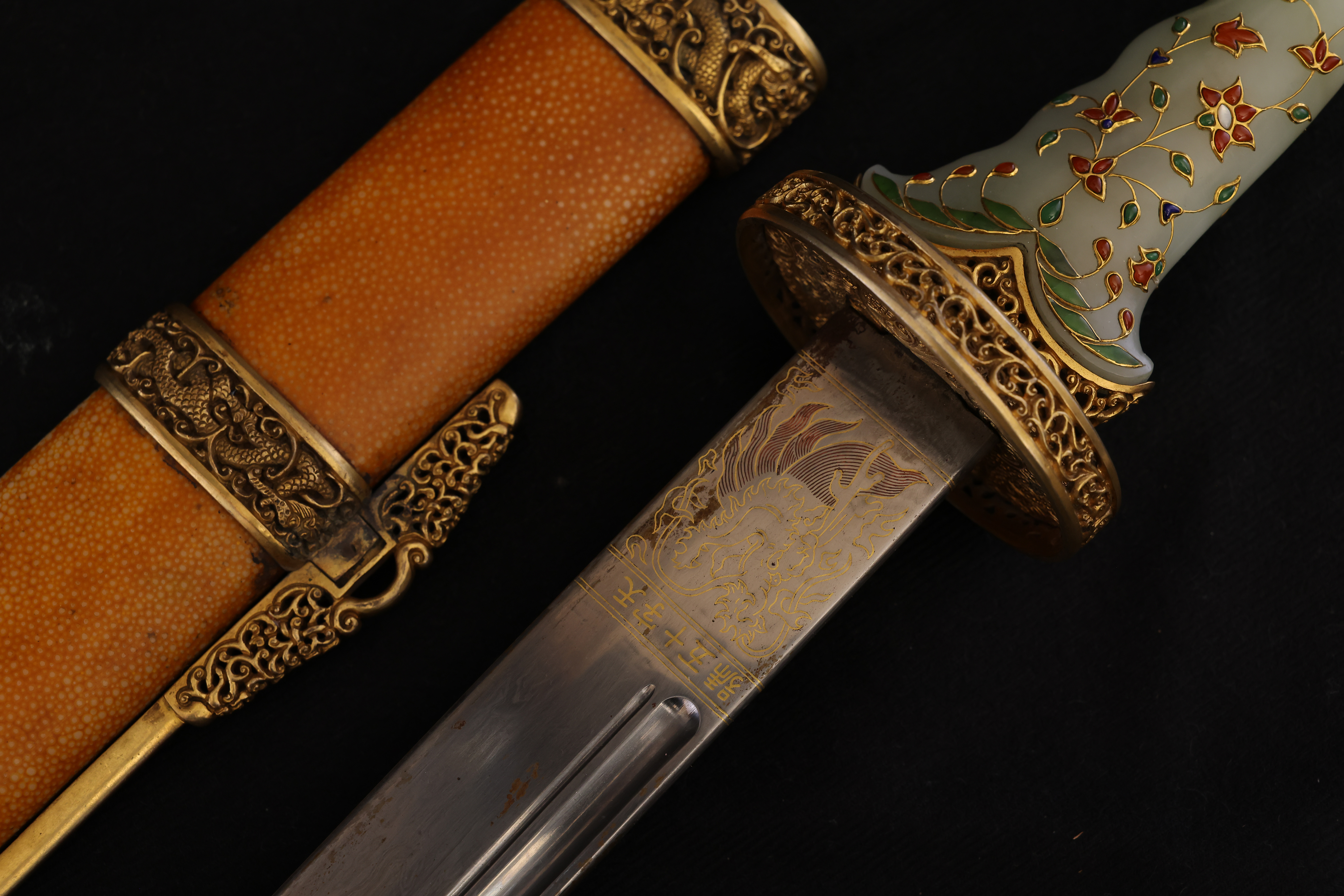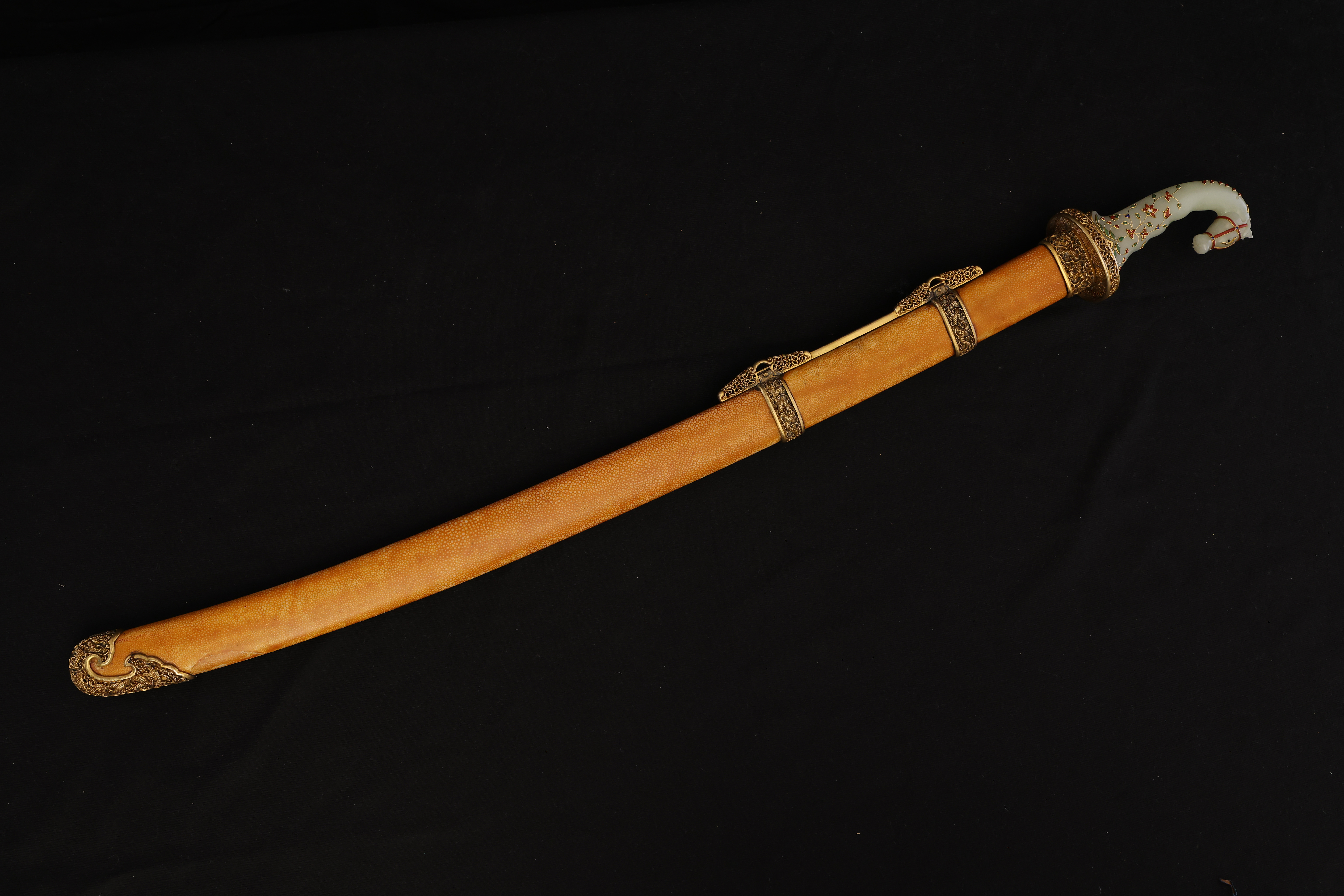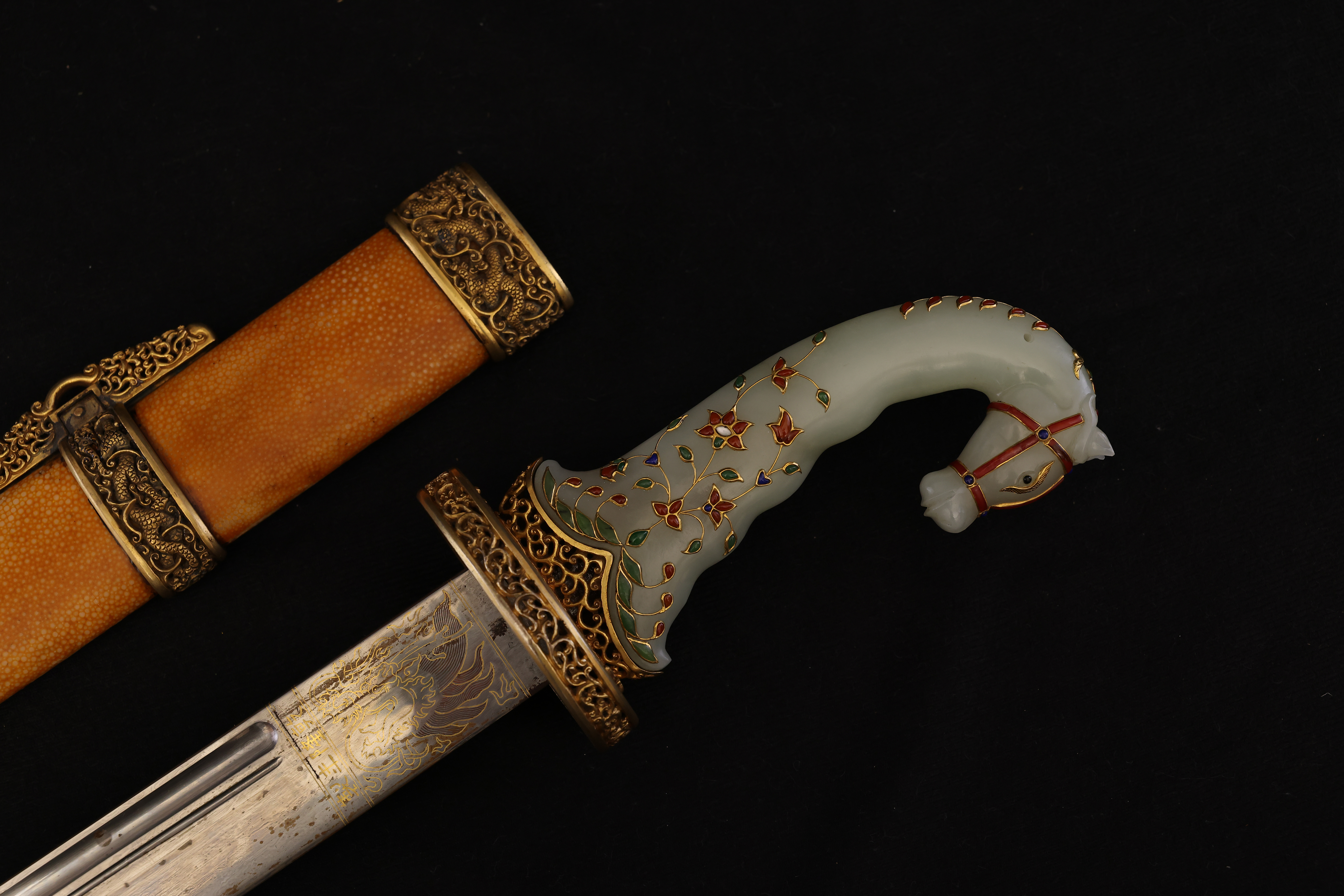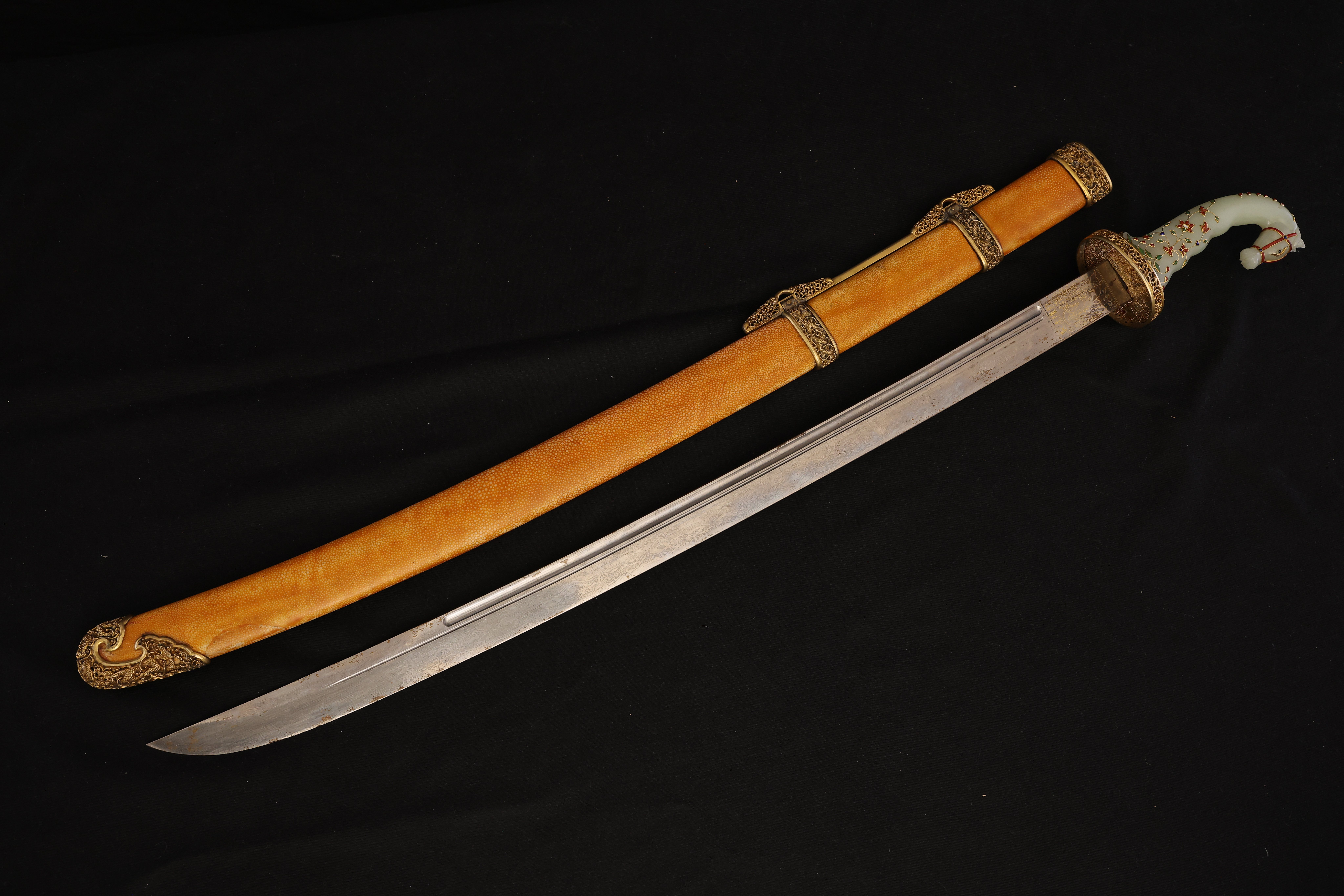 此件清乾隆“天字十五号”腰刀,乃乾隆皇帝御制佩刀之一,代表清宫御用兵器的最高工艺水准。整刀制式典雅而威仪,既具实战锋锐之功能,亦承皇家礼仪与美学之极致表达。刀鞘以珍贵鱼皮包裹,质地细腻,色泽温润明亮,呈浅黄琥珀之色,触感细密如珠。刀首、鞘口、鞘尾与两环均为鎏金铜饰,錾刻盘龙云纹,雕工深峻流畅,龙鳞起伏,气势腾跃。柄首以整料青白玉雕成马首状,玉质莹润无瑕,神态灵动而温驯。玉马身上以金丝掐嵌珐琅,饰缠枝花卉与宝石眼,色彩明丽,金彩流转,展现乾隆时期中西合璧的装饰风格与高超匠艺。刀身以精钢锻制,刃口隐泛寒光,映射锋芒。整体比例修长端庄,曲度优美,形制典正而气度非凡。腰刀为清代帝王常佩之物,象征文武合德、天命所归,此刀编号“天字十五号”,表明其在御制佩刀体系中的序列地位,具有严格等级与仪制意义。