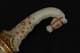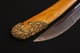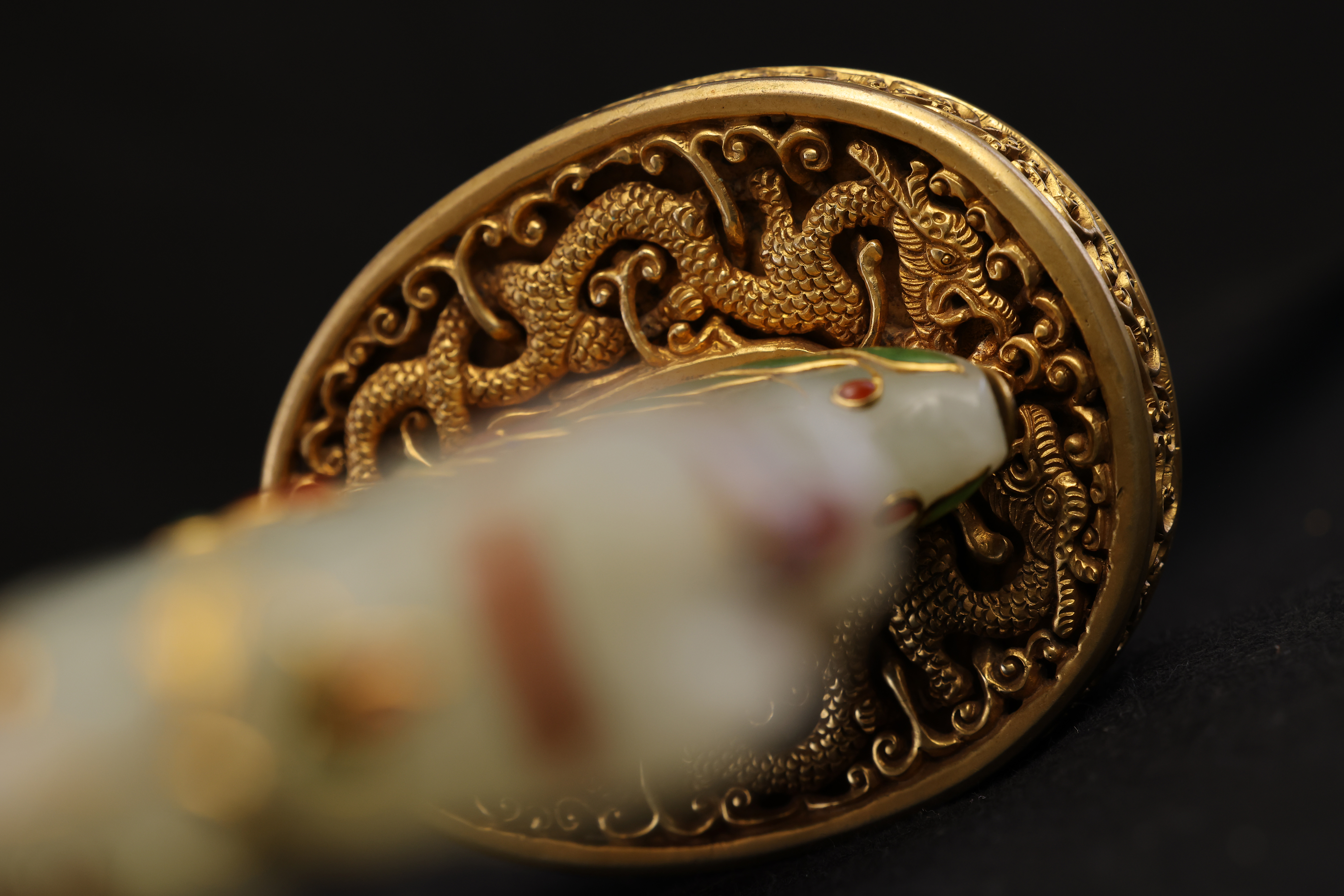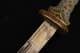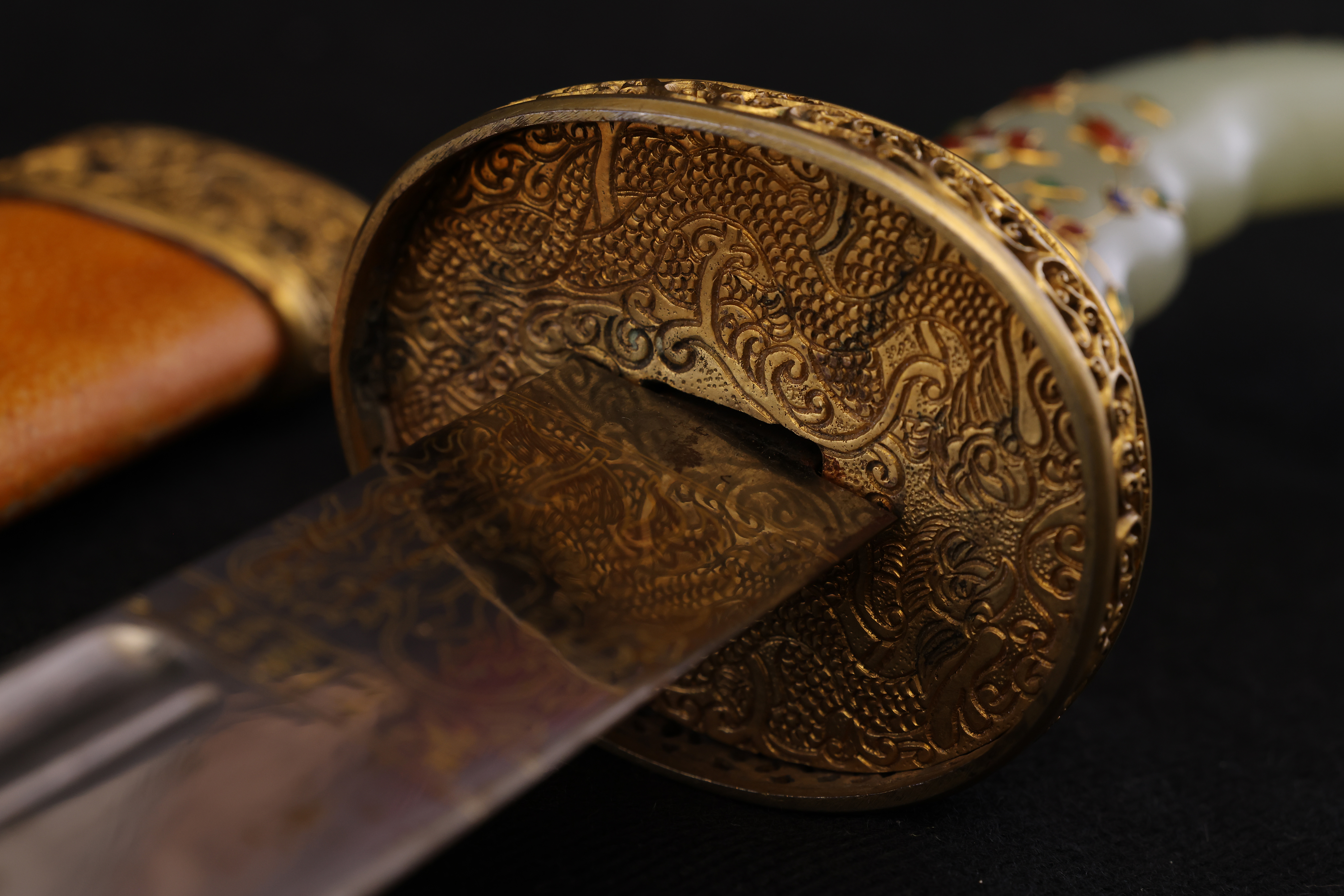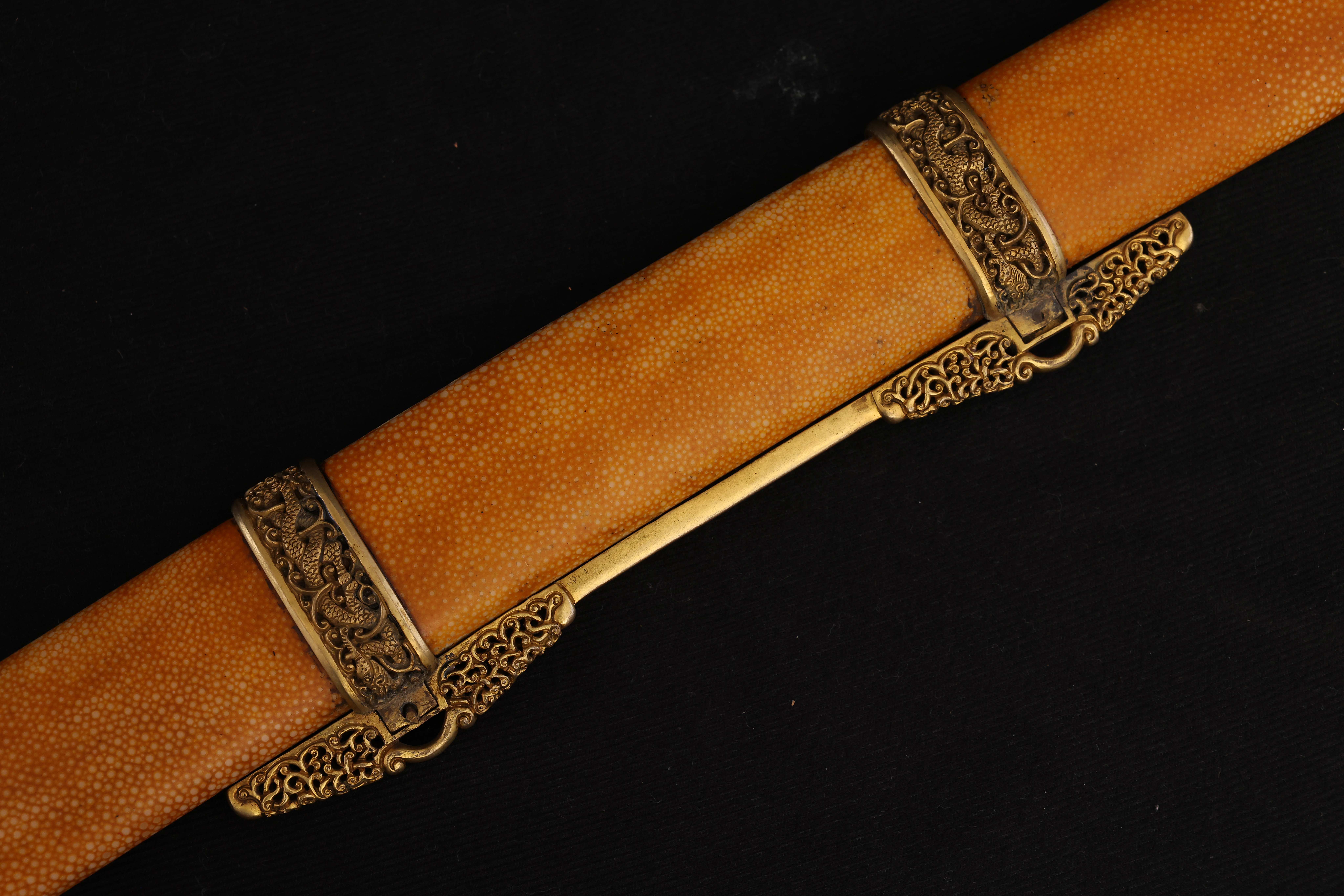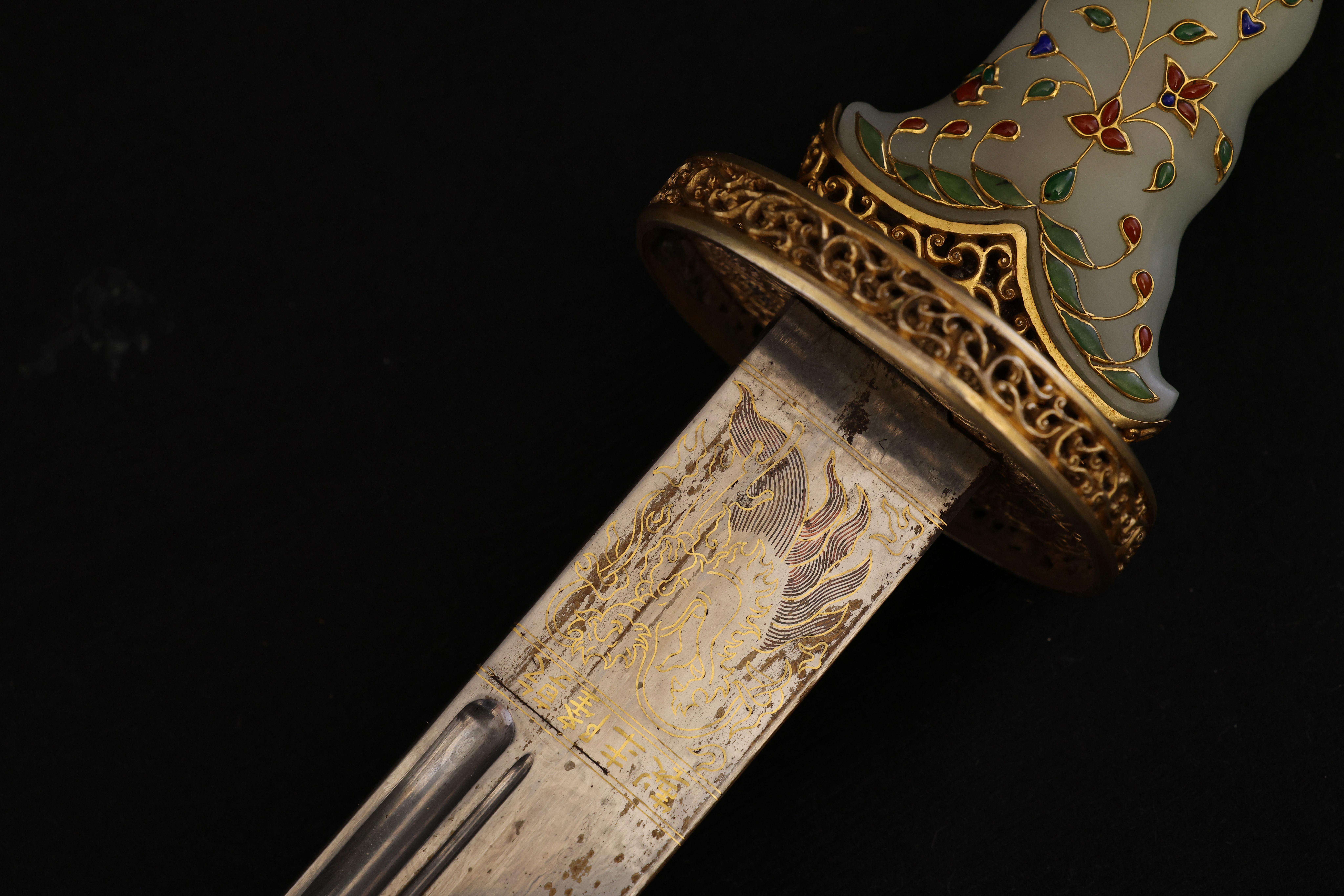 此件清乾隆“天字十五号”腰刀,乃乾隆皇帝御制佩刀之一,代表清宫御用兵器的最高工艺水准。整刀制式典雅而威仪,既具实战锋锐之功能,亦承皇家礼仪与美学之极致表达。刀鞘以珍贵鱼皮包裹,质地细腻,色泽温润明亮,呈浅黄琥珀之色,触感细密如珠。刀首、鞘口、鞘尾与两环均为鎏金铜饰,錾刻盘龙云纹,雕工深峻流畅,龙鳞起伏,气势腾跃。柄首以整料青白玉雕成马首状,玉质莹润无瑕,神态灵动而温驯。玉马身上以金丝掐嵌珐琅,饰缠枝花卉与宝石眼,色彩明丽,金彩流转,展现乾隆时期中西合璧的装饰风格与高超匠艺。刀身以精钢锻制,刃口隐泛寒光,映射锋芒。整体比例修长端庄,曲度优美,形制典正而气度非凡。腰刀为清代帝王常佩之物,象征文武合德、天命所归,此刀编号“天字十五号”,表明其在御制佩刀体系中的序列地位,具有严格等级与仪制意义。