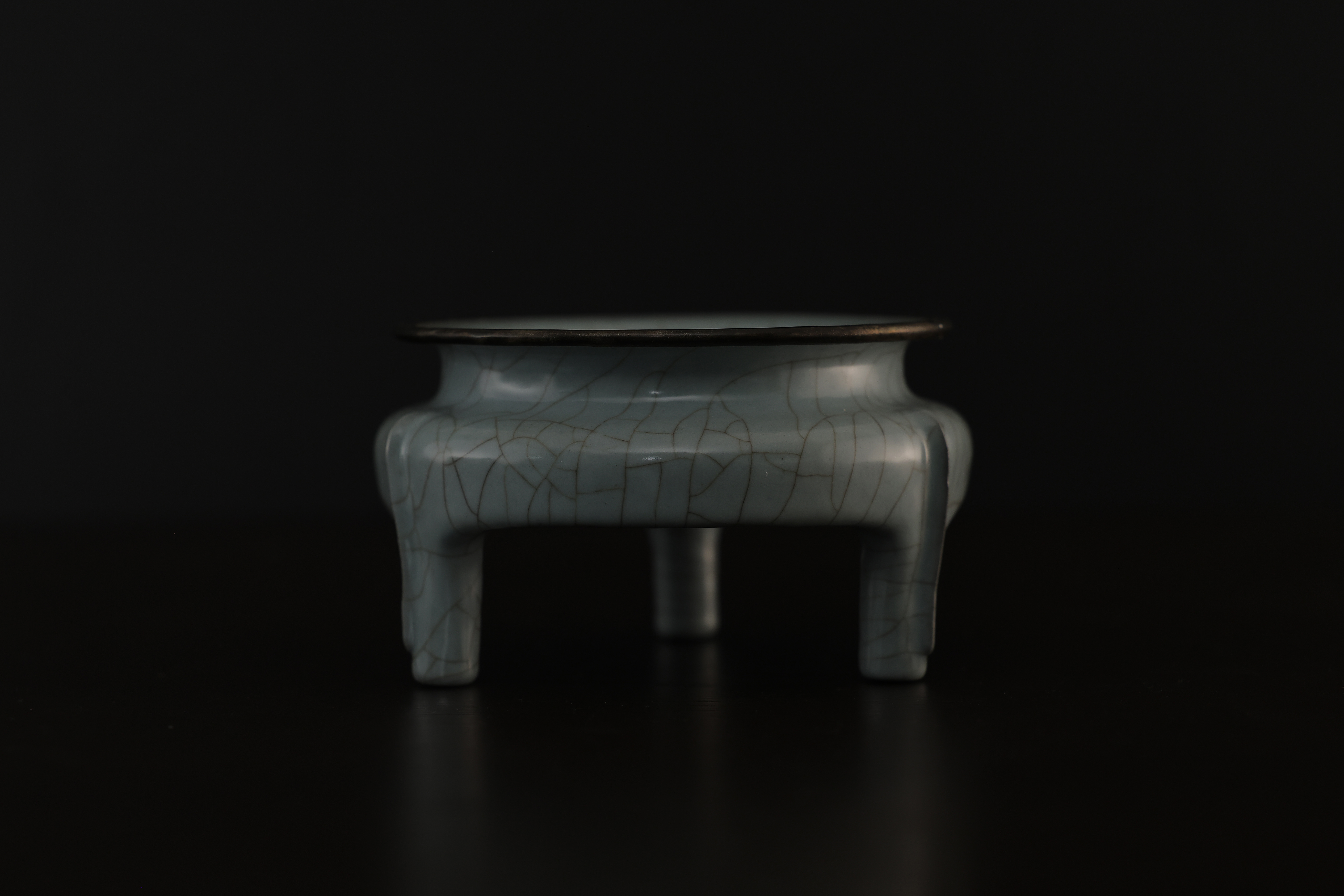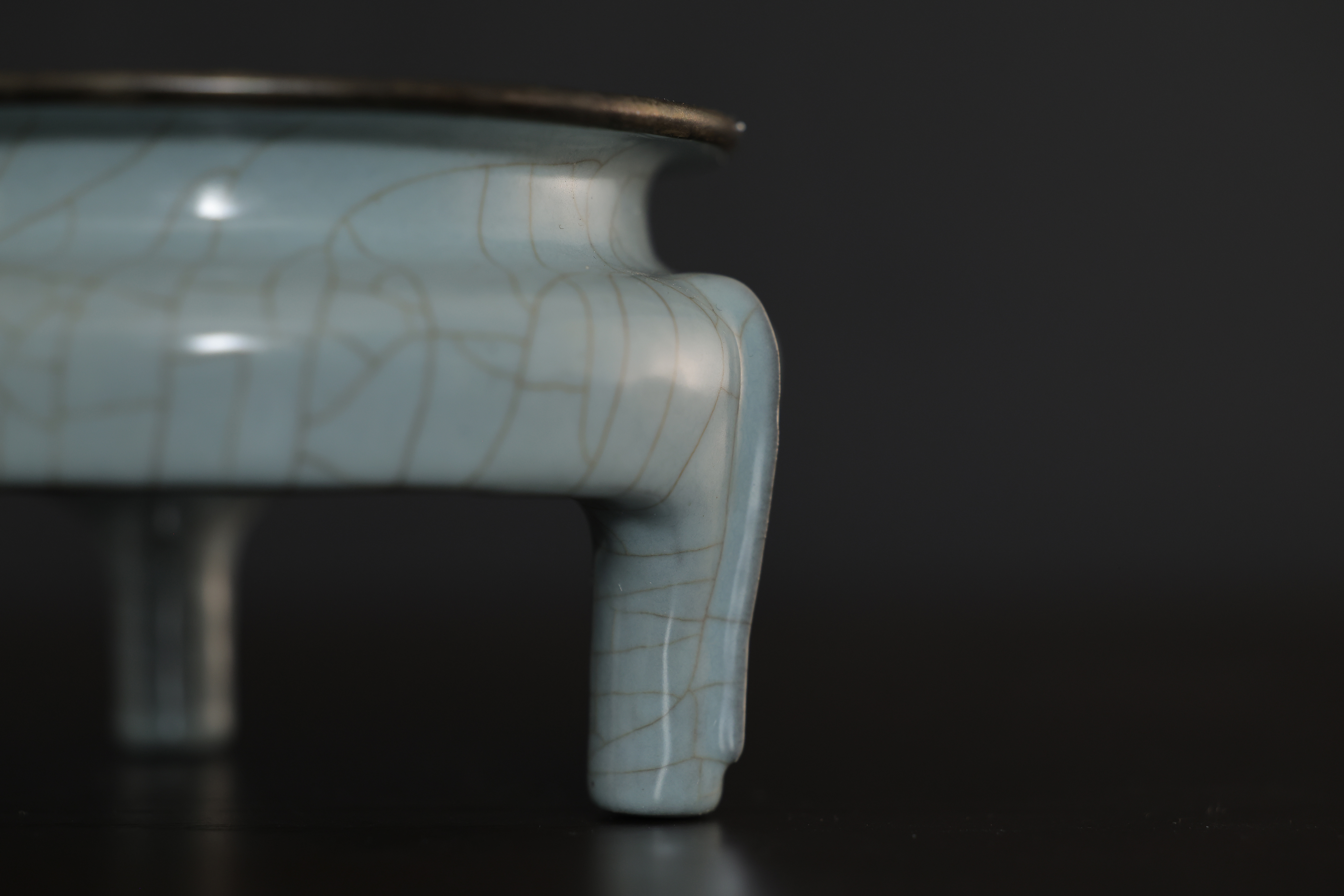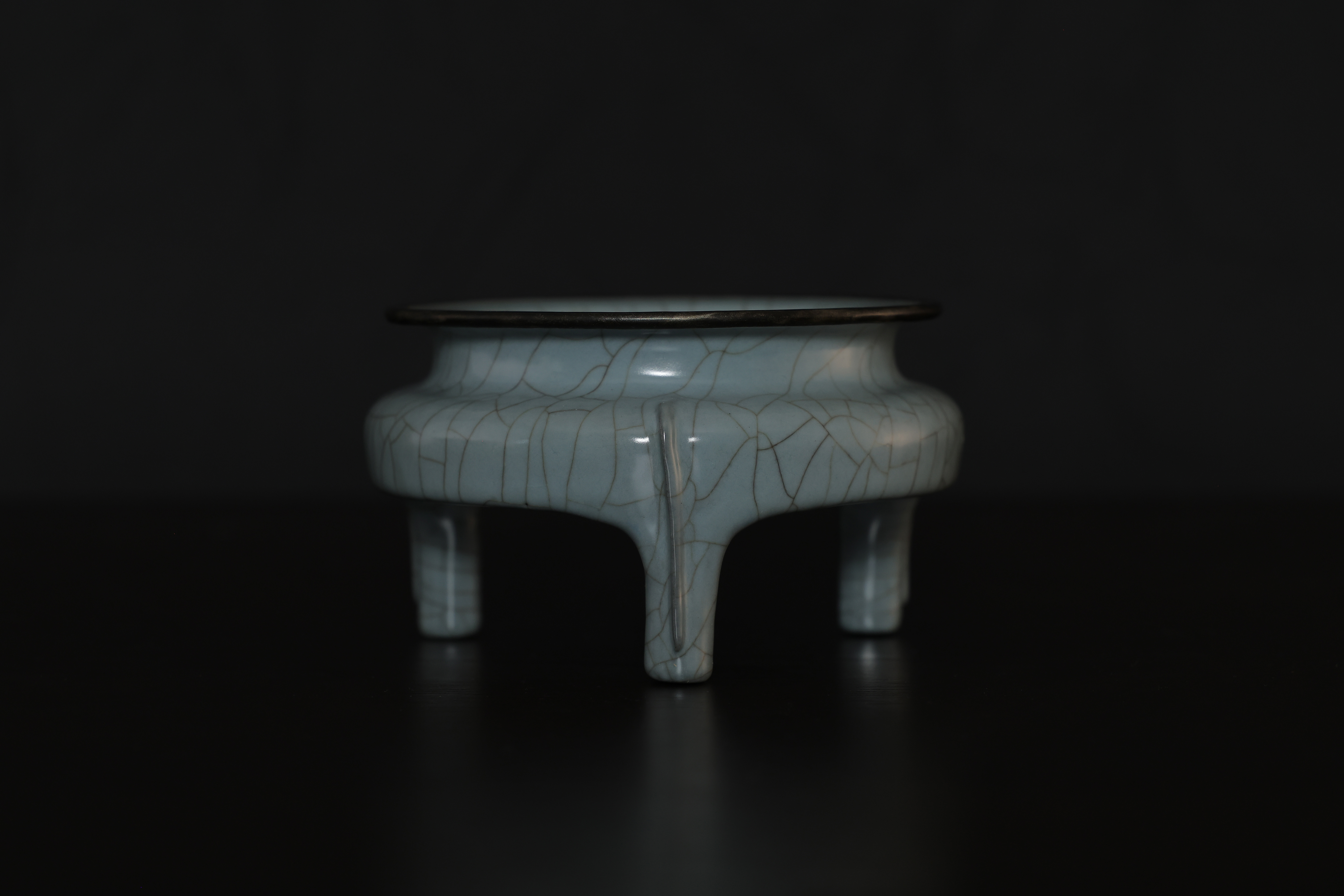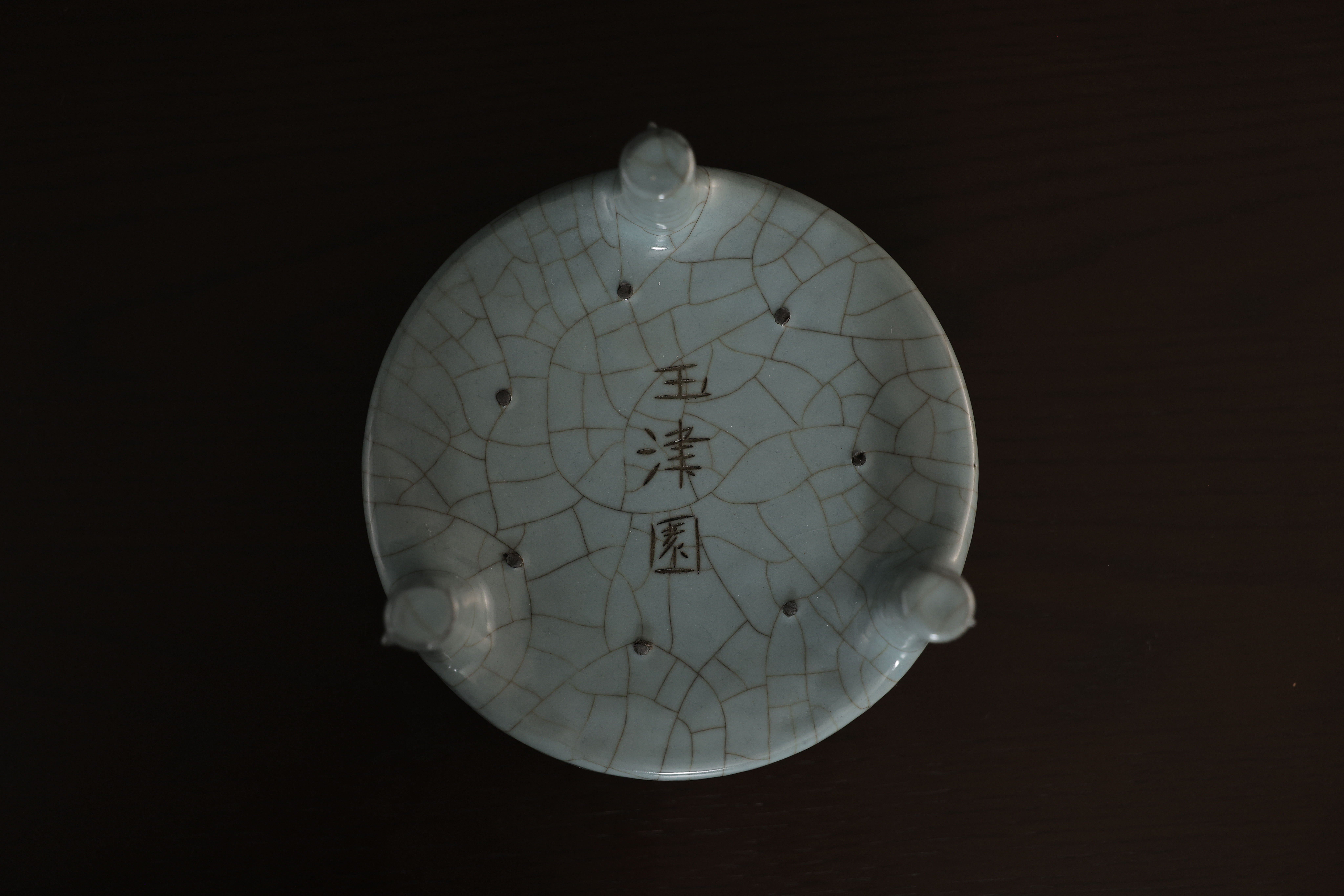 此炉造型,敞口,口沿包金属边,短腹,器形规整,底周三承足,腹部至足突起三条比较少见且相对夸张的棱线,俗称“出筋”,亦为“出戟。通体施釉,釉色沉静饱满,器形小巧而开片大,底部有七个支钉烧痕,底刻“玉津园”三字楷书款。