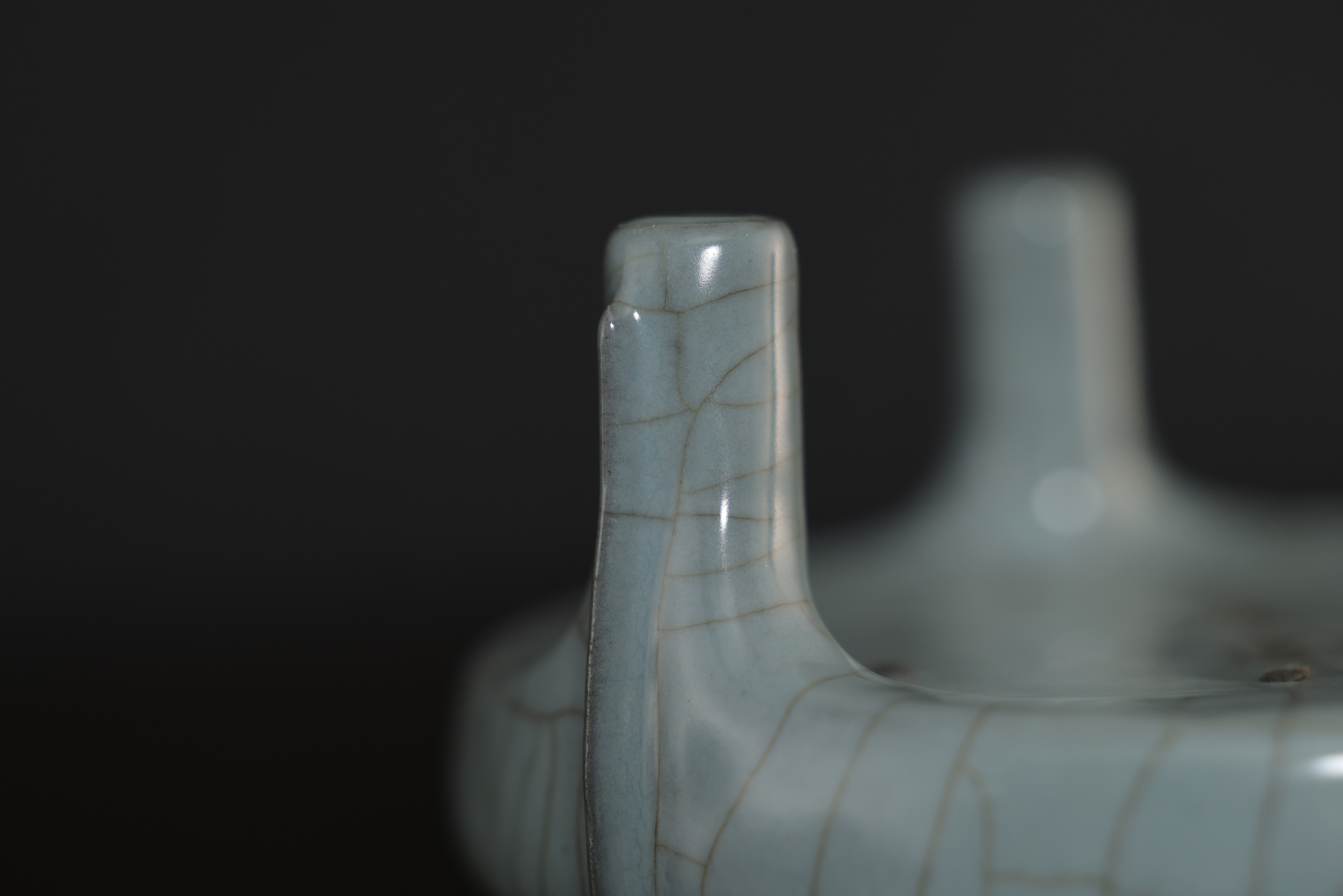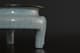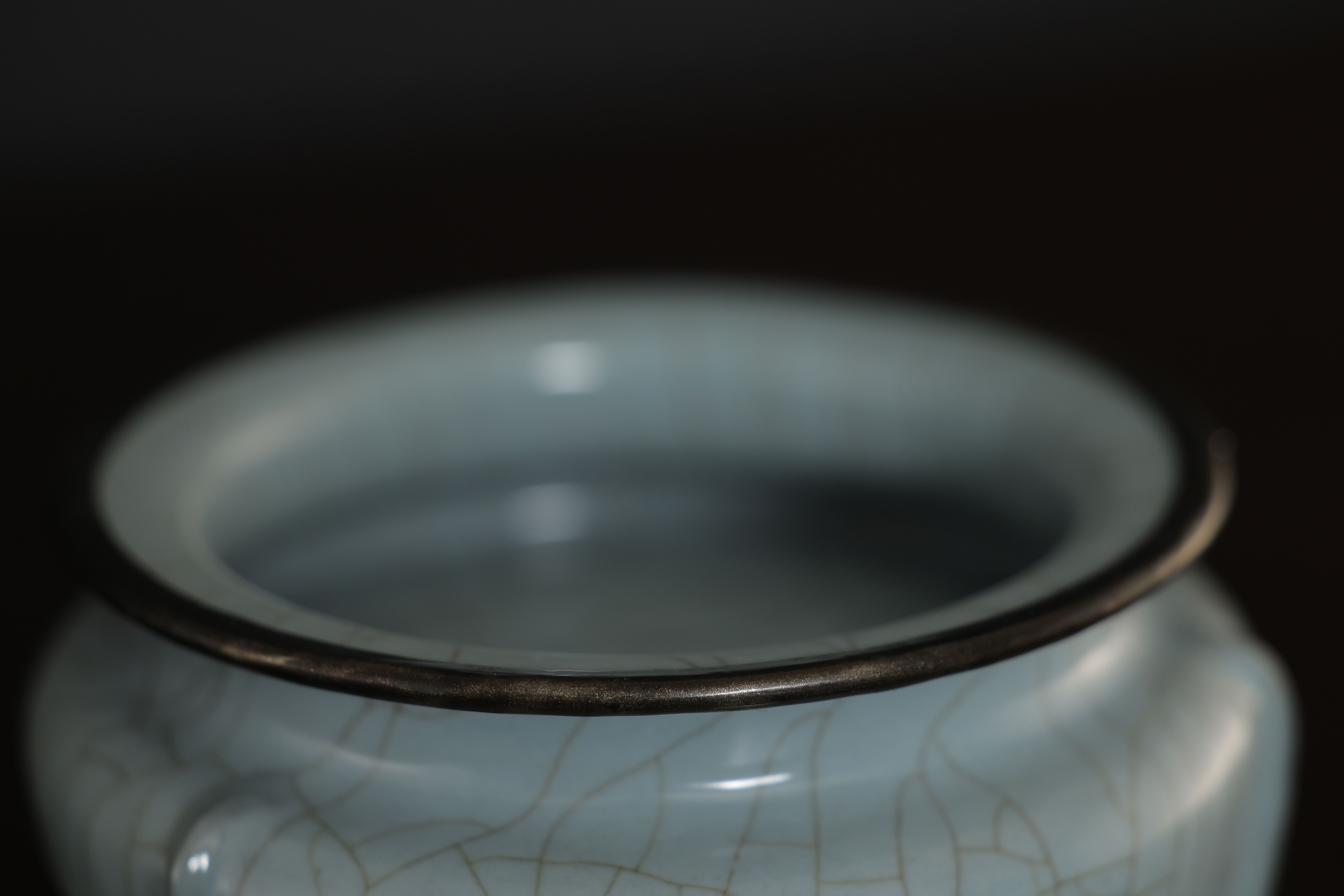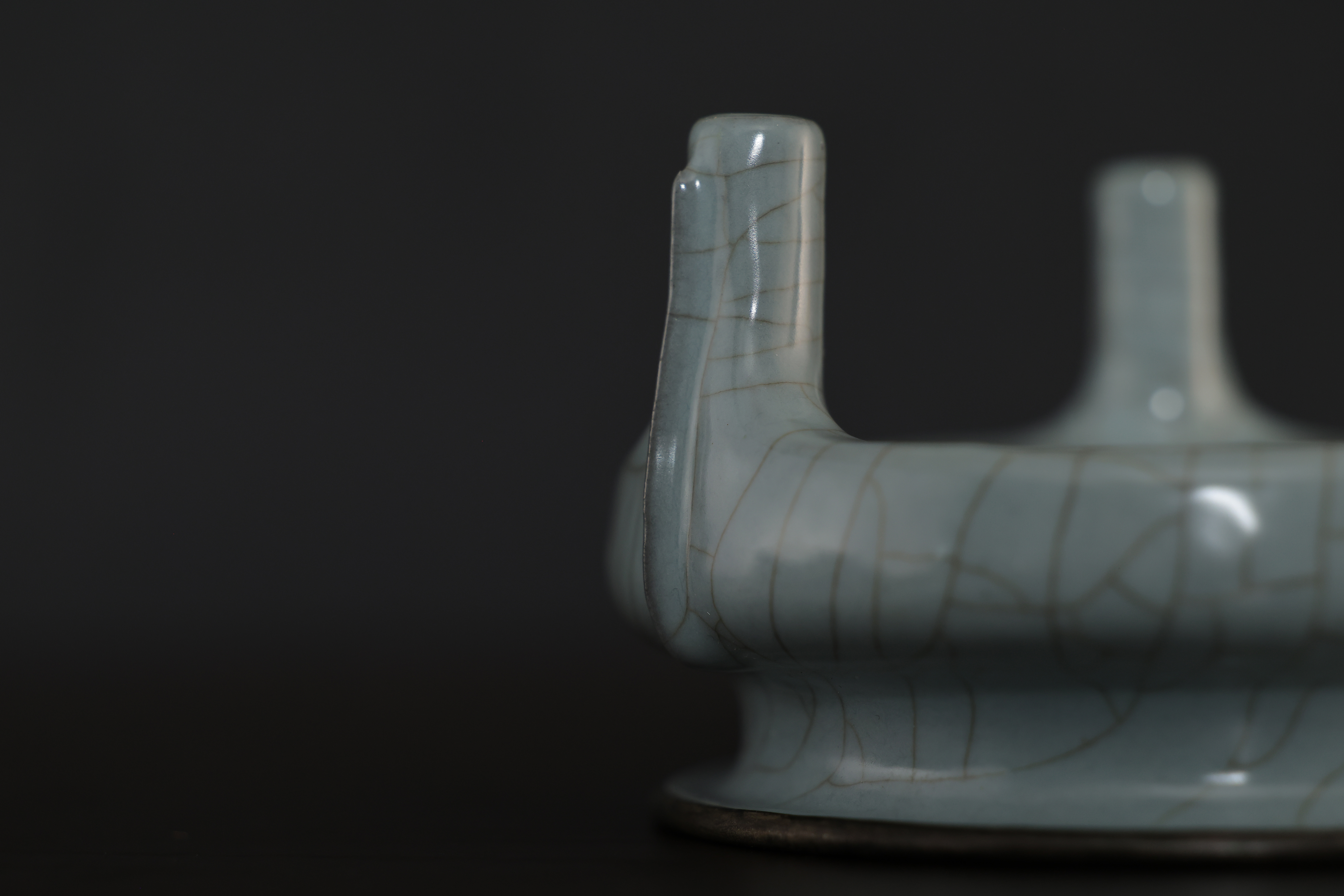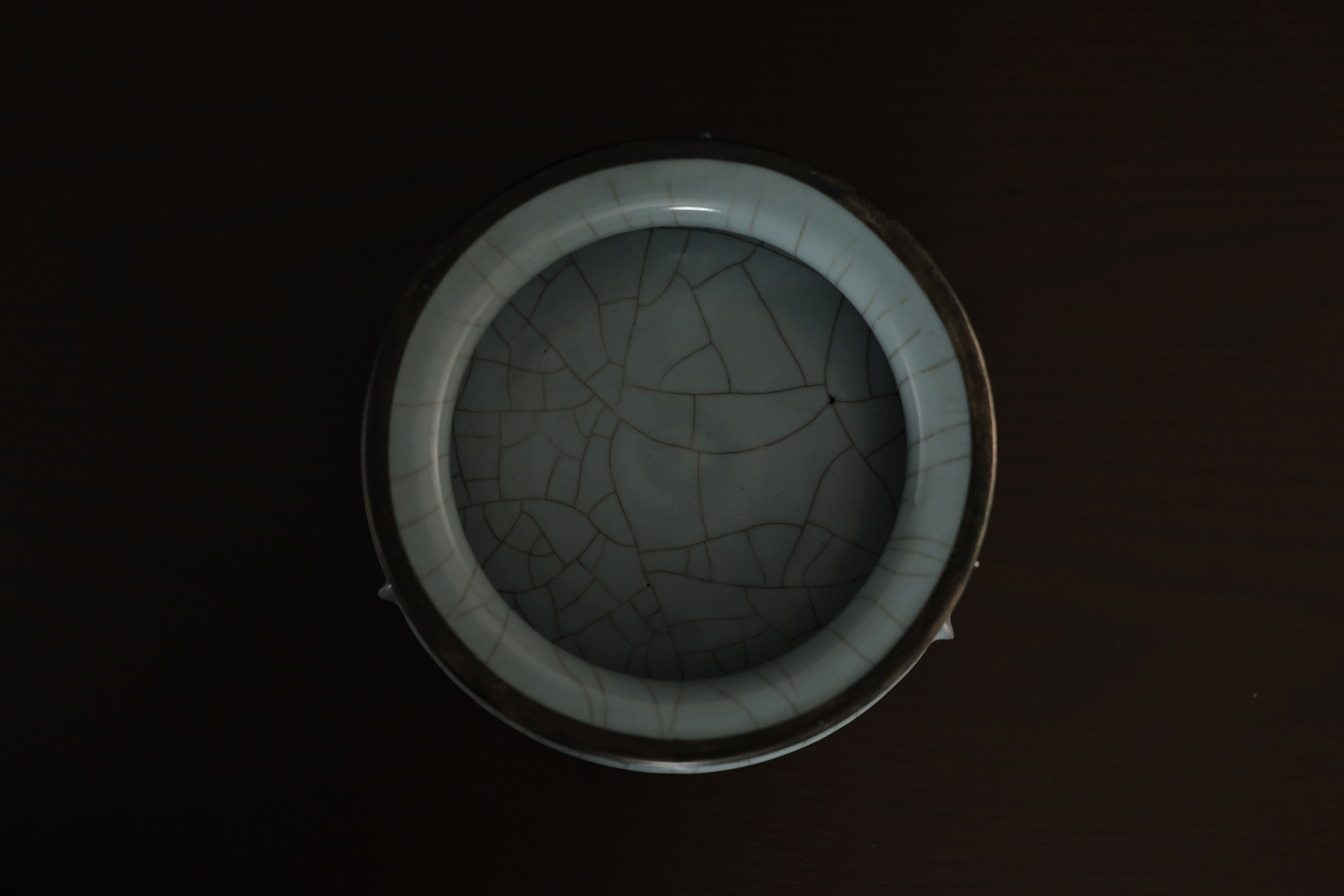 此炉造型,敞口,口沿包金属边,短腹,器形规整,底周三承足,腹部至足突起三条比较少见且相对夸张的棱线,俗称“出筋”,亦为“出戟。通体施釉,釉色沉静饱满,器形小巧而开片大,底部有七个支钉烧痕,底刻“玉津园”三字楷书款。
