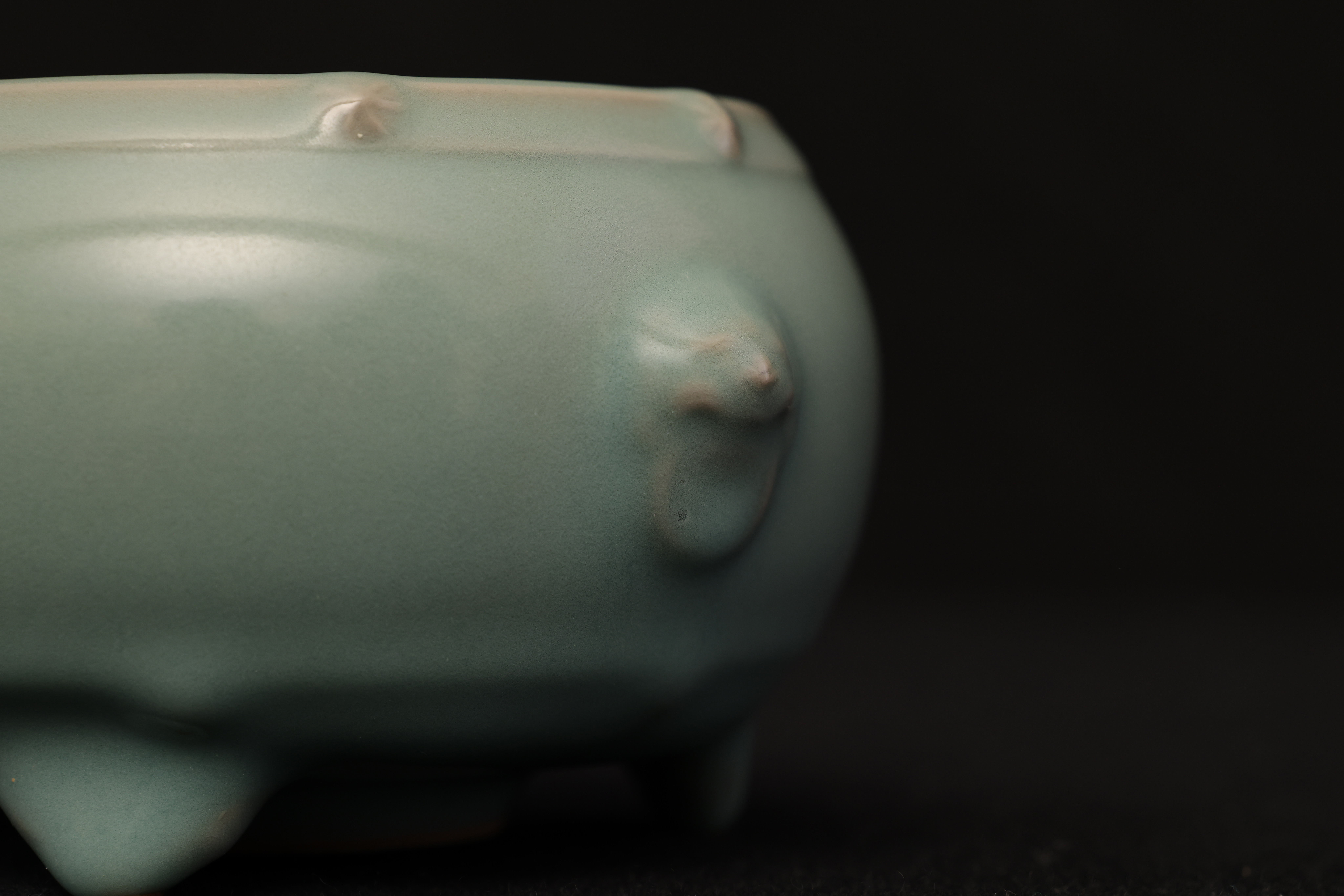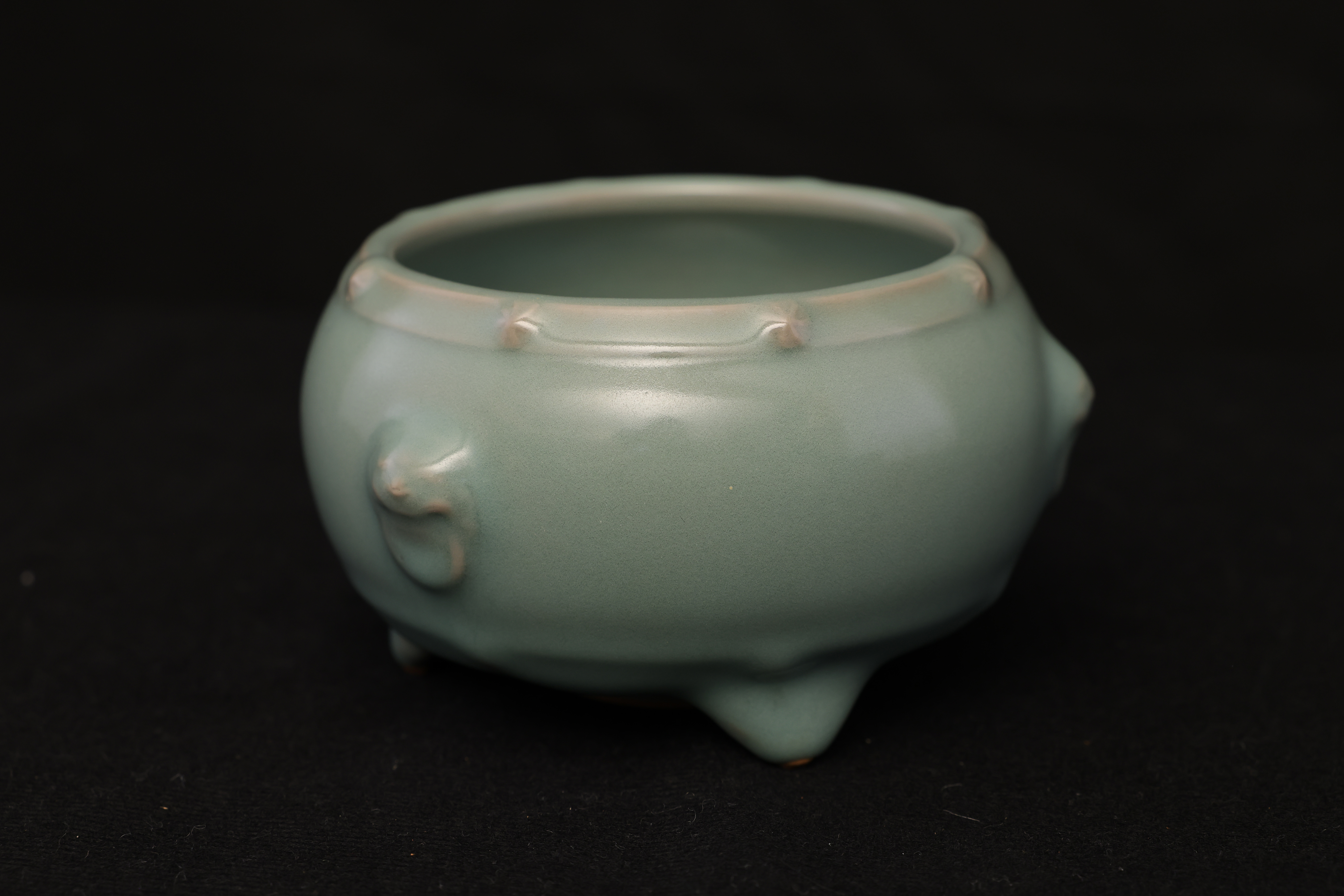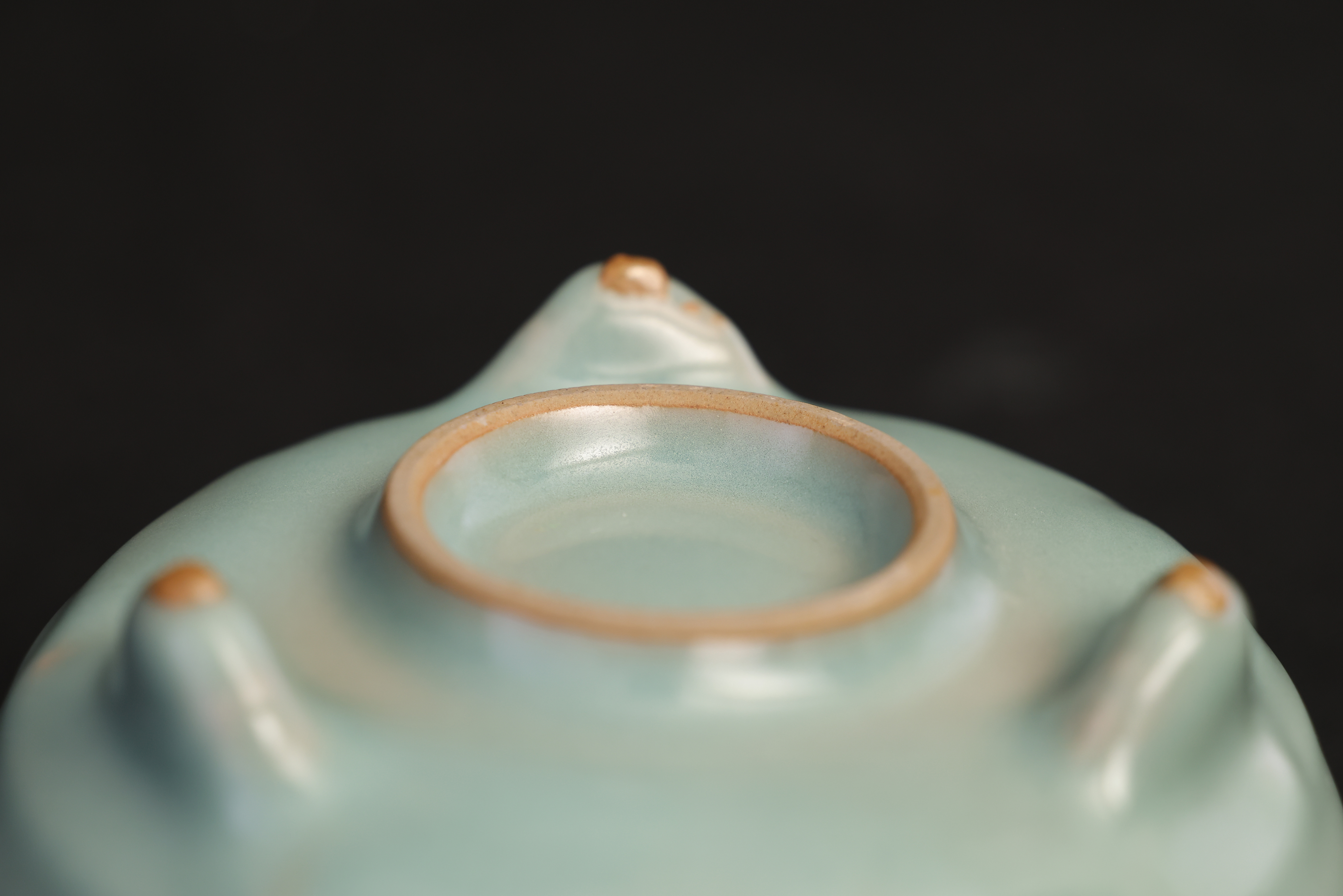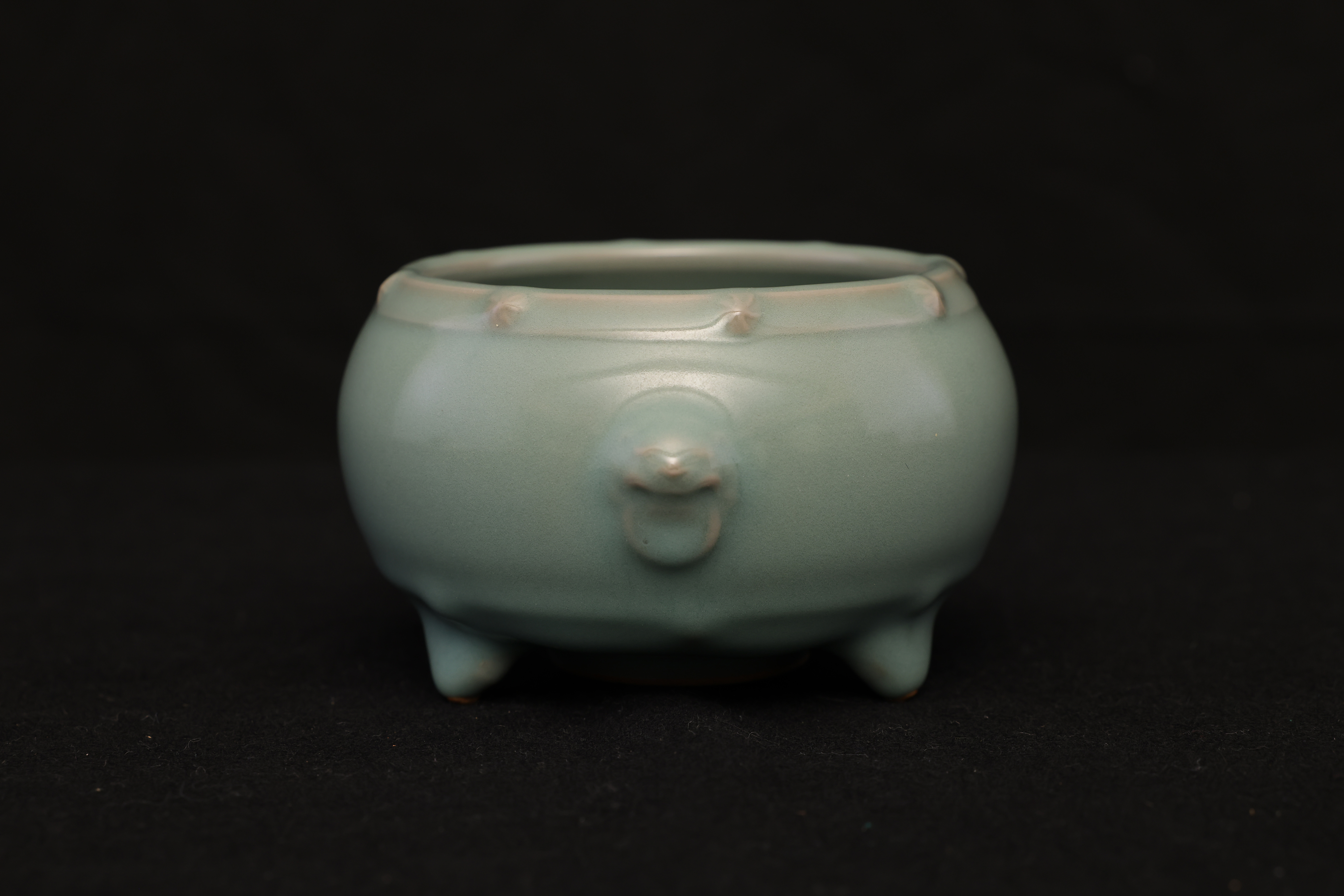 此炉圆口,厚唇,口沿及底部饰二圈鼓钉,腹部微鼓,迅速内收至平底,三足微微外撇。腹部凸雕三只兽首衔环,造型生动,神态威严。釉色油润,色泽均匀温润,质感厚重而饱满。整体造型端庄稳重,比例协调,兼具实用功能与观赏价值。炉体设计不仅体现了龙泉窑高超的制瓷技艺,同时亦体现宋代文人雅玩中对器物形态与纹饰的讲究与偏好。此类三足炉常用于香熏、祭祀或书斋中,是南宋文人生活与精神审美的典型体现。