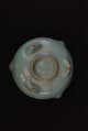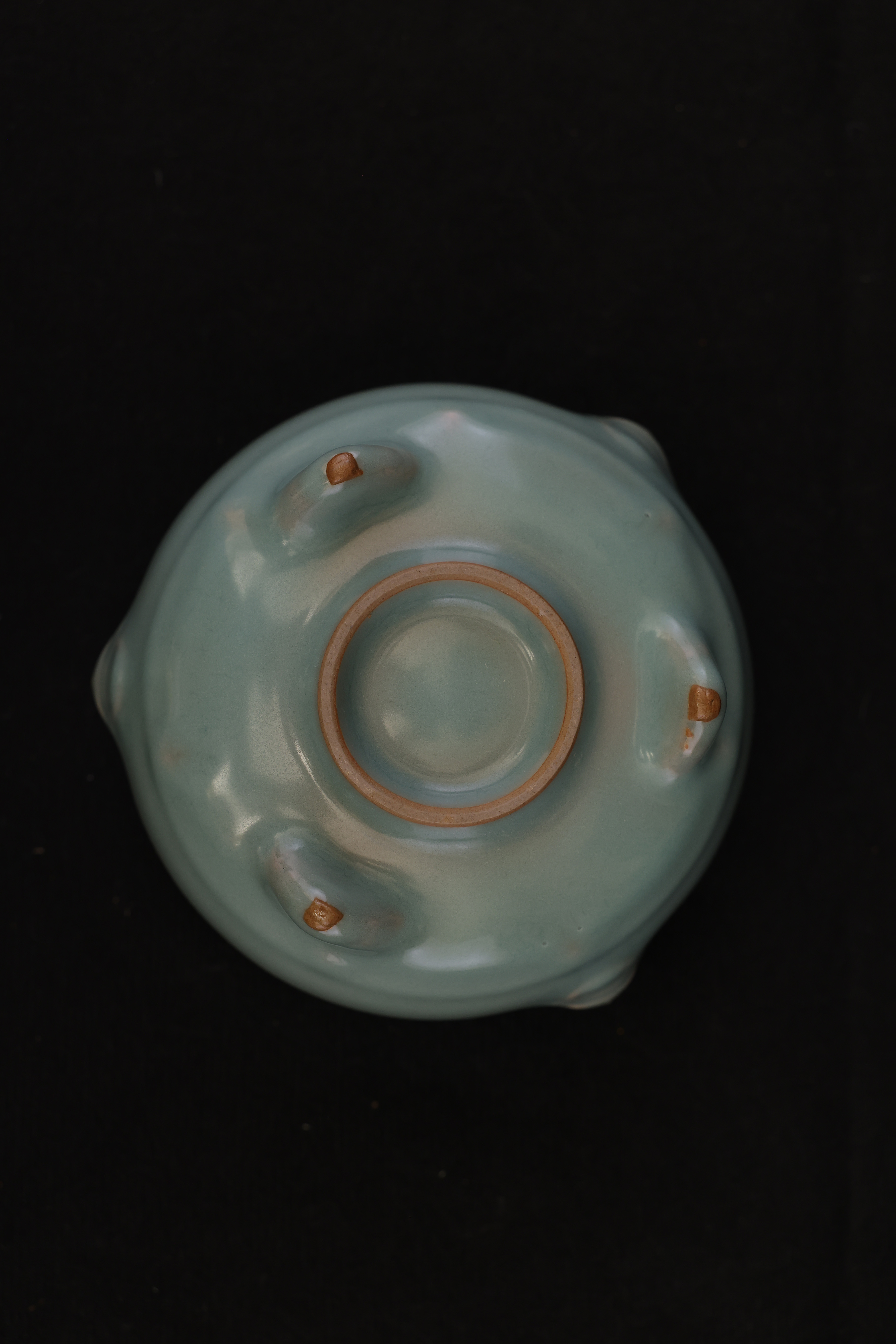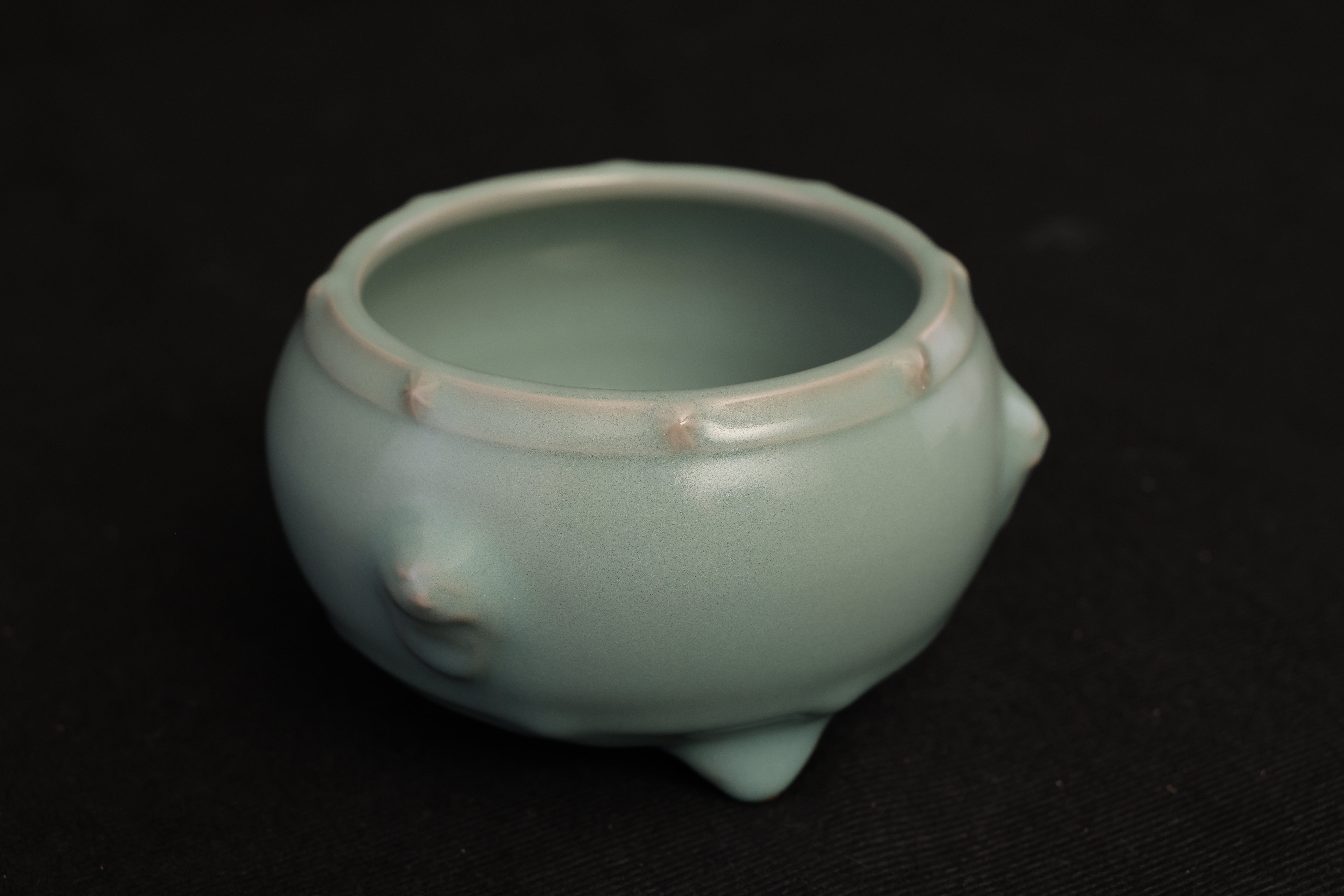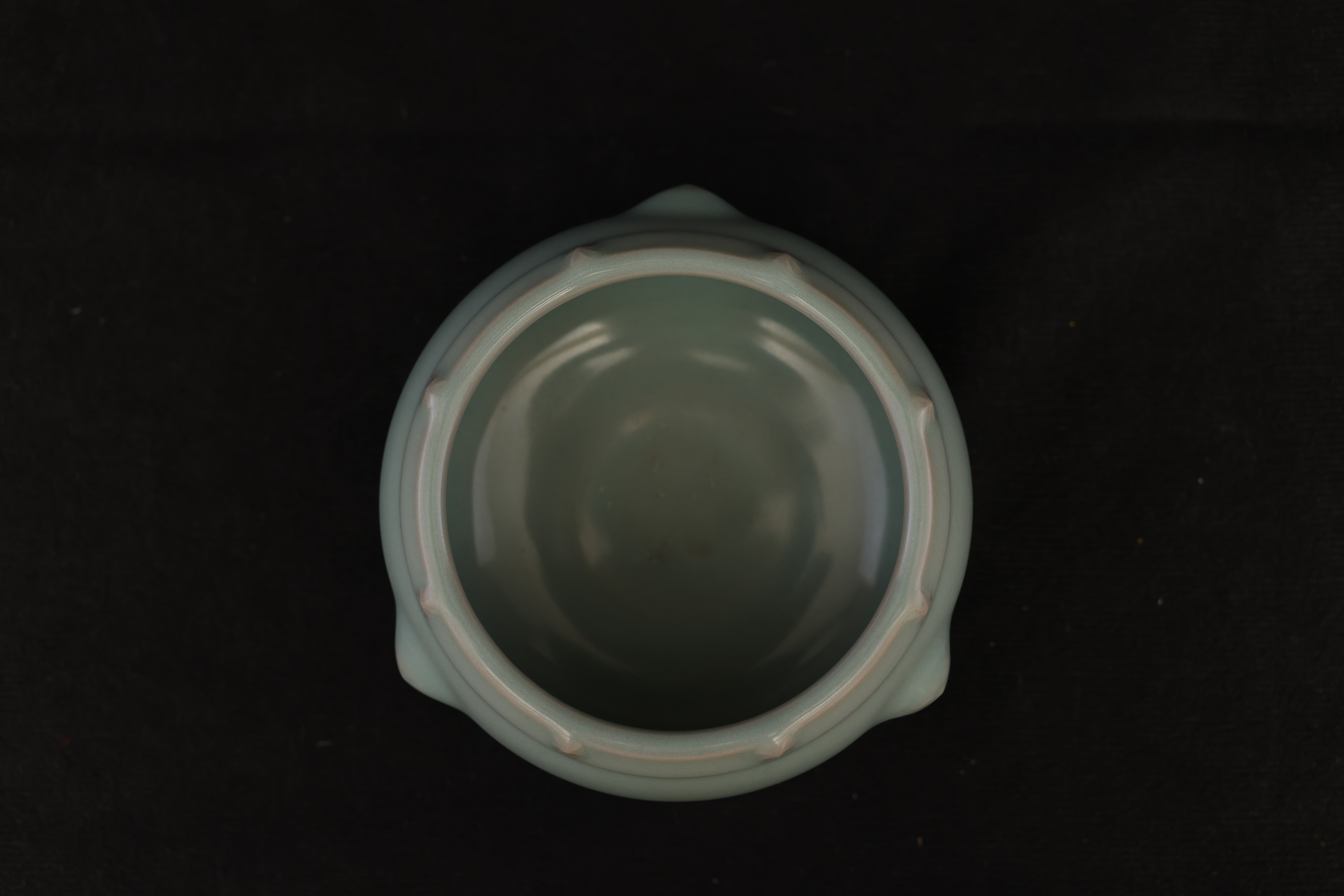 此炉圆口,厚唇,口沿及底部饰二圈鼓钉,腹部微鼓,迅速内收至平底,三足微微外撇。腹部凸雕三只兽首衔环,造型生动,神态威严。釉色油润,色泽均匀温润,质感厚重而饱满。整体造型端庄稳重,比例协调,兼具实用功能与观赏价值。炉体设计不仅体现了龙泉窑高超的制瓷技艺,同时亦体现宋代文人雅玩中对器物形态与纹饰的讲究与偏好。此类三足炉常用于香熏、祭祀或书斋中,是南宋文人生活与精神审美的典型体现。